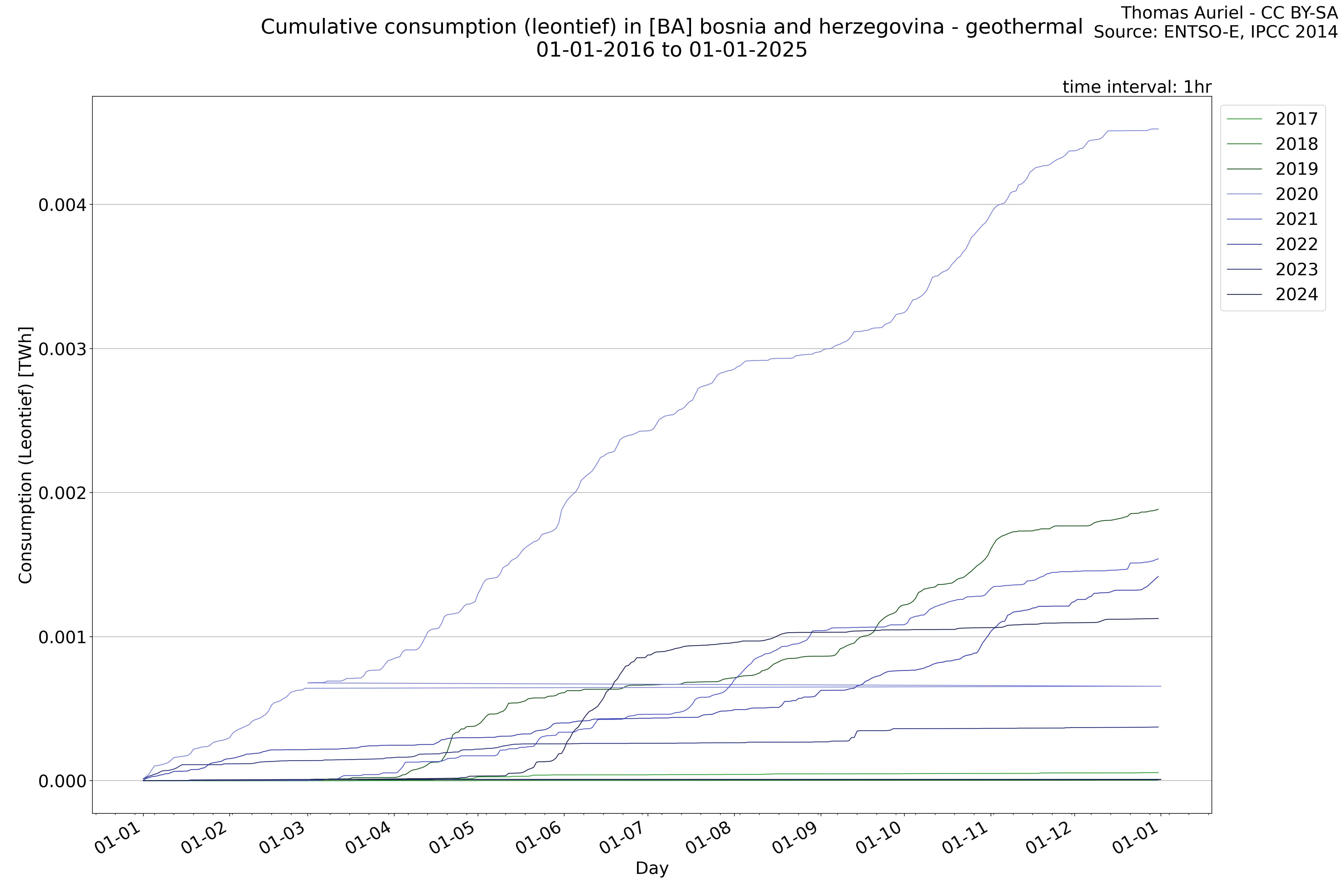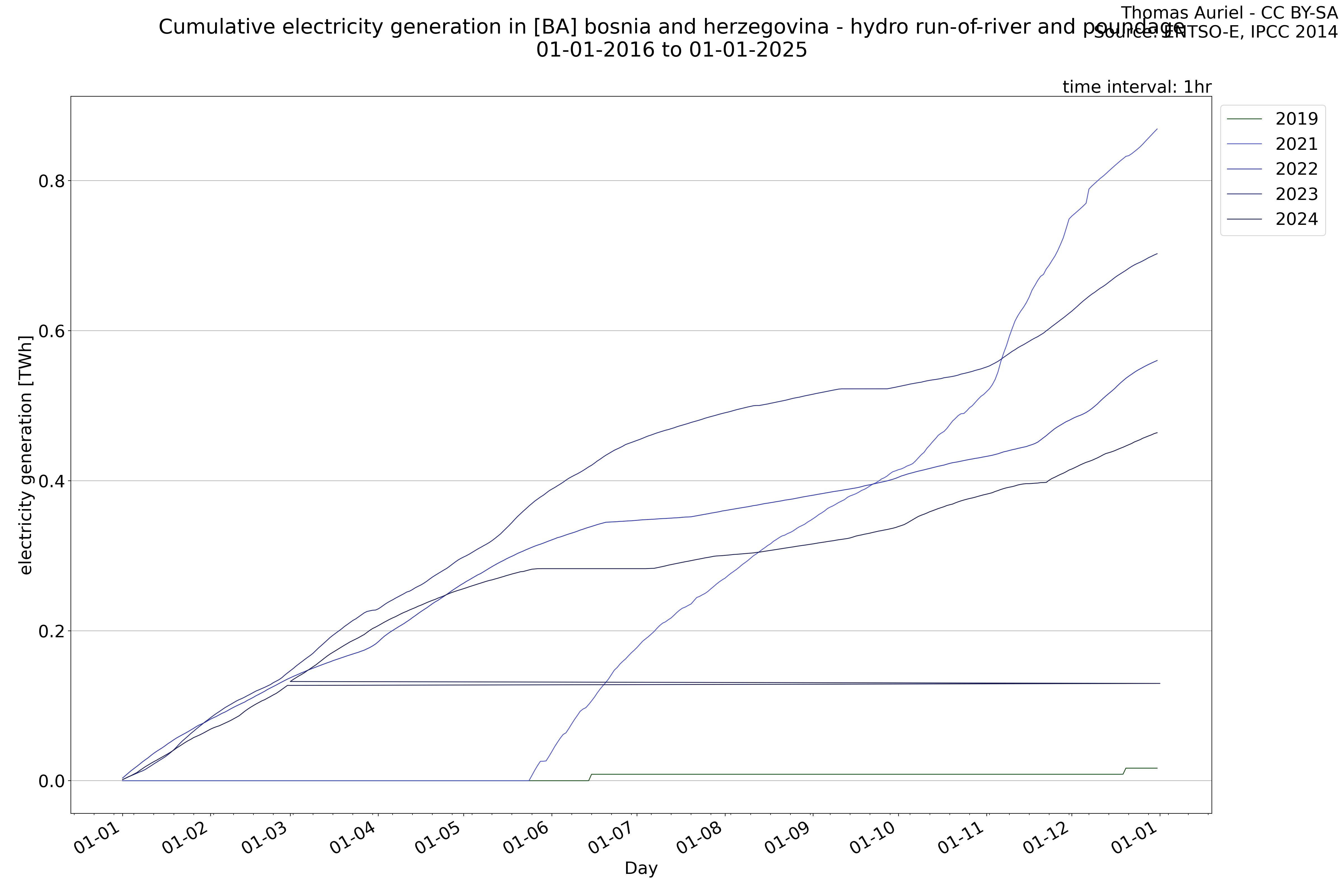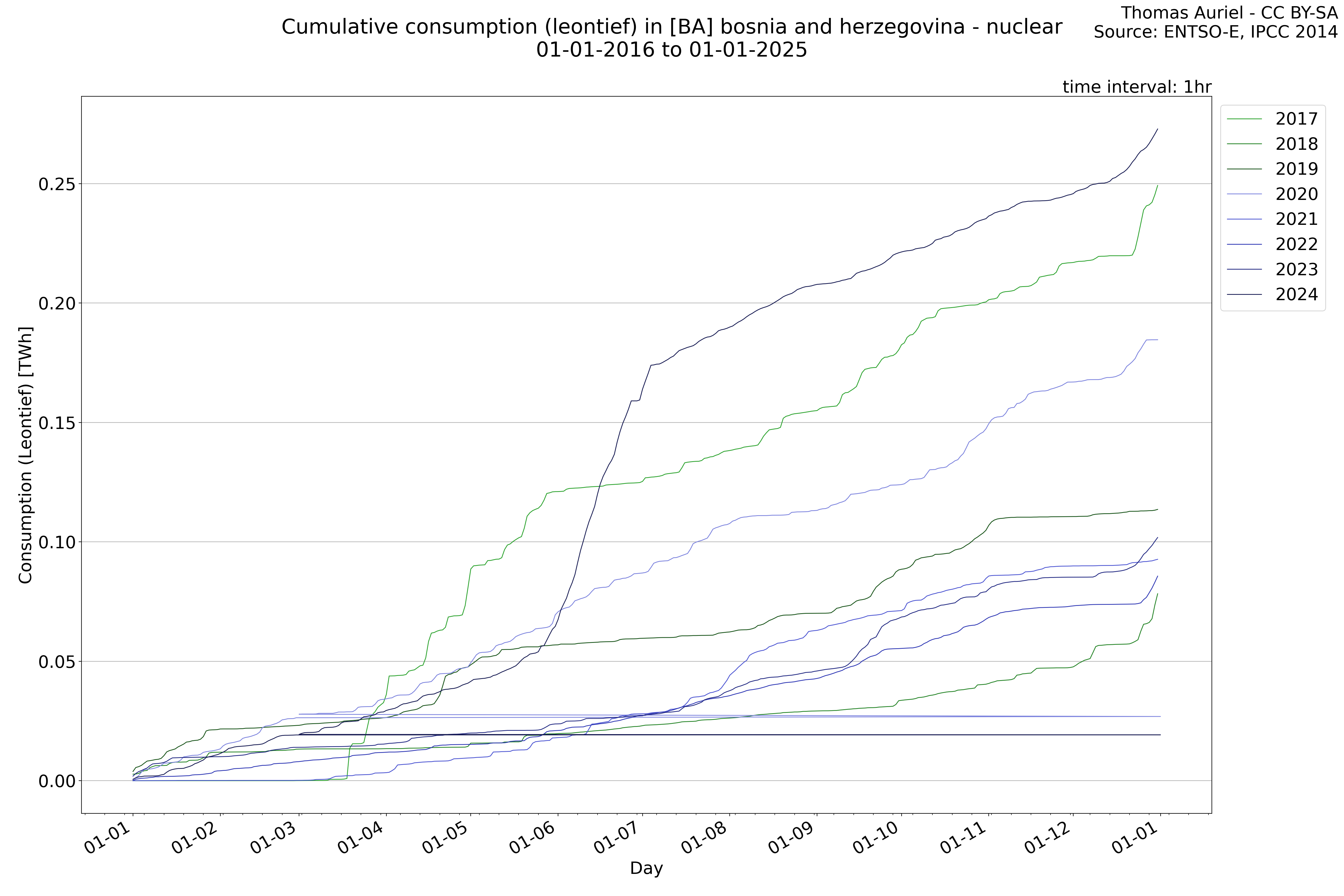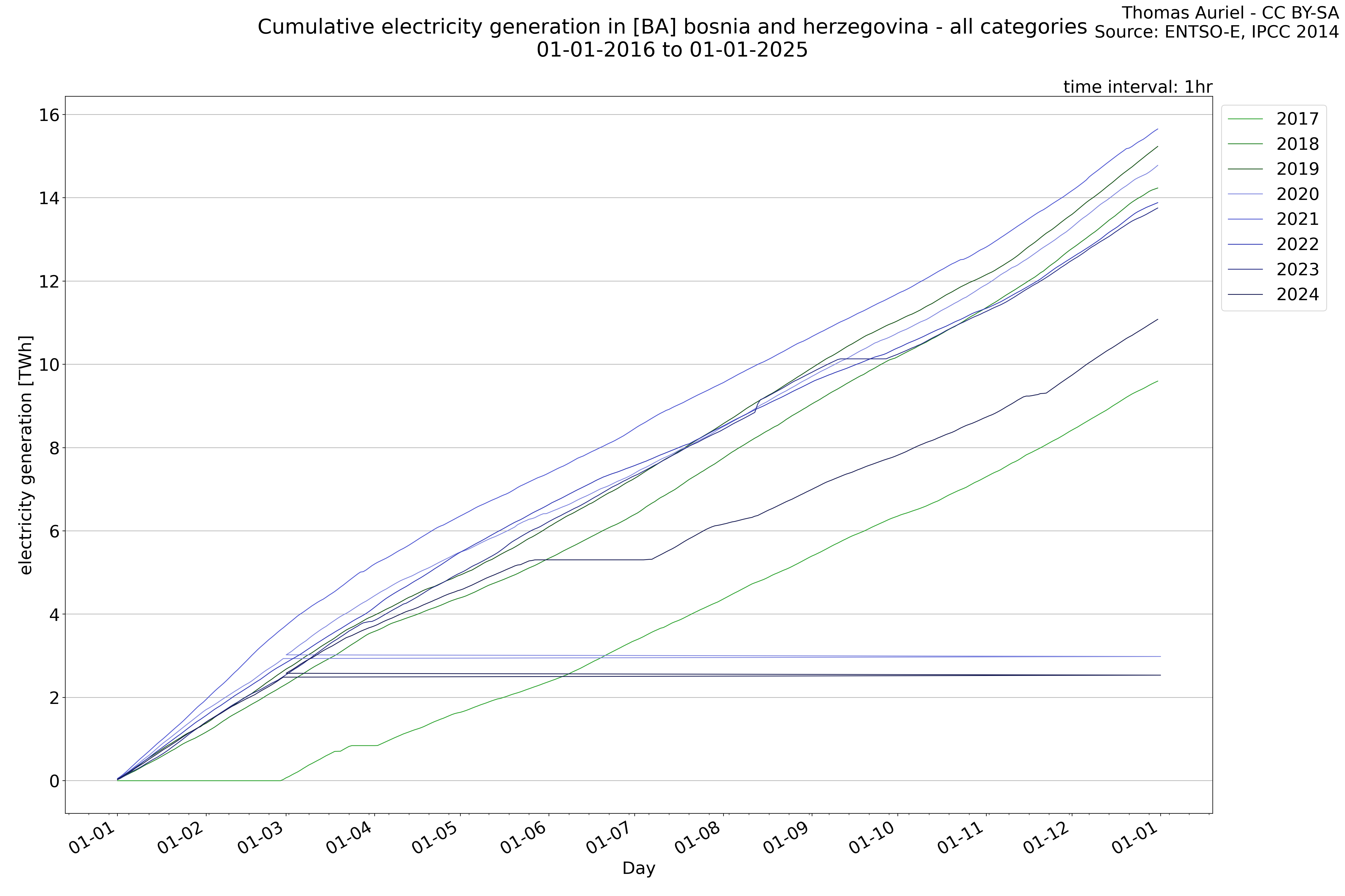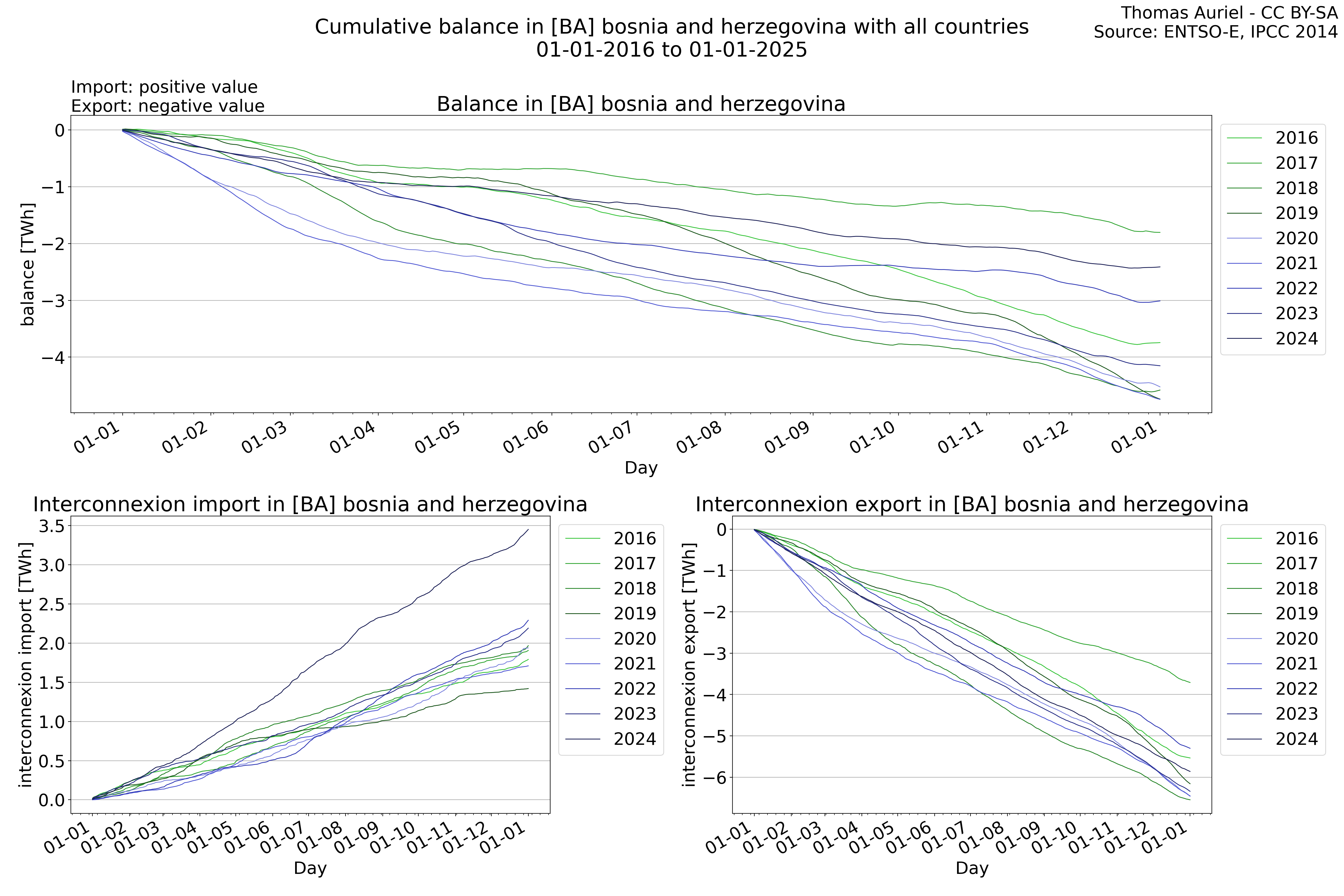 This plot is a cumulative sum plot, where each line represents the cumulative value of a specific metric (e.g., production, load, import, or export) for a given year. The plot begins at zero, and as the year progresses, the cumulative value is updated to reflect the total amount accumulated over time. This visualization illustrates the overall trend of the metric, showing whether the cumulative sum is increasing or decreasing, as well as any changes in the trend within the year. Additionally, the cumulative sum plot helps to reduce the impact of noise and short-term fluctuations commonly present in the raw data of production, load, import, or export. By smoothing out these variations, the plot emphasizes the broader, long-term trends. Consequently, this type of visualization facilitates a clearer understanding of the metric’s evolution across the year, revealing whether the activity follows a steady trajectory, shows signs of volatility, or experiences periods of significant change.
