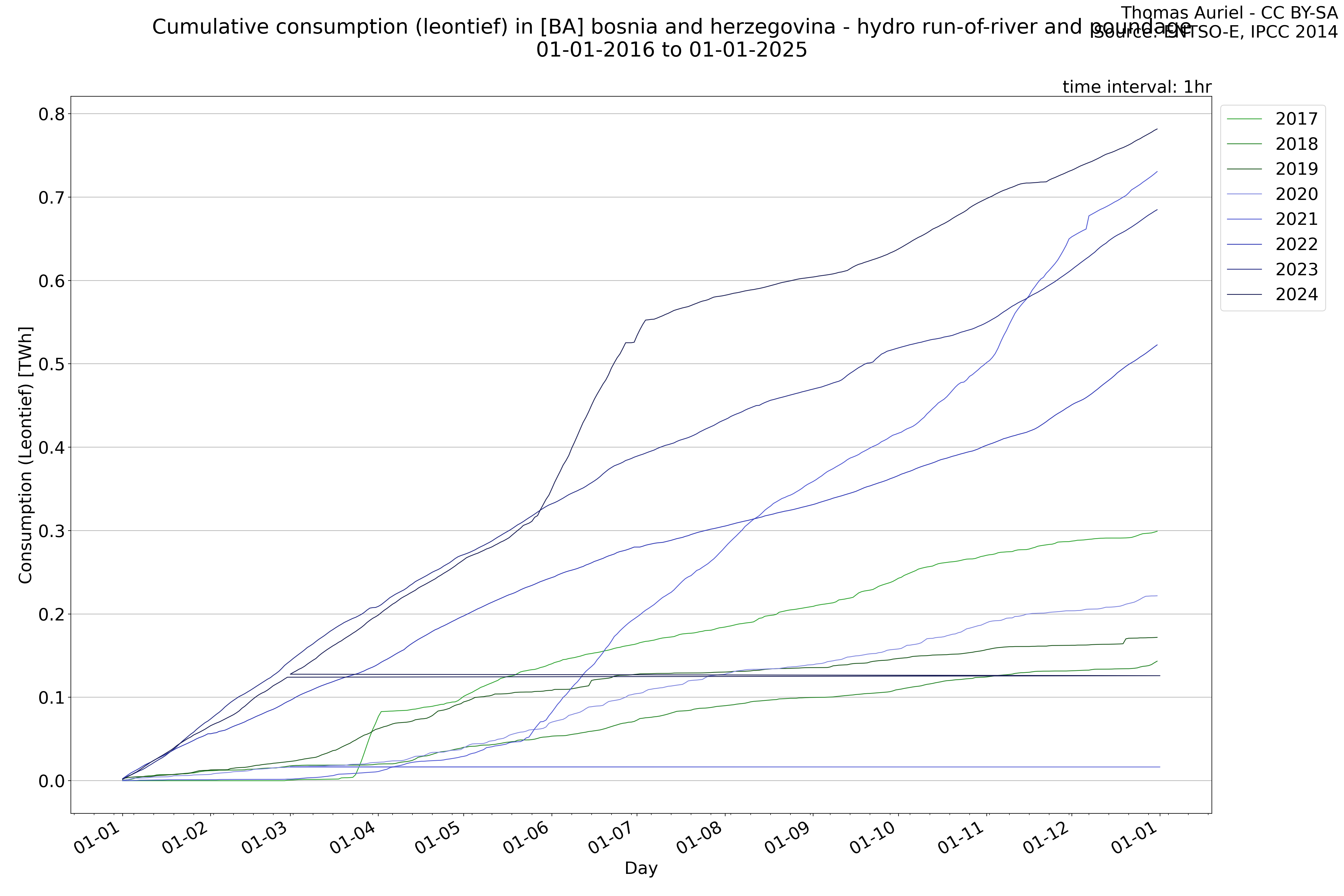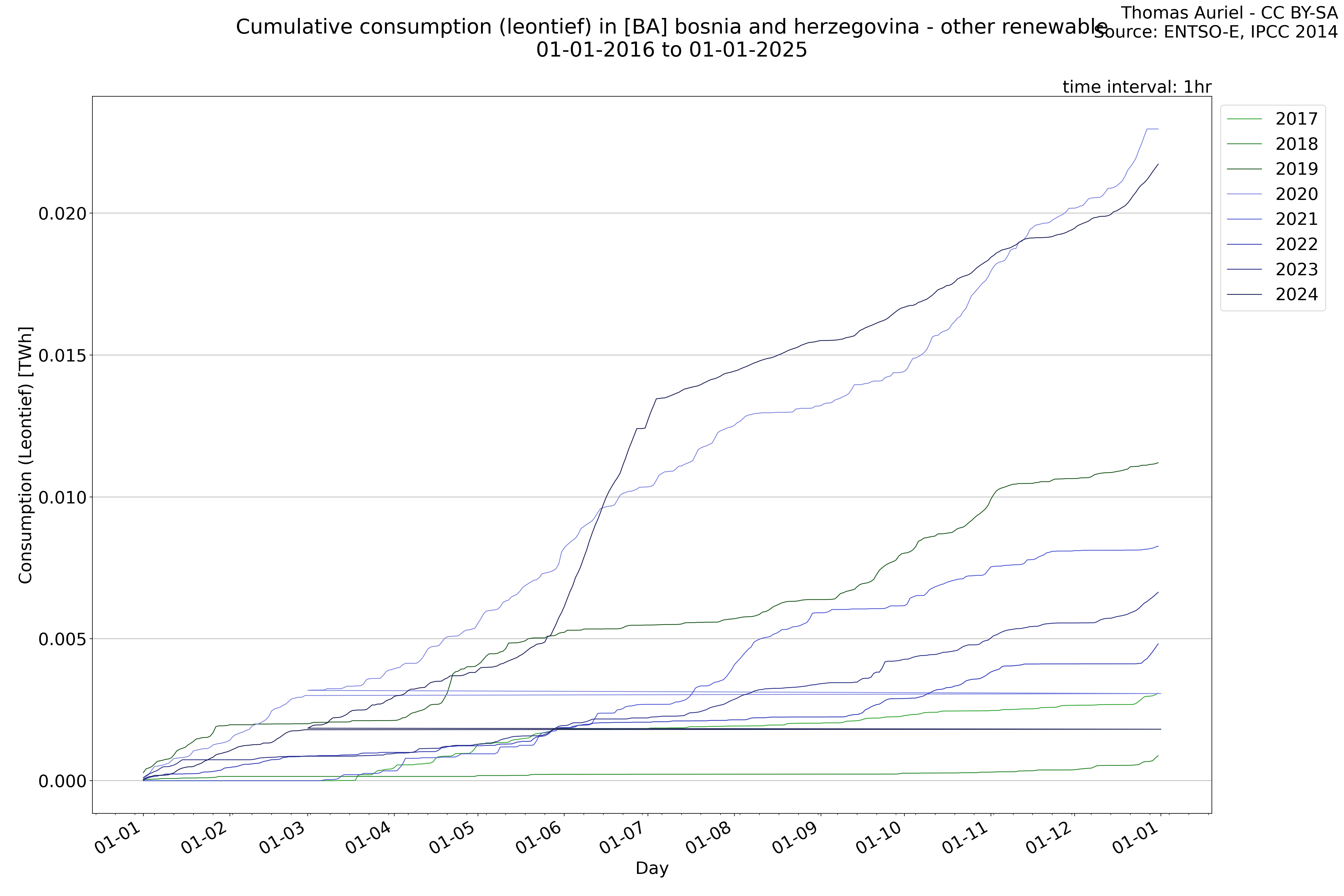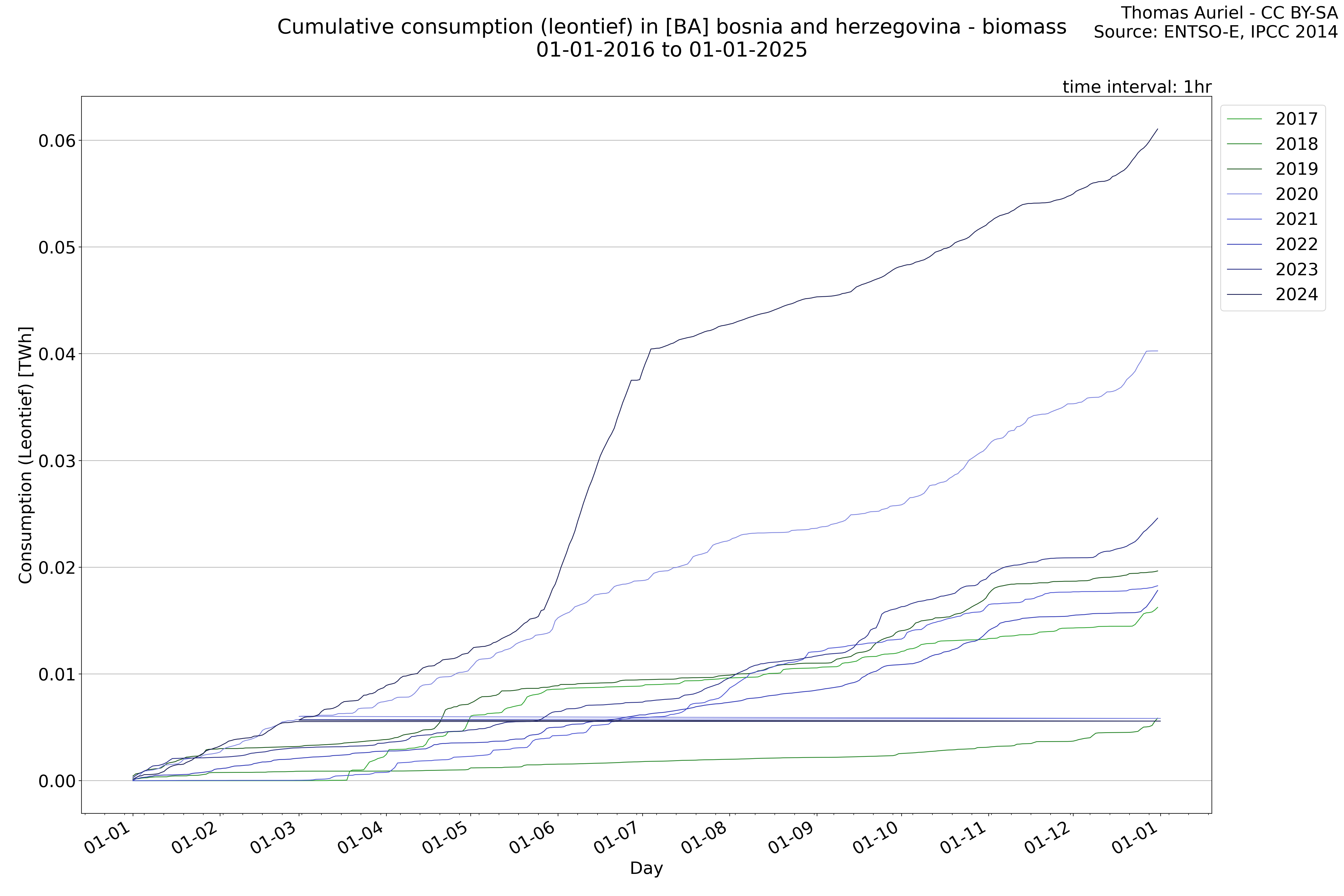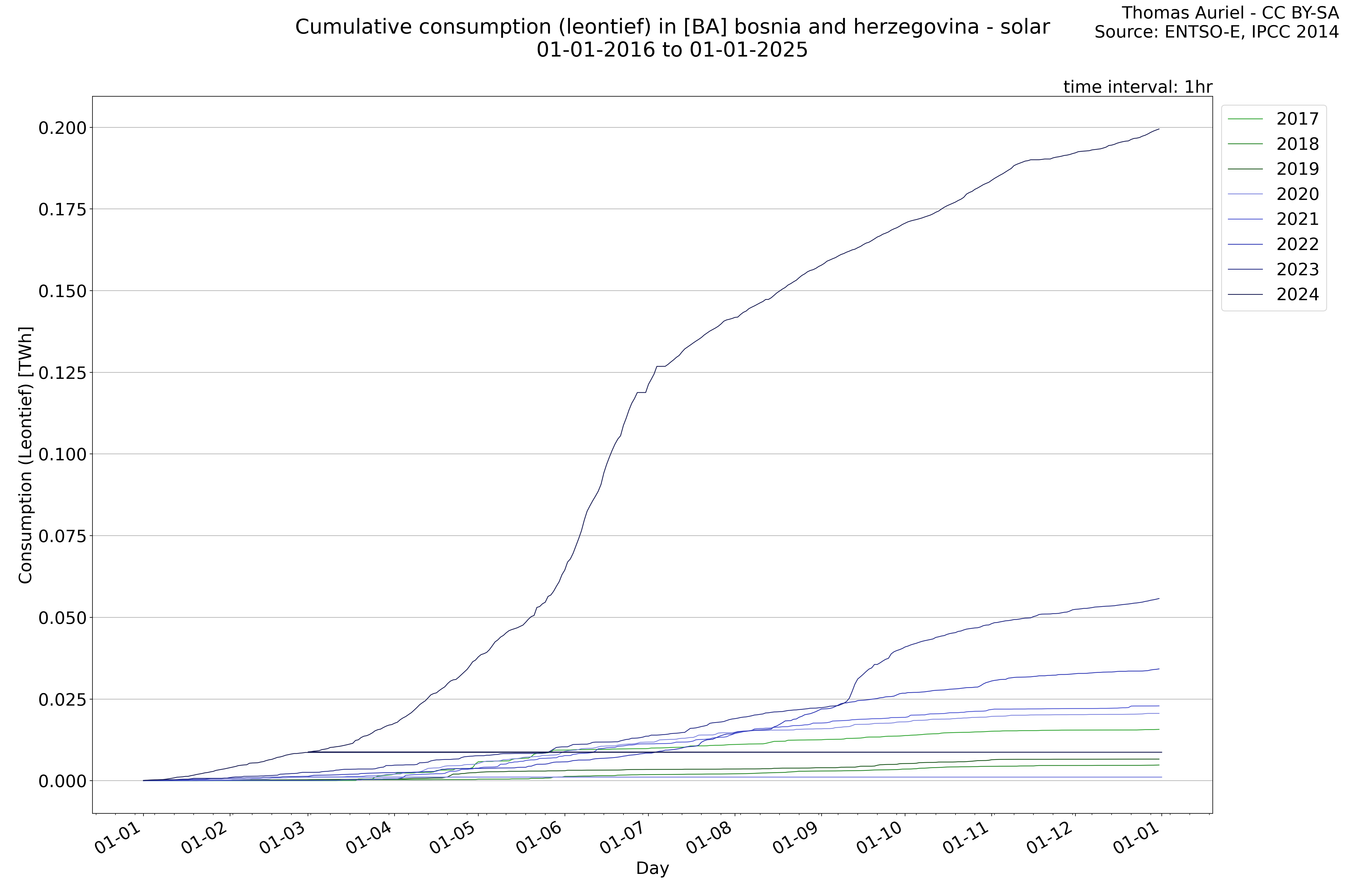 This plot is a cumulative sum plot, where each line represents the cumulative value of a specific metric (e.g., production, load, import, or export) for a given year. The plot begins at zero, and as the year progresses, the cumulative value is updated to reflect the total amount accumulated over time. This visualization illustrates the overall trend of the metric, showing whether the cumulative sum is increasing or decreasing, as well as any changes in the trend within the year. Additionally, the cumulative sum plot helps to reduce the impact of noise and short-term fluctuations commonly present in the raw data of production, load, import, or export. By smoothing out these variations, the plot emphasizes the broader, long-term trends. Consequently, this type of visualization facilitates a clearer understanding of the metric’s evolution across the year, revealing whether the activity follows a steady trajectory, shows signs of volatility, or experiences periods of significant change.
