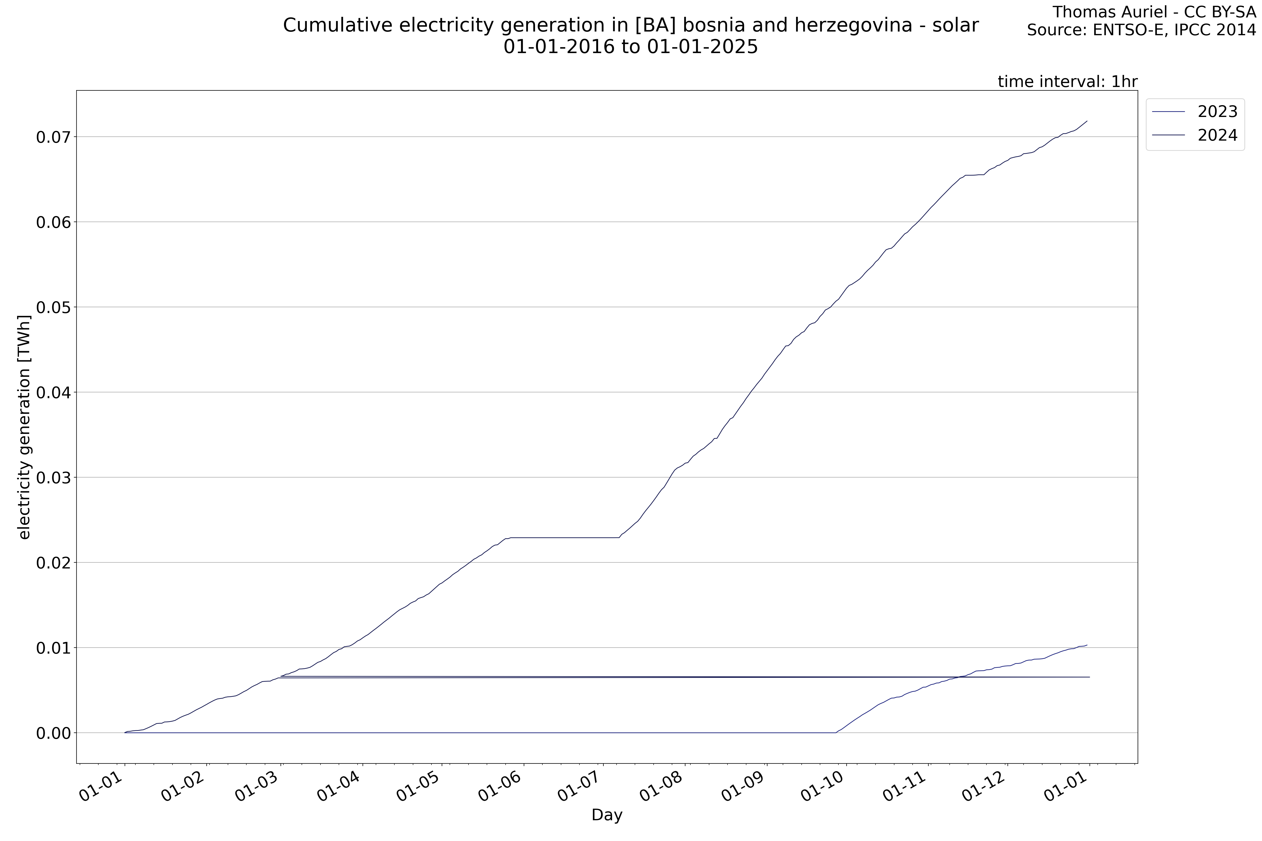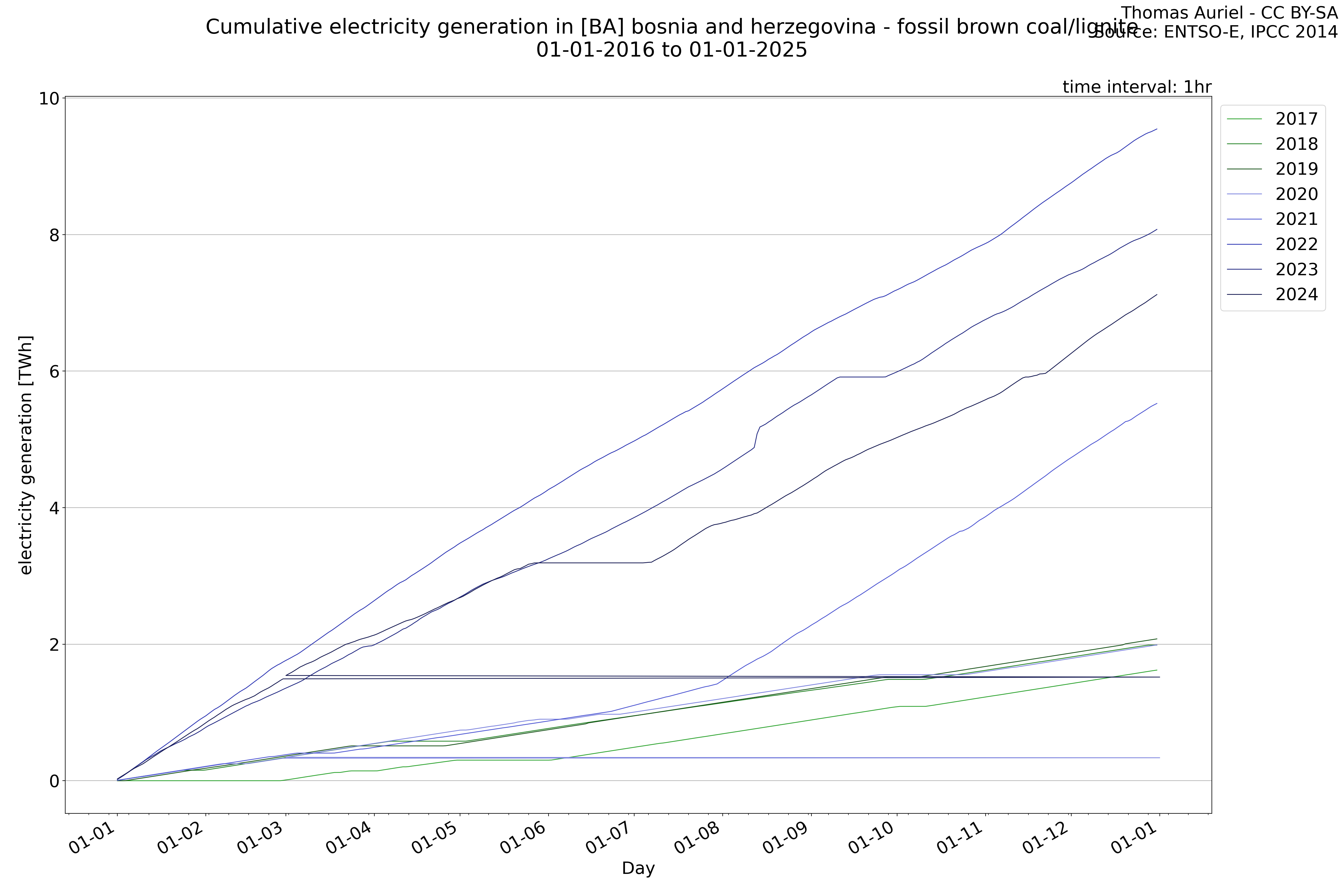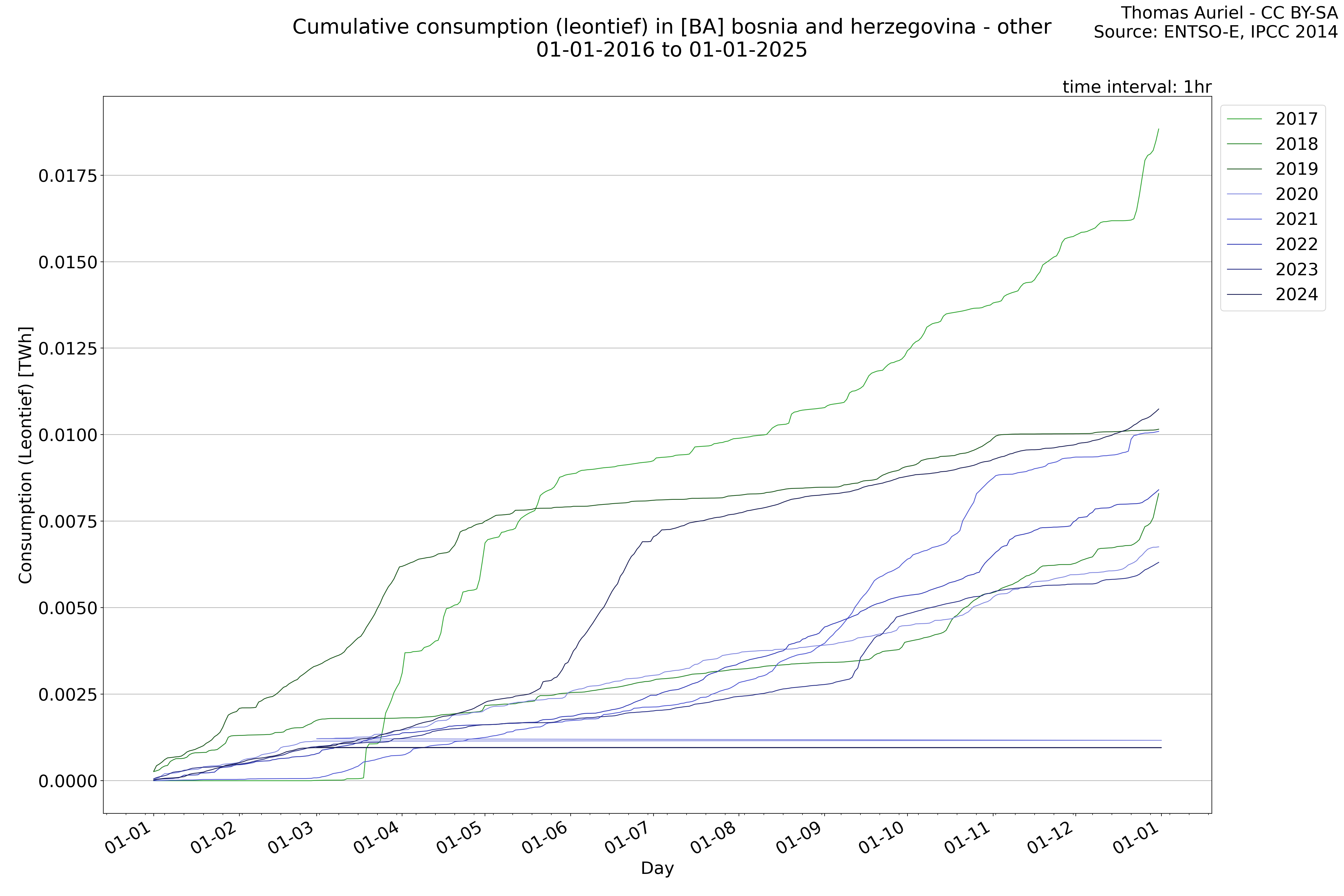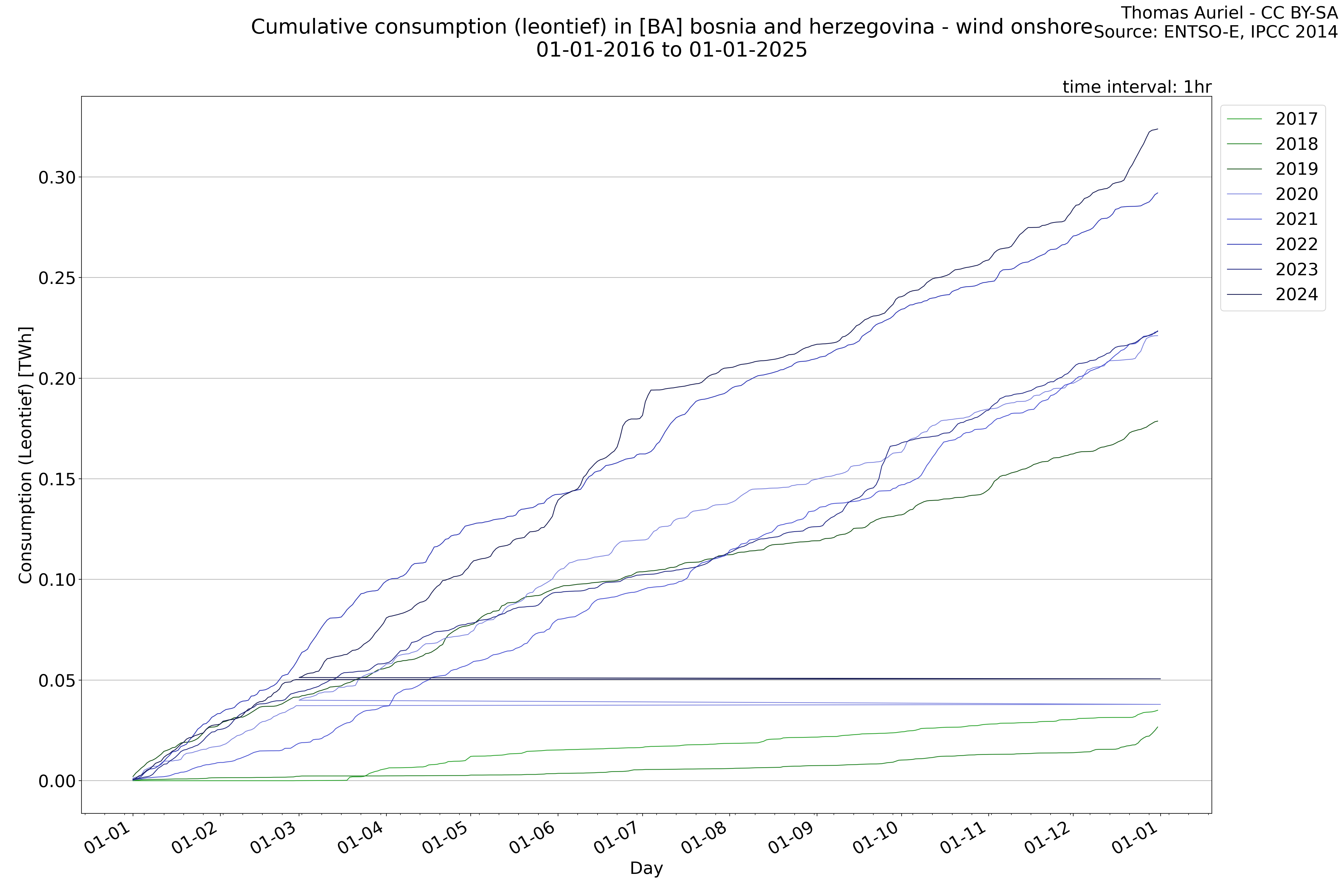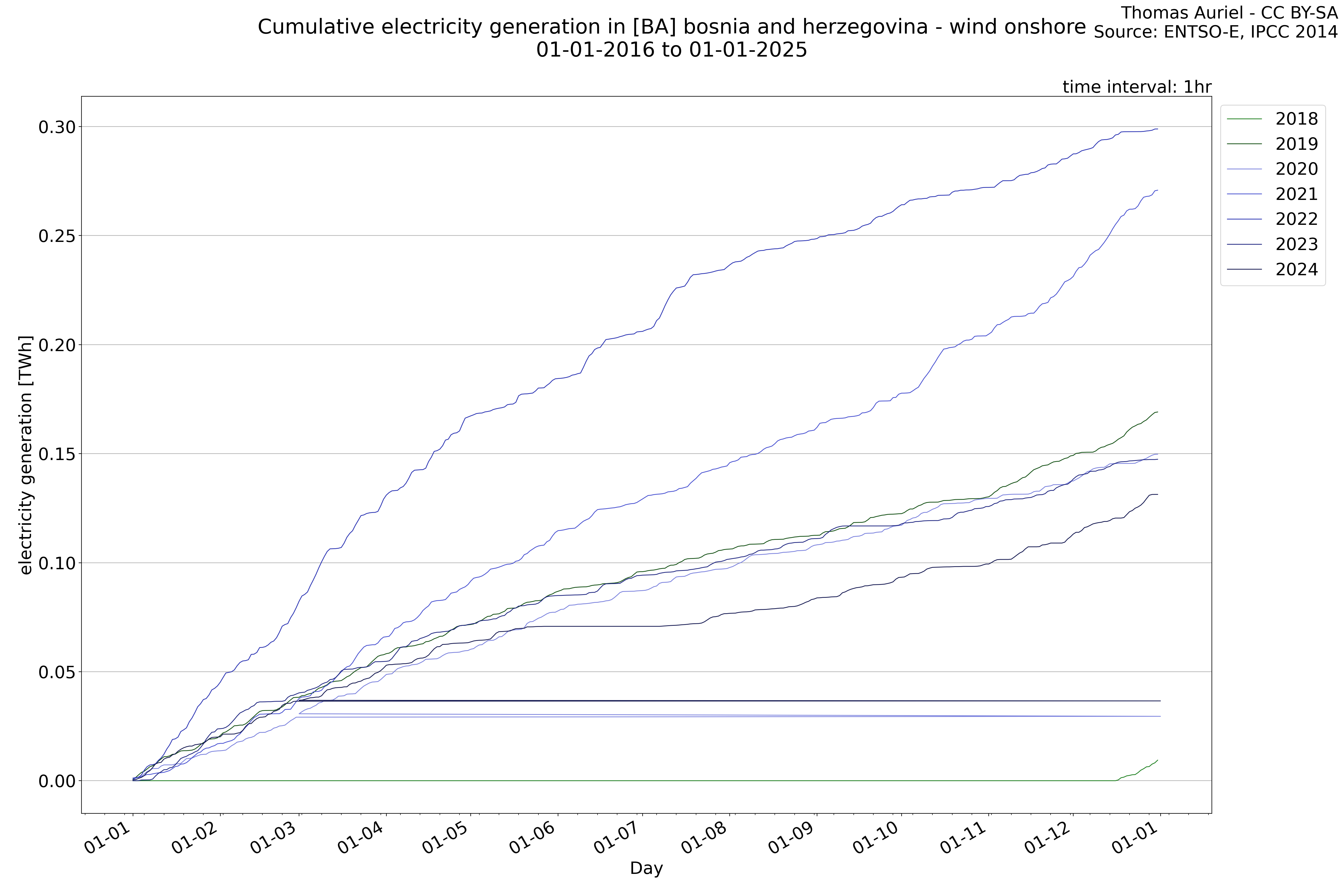 This plot is a cumulative sum plot, where each line represents the cumulative value of a specific metric (e.g., production, load, import, or export) for a given year. The plot begins at zero, and as the year progresses, the cumulative value is updated to reflect the total amount accumulated over time. This visualization illustrates the overall trend of the metric, showing whether the cumulative sum is increasing or decreasing, as well as any changes in the trend within the year. Additionally, the cumulative sum plot helps to reduce the impact of noise and short-term fluctuations commonly present in the raw data of production, load, import, or export. By smoothing out these variations, the plot emphasizes the broader, long-term trends. Consequently, this type of visualization facilitates a clearer understanding of the metric’s evolution across the year, revealing whether the activity follows a steady trajectory, shows signs of volatility, or experiences periods of significant change.