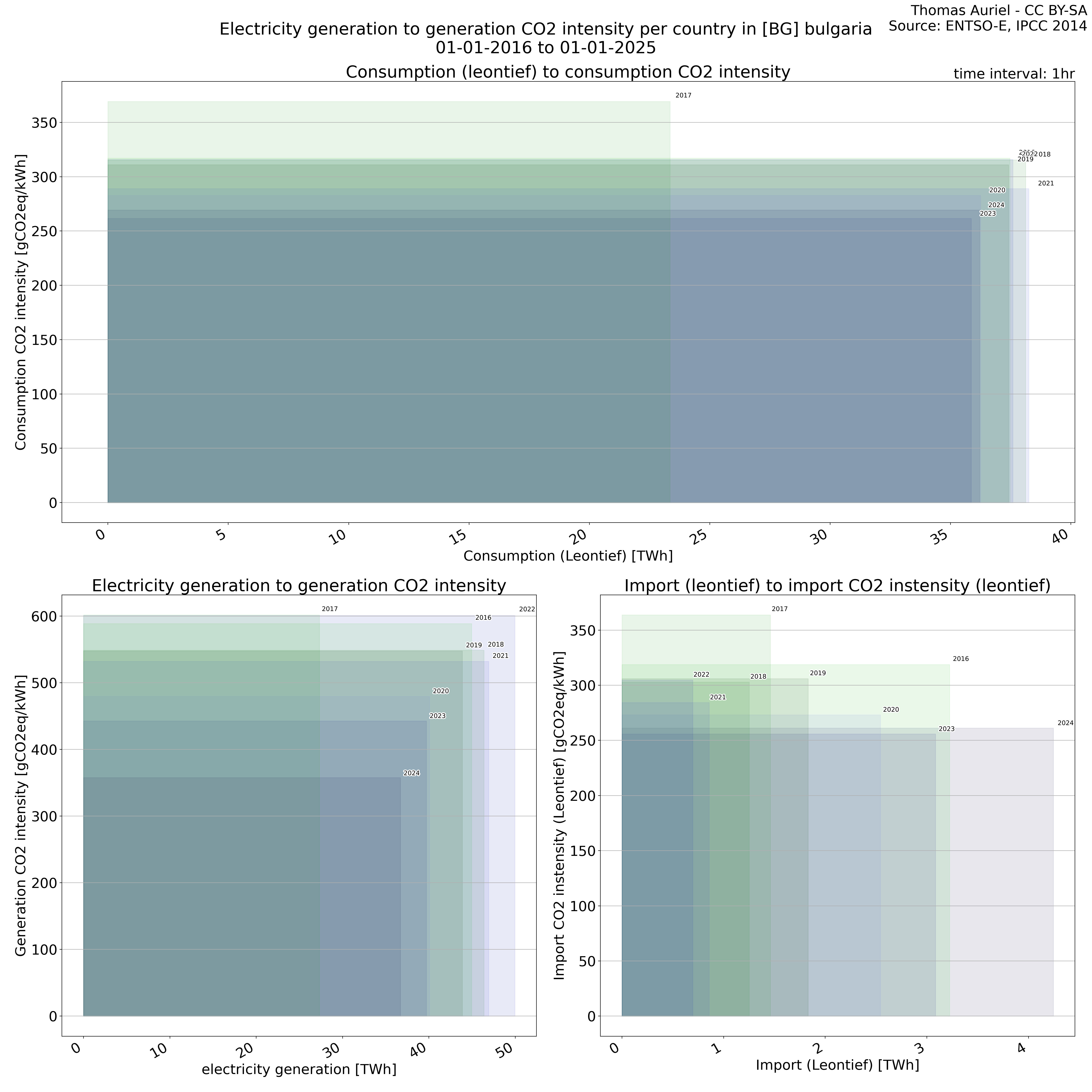 The plot consists of squares, each representing a single year, designed to illustrate electricity-related metrics and their associated environmental impacts. The length of each square corresponds to the total electricity consumption, generation, or imports during the year, with longer squares indicating higher overall values for the respective metric. The height of each square represents the average CO₂ intensity (e.g., grams of CO₂ per kWh) associated with electricity consumption, generation, or imports; hence, taller squares signify greater environmental impact per unit of electricity. Finally, the surface area of each square, determined by the product of its length and height, represents the total CO₂ emissions associated with the respective activity in the given year.