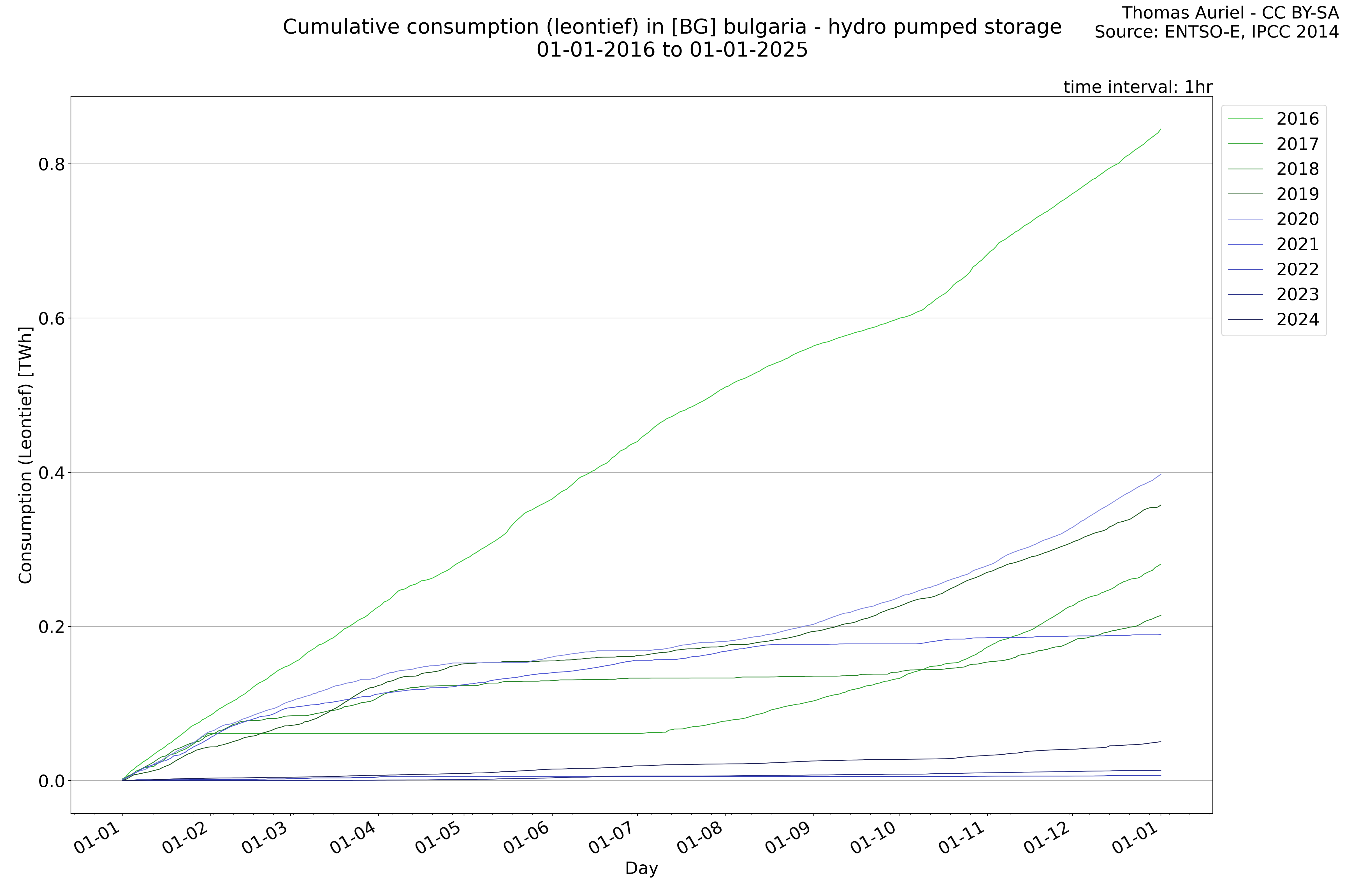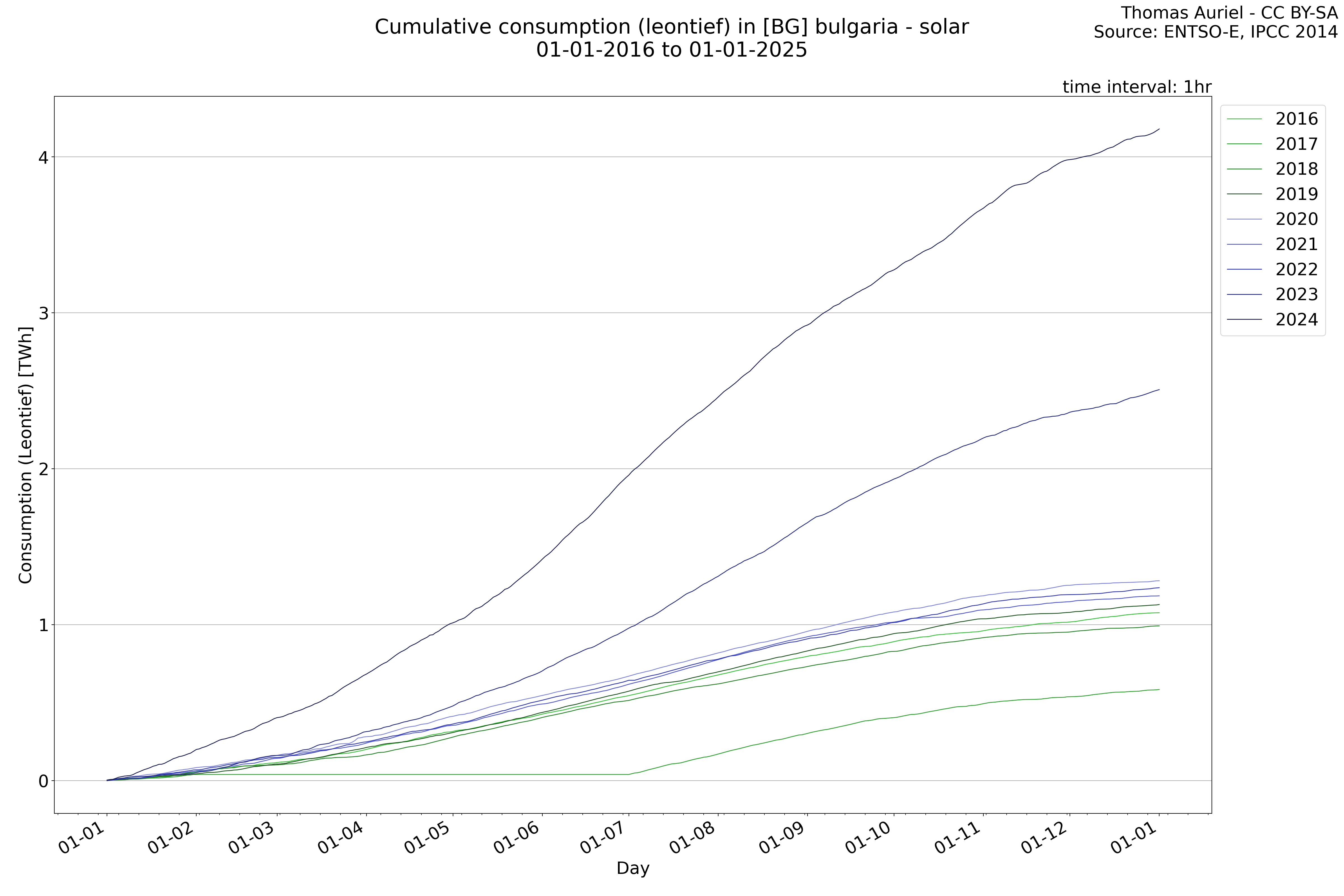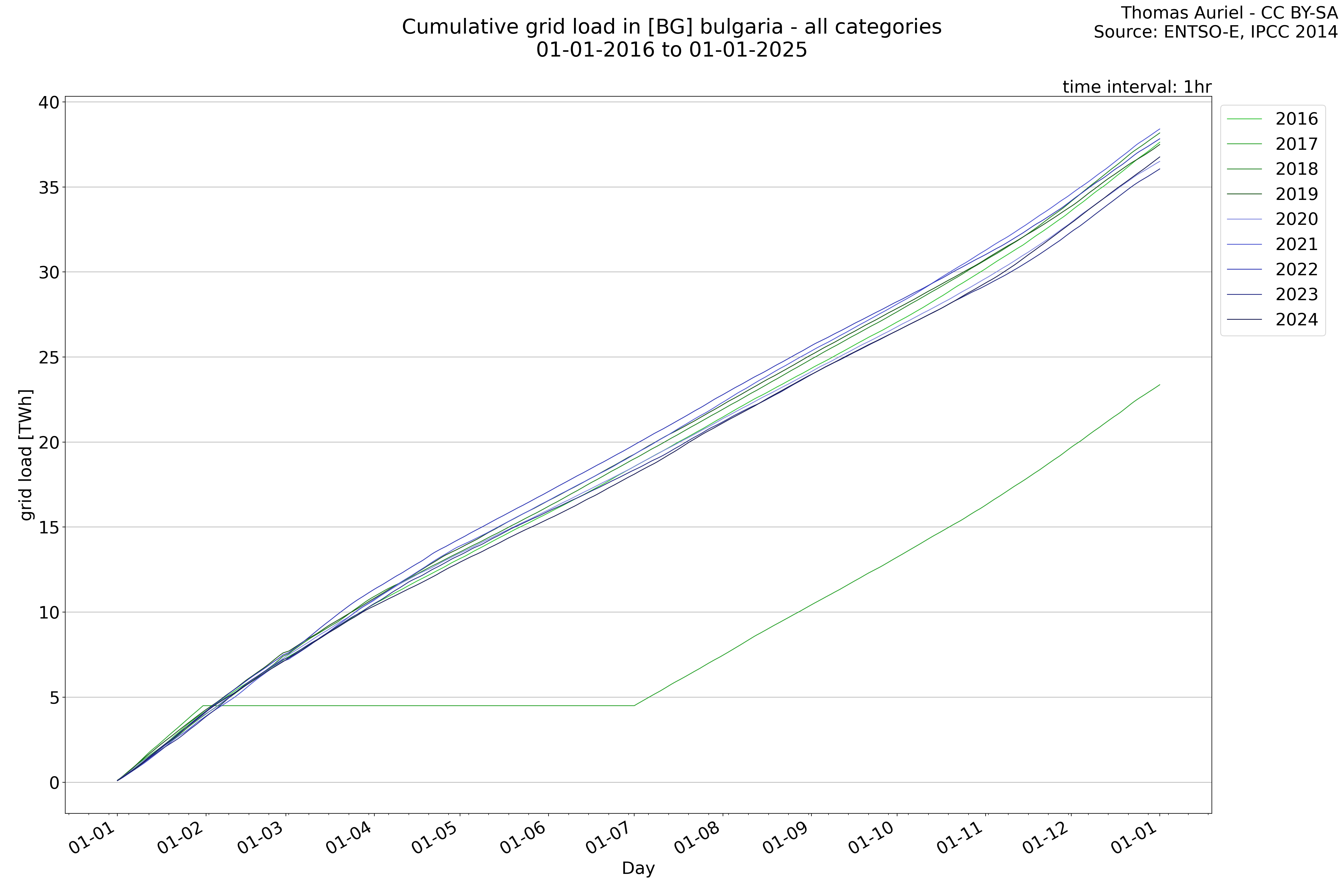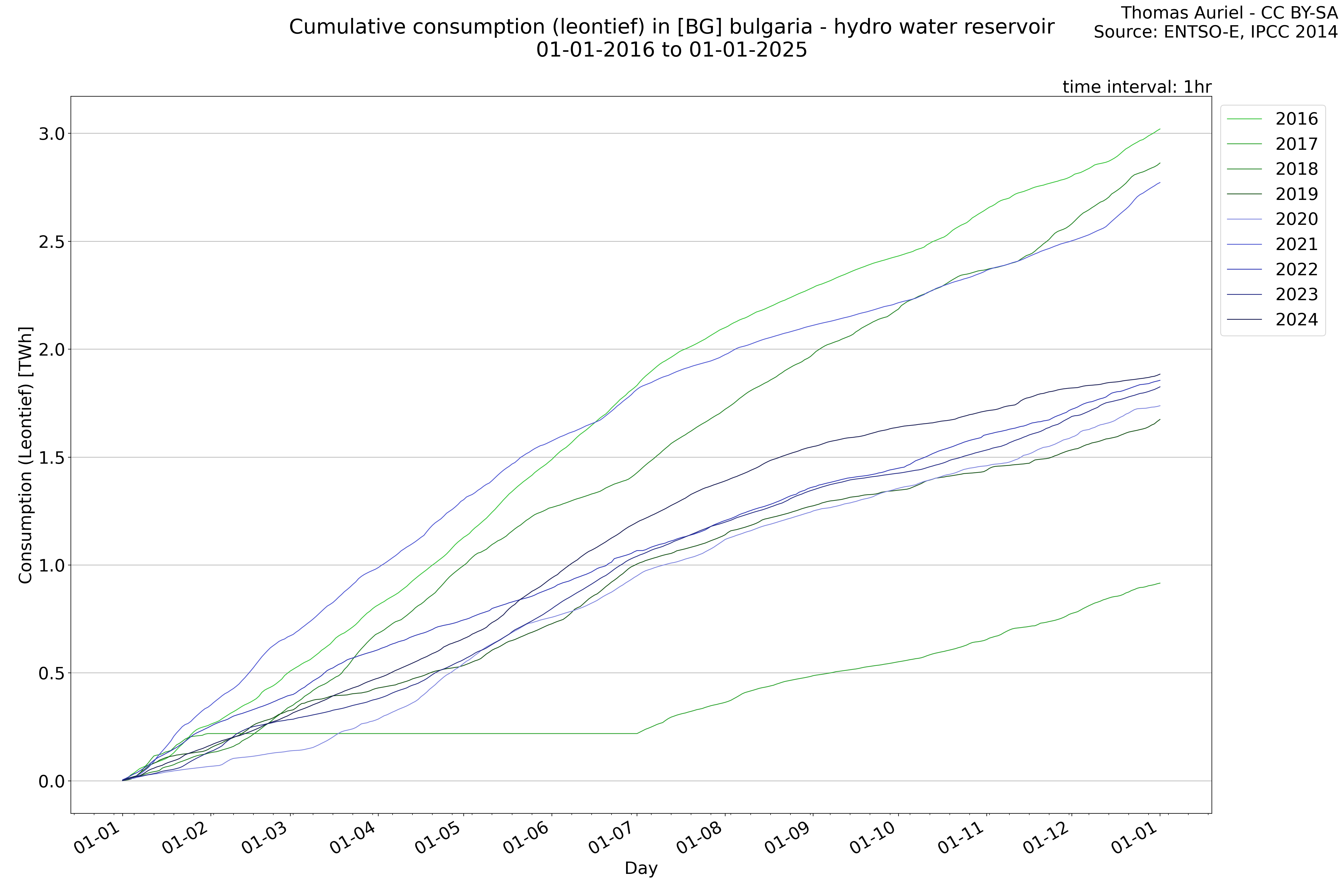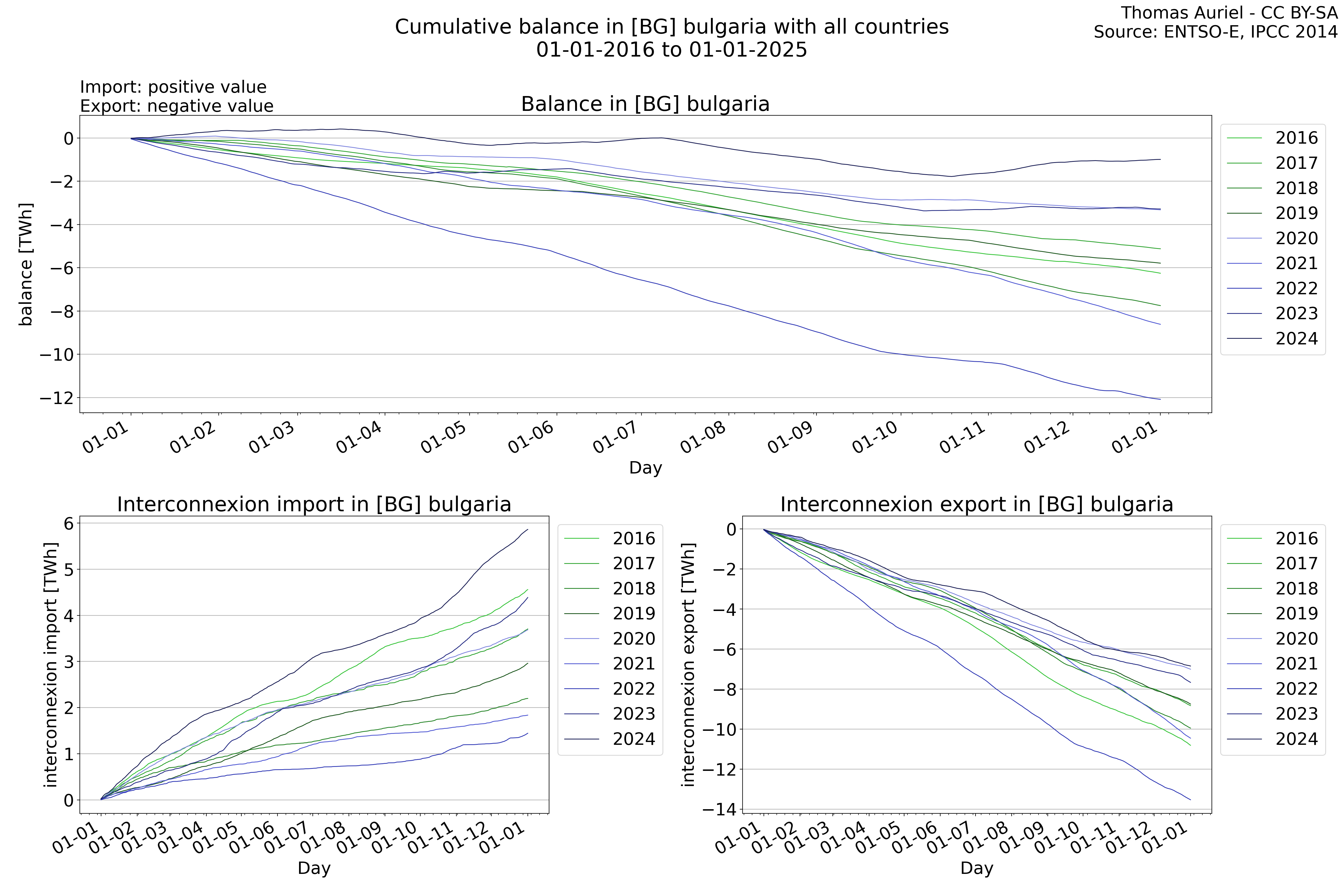 This plot is a cumulative sum plot, where each line represents the cumulative value of a specific metric (e.g., production, load, import, or export) for a given year. The plot begins at zero, and as the year progresses, the cumulative value is updated to reflect the total amount accumulated over time. This visualization illustrates the overall trend of the metric, showing whether the cumulative sum is increasing or decreasing, as well as any changes in the trend within the year. Additionally, the cumulative sum plot helps to reduce the impact of noise and short-term fluctuations commonly present in the raw data of production, load, import, or export. By smoothing out these variations, the plot emphasizes the broader, long-term trends. Consequently, this type of visualization facilitates a clearer understanding of the metric’s evolution across the year, revealing whether the activity follows a steady trajectory, shows signs of volatility, or experiences periods of significant change.