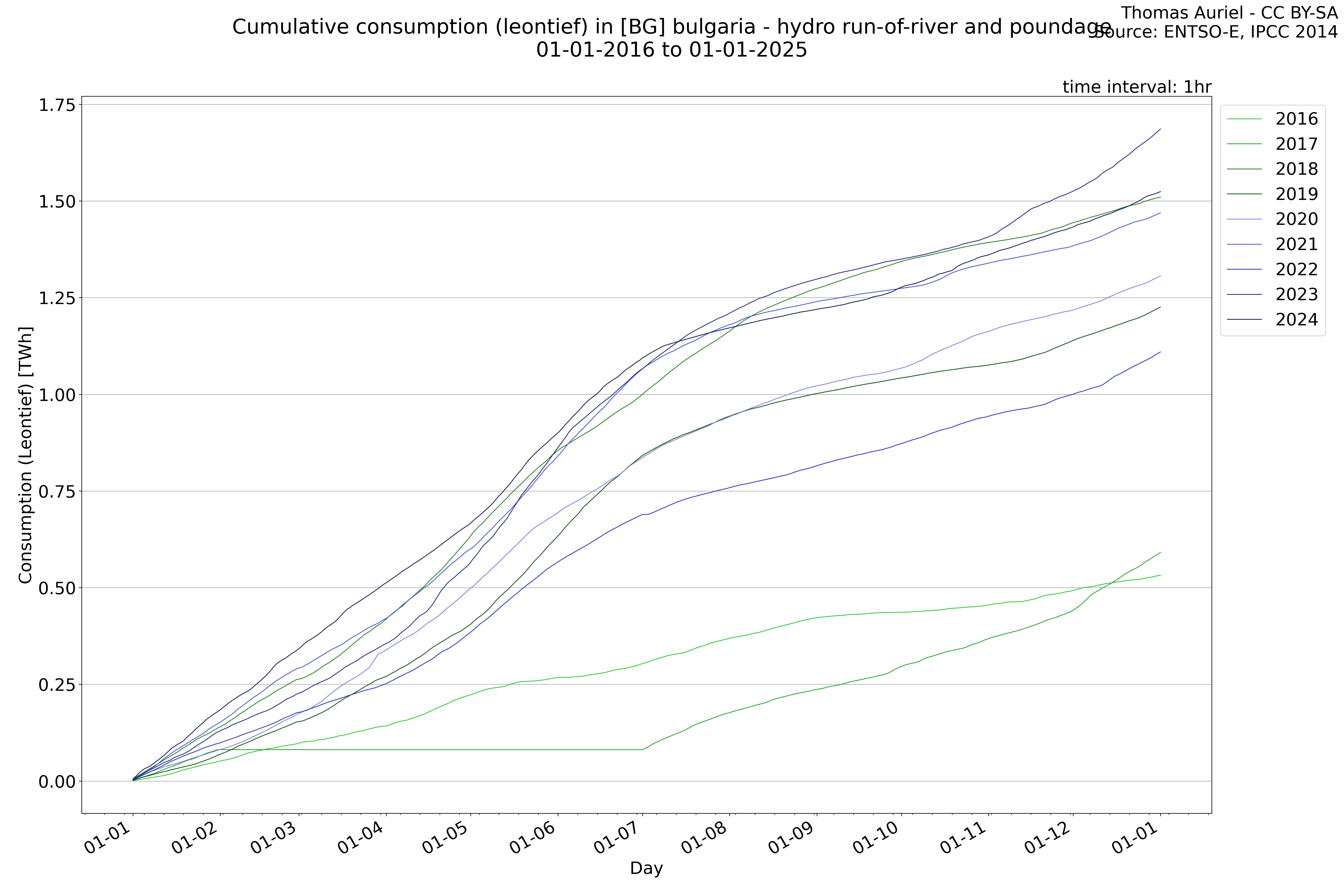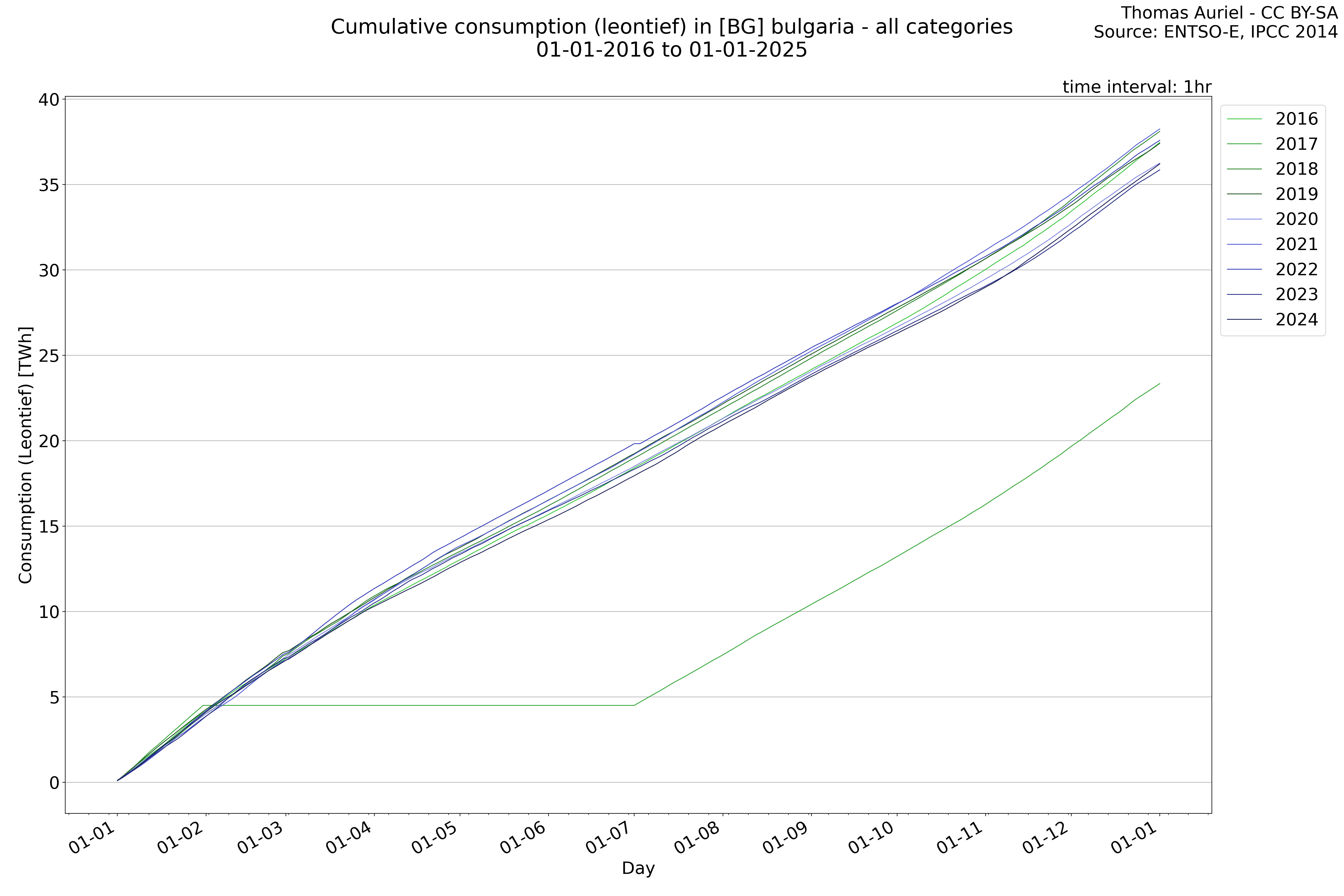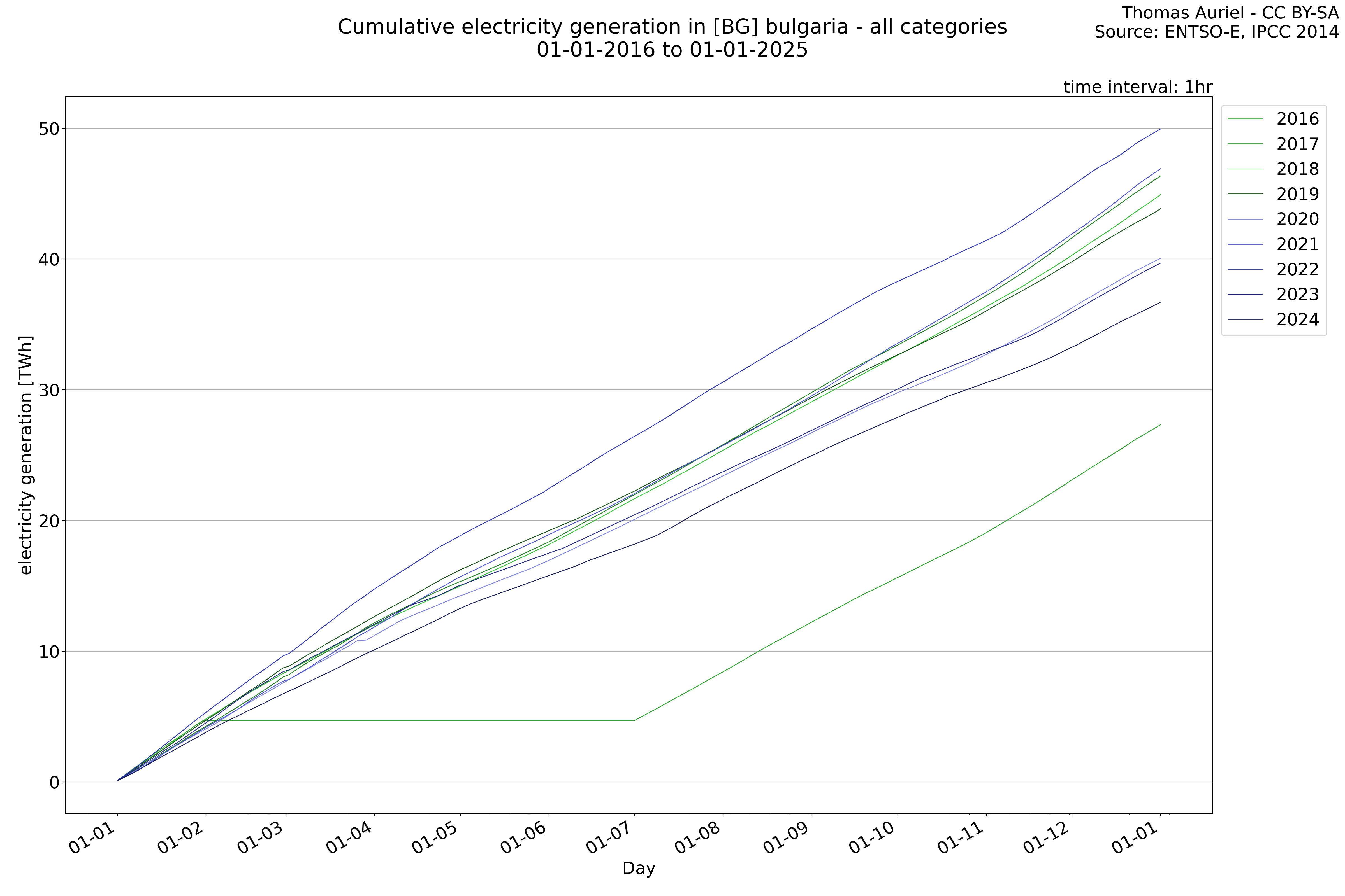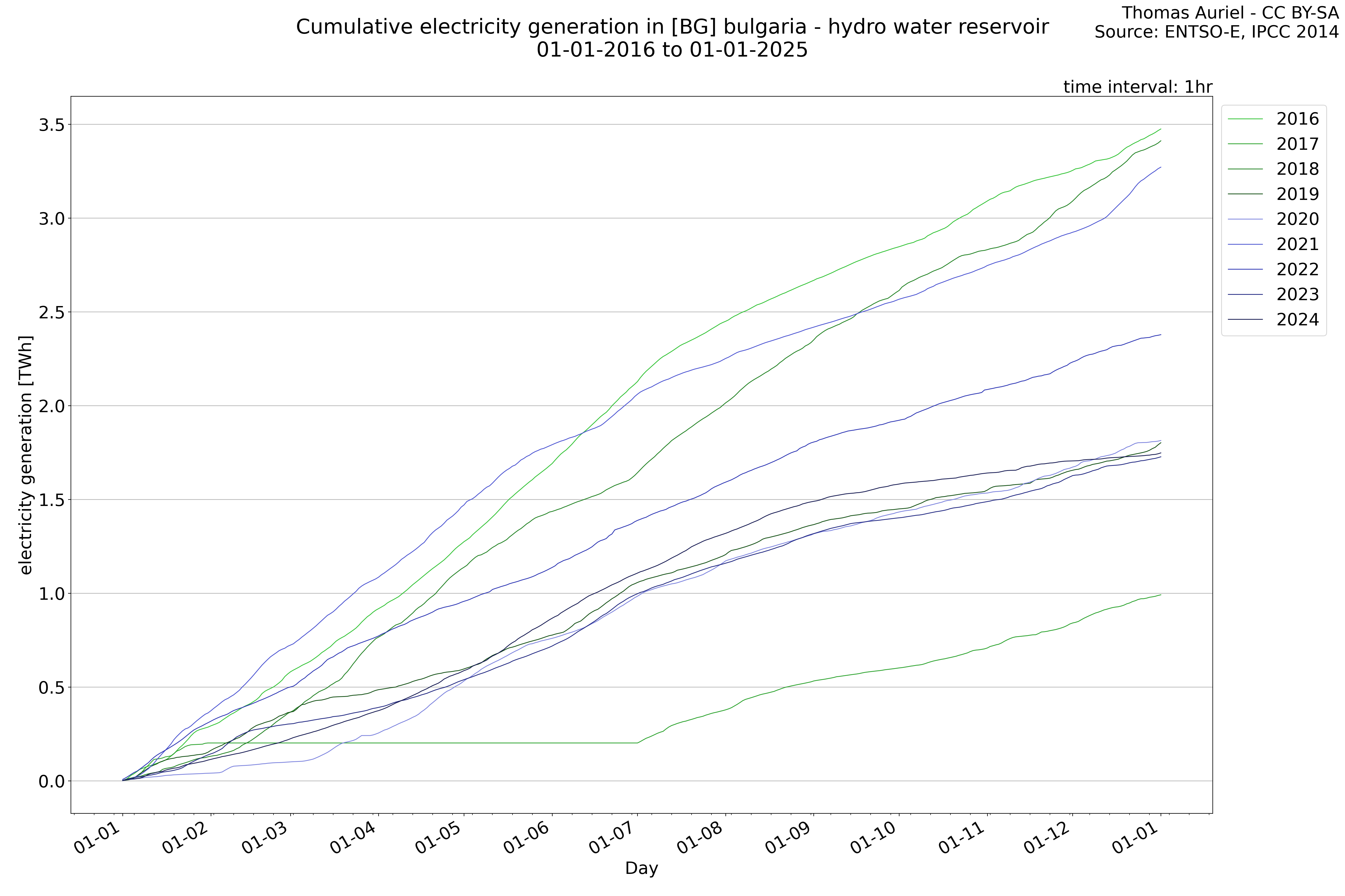 This plot is a cumulative sum plot, where each line represents the cumulative value of a specific metric (e.g., production, load, import, or export) for a given year. The plot begins at zero, and as the year progresses, the cumulative value is updated to reflect the total amount accumulated over time. This visualization illustrates the overall trend of the metric, showing whether the cumulative sum is increasing or decreasing, as well as any changes in the trend within the year. Additionally, the cumulative sum plot helps to reduce the impact of noise and short-term fluctuations commonly present in the raw data of production, load, import, or export. By smoothing out these variations, the plot emphasizes the broader, long-term trends. Consequently, this type of visualization facilitates a clearer understanding of the metric’s evolution across the year, revealing whether the activity follows a steady trajectory, shows signs of volatility, or experiences periods of significant change.