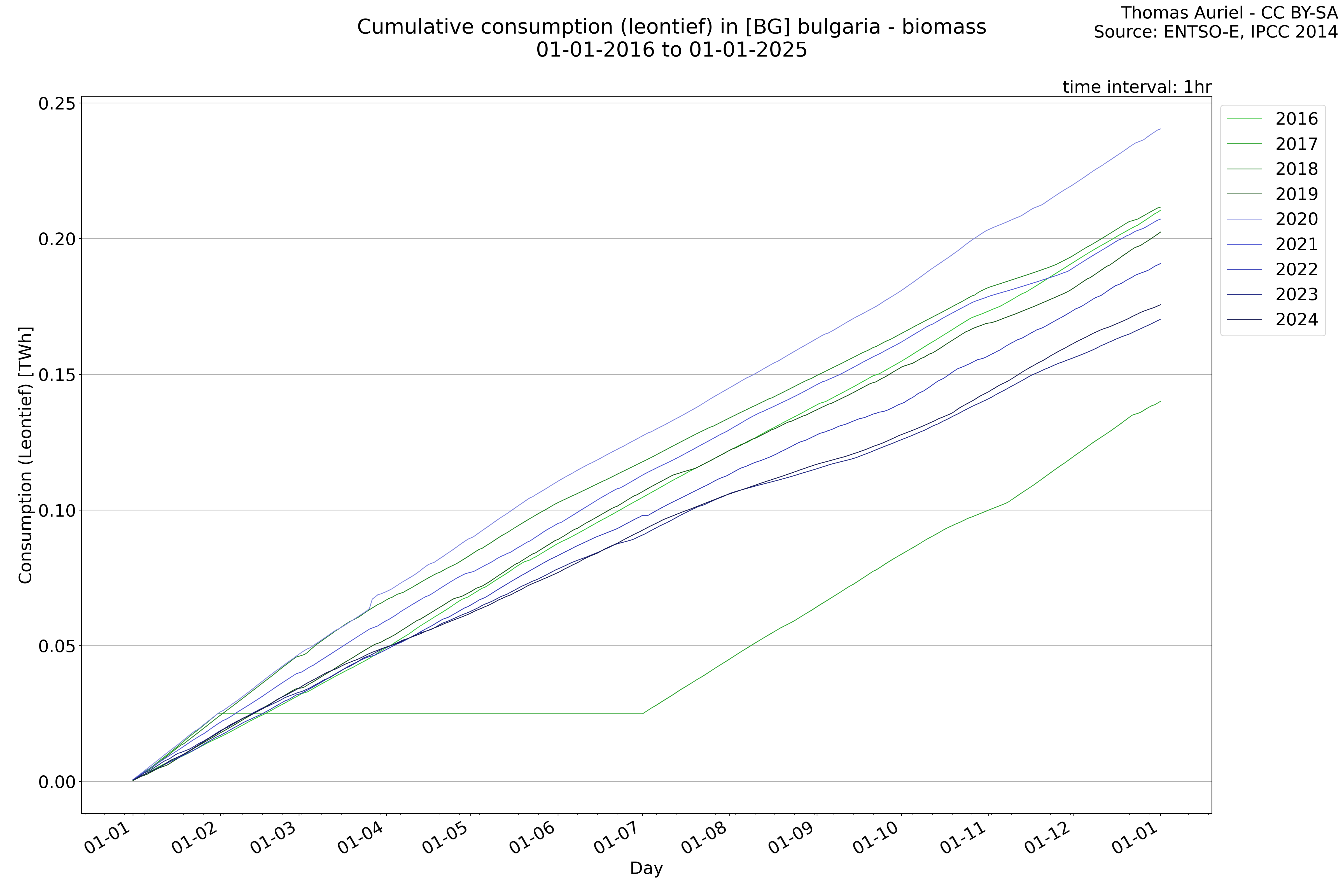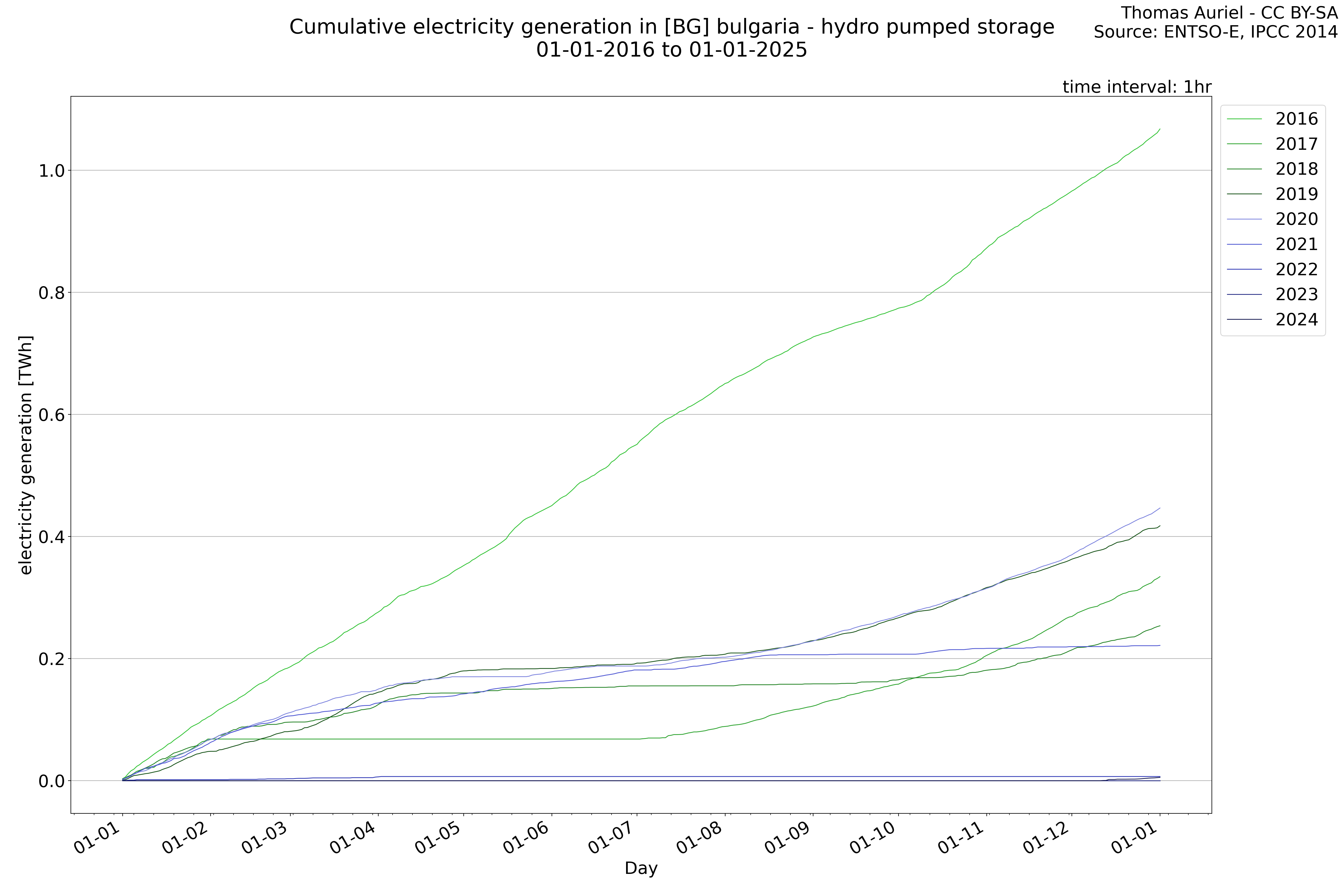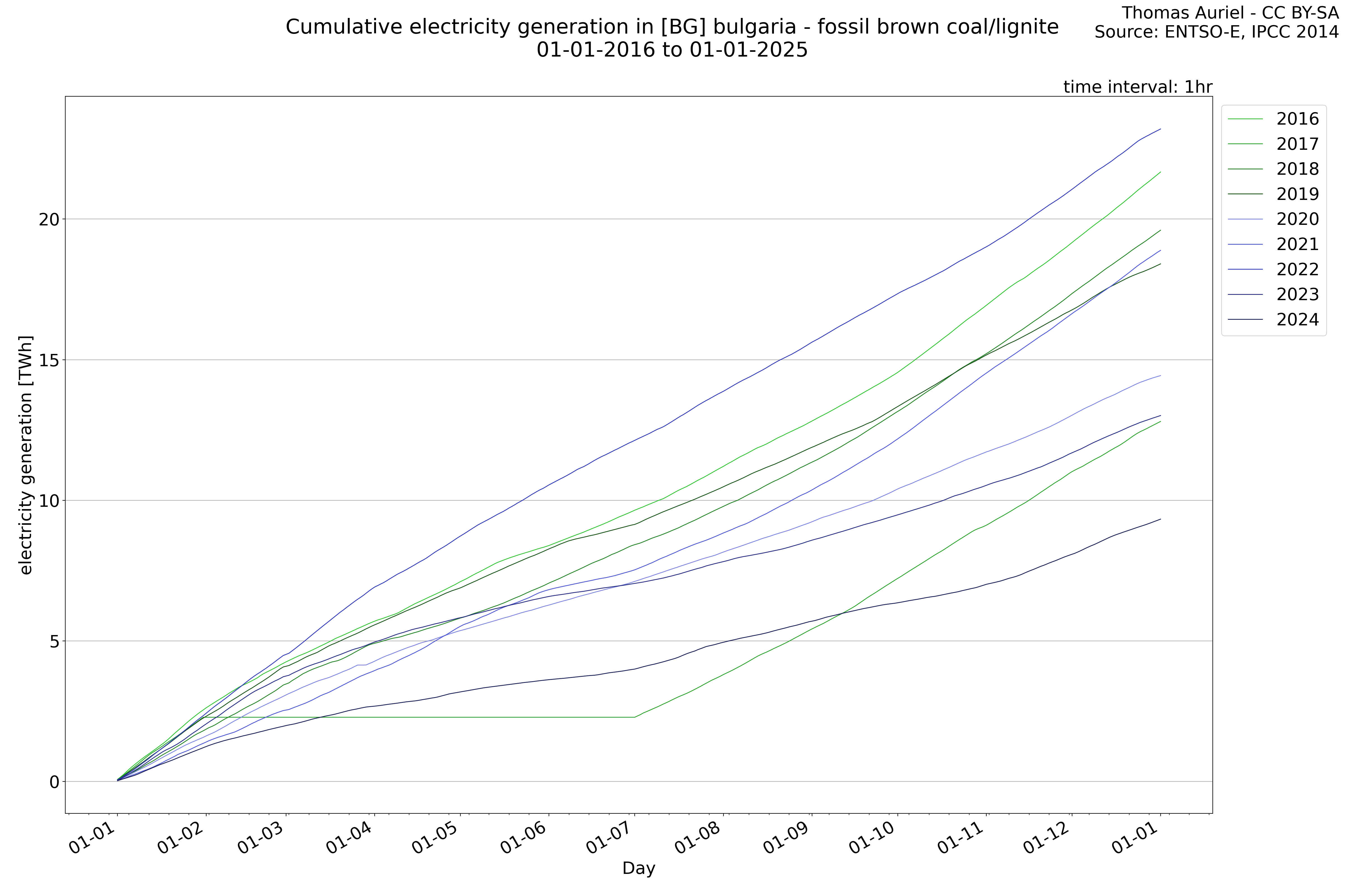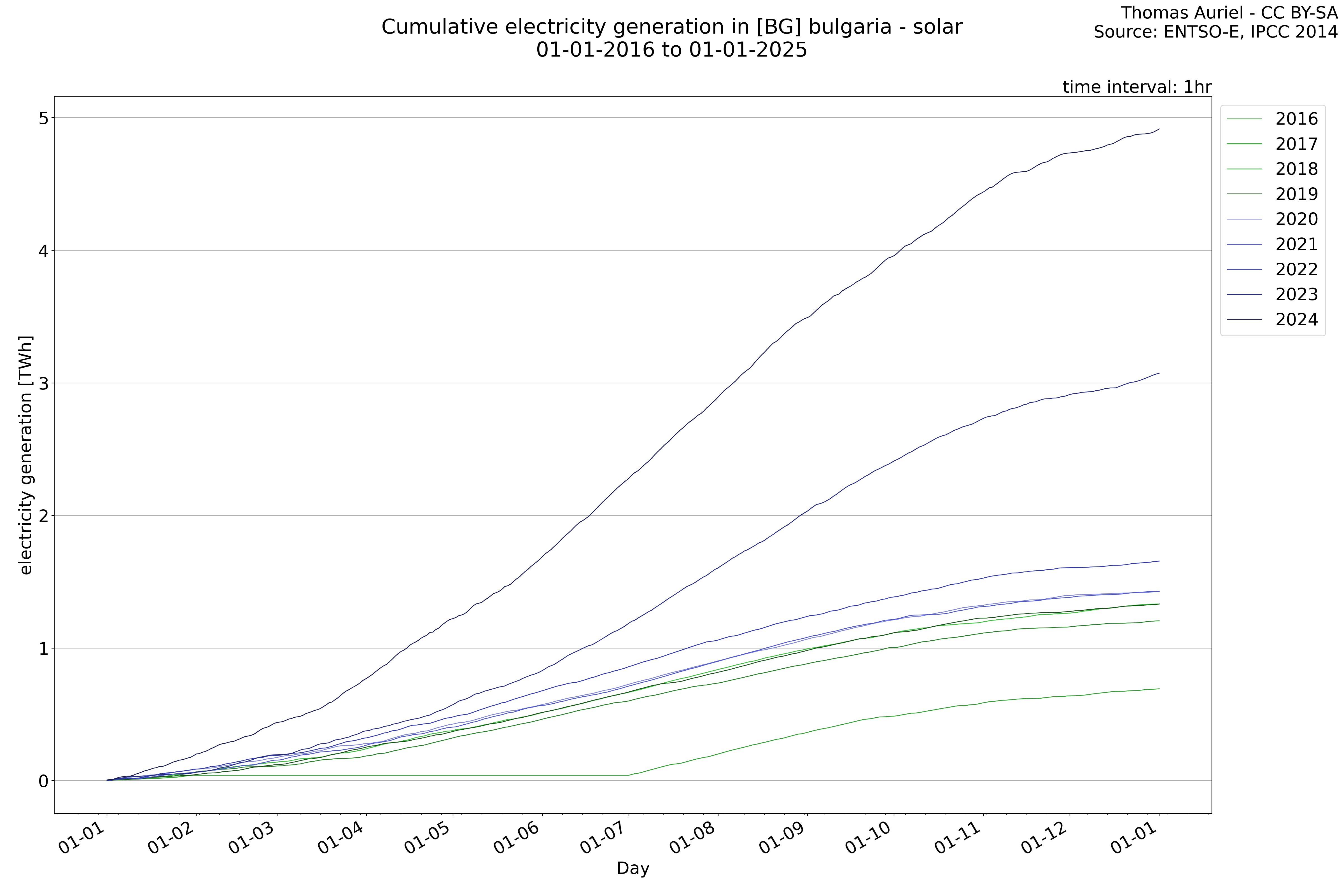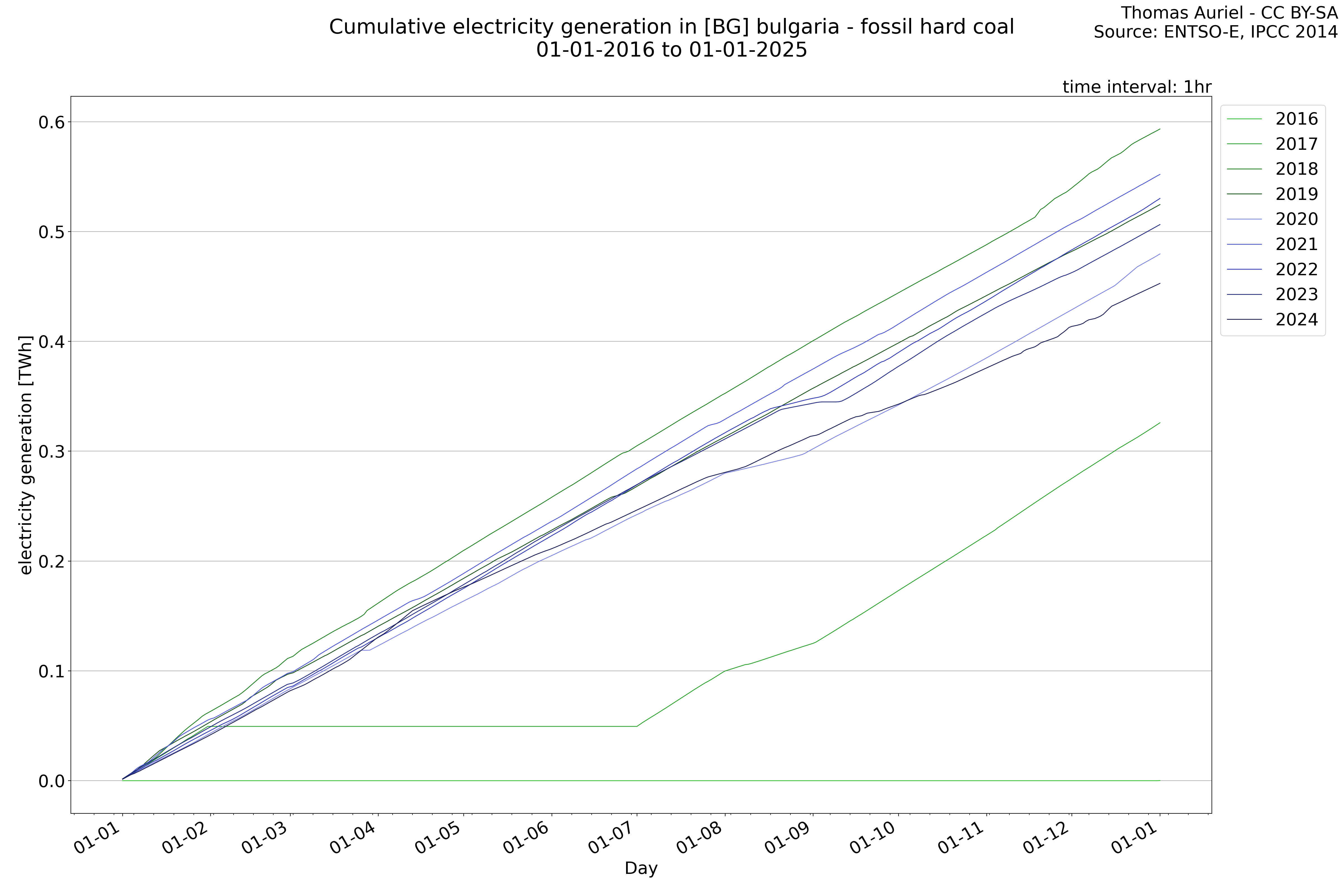 This plot is a cumulative sum plot, where each line represents the cumulative value of a specific metric (e.g., production, load, import, or export) for a given year. The plot begins at zero, and as the year progresses, the cumulative value is updated to reflect the total amount accumulated over time. This visualization illustrates the overall trend of the metric, showing whether the cumulative sum is increasing or decreasing, as well as any changes in the trend within the year. Additionally, the cumulative sum plot helps to reduce the impact of noise and short-term fluctuations commonly present in the raw data of production, load, import, or export. By smoothing out these variations, the plot emphasizes the broader, long-term trends. Consequently, this type of visualization facilitates a clearer understanding of the metric’s evolution across the year, revealing whether the activity follows a steady trajectory, shows signs of volatility, or experiences periods of significant change.