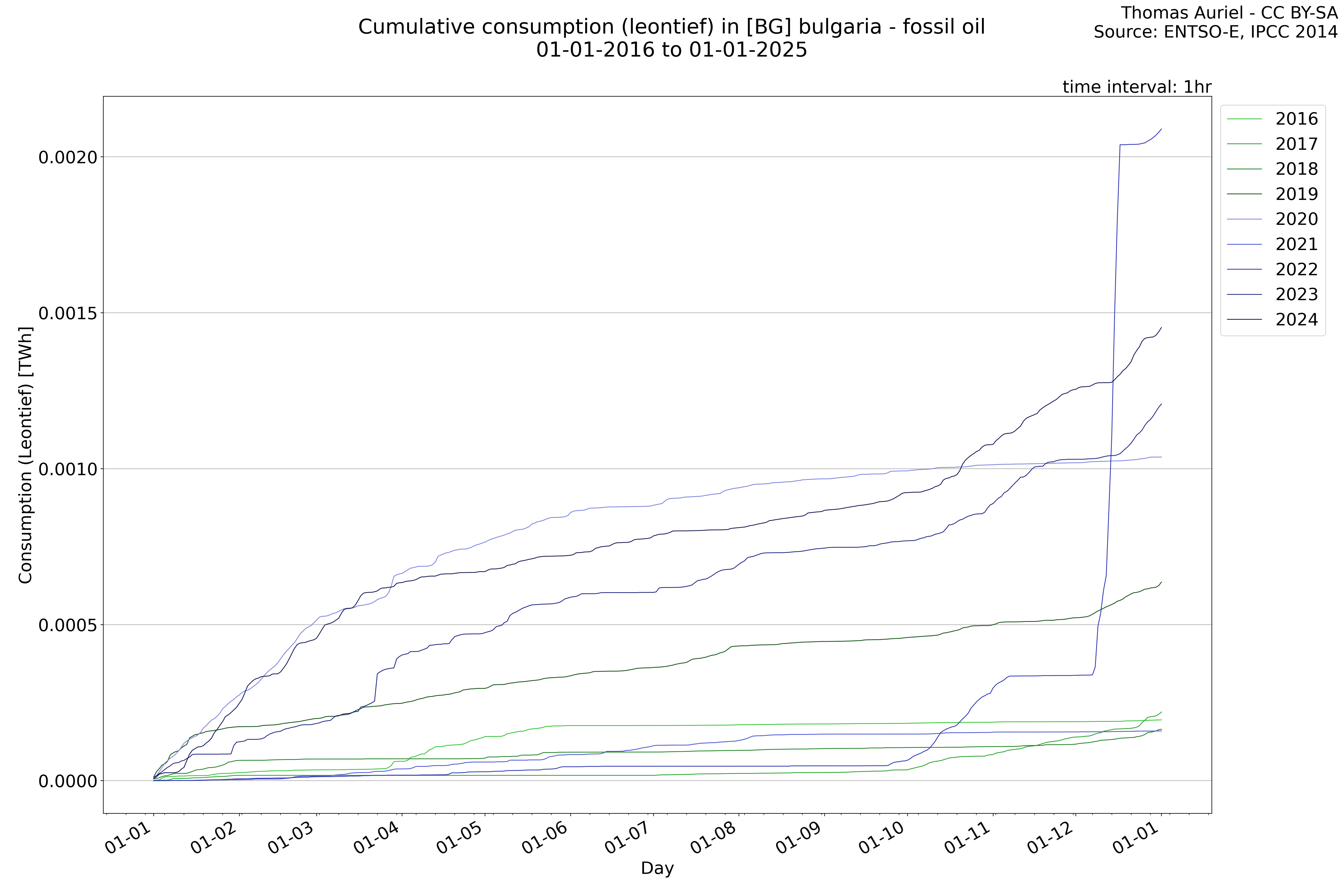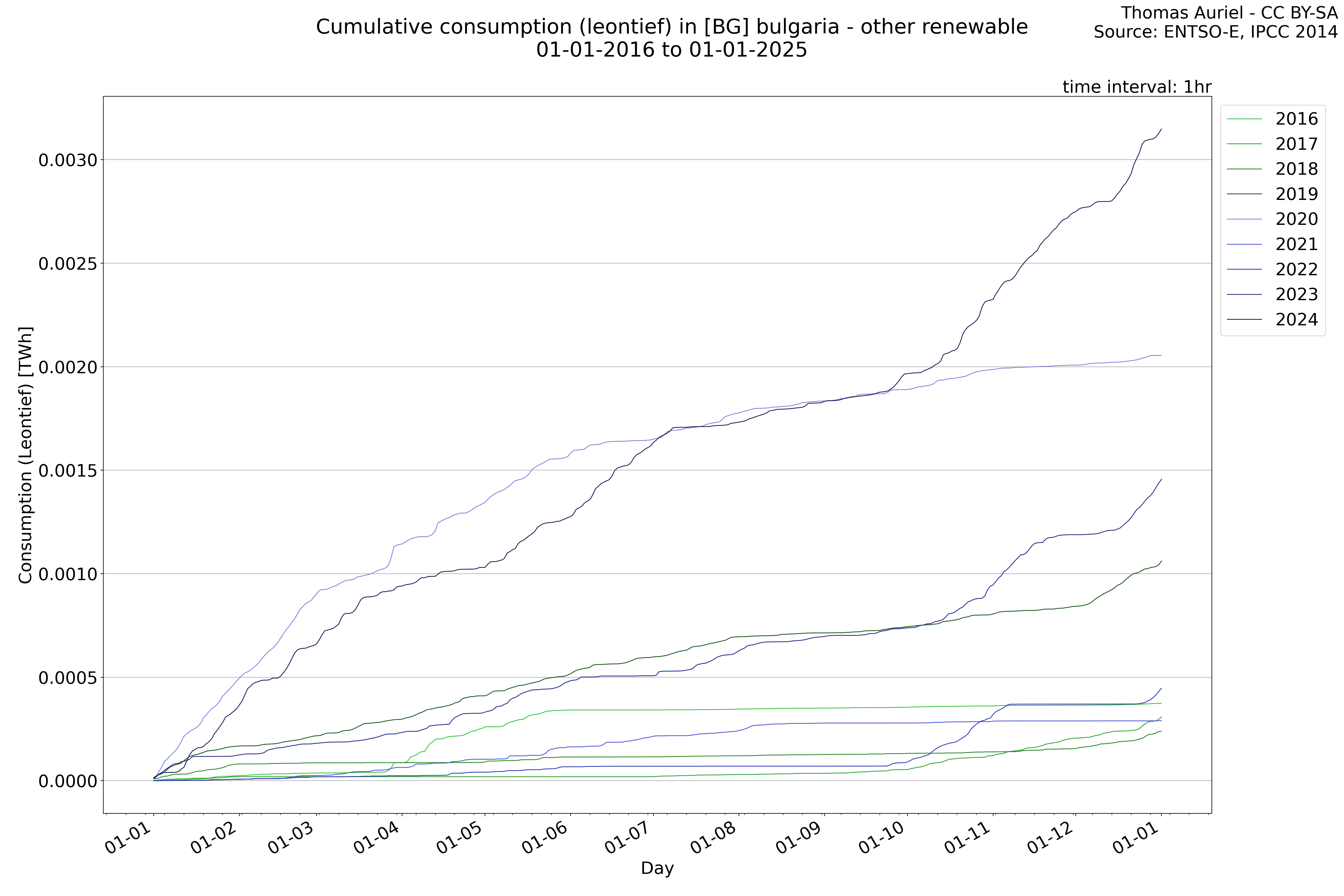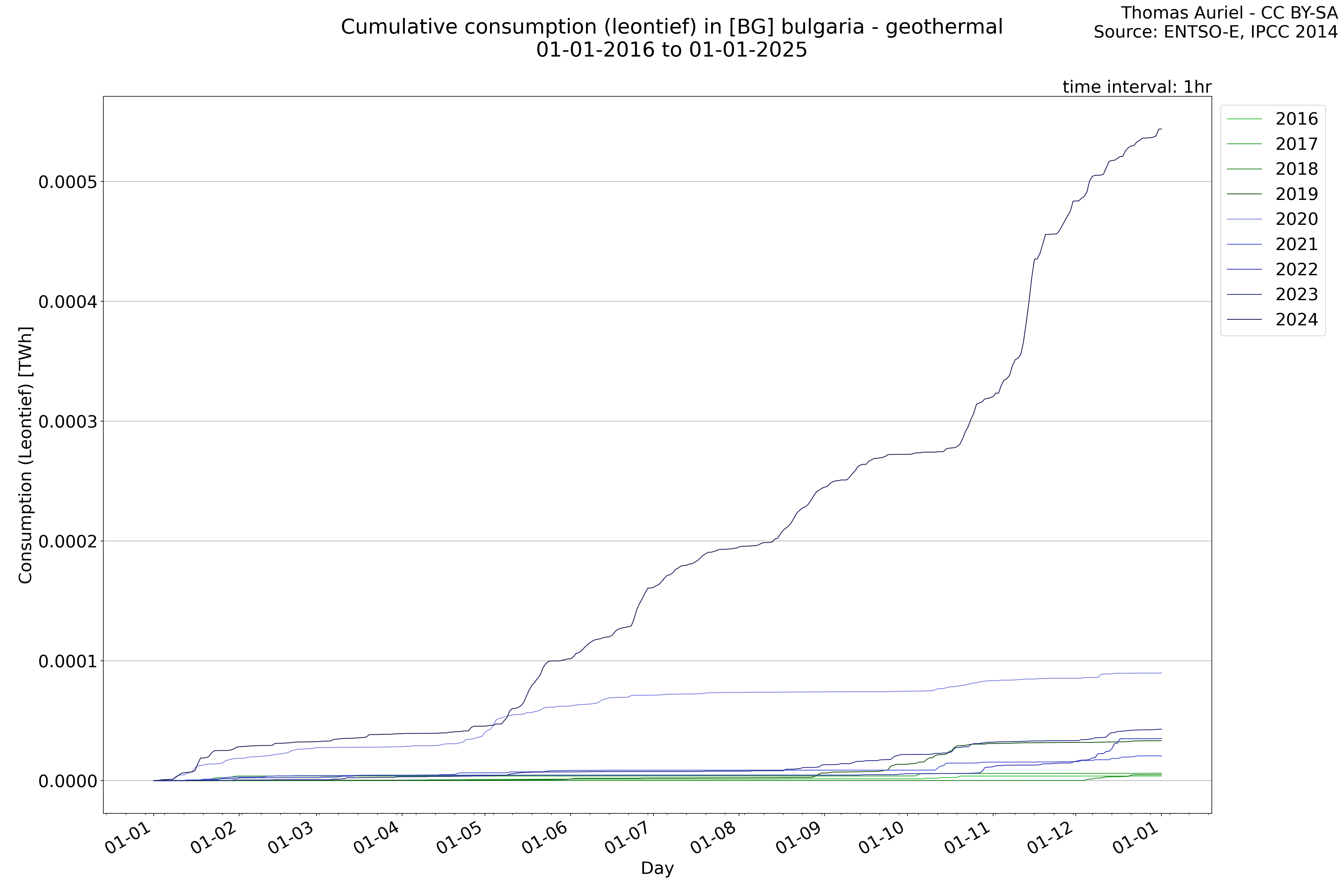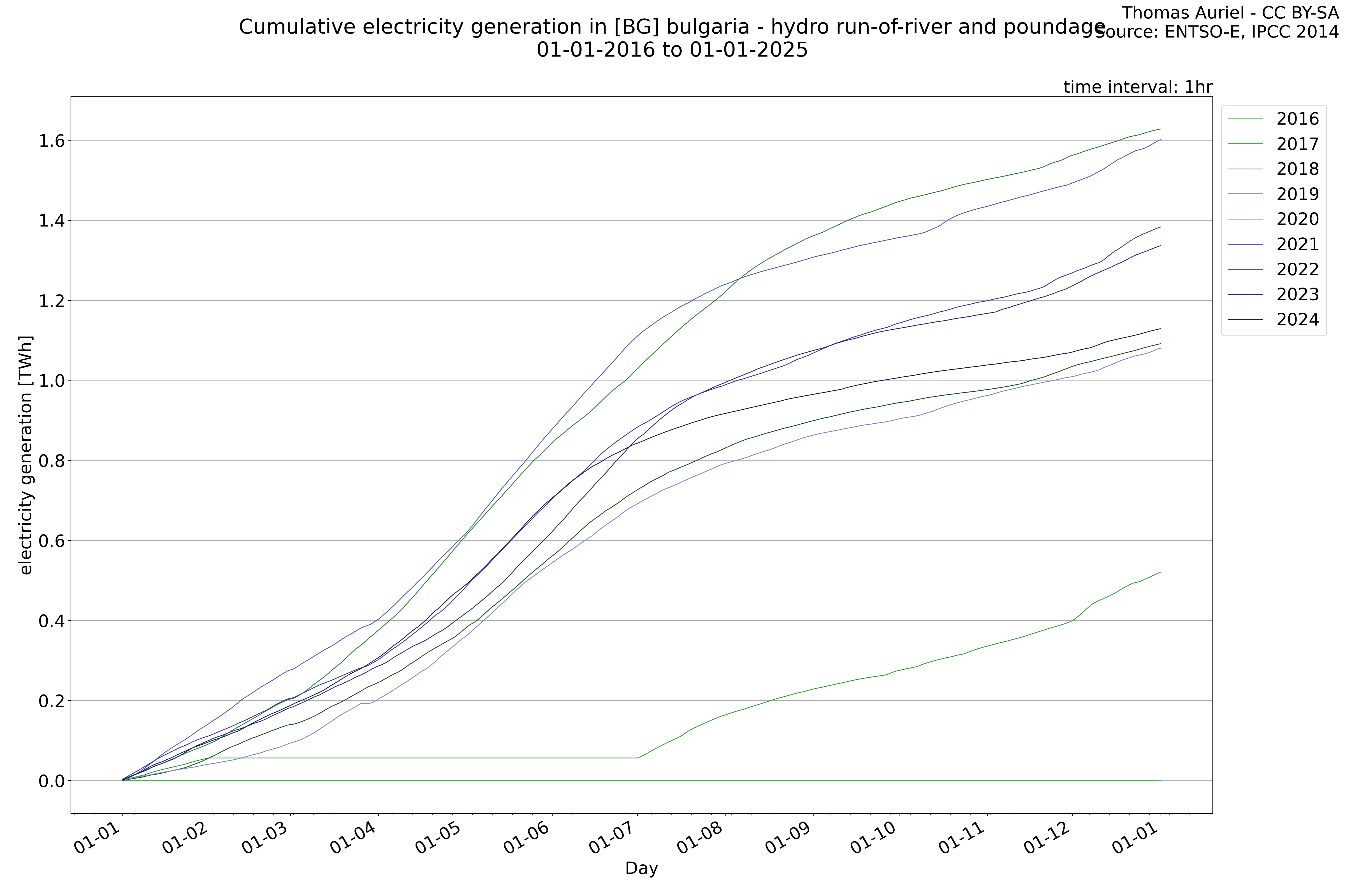 This plot is a cumulative sum plot, where each line represents the cumulative value of a specific metric (e.g., production, load, import, or export) for a given year. The plot begins at zero, and as the year progresses, the cumulative value is updated to reflect the total amount accumulated over time. This visualization illustrates the overall trend of the metric, showing whether the cumulative sum is increasing or decreasing, as well as any changes in the trend within the year. Additionally, the cumulative sum plot helps to reduce the impact of noise and short-term fluctuations commonly present in the raw data of production, load, import, or export. By smoothing out these variations, the plot emphasizes the broader, long-term trends. Consequently, this type of visualization facilitates a clearer understanding of the metric’s evolution across the year, revealing whether the activity follows a steady trajectory, shows signs of volatility, or experiences periods of significant change.
