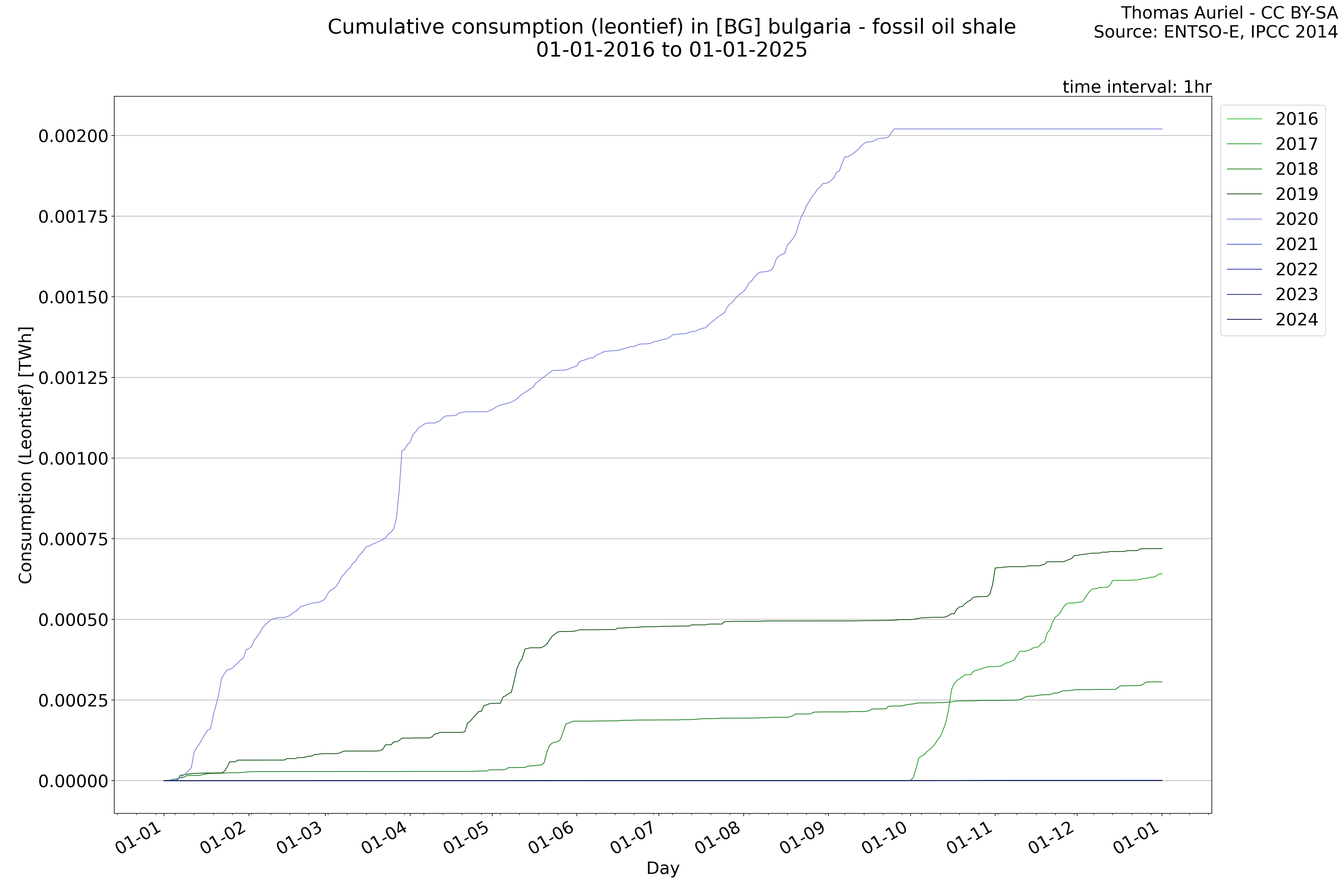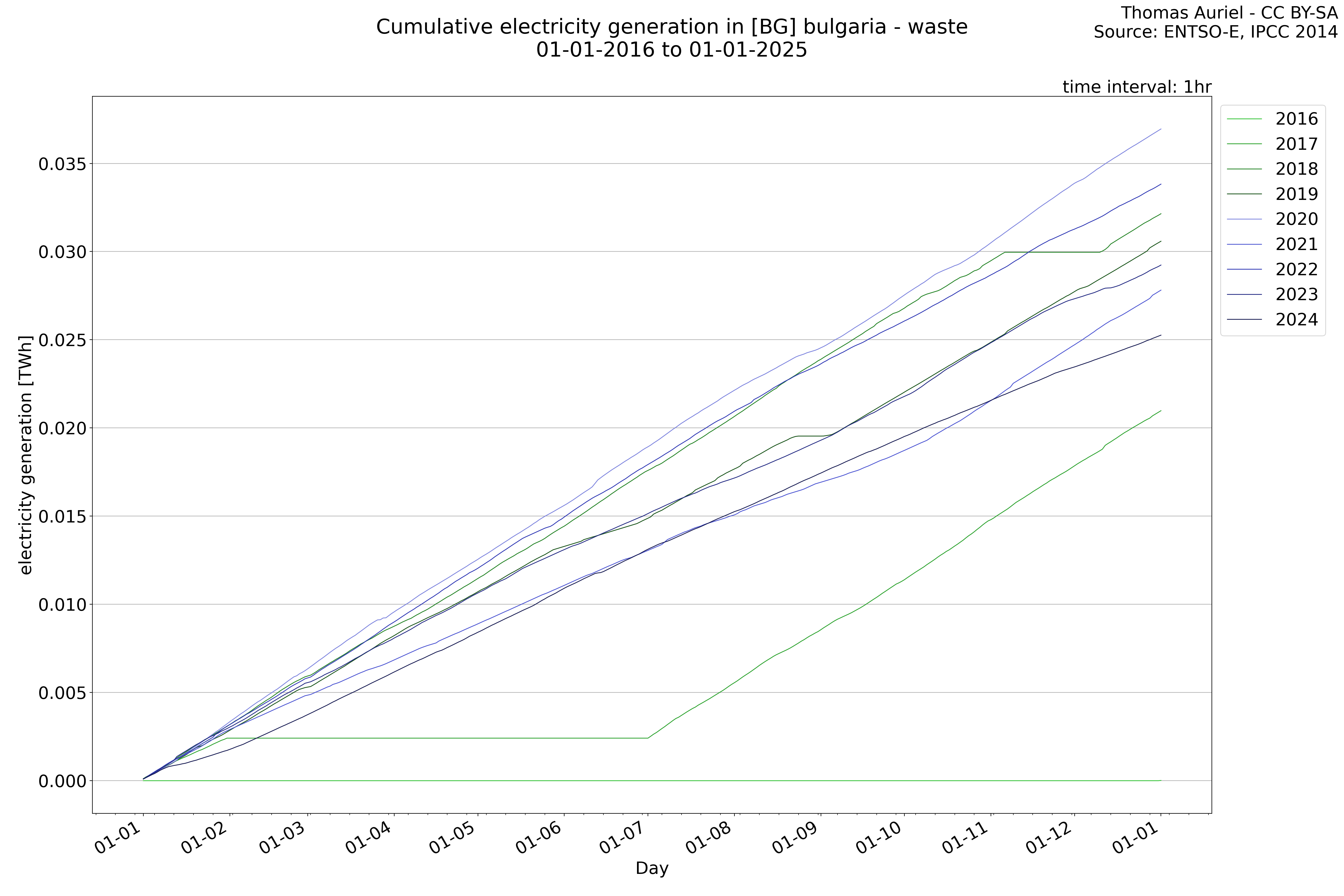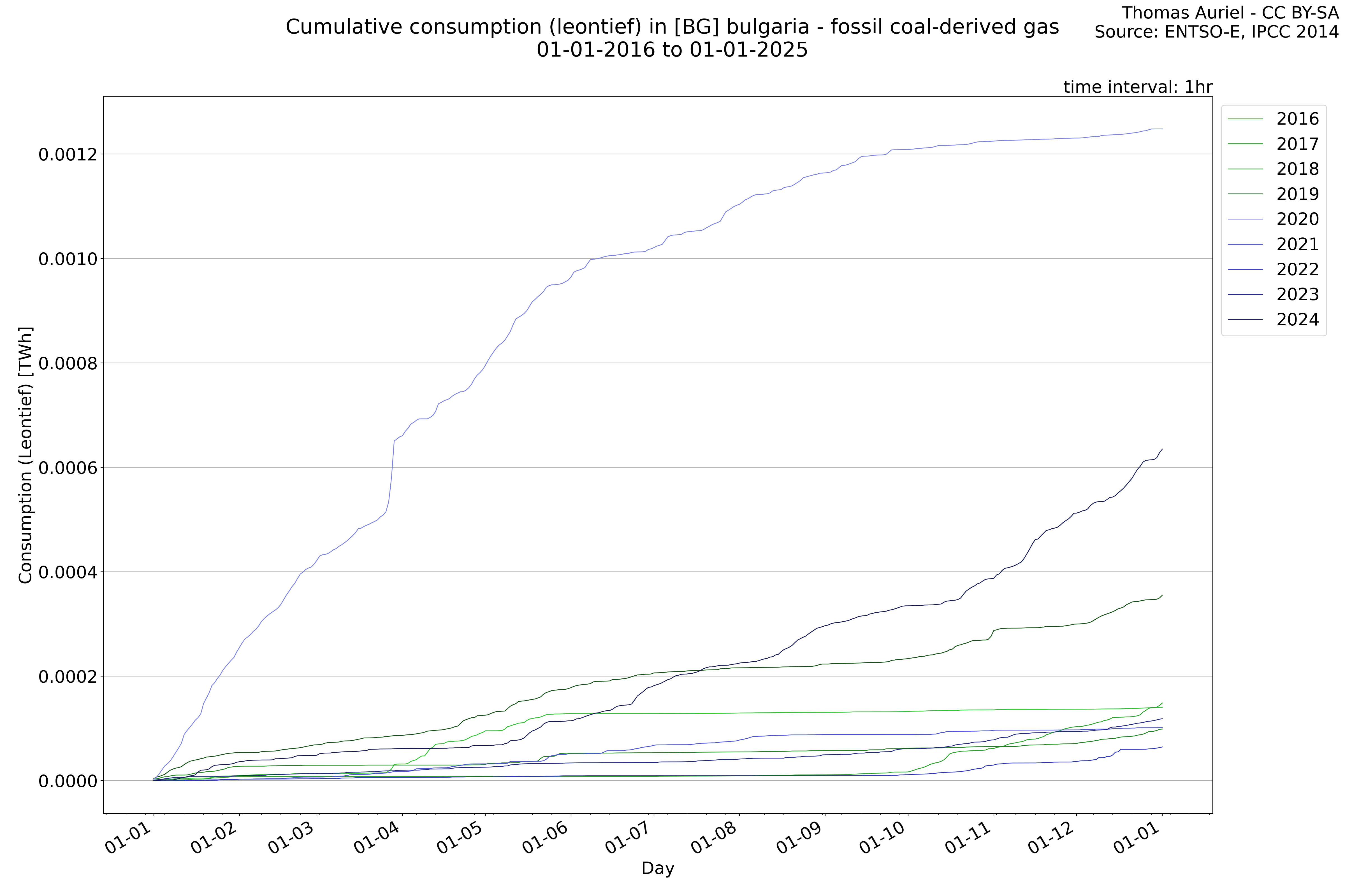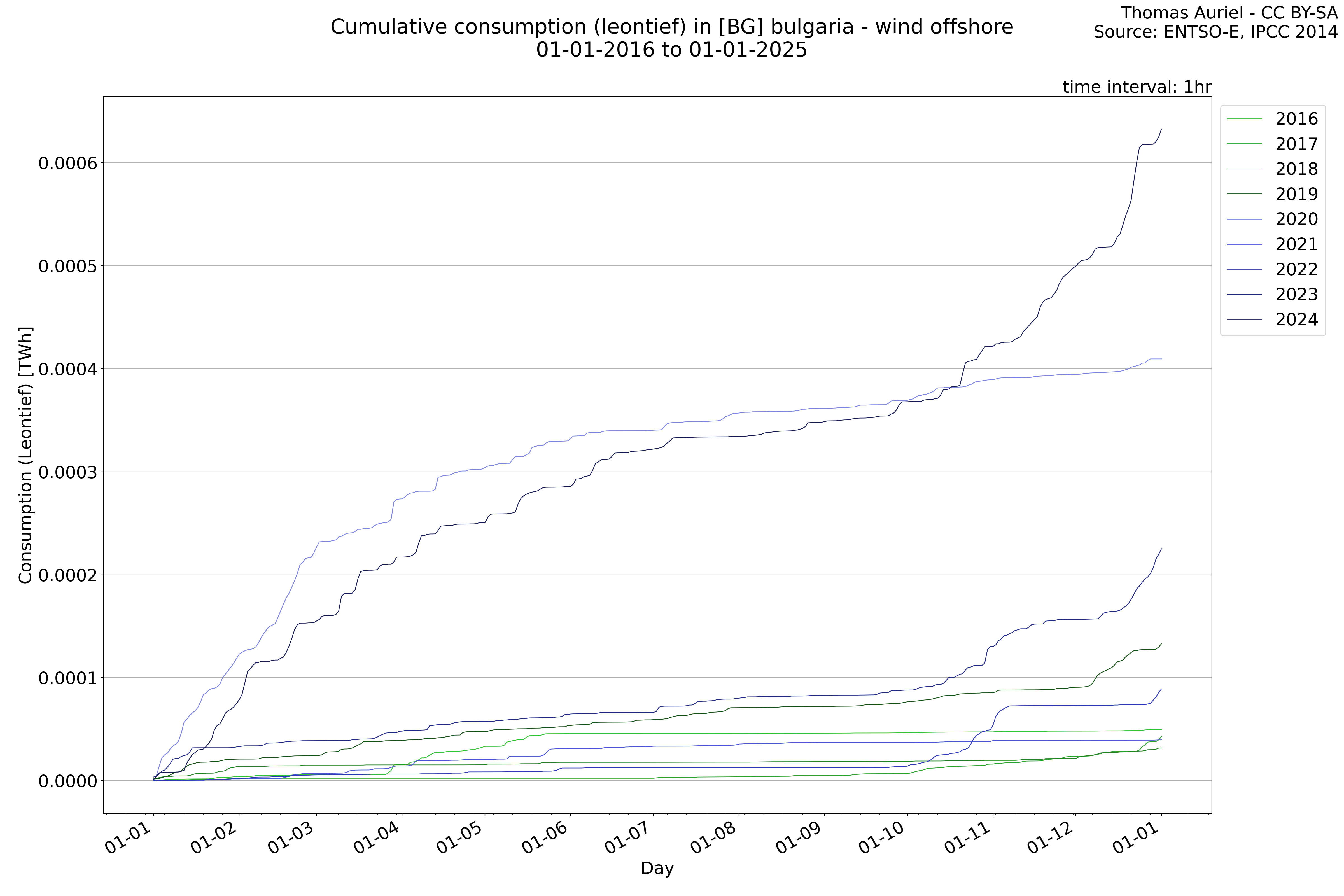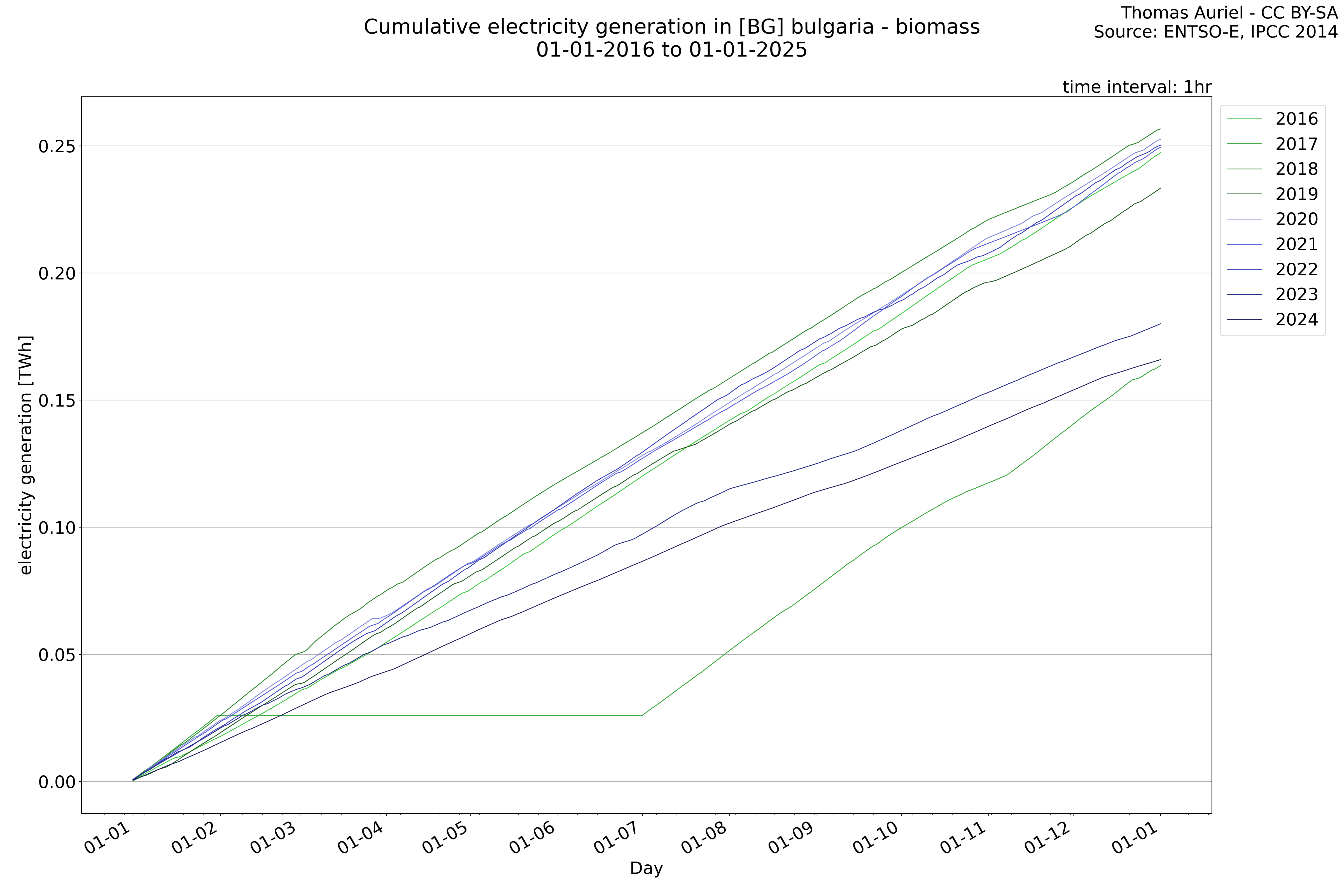 This plot is a cumulative sum plot, where each line represents the cumulative value of a specific metric (e.g., production, load, import, or export) for a given year. The plot begins at zero, and as the year progresses, the cumulative value is updated to reflect the total amount accumulated over time. This visualization illustrates the overall trend of the metric, showing whether the cumulative sum is increasing or decreasing, as well as any changes in the trend within the year. Additionally, the cumulative sum plot helps to reduce the impact of noise and short-term fluctuations commonly present in the raw data of production, load, import, or export. By smoothing out these variations, the plot emphasizes the broader, long-term trends. Consequently, this type of visualization facilitates a clearer understanding of the metric’s evolution across the year, revealing whether the activity follows a steady trajectory, shows signs of volatility, or experiences periods of significant change.