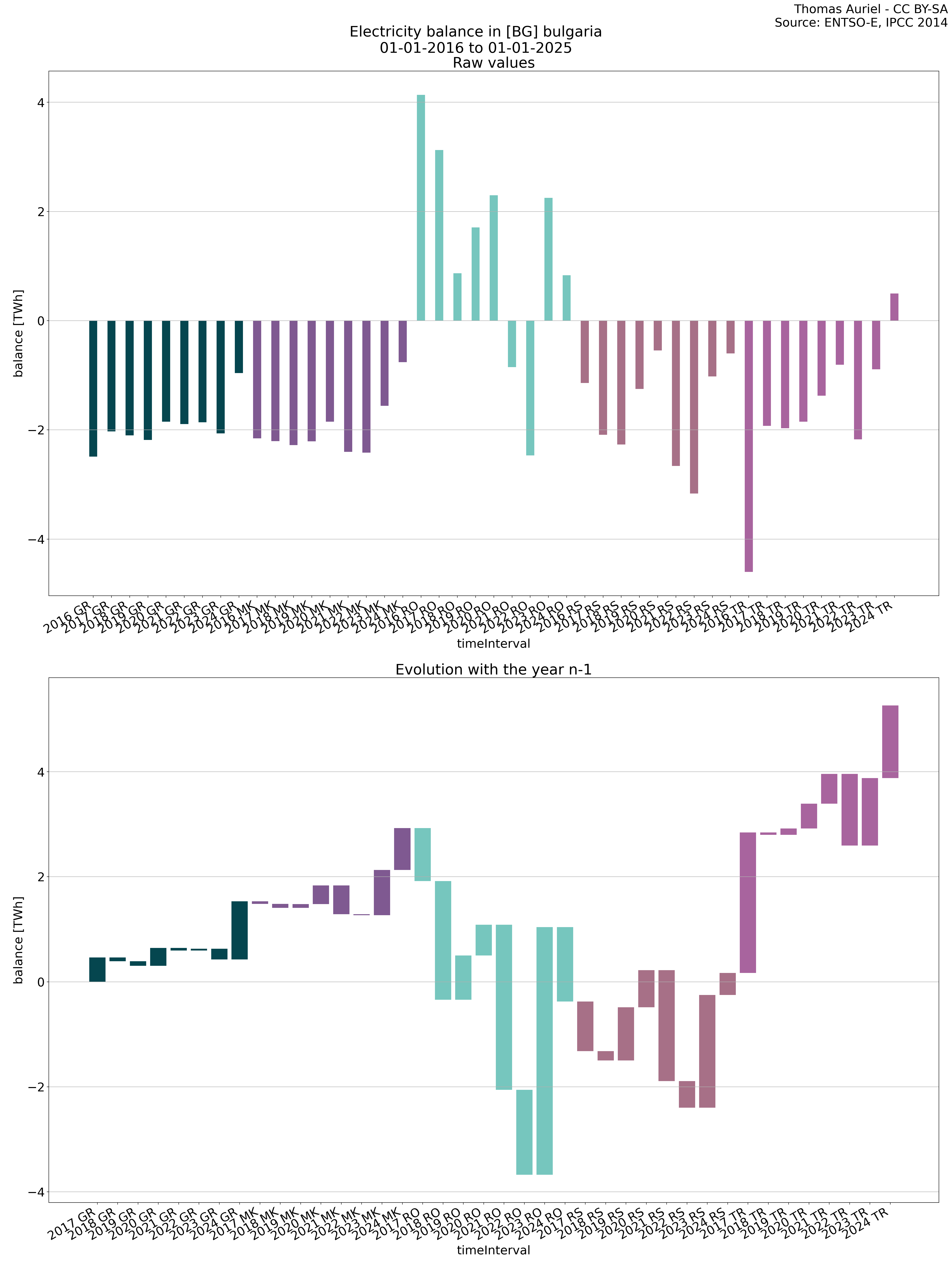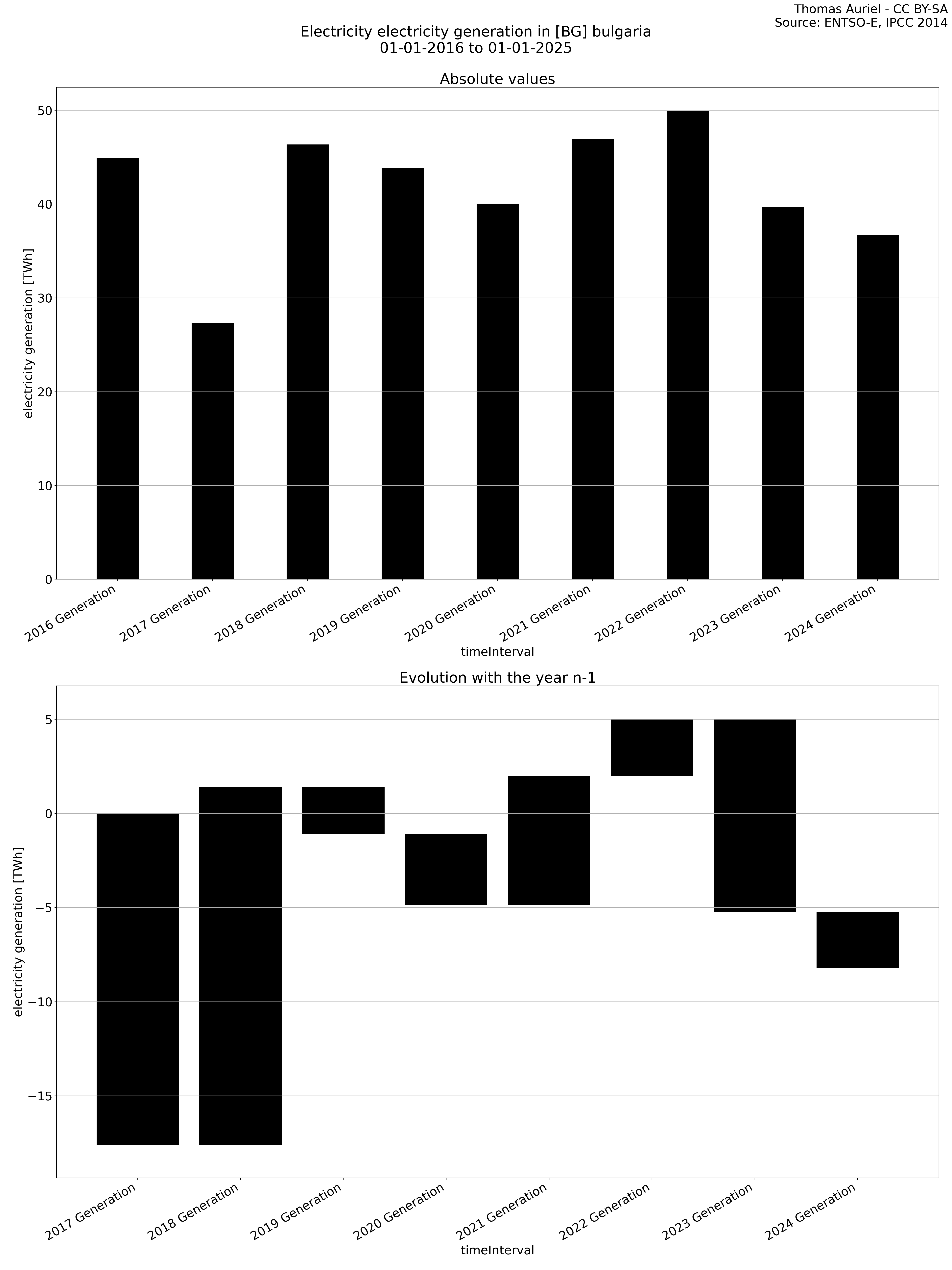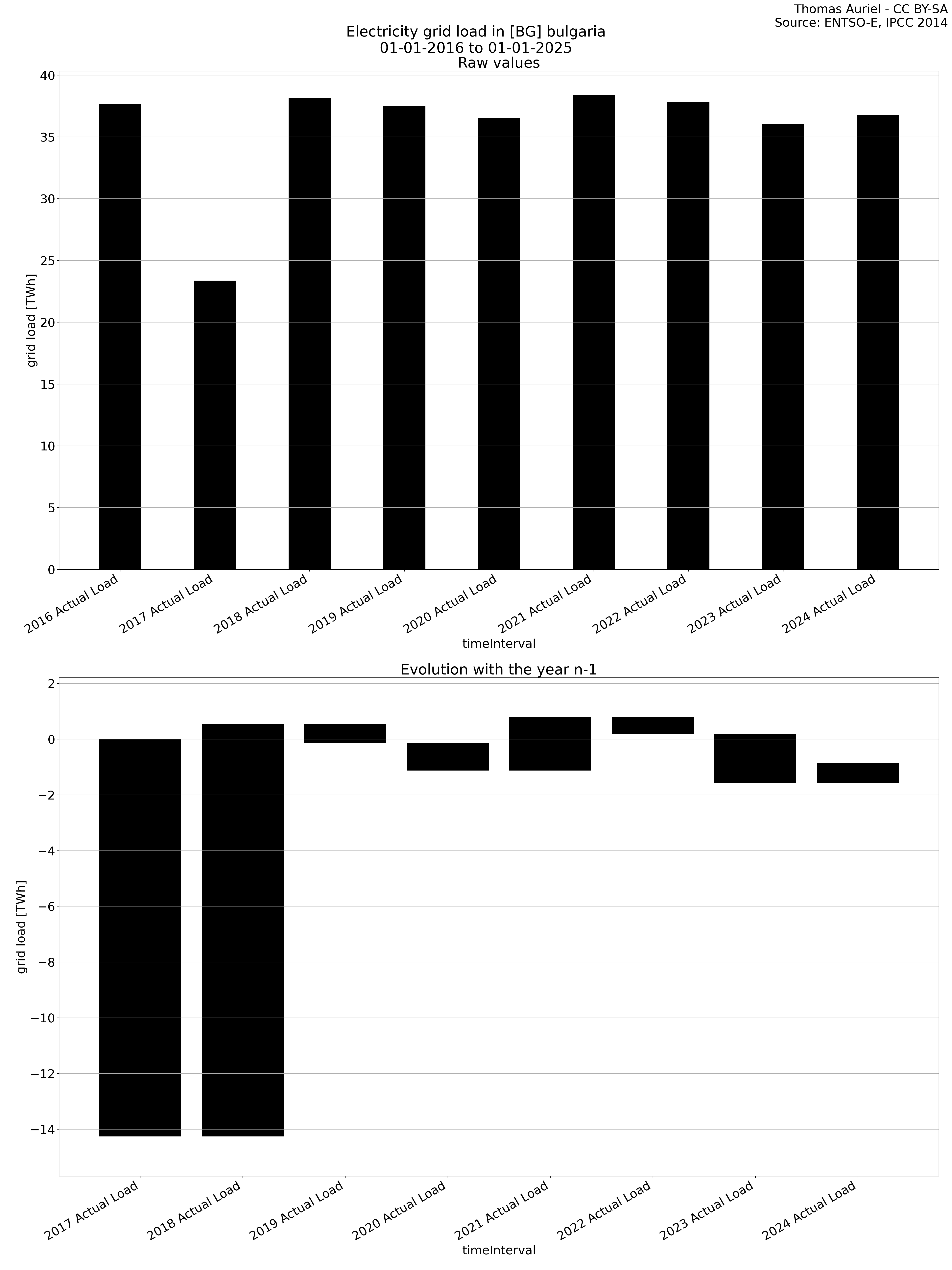 The second section features a waterfall graph, which visually represents the year-over-year changes in electricity metrics. In this graph, the length of each bar corresponds to the difference in the metric (e.g., production, load, etc.) compared to the previous year. Unlike the bar plot, the bars in the waterfall graph do not start at zero; instead, each bar begins where the previous one ended. Hence, this structure emphasizes the incremental changes in the metric over time, facilitating the visualization of fluctuations from one year to the next.