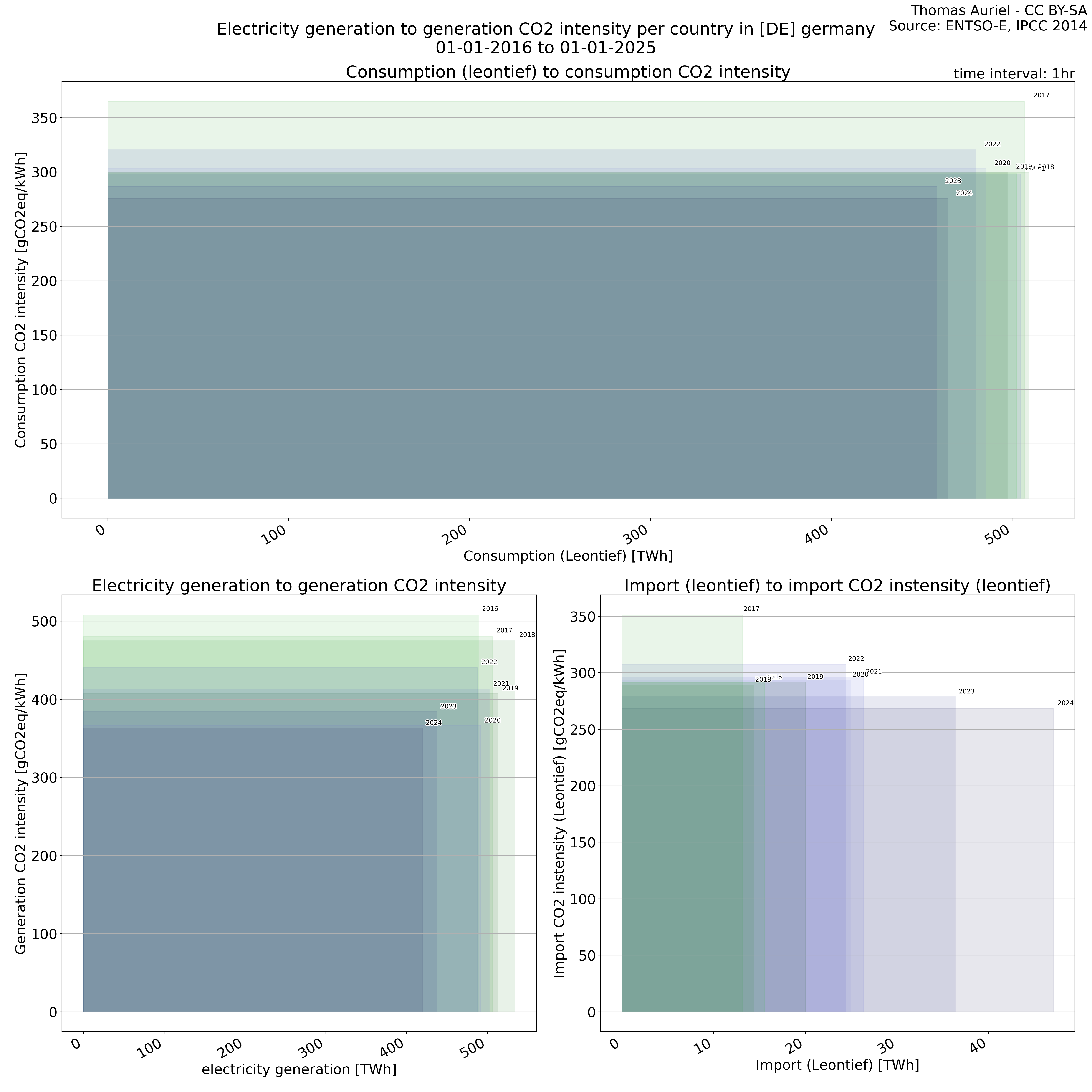 The plot consists of squares, each representing a single year, designed to illustrate electricity-related metrics and their associated environmental impacts. The length of each square corresponds to the total electricity consumption, generation, or imports during the year, with longer squares indicating higher overall values for the respective metric. The height of each square represents the average CO₂ intensity (e.g., grams of CO₂ per kWh) associated with electricity consumption, generation, or imports; hence, taller squares signify greater environmental impact per unit of electricity. Finally, the surface area of each square, determined by the product of its length and height, represents the total CO₂ emissions associated with the respective activity in the given year.