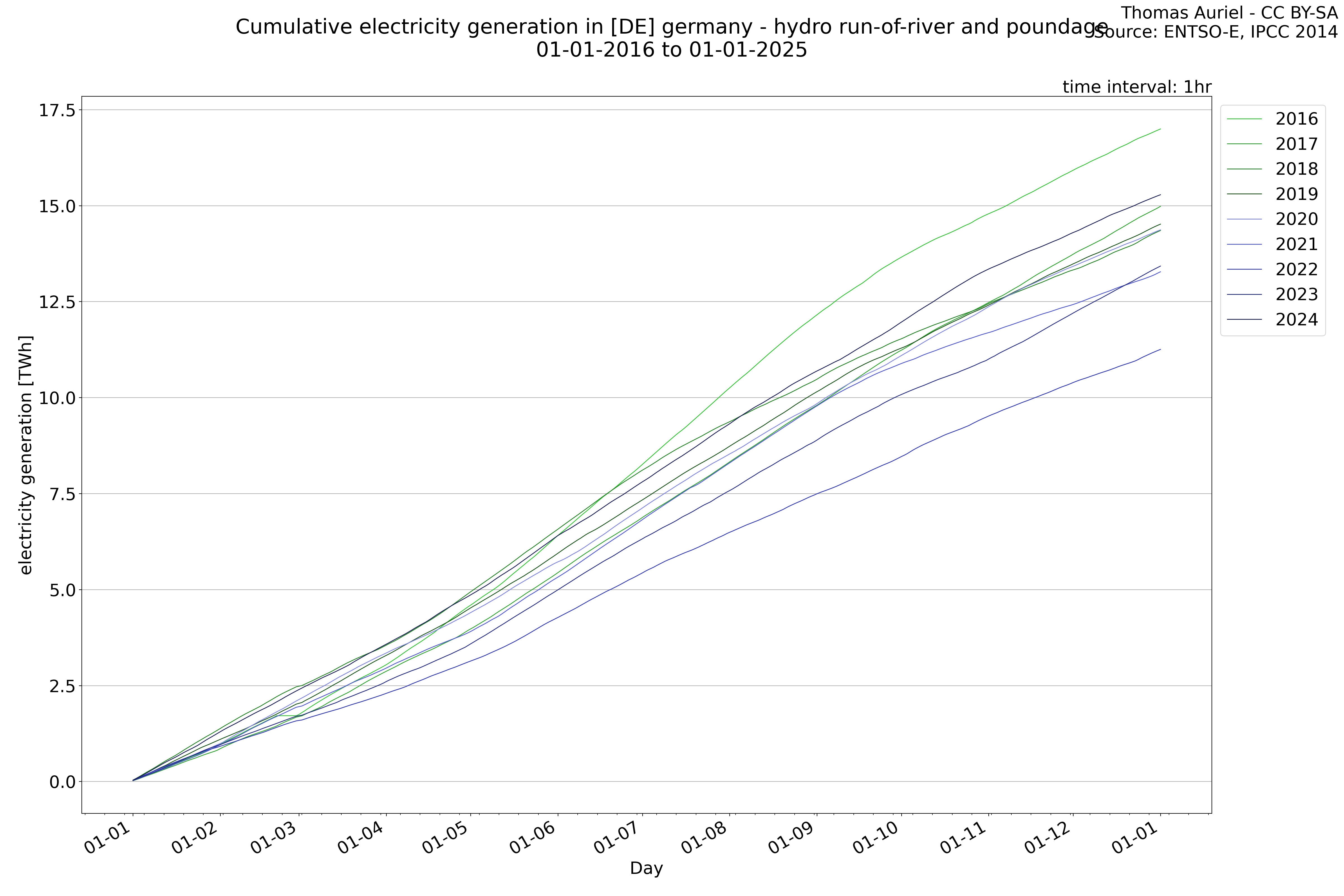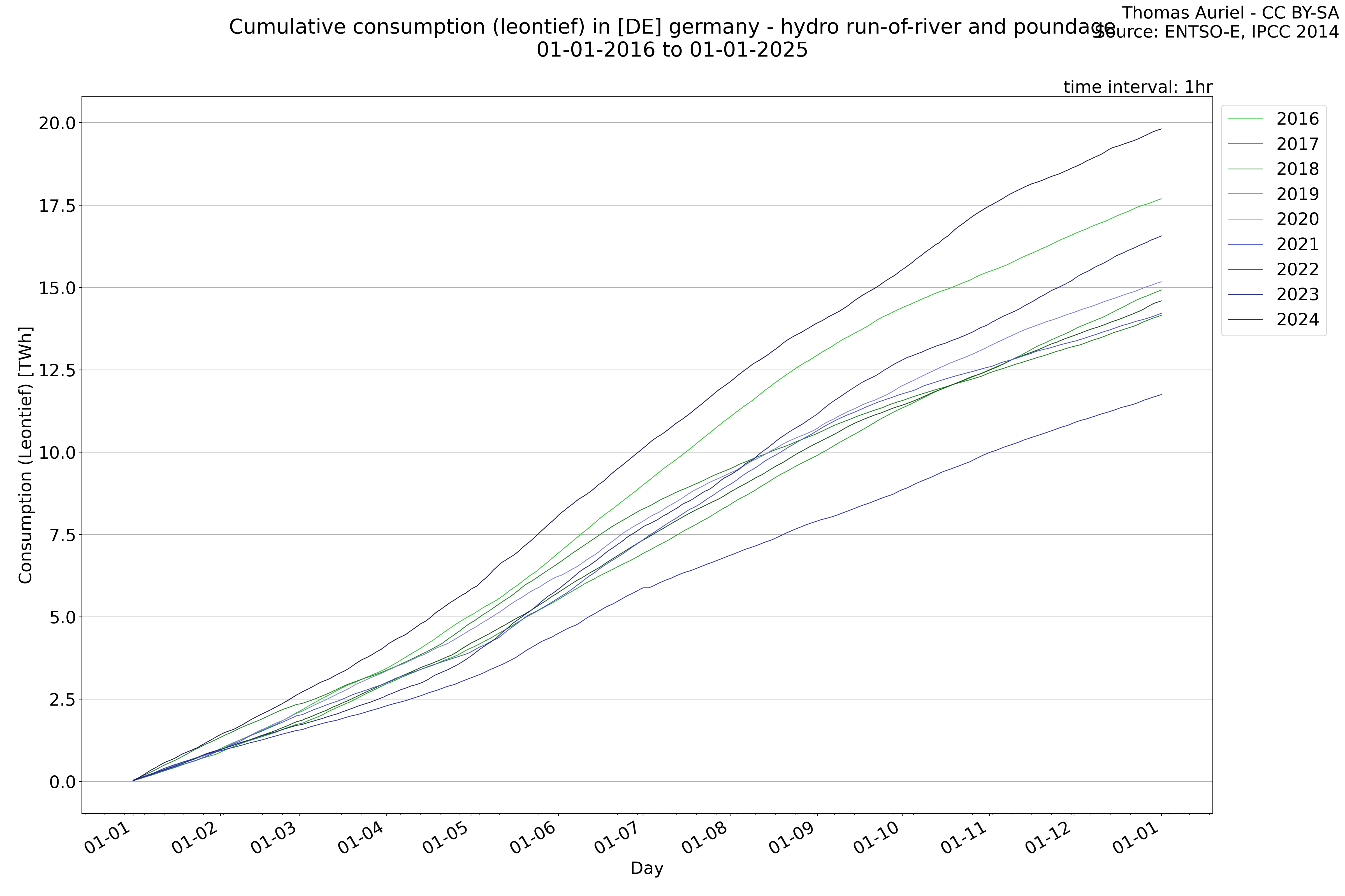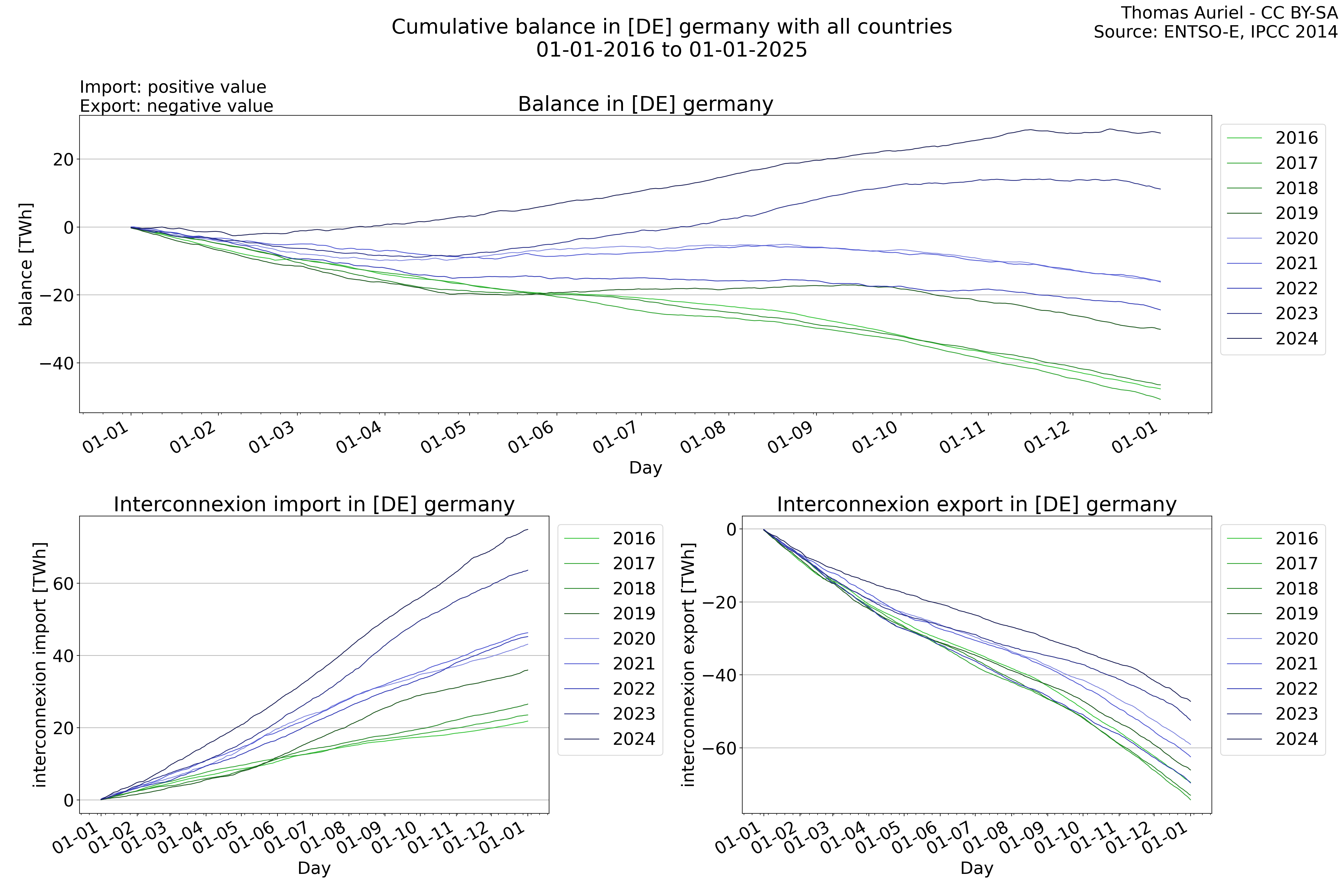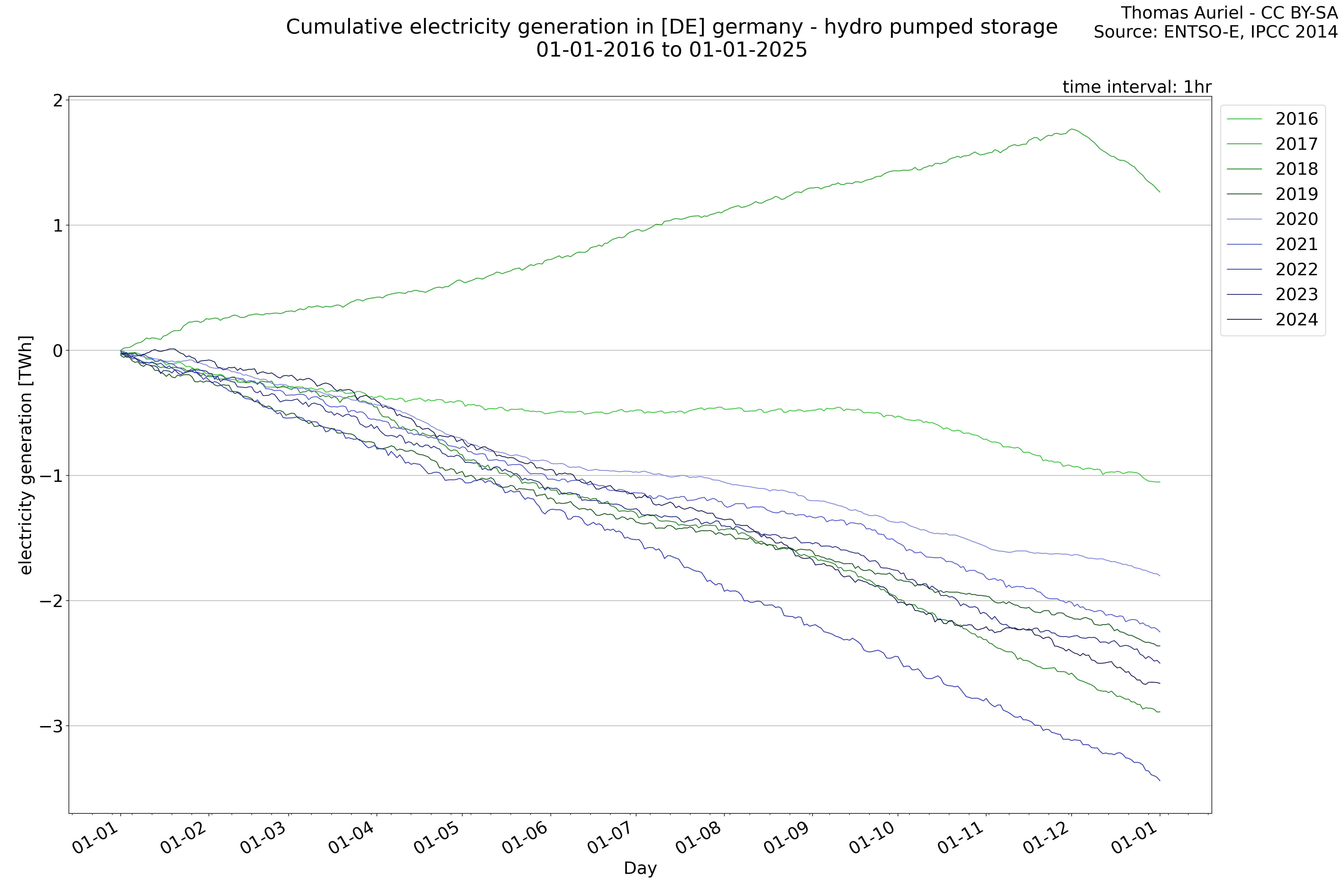 This plot is a cumulative sum plot, where each line represents the cumulative value of a specific metric (e.g., production, load, import, or export) for a given year. The plot begins at zero, and as the year progresses, the cumulative value is updated to reflect the total amount accumulated over time. This visualization illustrates the overall trend of the metric, showing whether the cumulative sum is increasing or decreasing, as well as any changes in the trend within the year. Additionally, the cumulative sum plot helps to reduce the impact of noise and short-term fluctuations commonly present in the raw data of production, load, import, or export. By smoothing out these variations, the plot emphasizes the broader, long-term trends. Consequently, this type of visualization facilitates a clearer understanding of the metric’s evolution across the year, revealing whether the activity follows a steady trajectory, shows signs of volatility, or experiences periods of significant change.