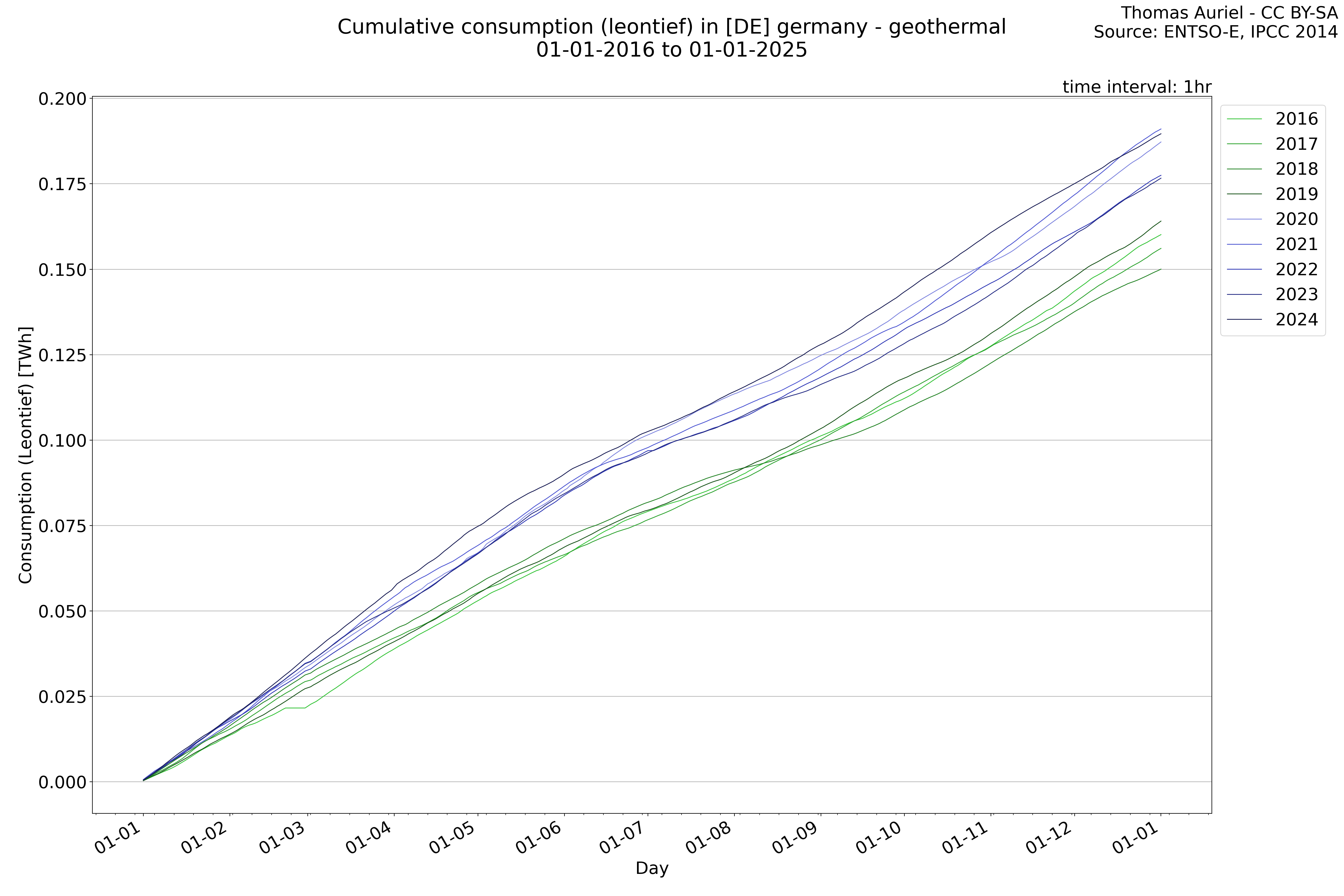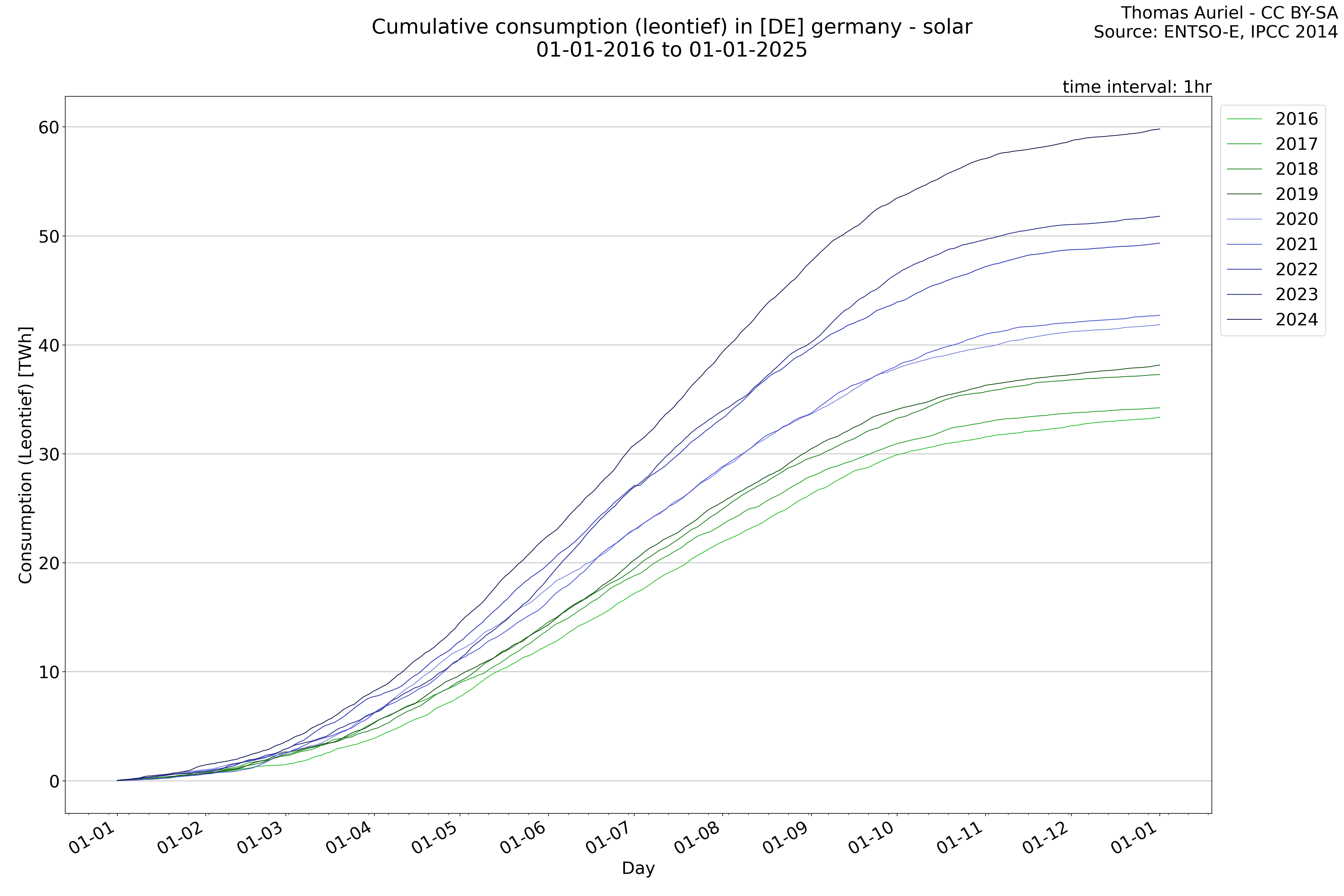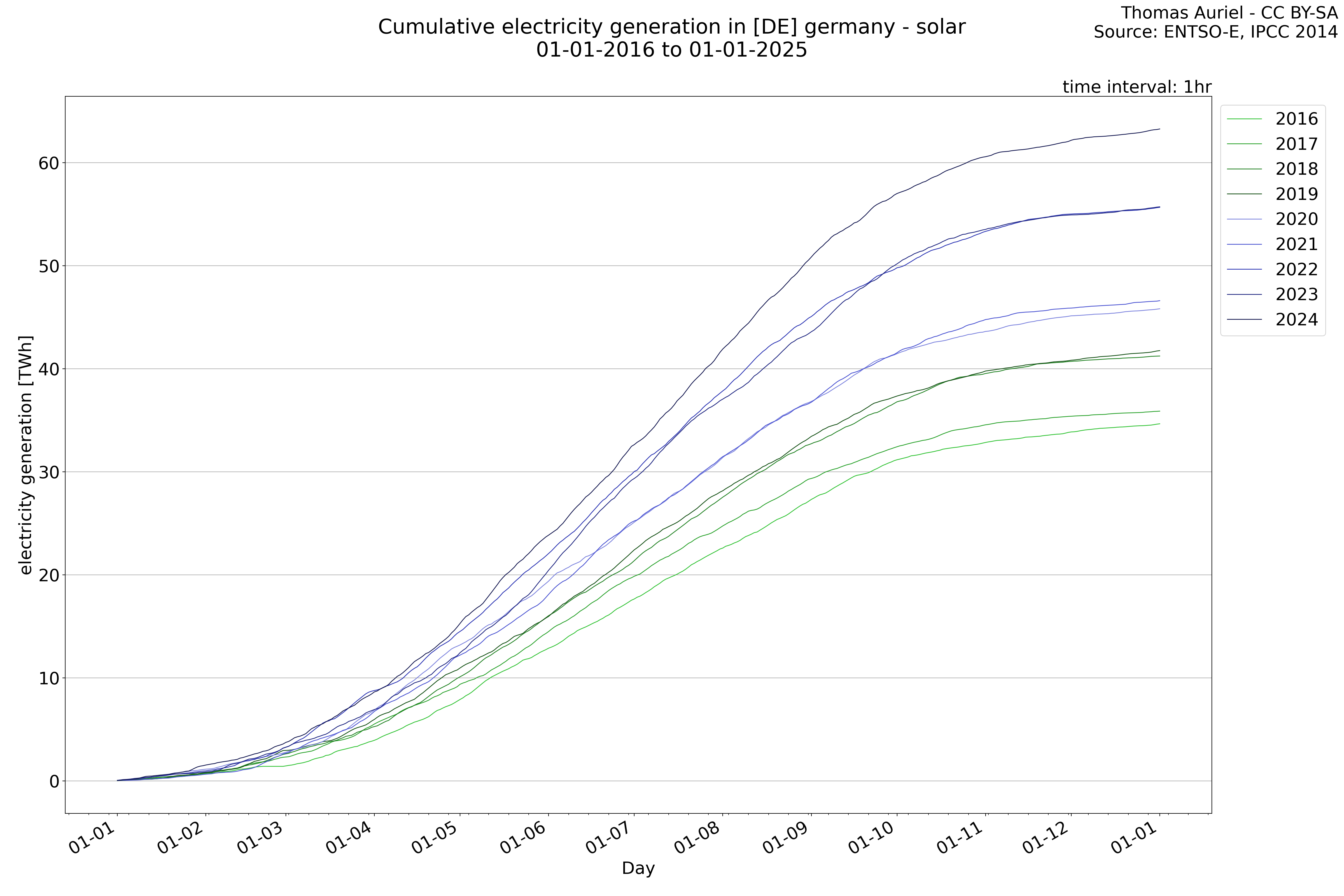 This plot is a cumulative sum plot, where each line represents the cumulative value of a specific metric (e.g., production, load, import, or export) for a given year. The plot begins at zero, and as the year progresses, the cumulative value is updated to reflect the total amount accumulated over time. This visualization illustrates the overall trend of the metric, showing whether the cumulative sum is increasing or decreasing, as well as any changes in the trend within the year. Additionally, the cumulative sum plot helps to reduce the impact of noise and short-term fluctuations commonly present in the raw data of production, load, import, or export. By smoothing out these variations, the plot emphasizes the broader, long-term trends. Consequently, this type of visualization facilitates a clearer understanding of the metric’s evolution across the year, revealing whether the activity follows a steady trajectory, shows signs of volatility, or experiences periods of significant change.