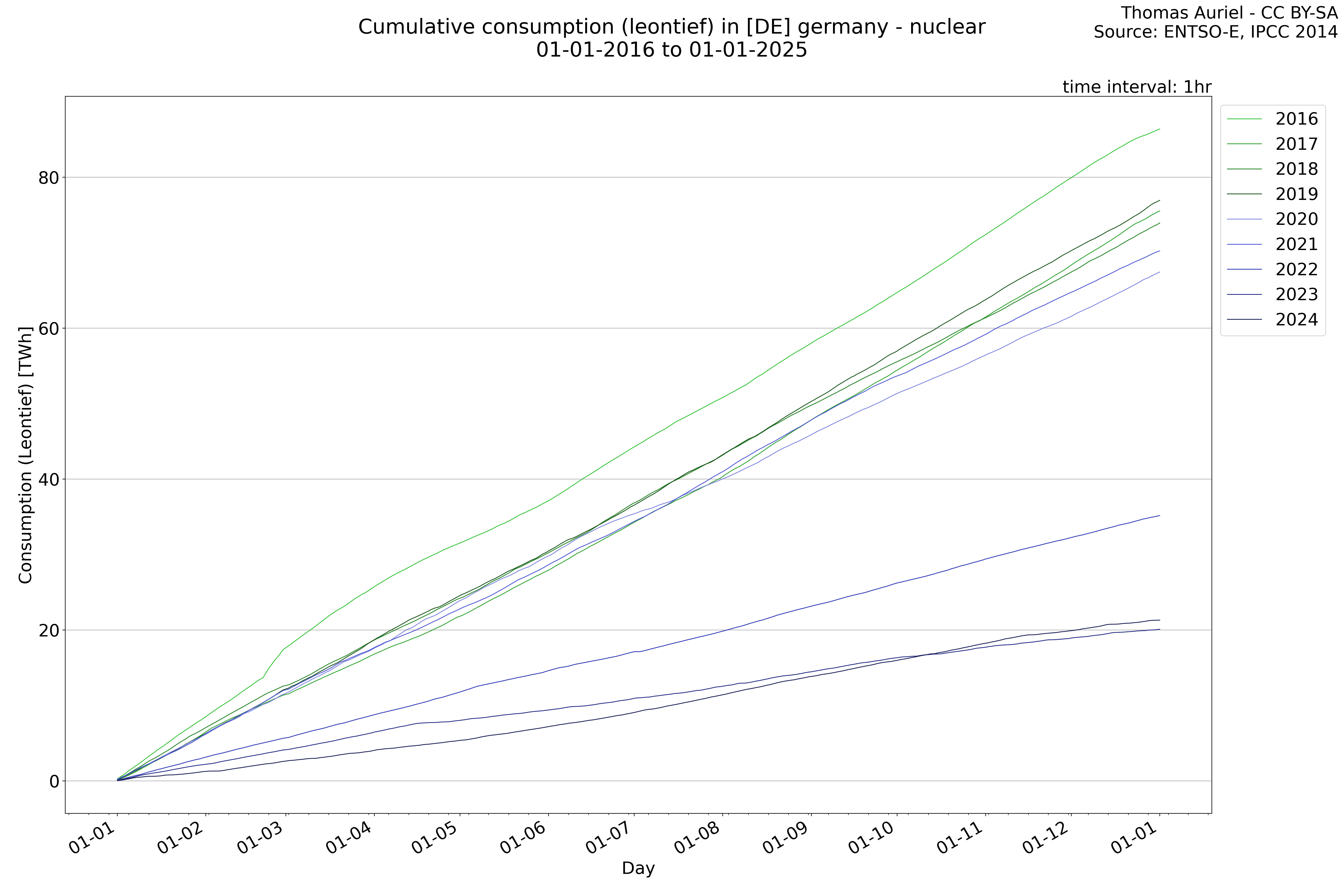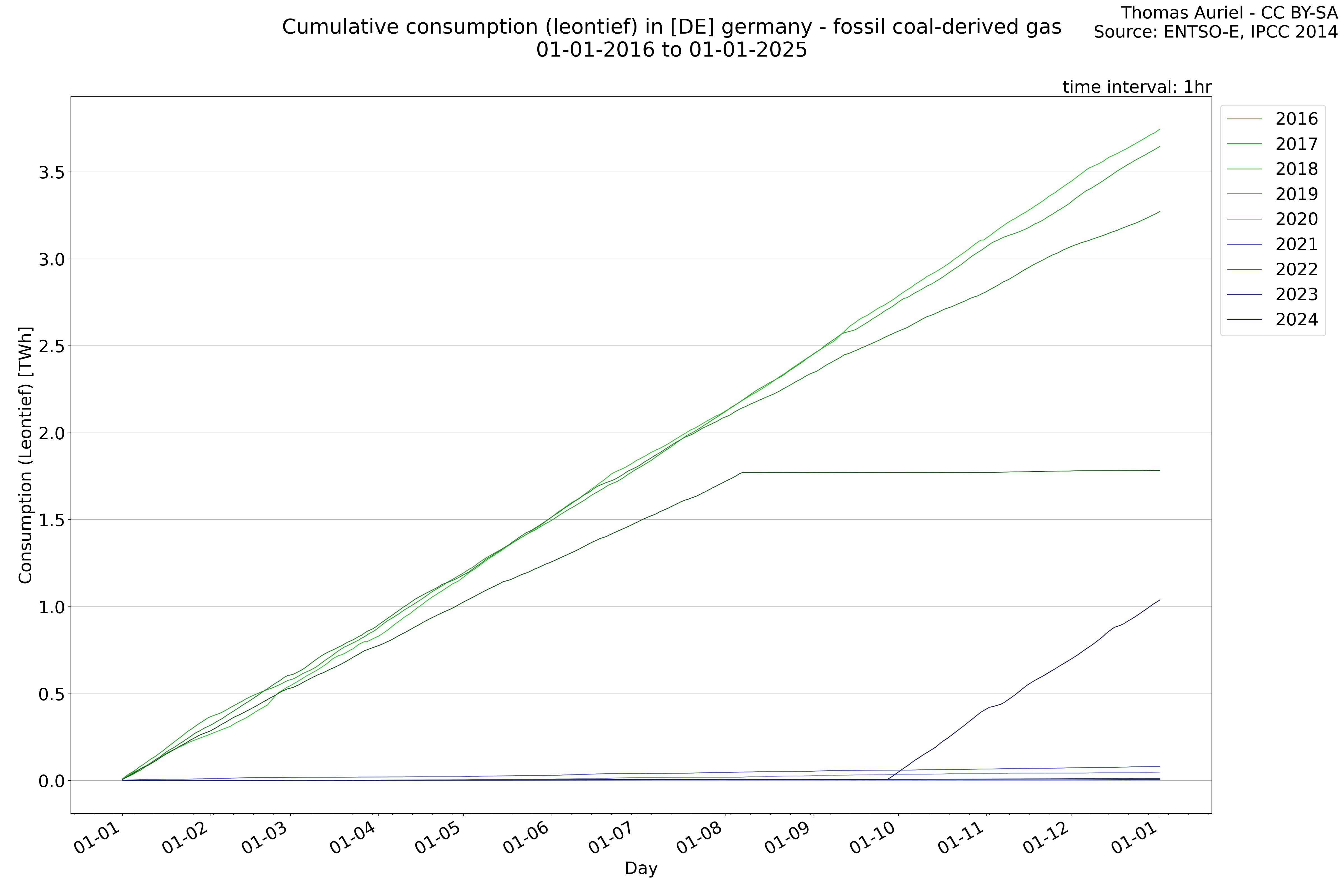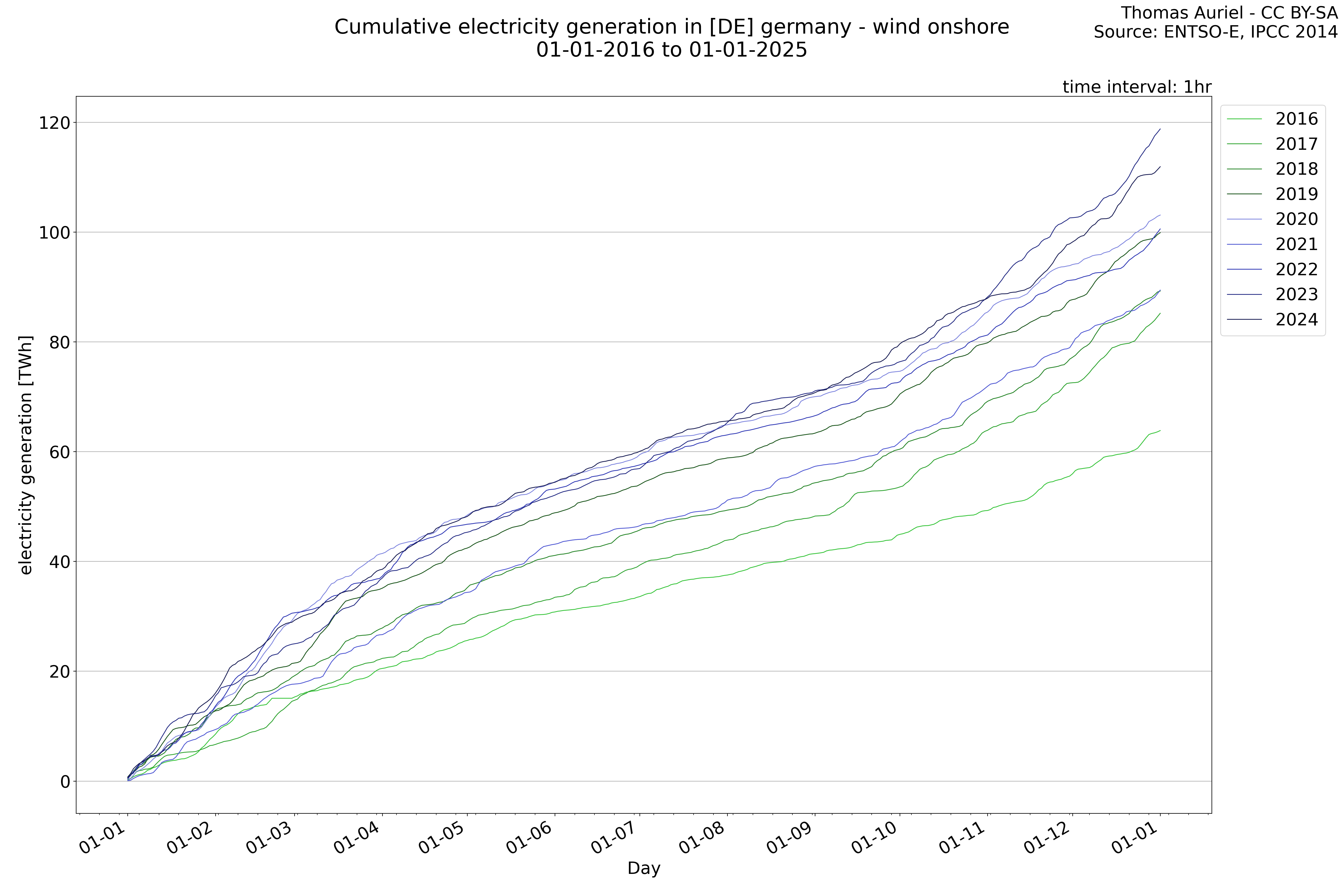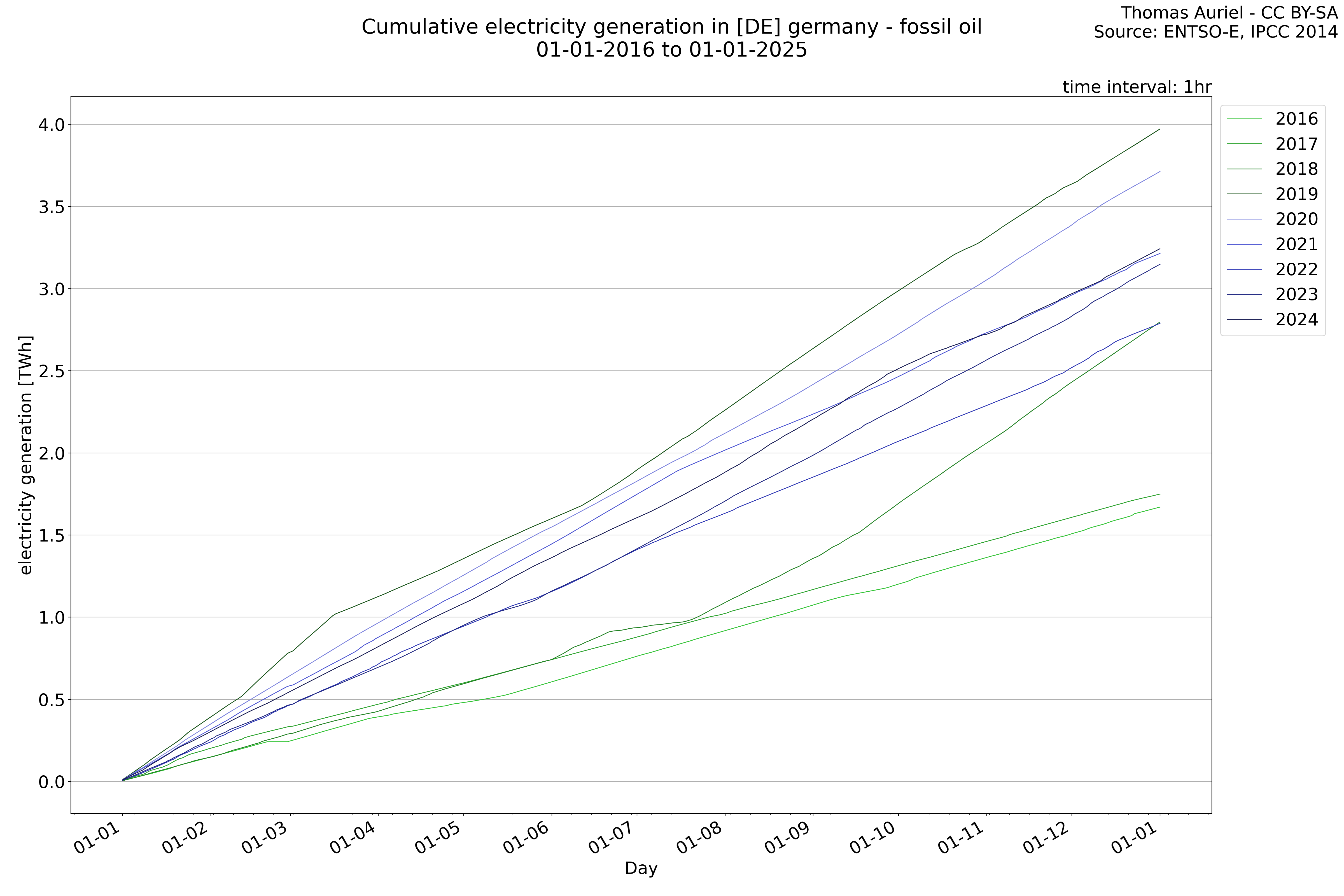 This plot is a cumulative sum plot, where each line represents the cumulative value of a specific metric (e.g., production, load, import, or export) for a given year. The plot begins at zero, and as the year progresses, the cumulative value is updated to reflect the total amount accumulated over time. This visualization illustrates the overall trend of the metric, showing whether the cumulative sum is increasing or decreasing, as well as any changes in the trend within the year. Additionally, the cumulative sum plot helps to reduce the impact of noise and short-term fluctuations commonly present in the raw data of production, load, import, or export. By smoothing out these variations, the plot emphasizes the broader, long-term trends. Consequently, this type of visualization facilitates a clearer understanding of the metric’s evolution across the year, revealing whether the activity follows a steady trajectory, shows signs of volatility, or experiences periods of significant change.