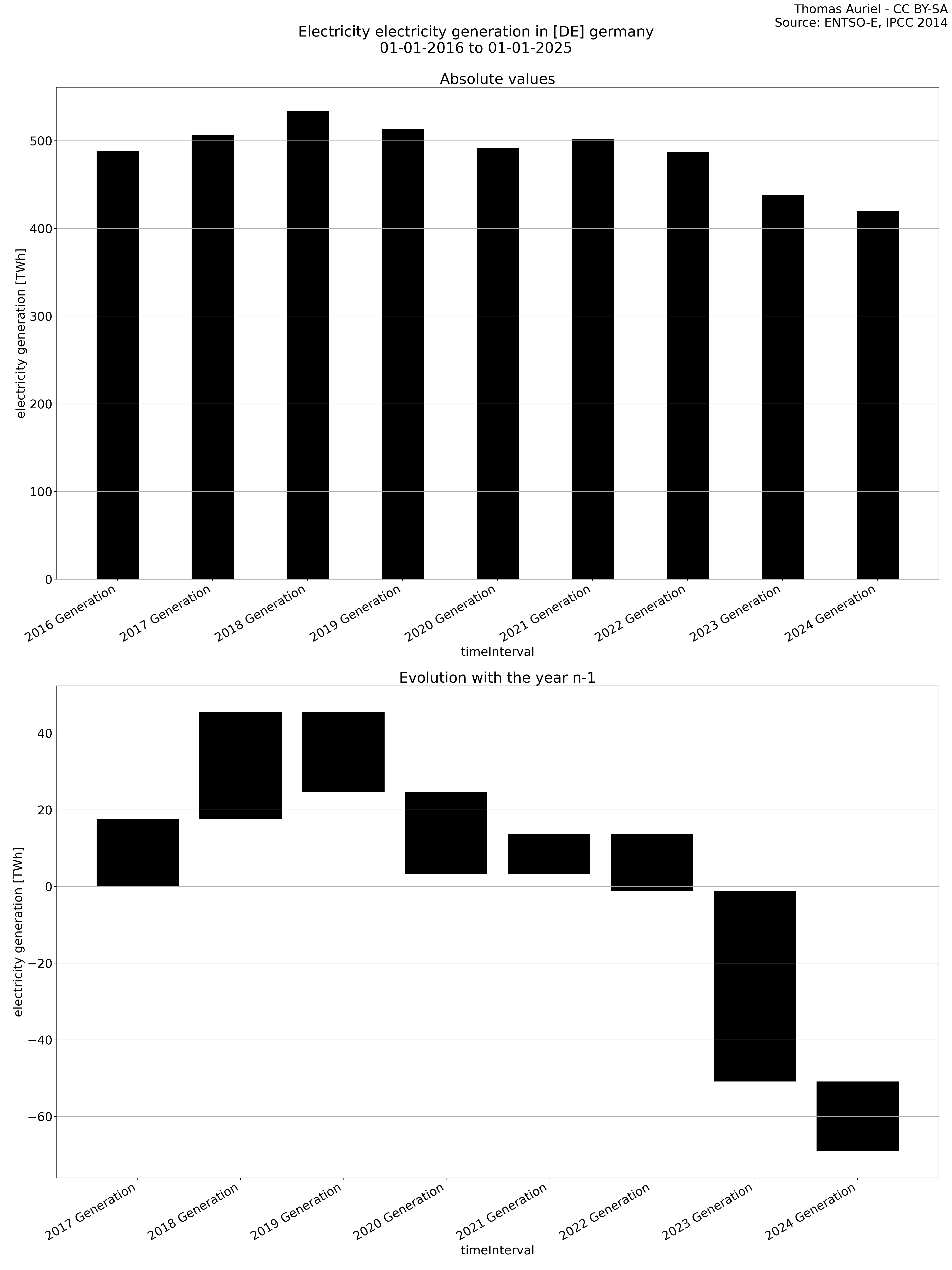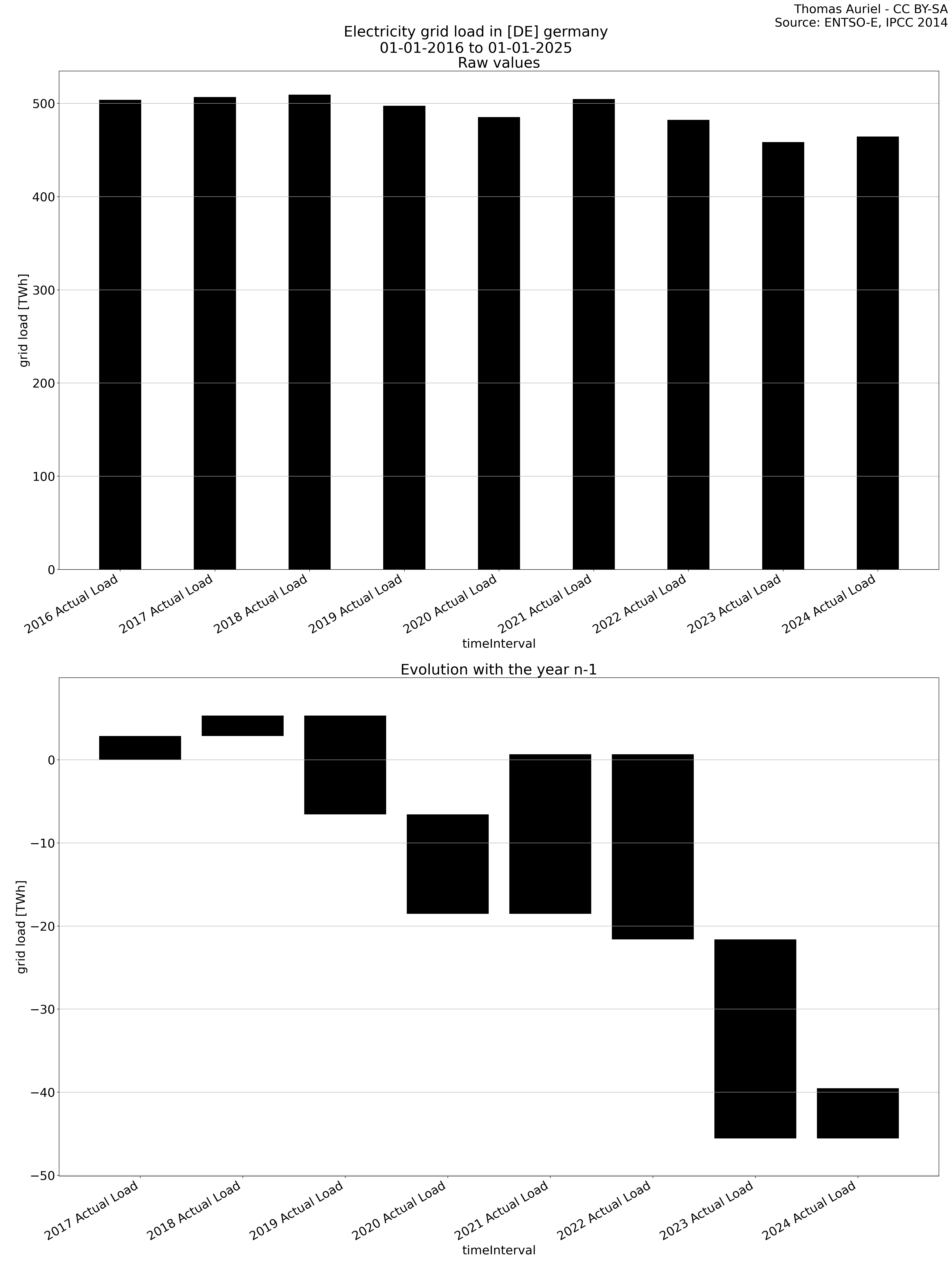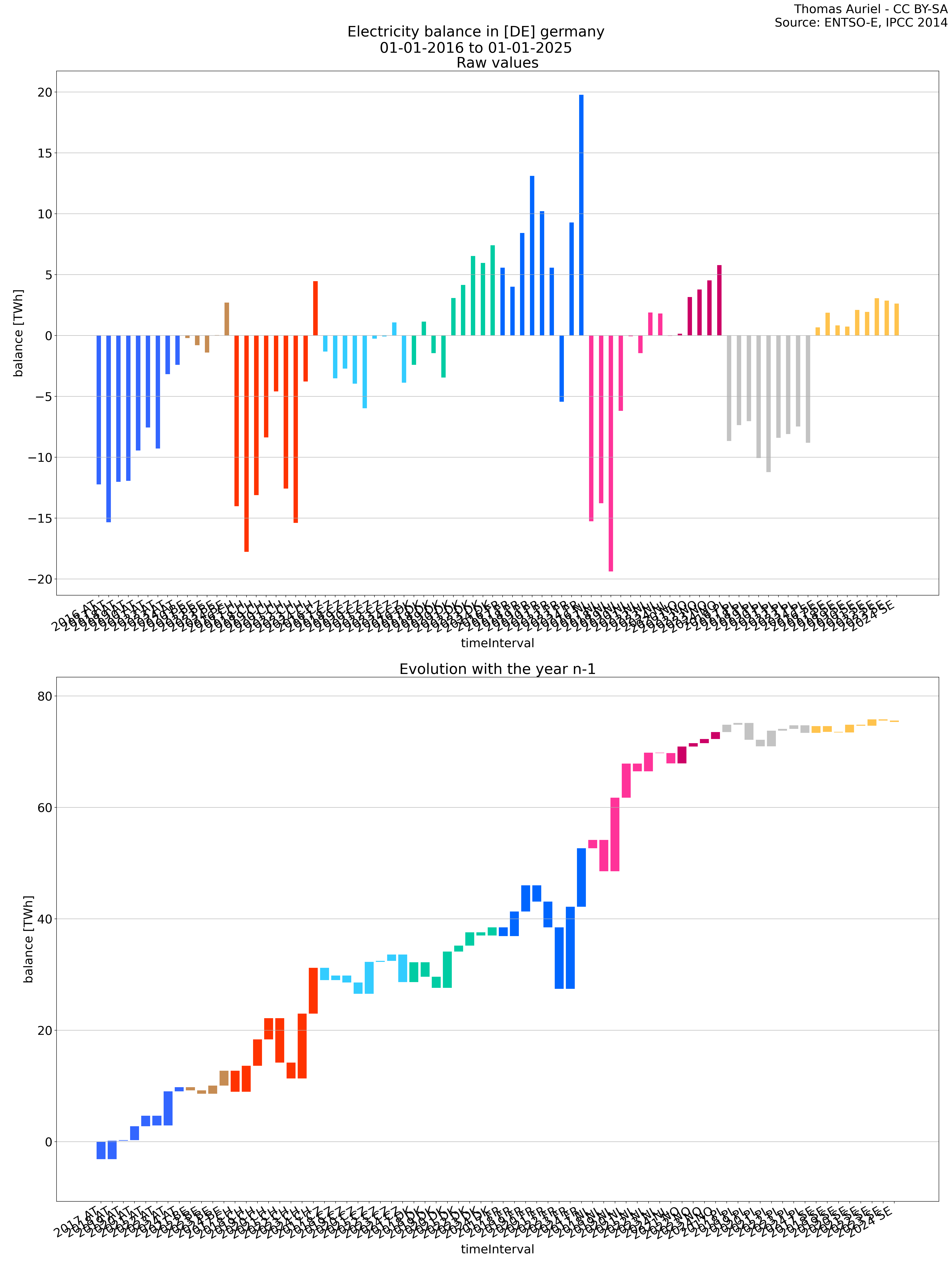 The second section features a waterfall graph, which visually represents the year-over-year changes in electricity metrics. In this graph, the length of each bar corresponds to the difference in the metric (e.g., production, load, etc.) compared to the previous year. Unlike the bar plot, the bars in the waterfall graph do not start at zero; instead, each bar begins where the previous one ended. Hence, this structure emphasizes the incremental changes in the metric over time, facilitating the visualization of fluctuations from one year to the next.