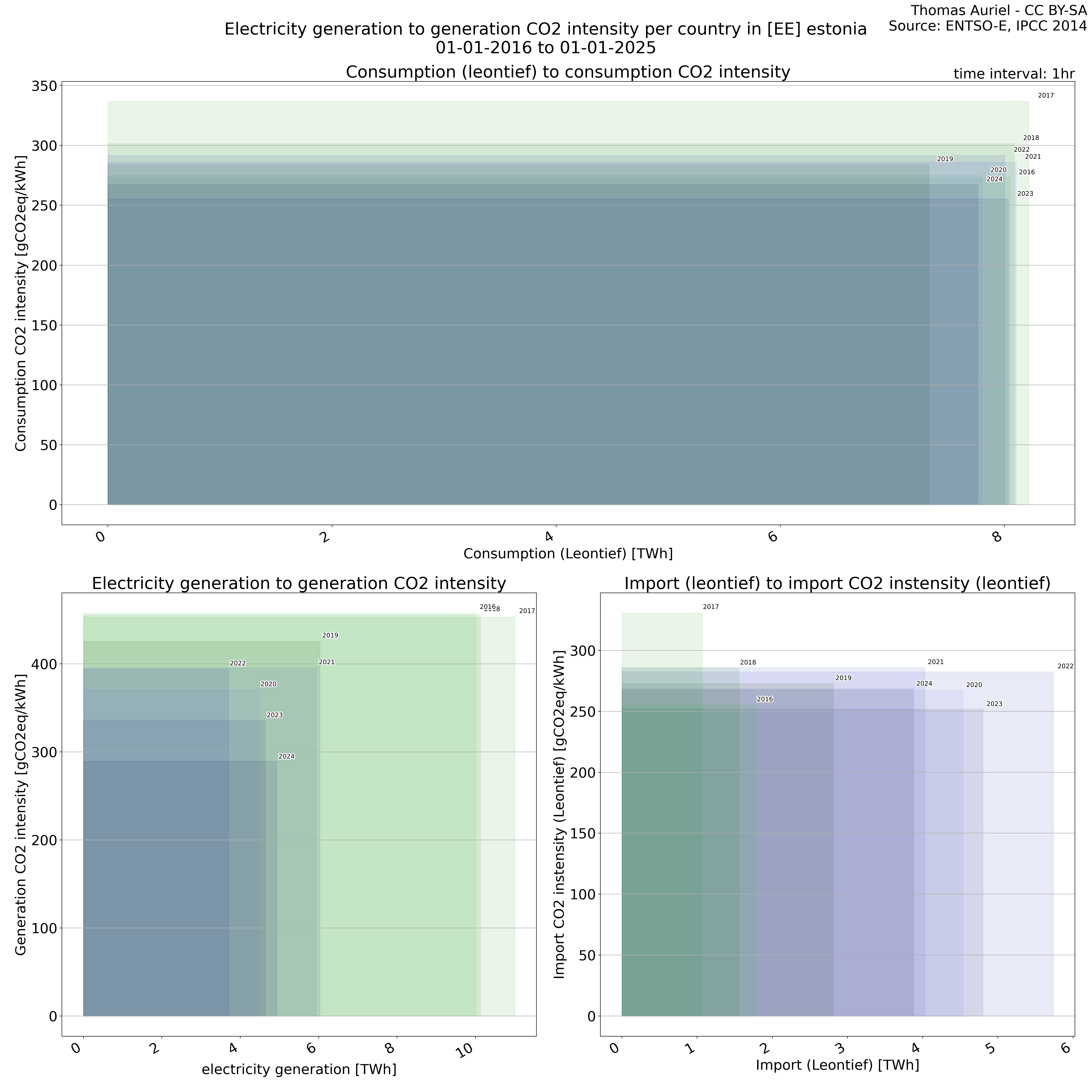 The plot consists of squares, each representing a single year, designed to illustrate electricity-related metrics and their associated environmental impacts. The length of each square corresponds to the total electricity consumption, generation, or imports during the year, with longer squares indicating higher overall values for the respective metric. The height of each square represents the average CO₂ intensity (e.g., grams of CO₂ per kWh) associated with electricity consumption, generation, or imports; hence, taller squares signify greater environmental impact per unit of electricity. Finally, the surface area of each square, determined by the product of its length and height, represents the total CO₂ emissions associated with the respective activity in the given year.