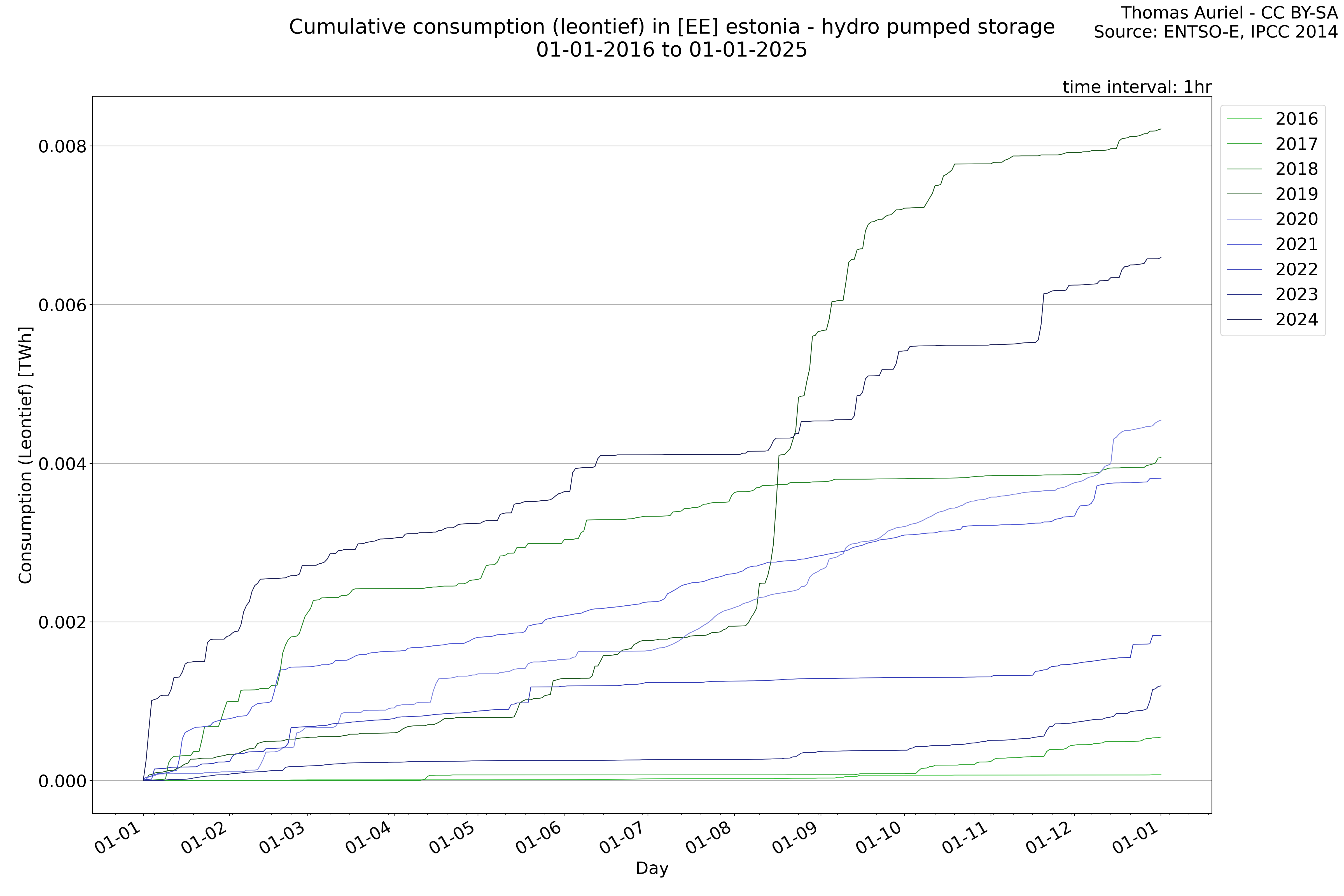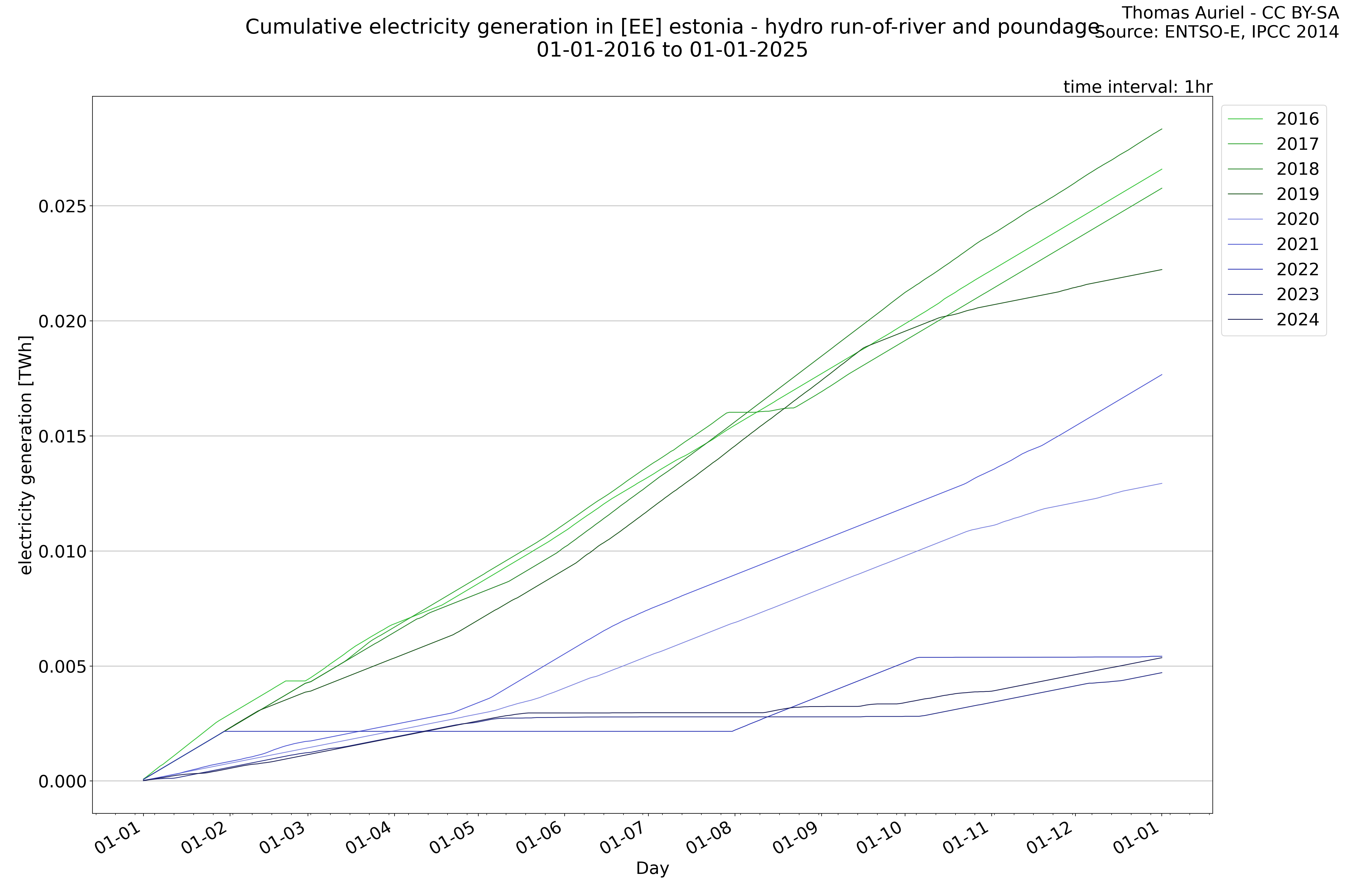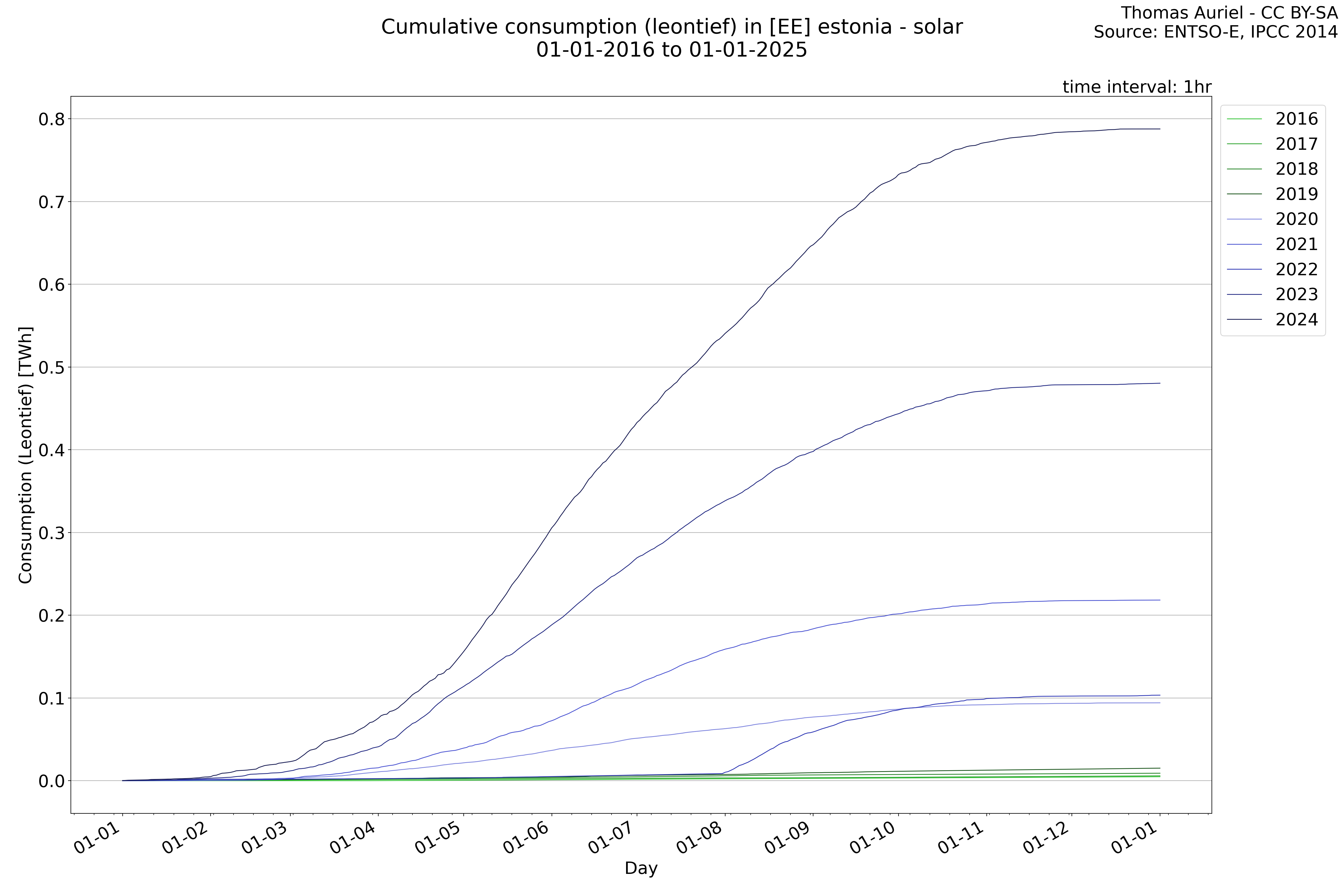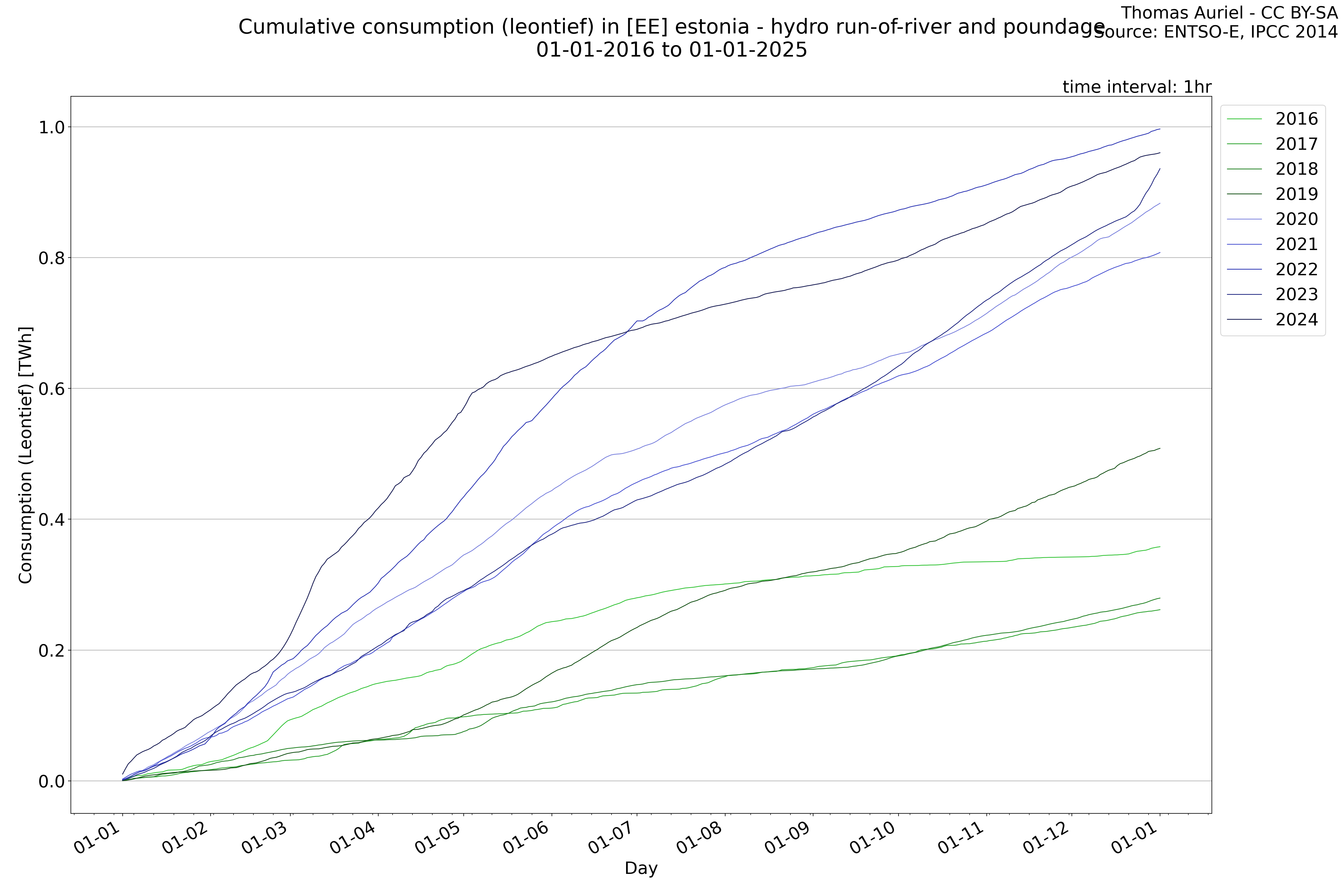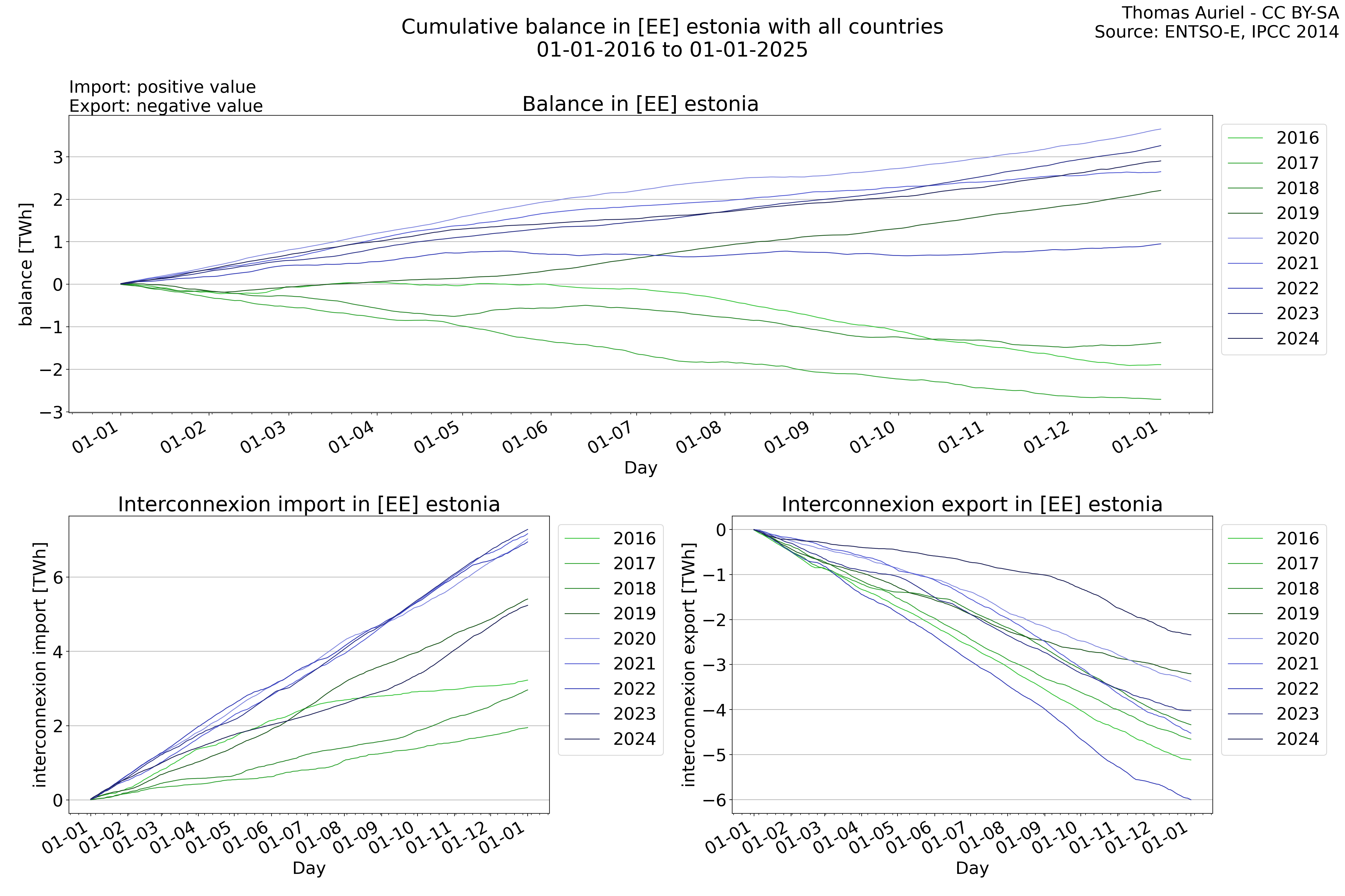 This plot is a cumulative sum plot, where each line represents the cumulative value of a specific metric (e.g., production, load, import, or export) for a given year. The plot begins at zero, and as the year progresses, the cumulative value is updated to reflect the total amount accumulated over time. This visualization illustrates the overall trend of the metric, showing whether the cumulative sum is increasing or decreasing, as well as any changes in the trend within the year. Additionally, the cumulative sum plot helps to reduce the impact of noise and short-term fluctuations commonly present in the raw data of production, load, import, or export. By smoothing out these variations, the plot emphasizes the broader, long-term trends. Consequently, this type of visualization facilitates a clearer understanding of the metric’s evolution across the year, revealing whether the activity follows a steady trajectory, shows signs of volatility, or experiences periods of significant change.