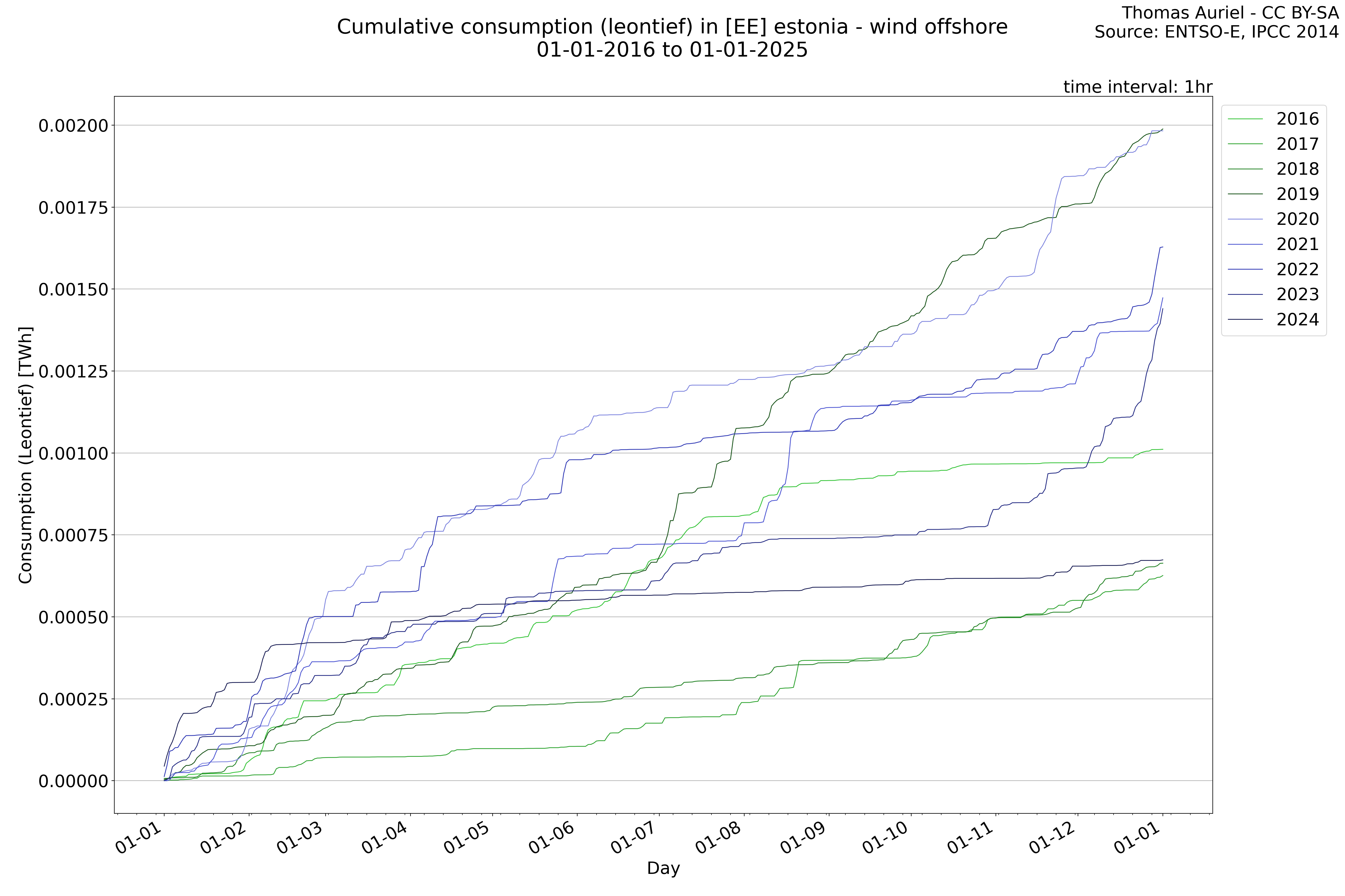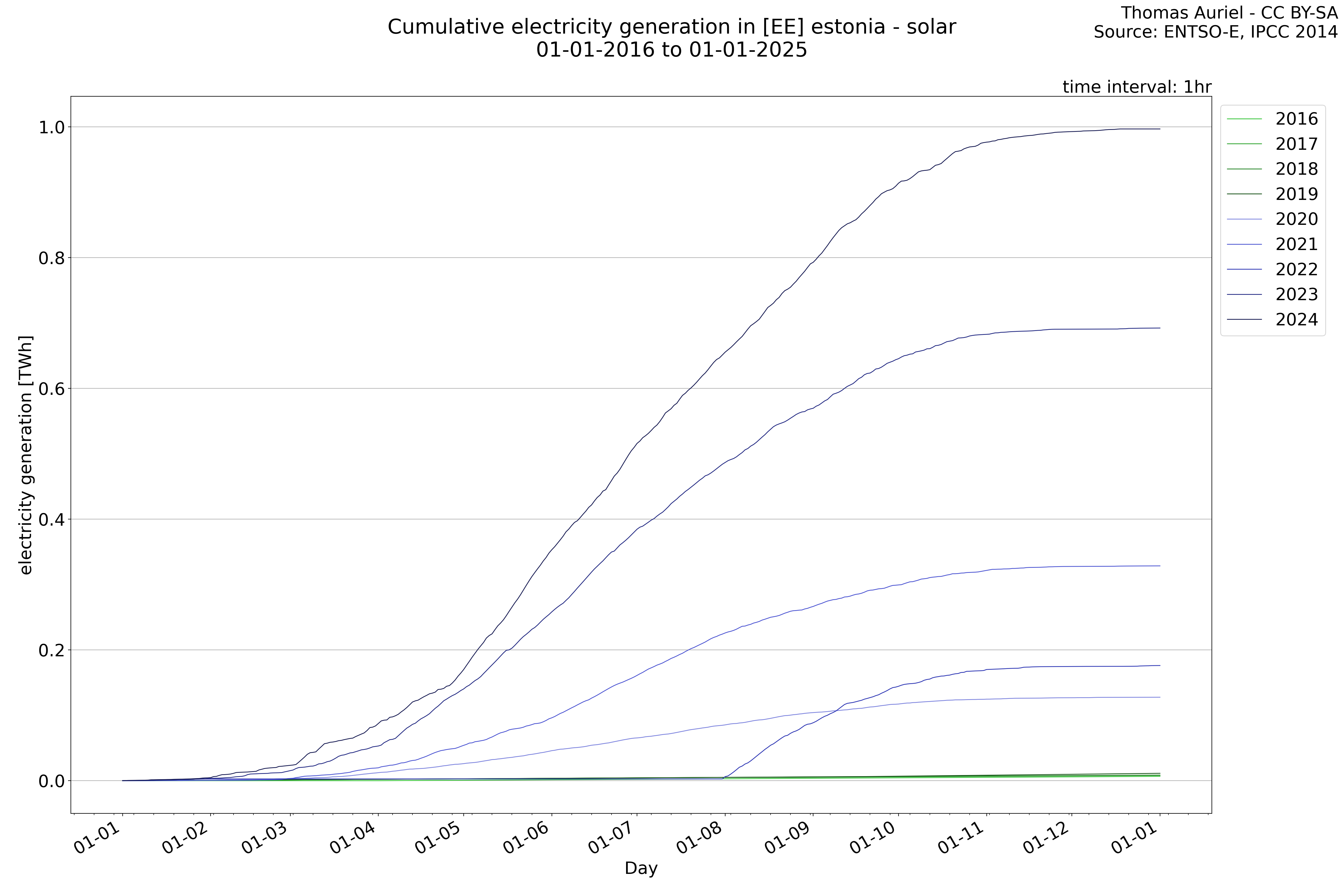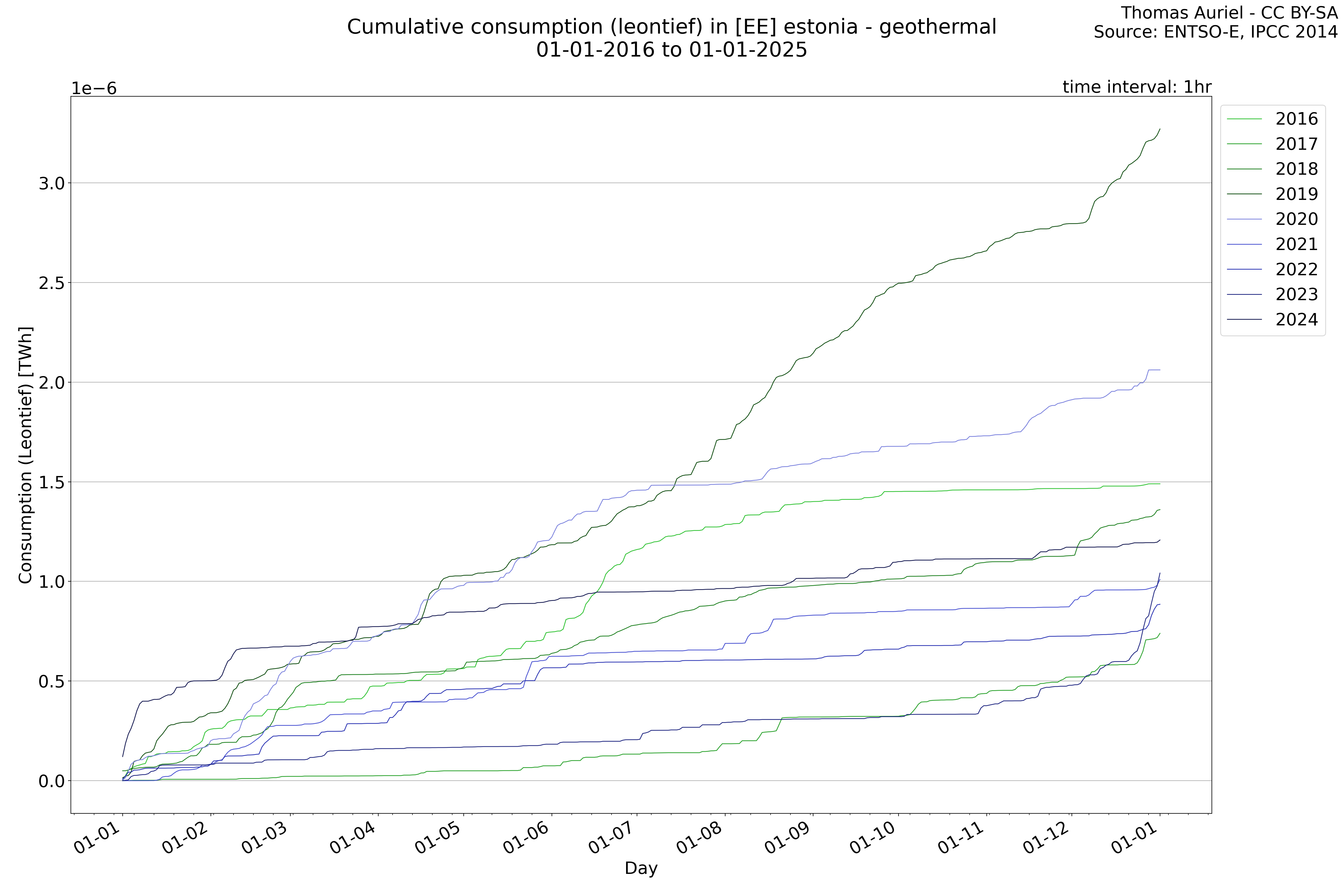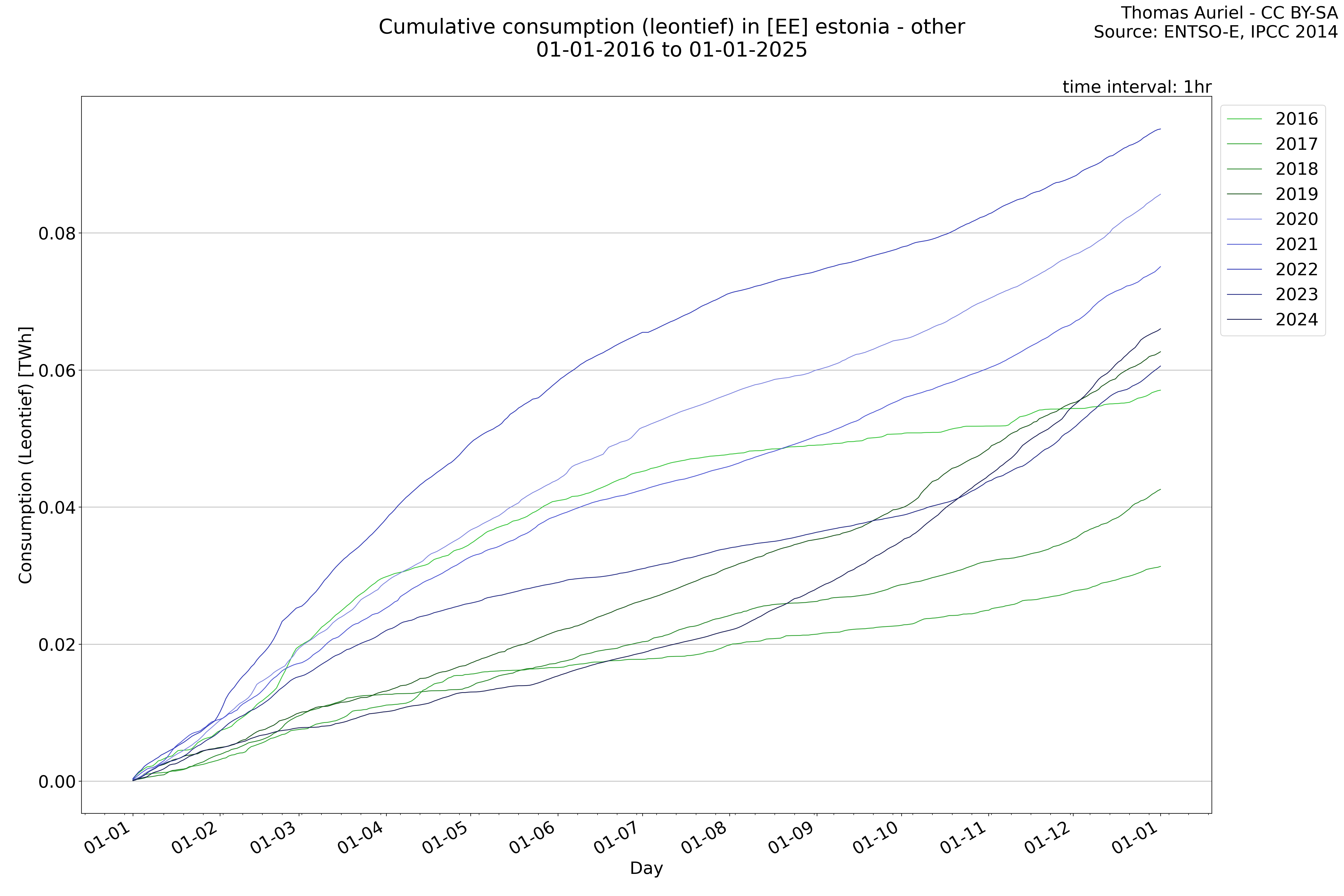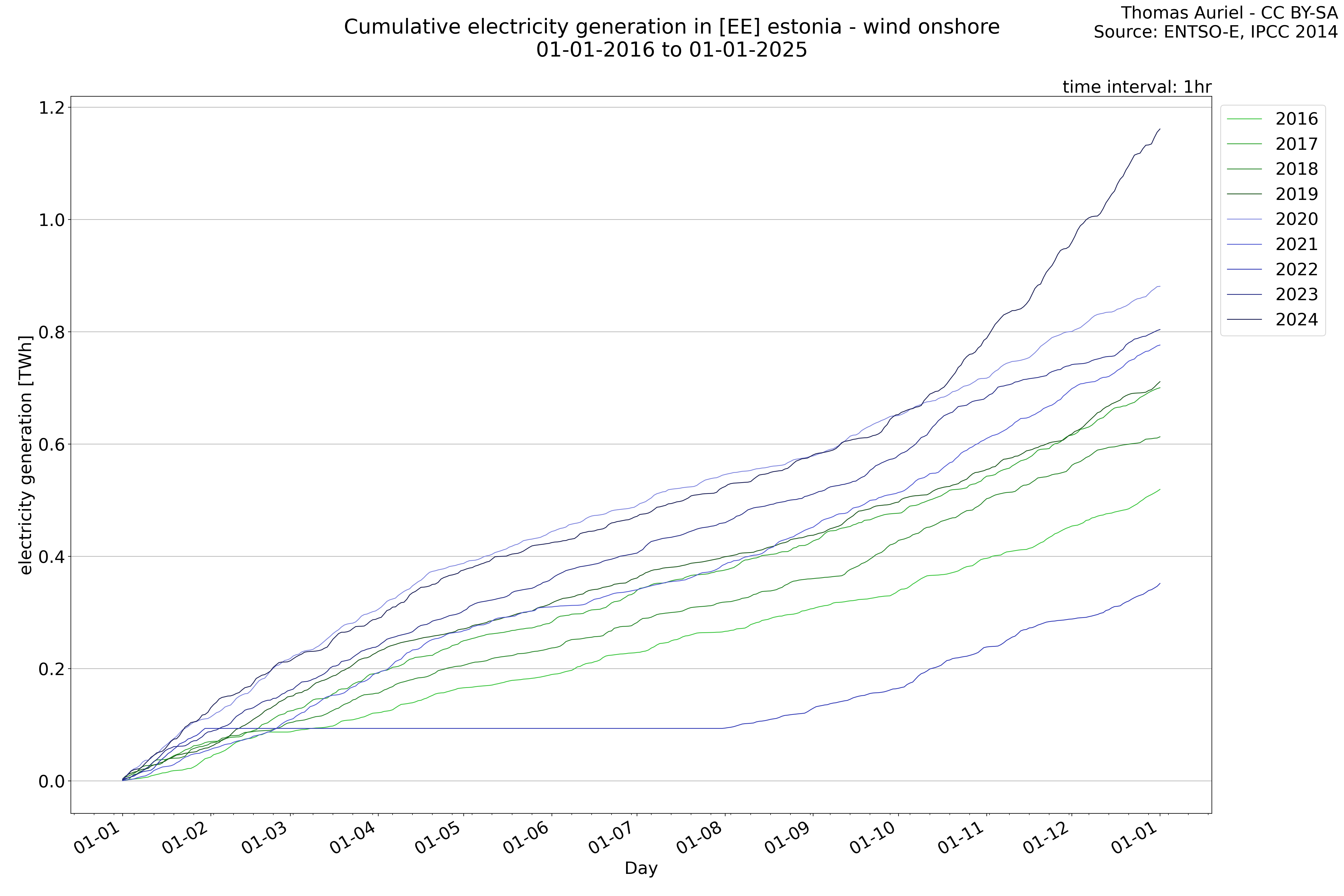 This plot is a cumulative sum plot, where each line represents the cumulative value of a specific metric (e.g., production, load, import, or export) for a given year. The plot begins at zero, and as the year progresses, the cumulative value is updated to reflect the total amount accumulated over time. This visualization illustrates the overall trend of the metric, showing whether the cumulative sum is increasing or decreasing, as well as any changes in the trend within the year. Additionally, the cumulative sum plot helps to reduce the impact of noise and short-term fluctuations commonly present in the raw data of production, load, import, or export. By smoothing out these variations, the plot emphasizes the broader, long-term trends. Consequently, this type of visualization facilitates a clearer understanding of the metric’s evolution across the year, revealing whether the activity follows a steady trajectory, shows signs of volatility, or experiences periods of significant change.