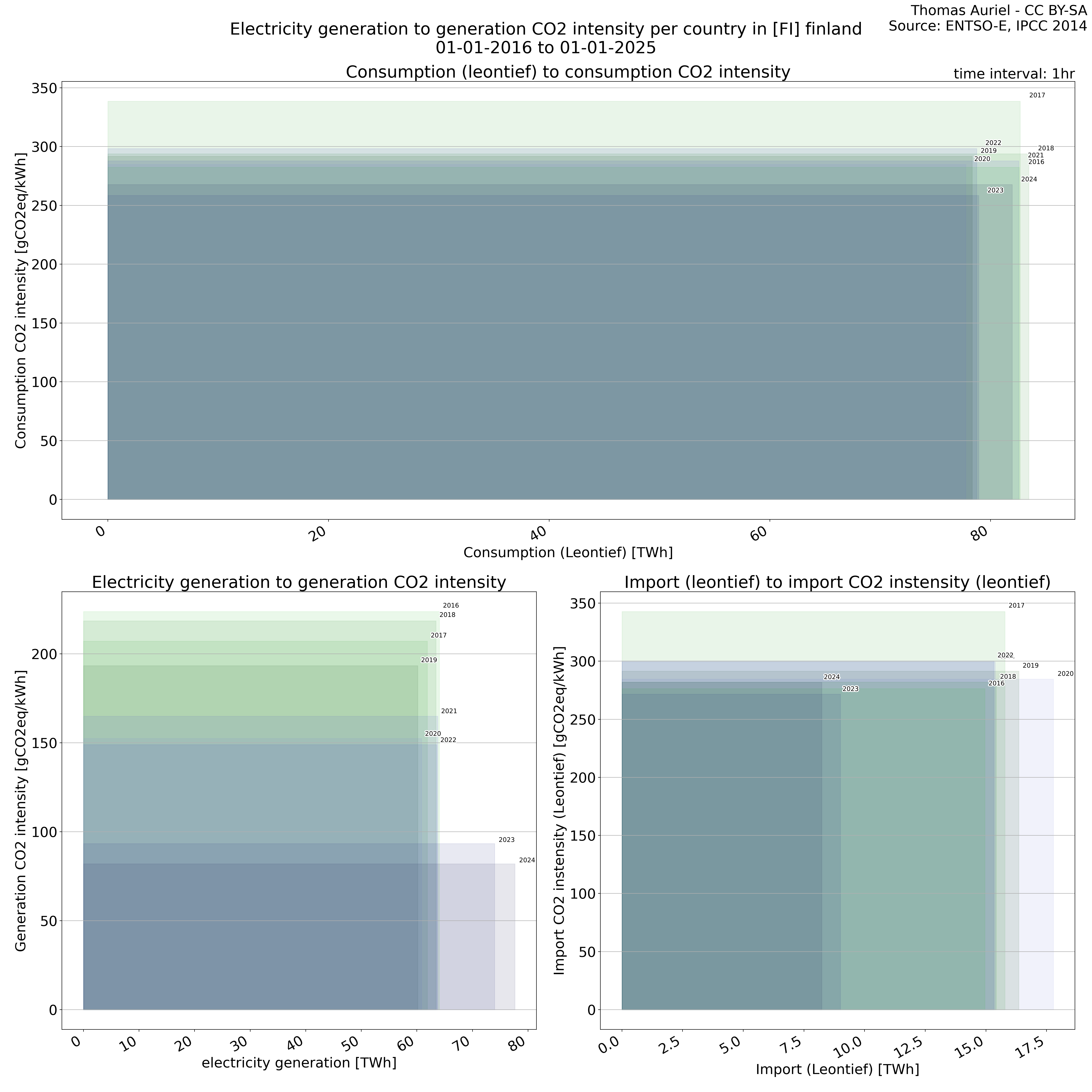 The plot consists of squares, each representing a single year, designed to illustrate electricity-related metrics and their associated environmental impacts. The length of each square corresponds to the total electricity consumption, generation, or imports during the year, with longer squares indicating higher overall values for the respective metric. The height of each square represents the average CO₂ intensity (e.g., grams of CO₂ per kWh) associated with electricity consumption, generation, or imports; hence, taller squares signify greater environmental impact per unit of electricity. Finally, the surface area of each square, determined by the product of its length and height, represents the total CO₂ emissions associated with the respective activity in the given year.
