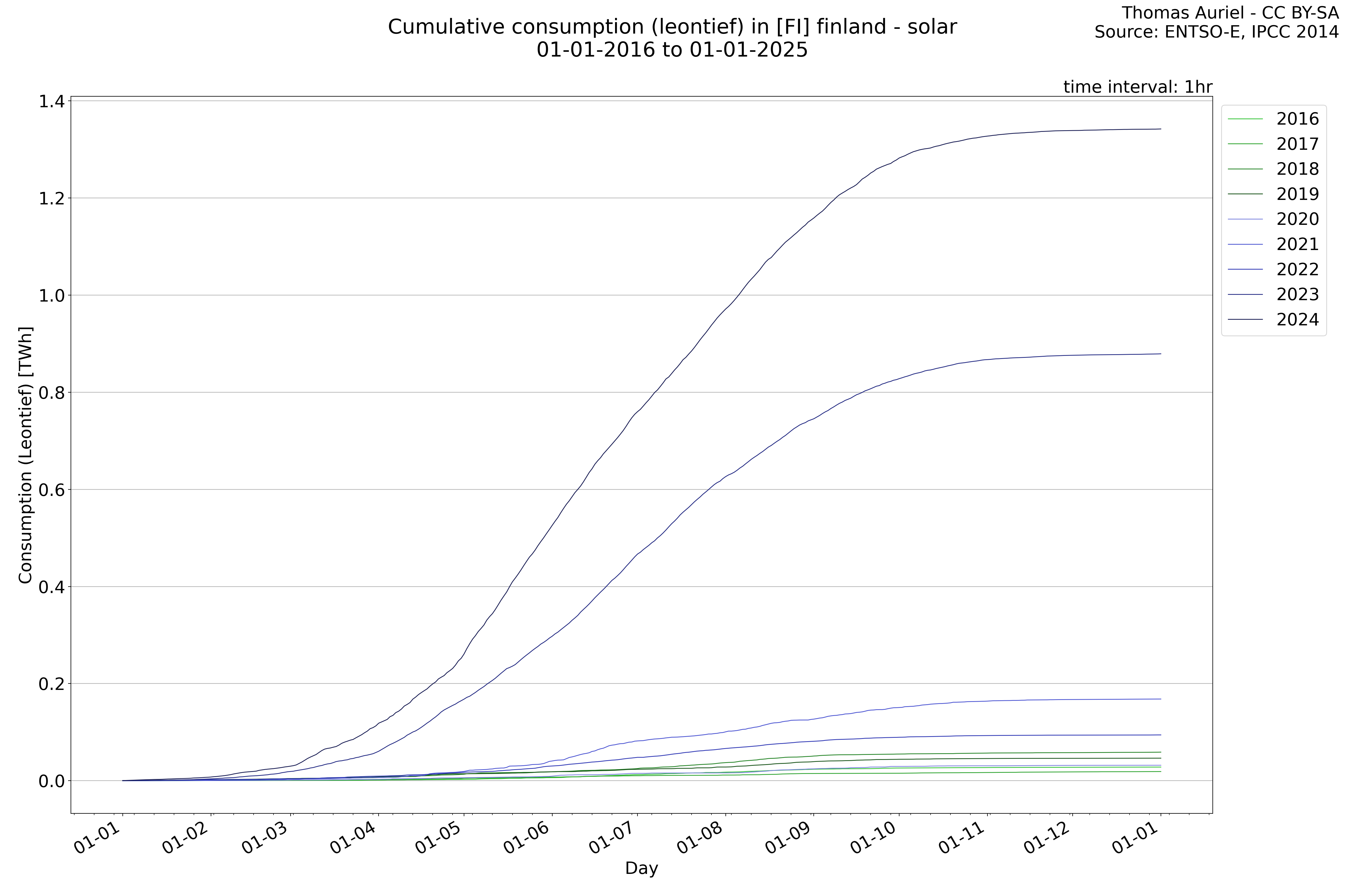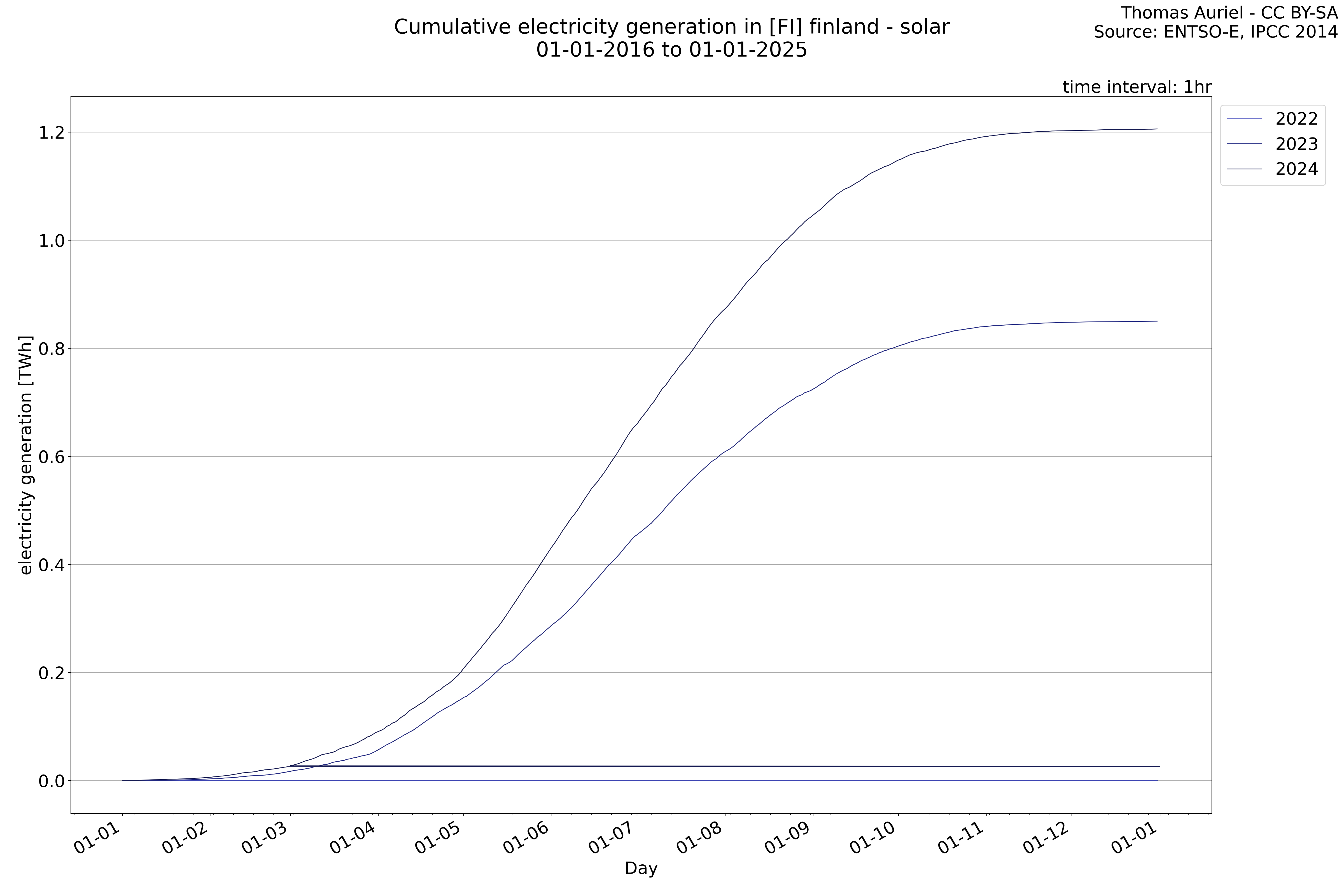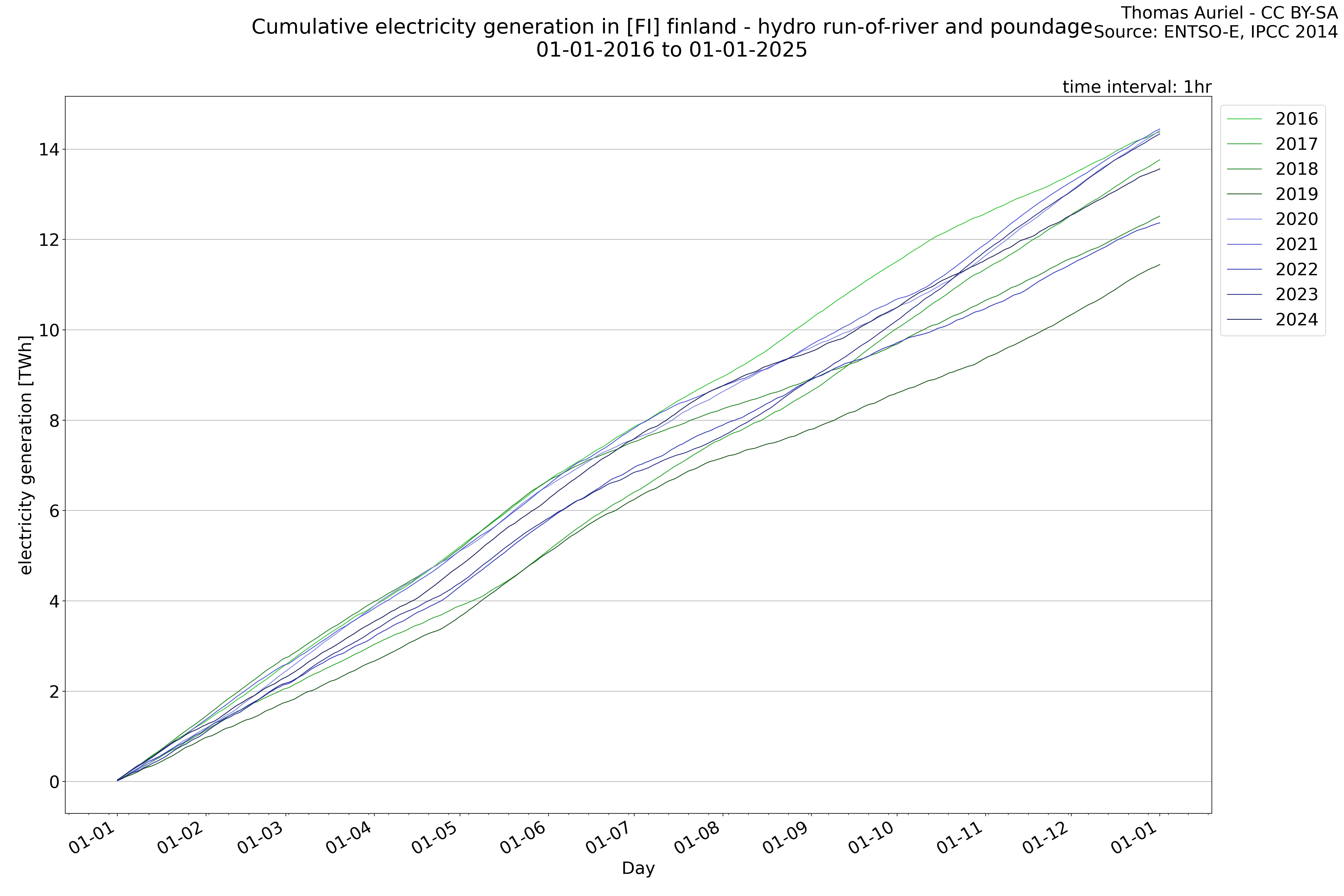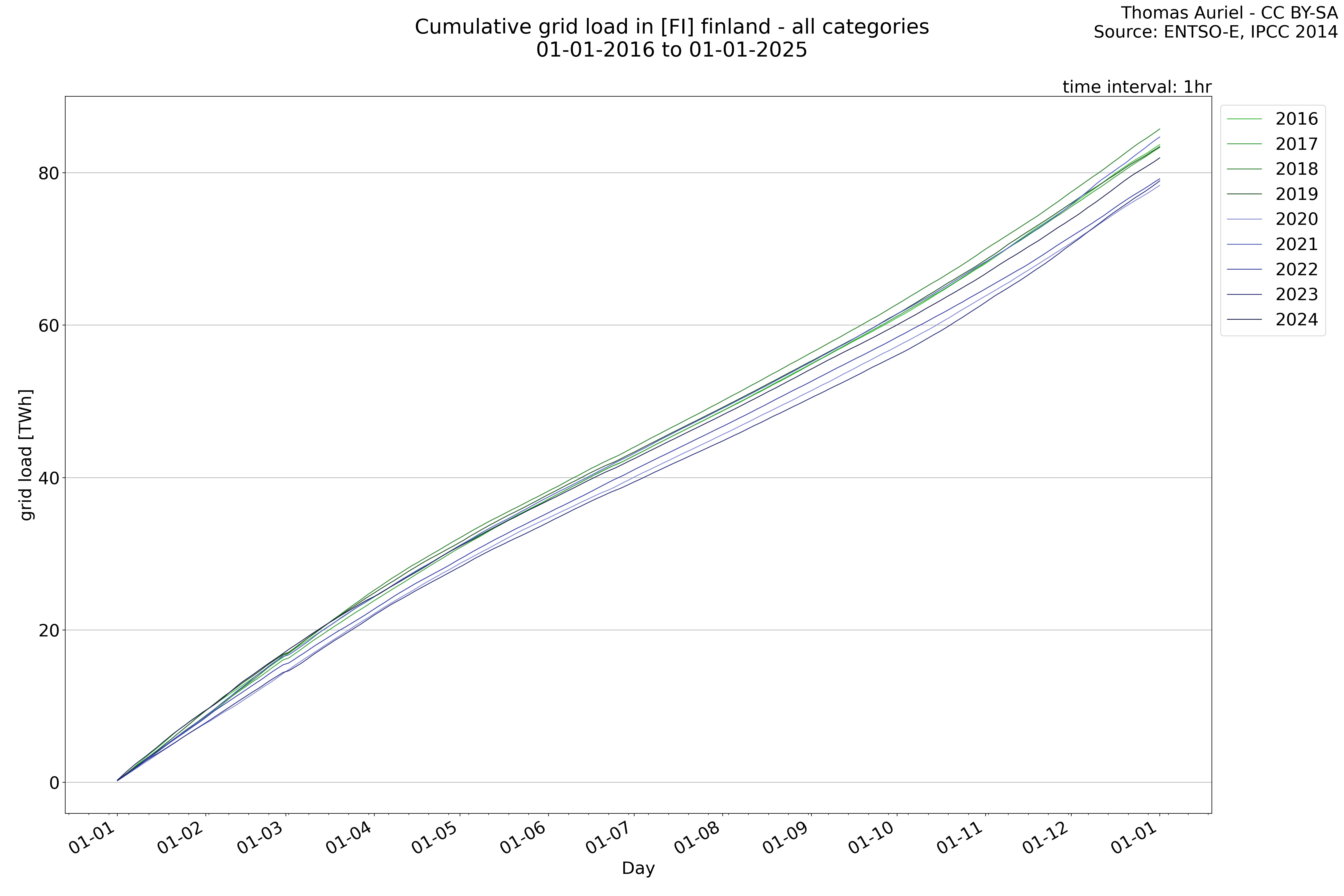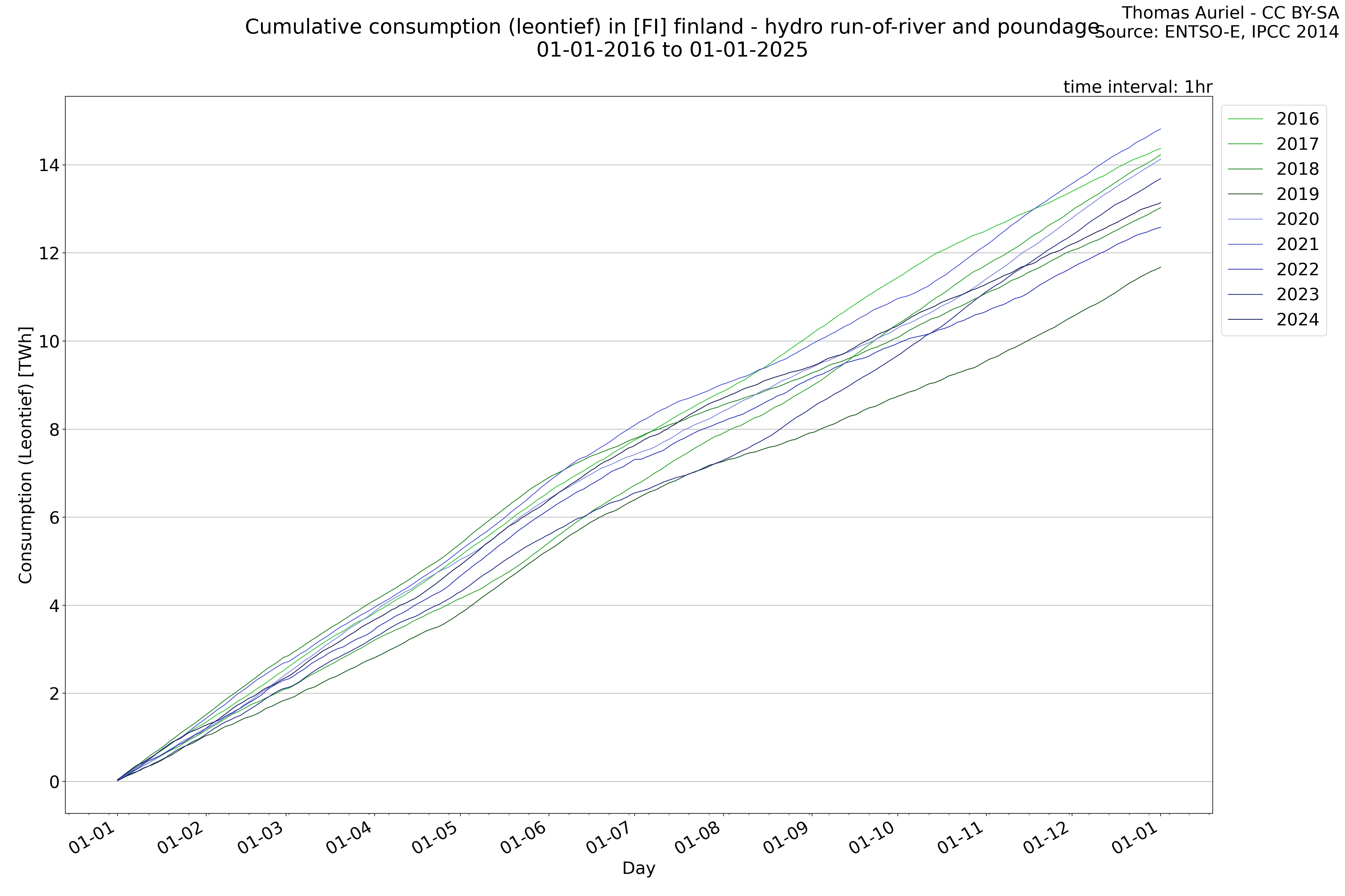 This plot is a cumulative sum plot, where each line represents the cumulative value of a specific metric (e.g., production, load, import, or export) for a given year. The plot begins at zero, and as the year progresses, the cumulative value is updated to reflect the total amount accumulated over time. This visualization illustrates the overall trend of the metric, showing whether the cumulative sum is increasing or decreasing, as well as any changes in the trend within the year. Additionally, the cumulative sum plot helps to reduce the impact of noise and short-term fluctuations commonly present in the raw data of production, load, import, or export. By smoothing out these variations, the plot emphasizes the broader, long-term trends. Consequently, this type of visualization facilitates a clearer understanding of the metric’s evolution across the year, revealing whether the activity follows a steady trajectory, shows signs of volatility, or experiences periods of significant change.