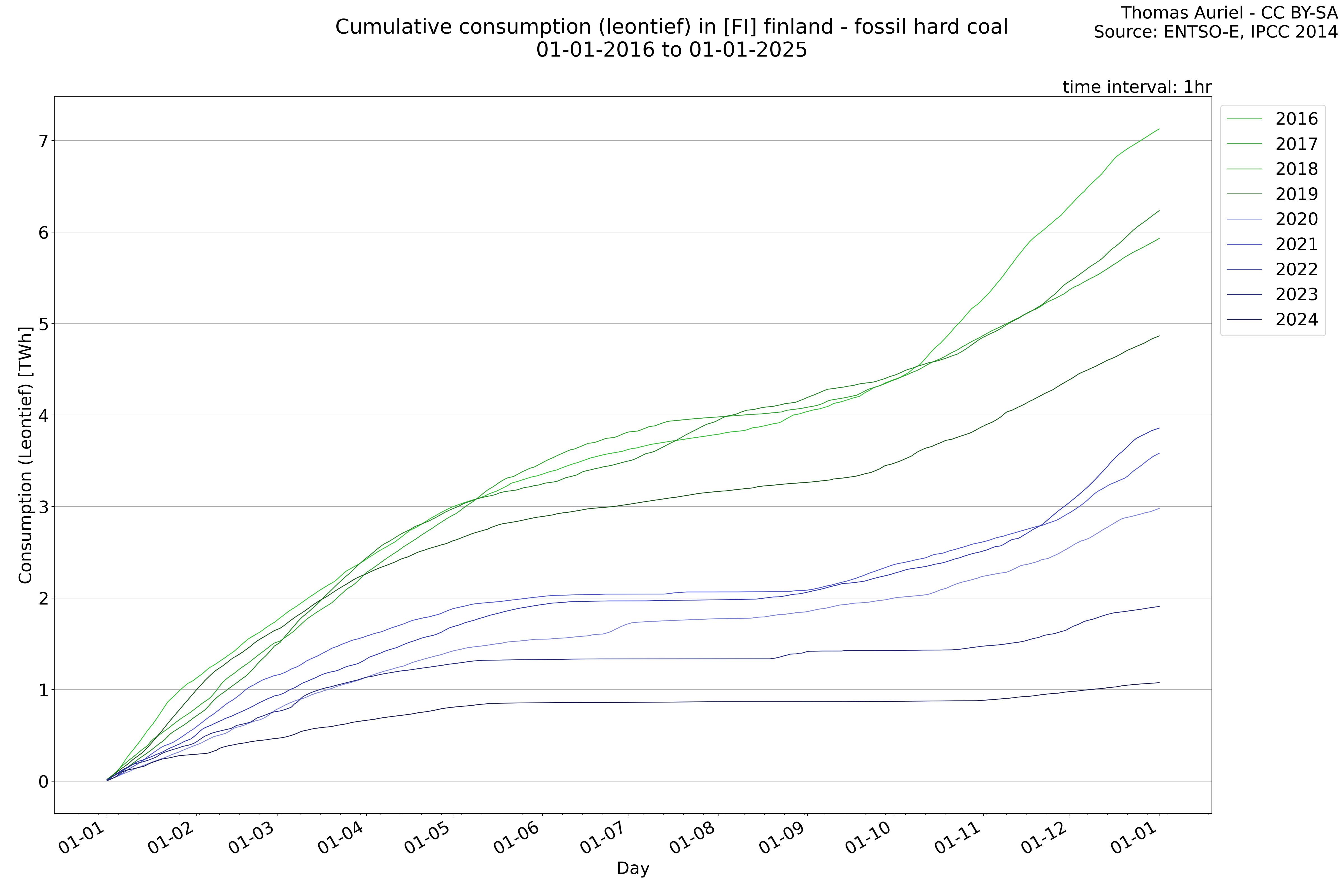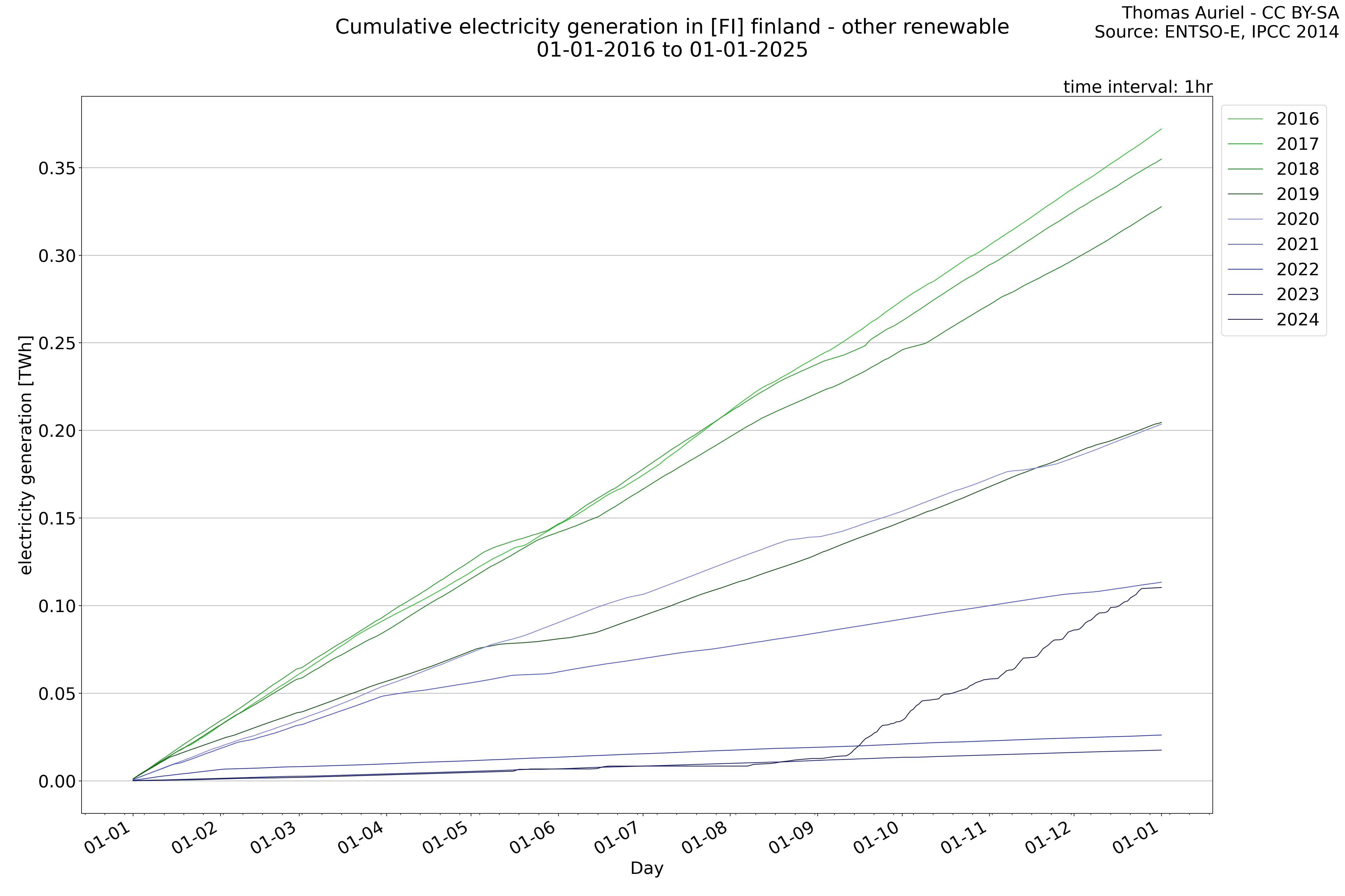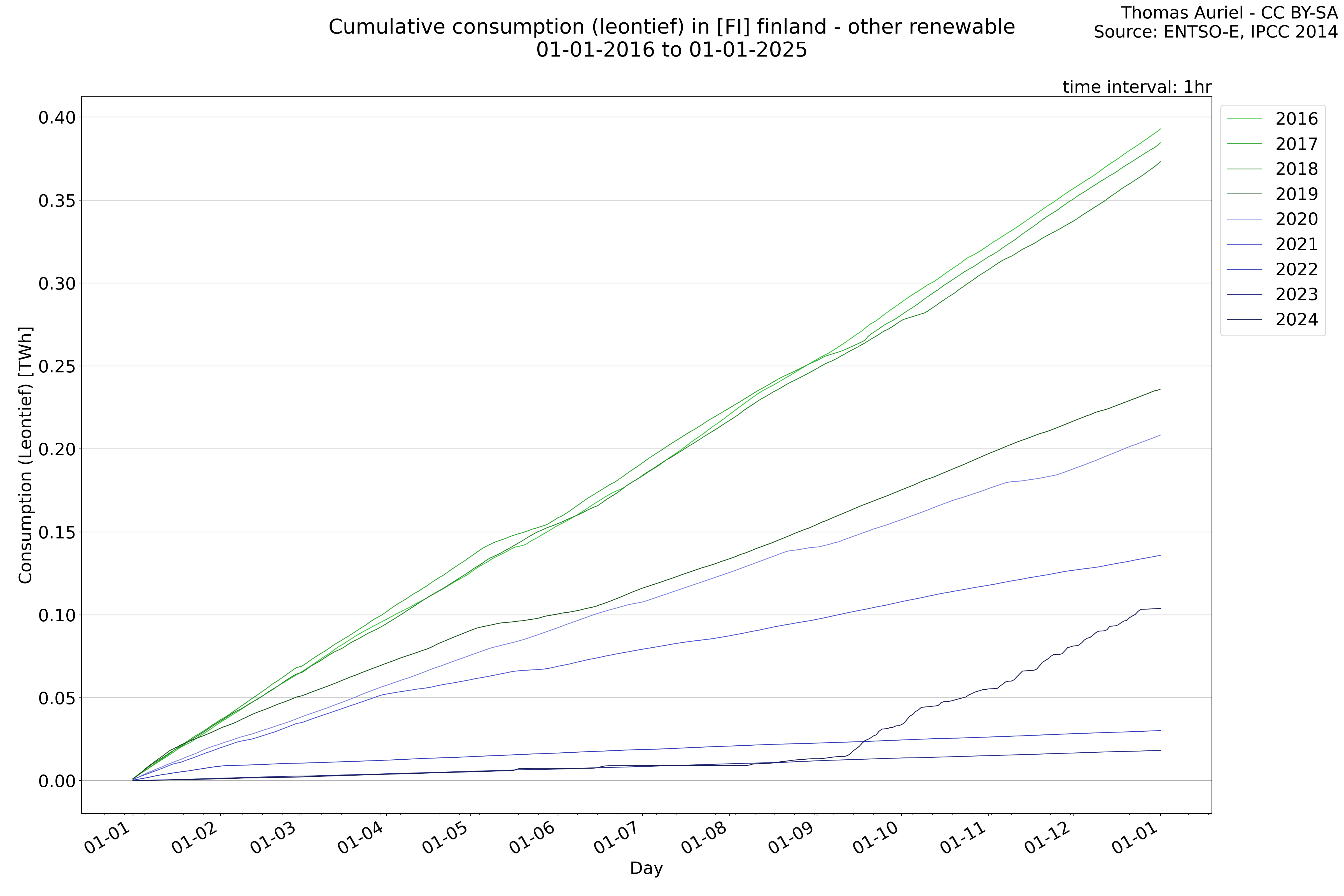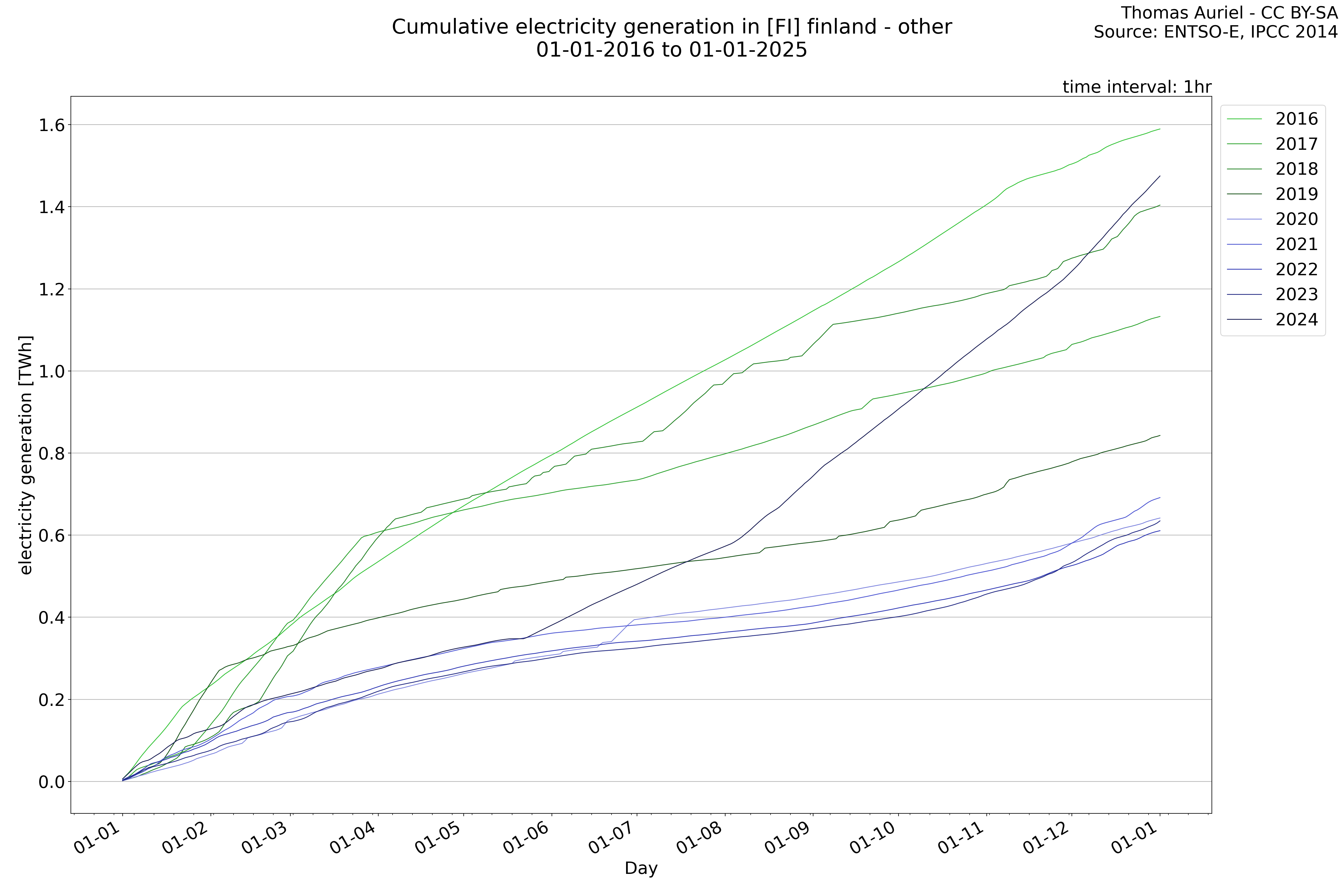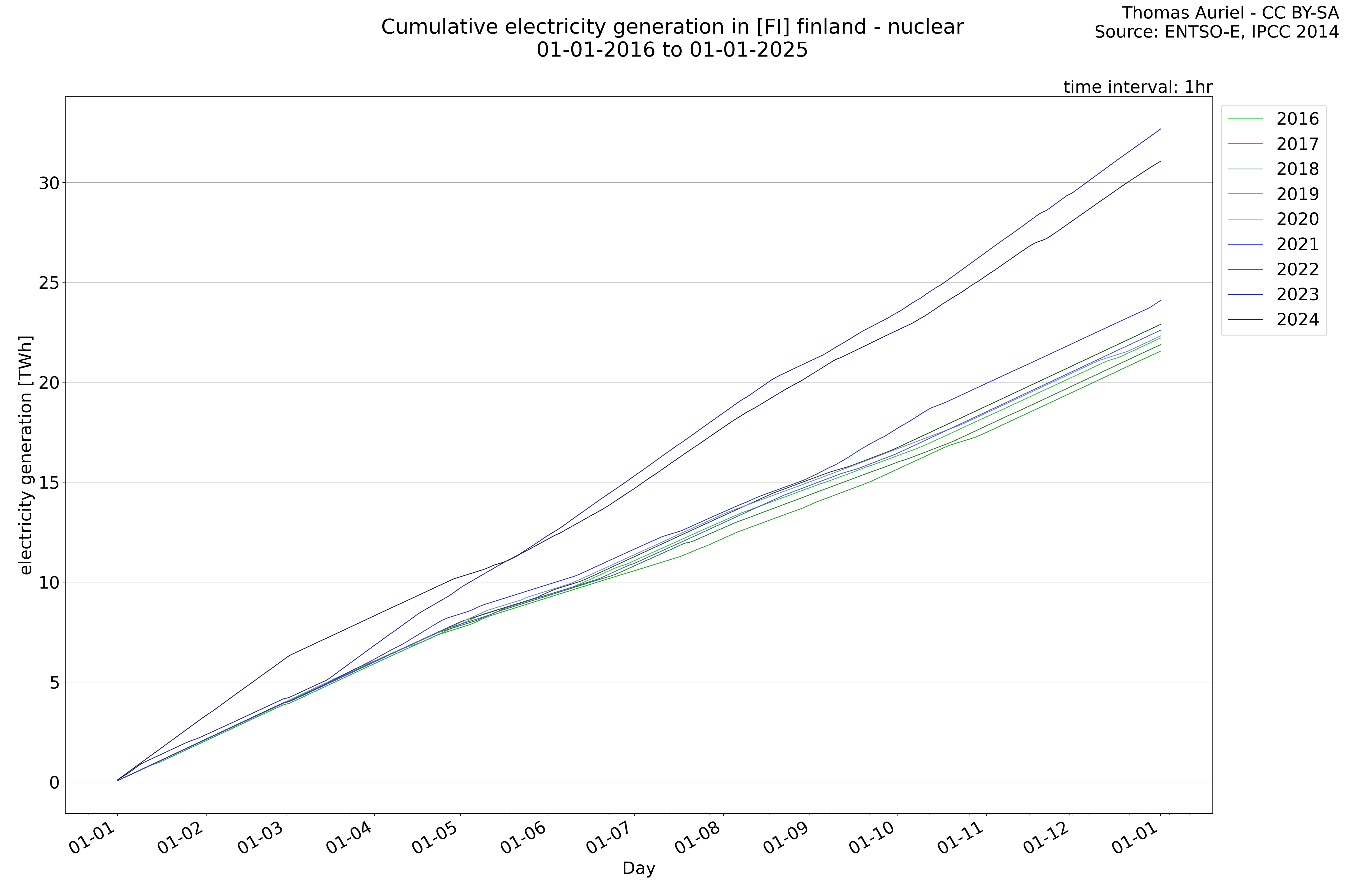 This plot is a cumulative sum plot, where each line represents the cumulative value of a specific metric (e.g., production, load, import, or export) for a given year. The plot begins at zero, and as the year progresses, the cumulative value is updated to reflect the total amount accumulated over time. This visualization illustrates the overall trend of the metric, showing whether the cumulative sum is increasing or decreasing, as well as any changes in the trend within the year. Additionally, the cumulative sum plot helps to reduce the impact of noise and short-term fluctuations commonly present in the raw data of production, load, import, or export. By smoothing out these variations, the plot emphasizes the broader, long-term trends. Consequently, this type of visualization facilitates a clearer understanding of the metric’s evolution across the year, revealing whether the activity follows a steady trajectory, shows signs of volatility, or experiences periods of significant change.