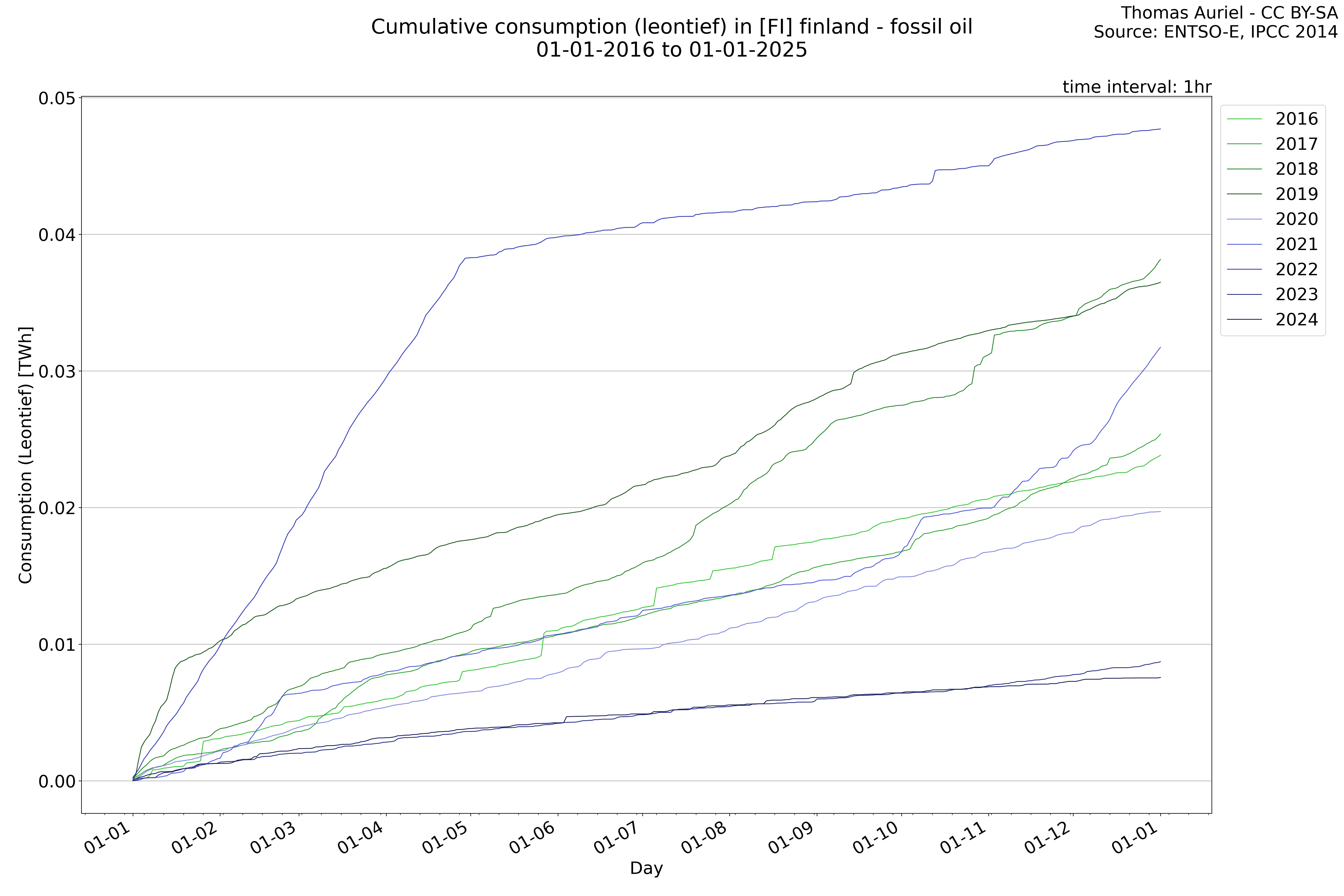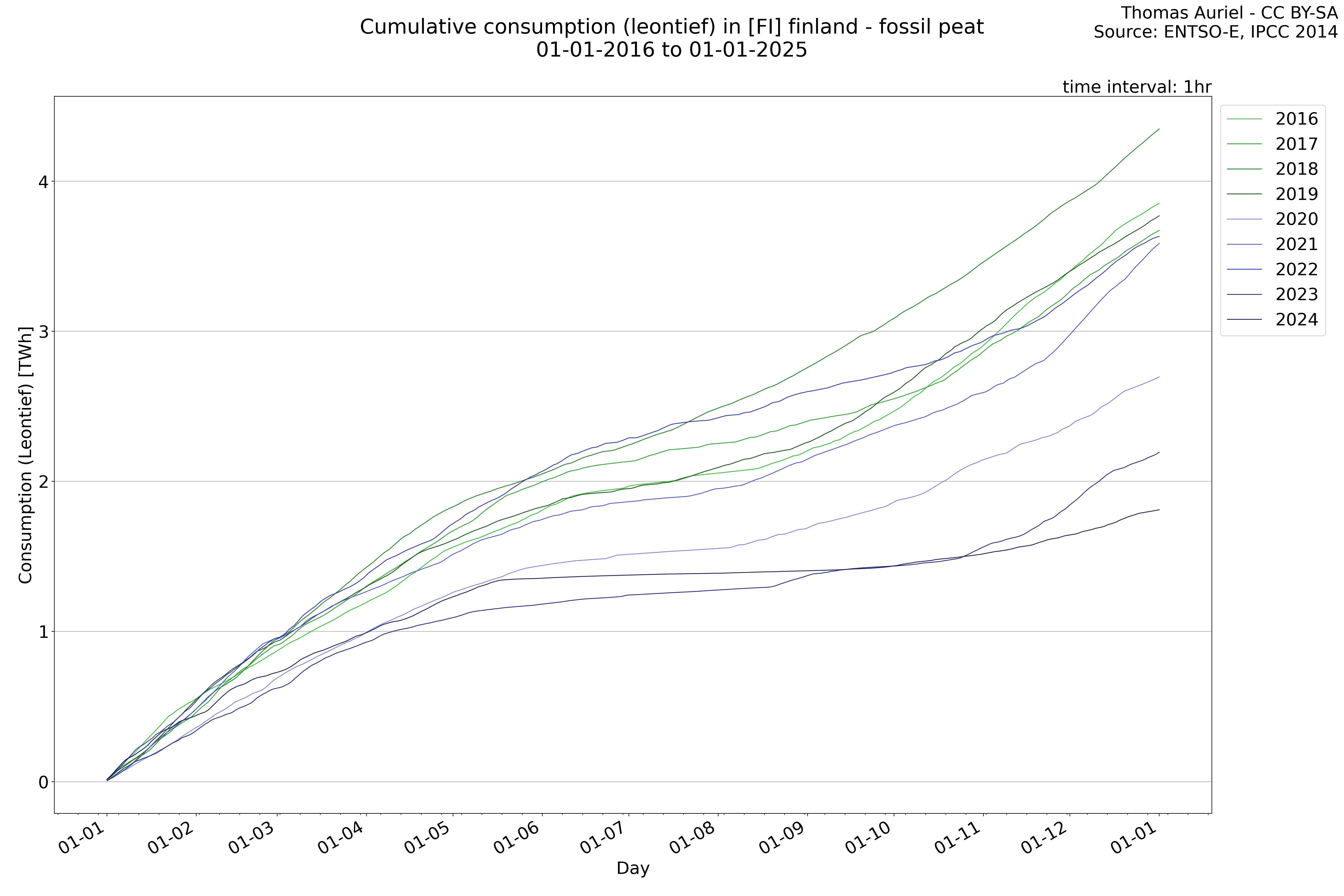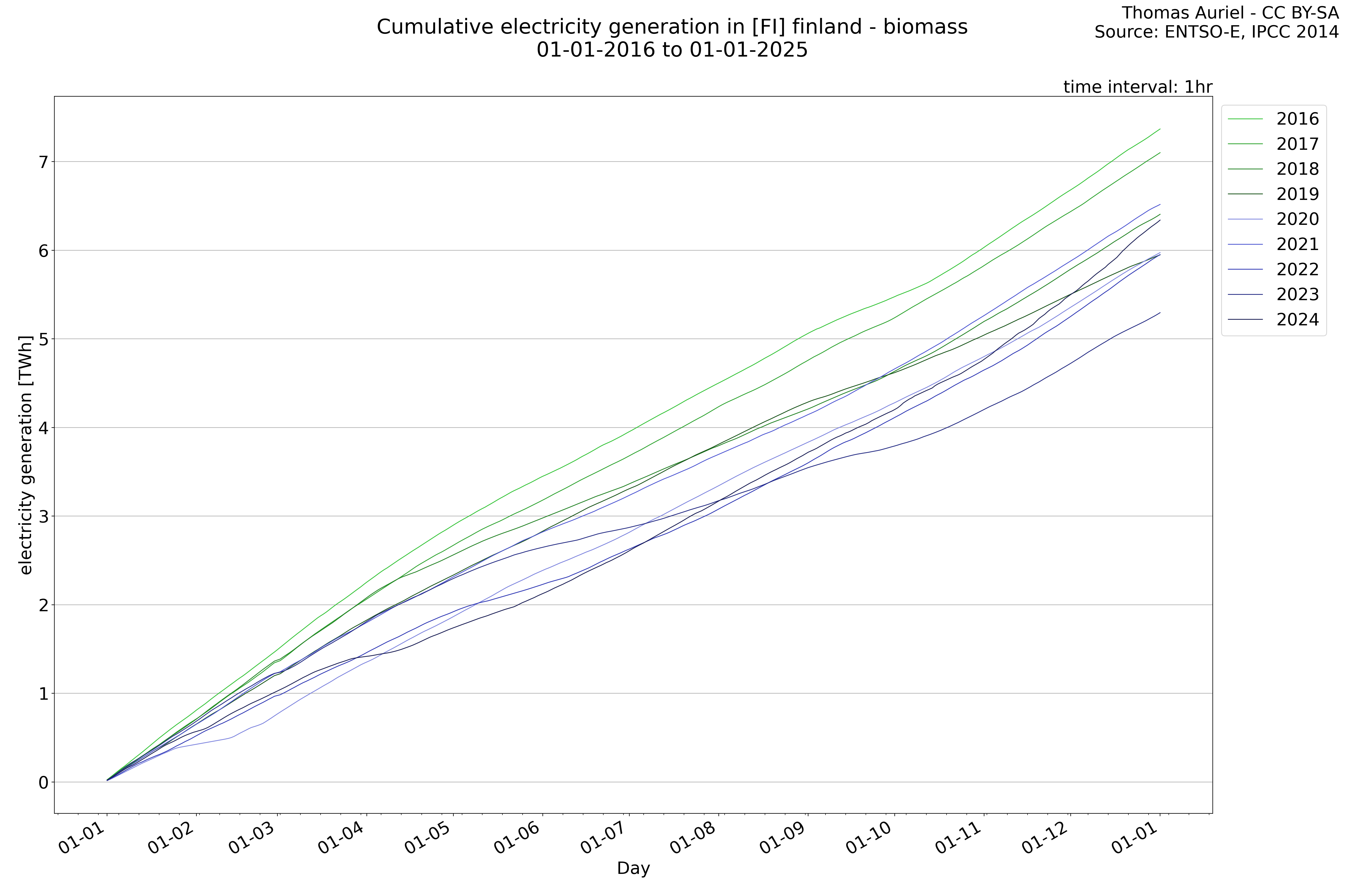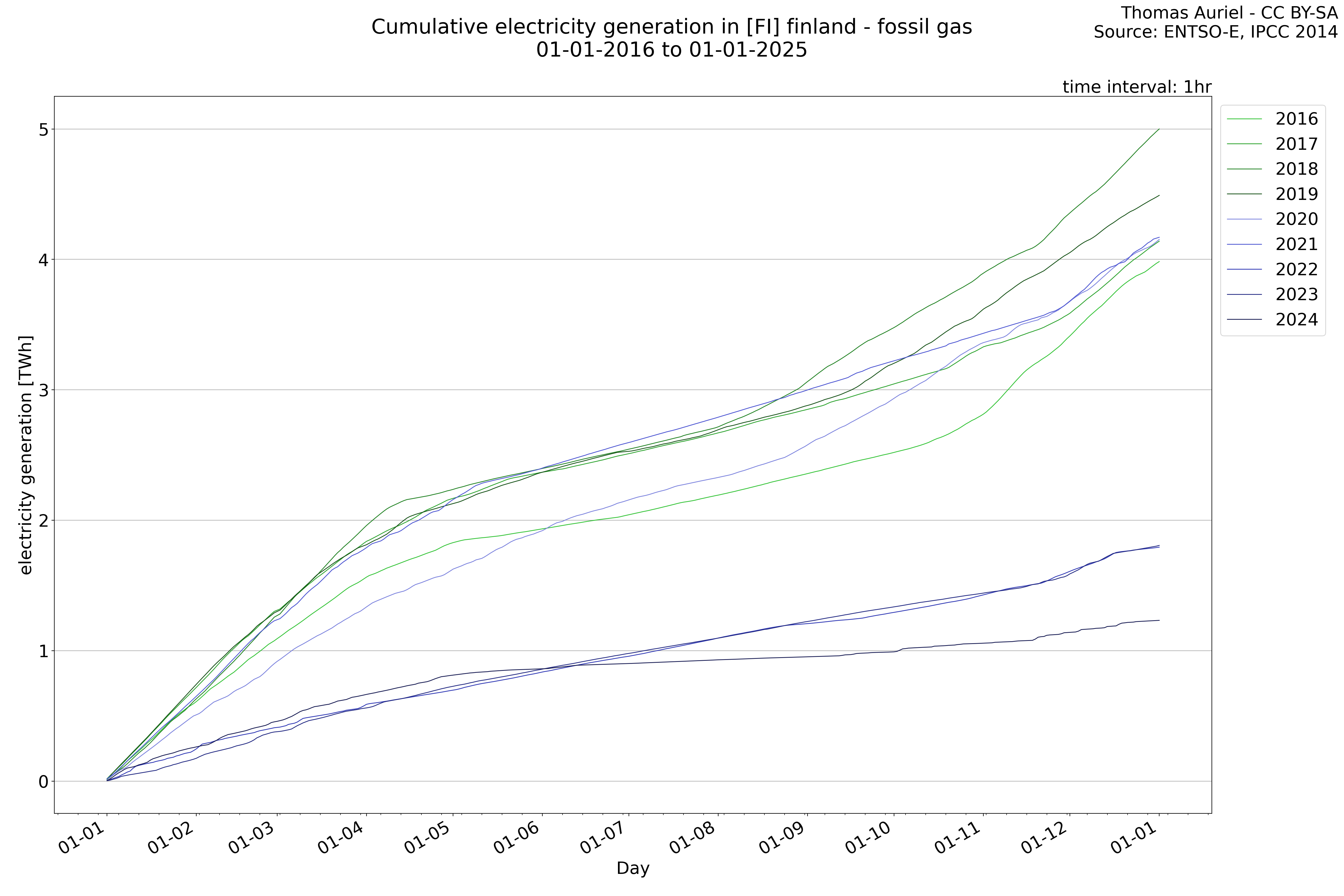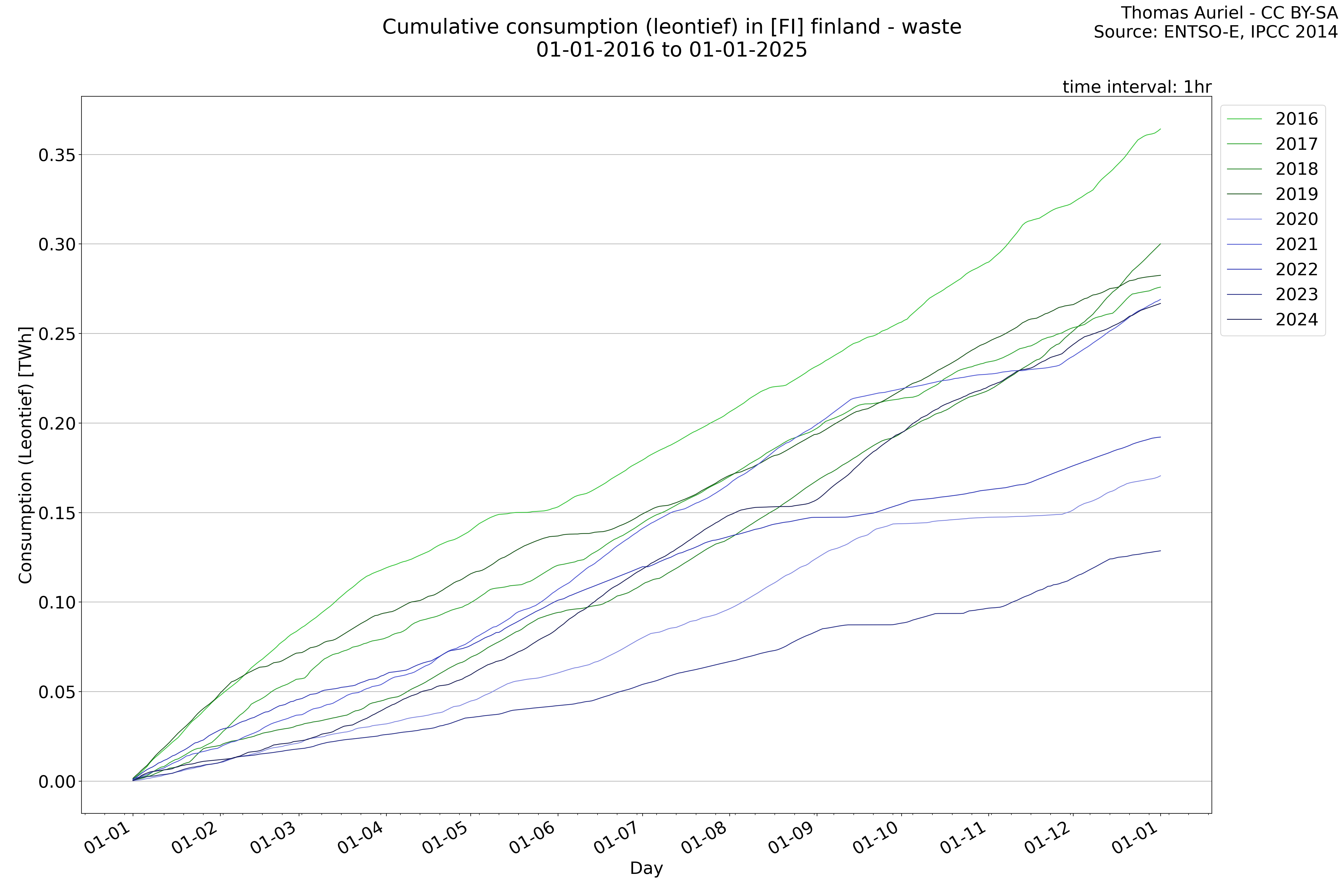 This plot is a cumulative sum plot, where each line represents the cumulative value of a specific metric (e.g., production, load, import, or export) for a given year. The plot begins at zero, and as the year progresses, the cumulative value is updated to reflect the total amount accumulated over time. This visualization illustrates the overall trend of the metric, showing whether the cumulative sum is increasing or decreasing, as well as any changes in the trend within the year. Additionally, the cumulative sum plot helps to reduce the impact of noise and short-term fluctuations commonly present in the raw data of production, load, import, or export. By smoothing out these variations, the plot emphasizes the broader, long-term trends. Consequently, this type of visualization facilitates a clearer understanding of the metric’s evolution across the year, revealing whether the activity follows a steady trajectory, shows signs of volatility, or experiences periods of significant change.