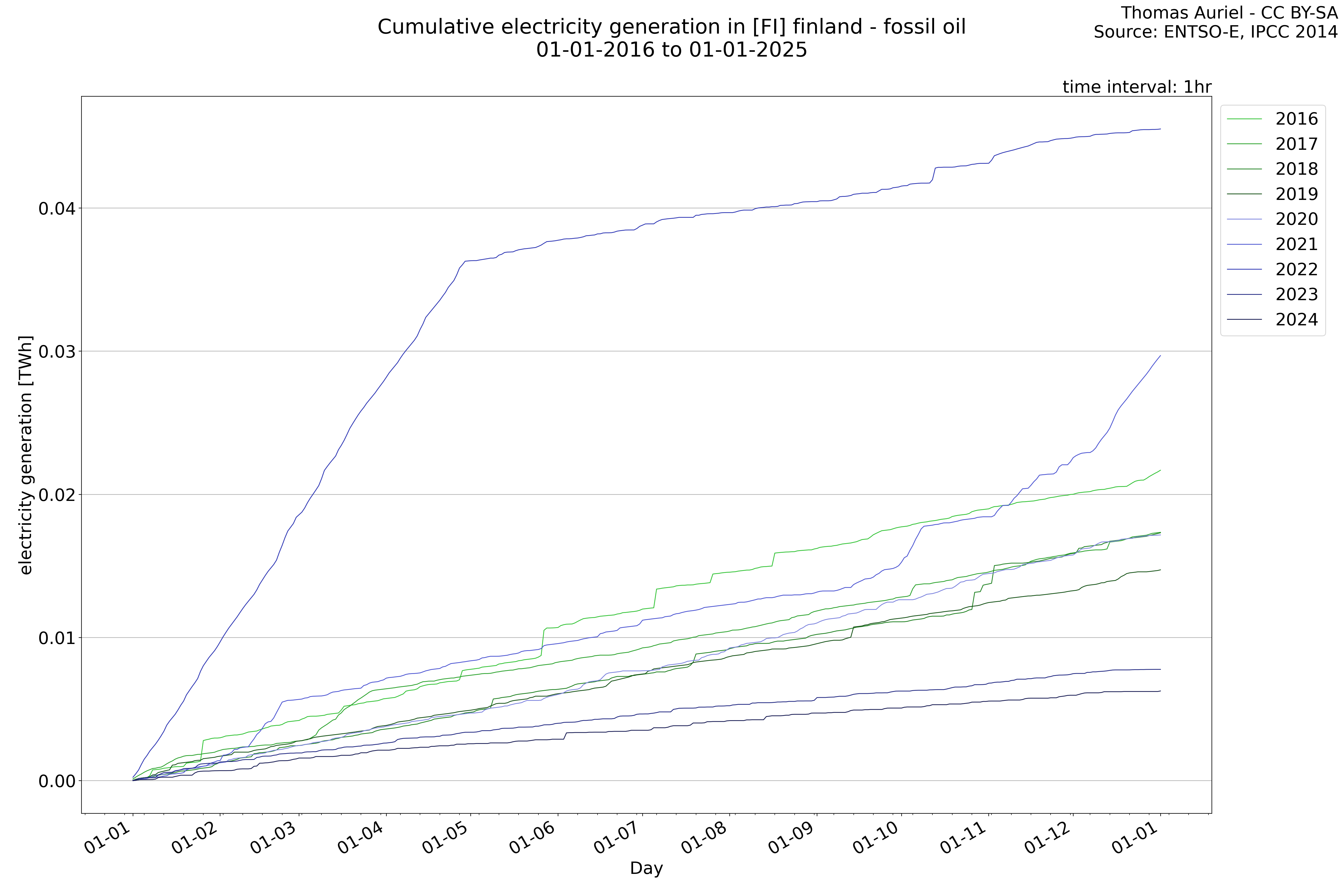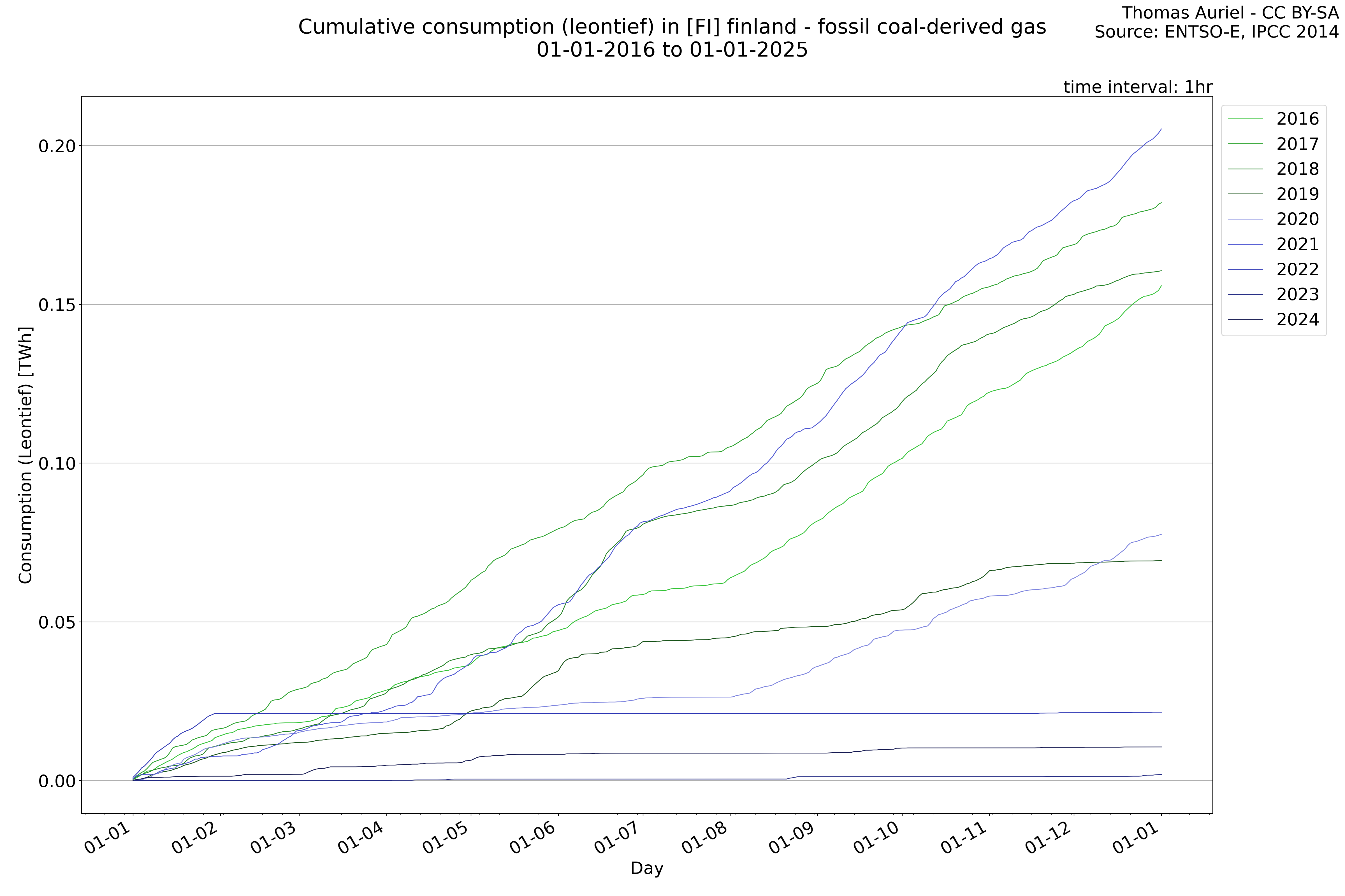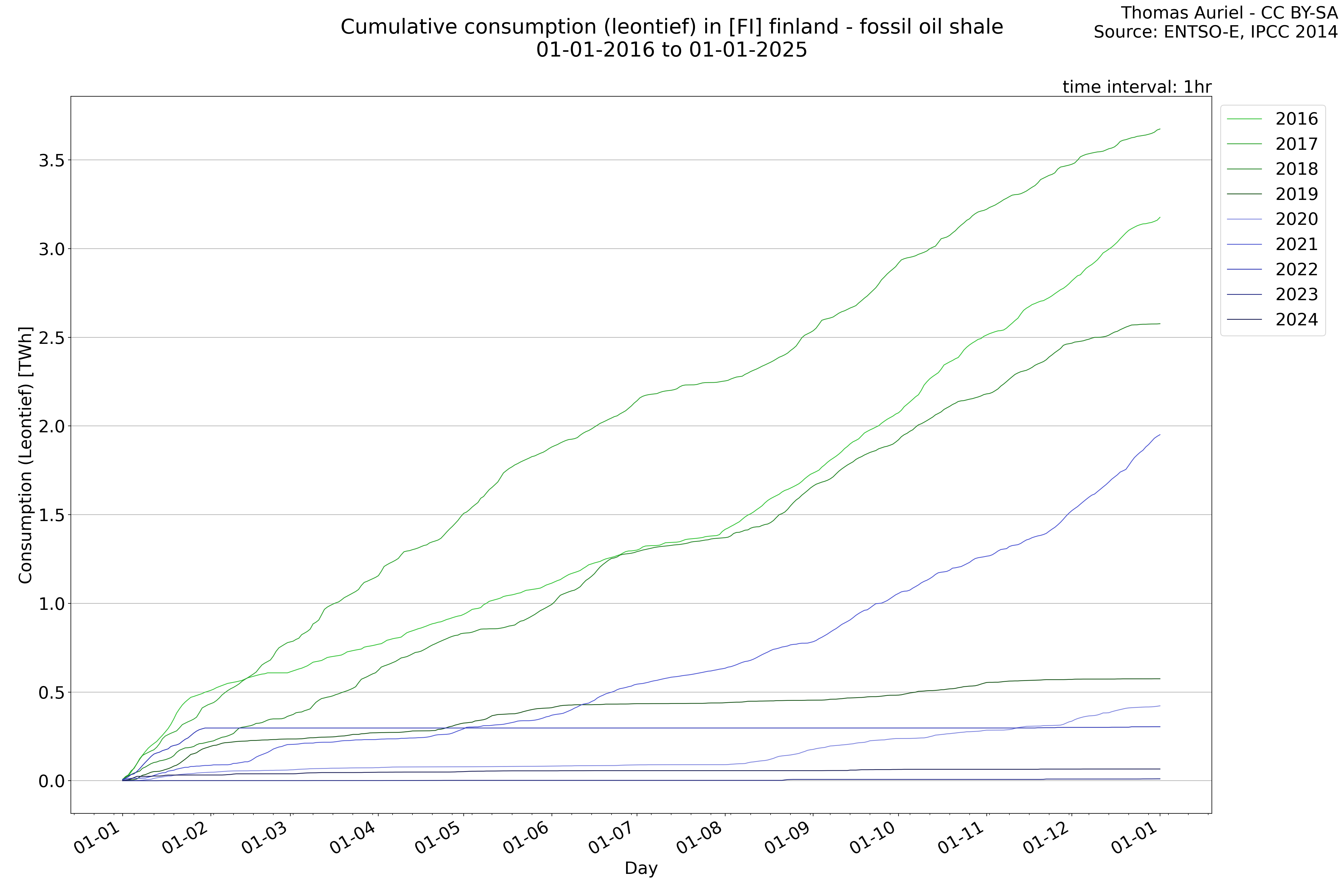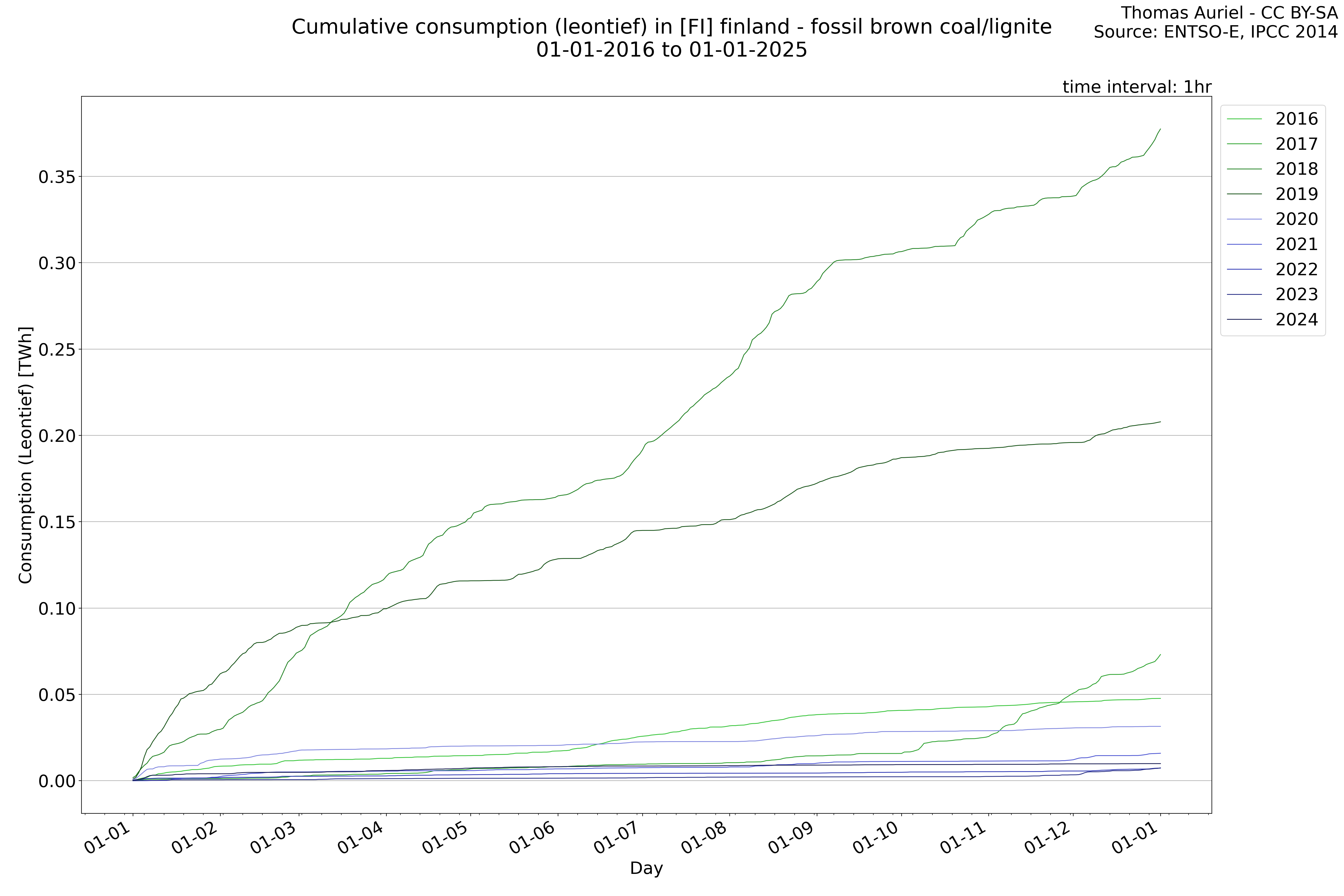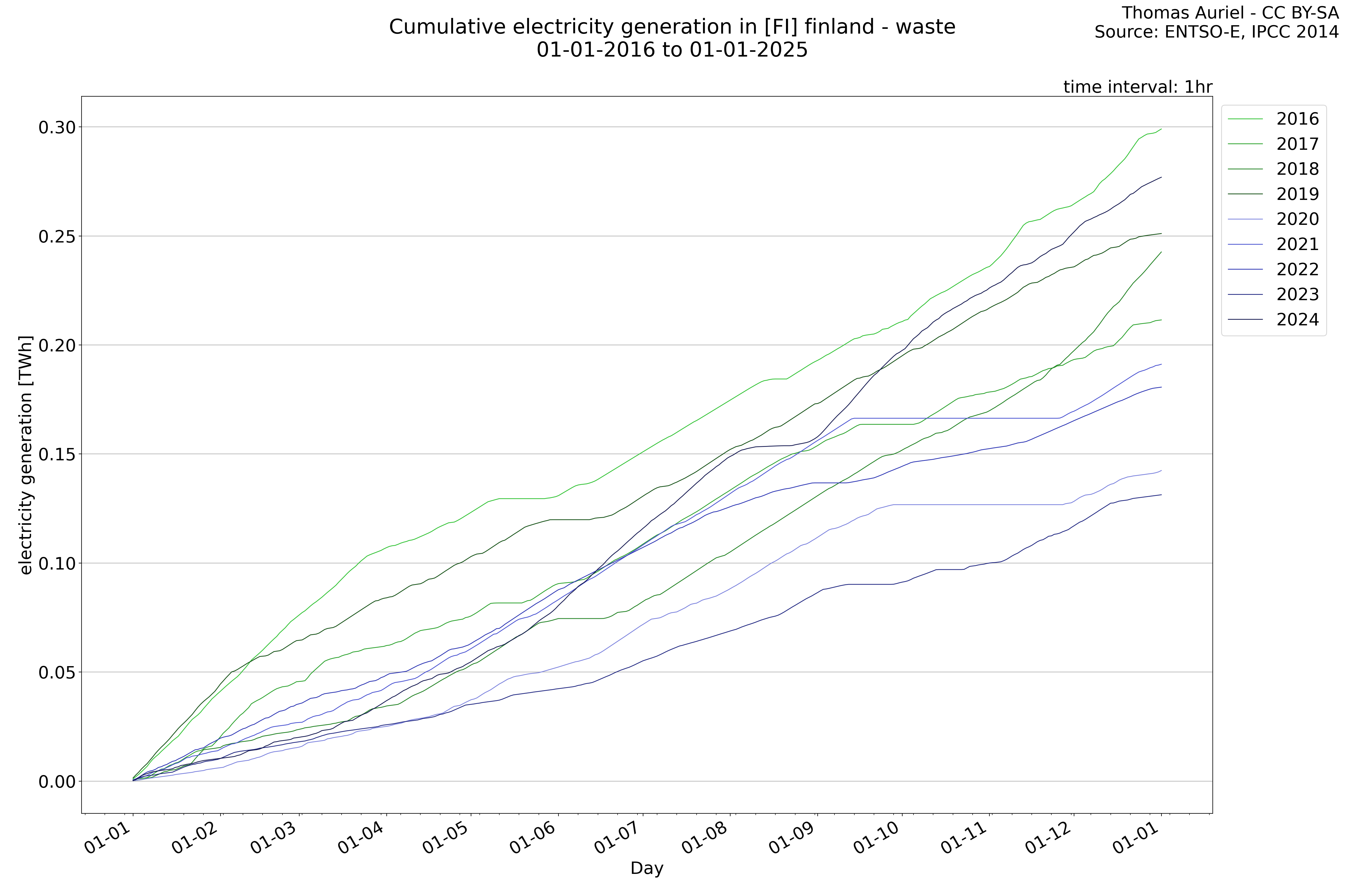 This plot is a cumulative sum plot, where each line represents the cumulative value of a specific metric (e.g., production, load, import, or export) for a given year. The plot begins at zero, and as the year progresses, the cumulative value is updated to reflect the total amount accumulated over time. This visualization illustrates the overall trend of the metric, showing whether the cumulative sum is increasing or decreasing, as well as any changes in the trend within the year. Additionally, the cumulative sum plot helps to reduce the impact of noise and short-term fluctuations commonly present in the raw data of production, load, import, or export. By smoothing out these variations, the plot emphasizes the broader, long-term trends. Consequently, this type of visualization facilitates a clearer understanding of the metric’s evolution across the year, revealing whether the activity follows a steady trajectory, shows signs of volatility, or experiences periods of significant change.