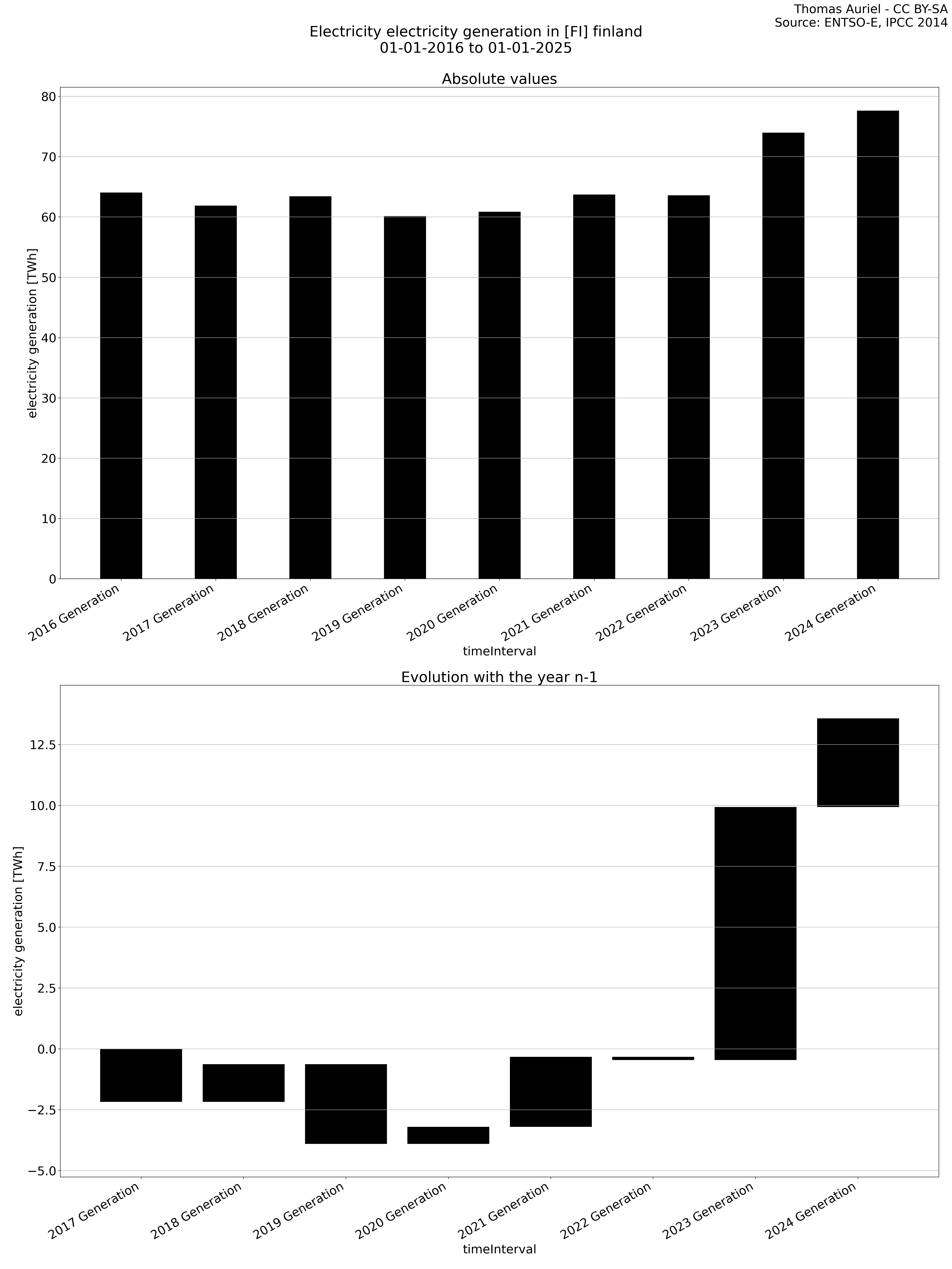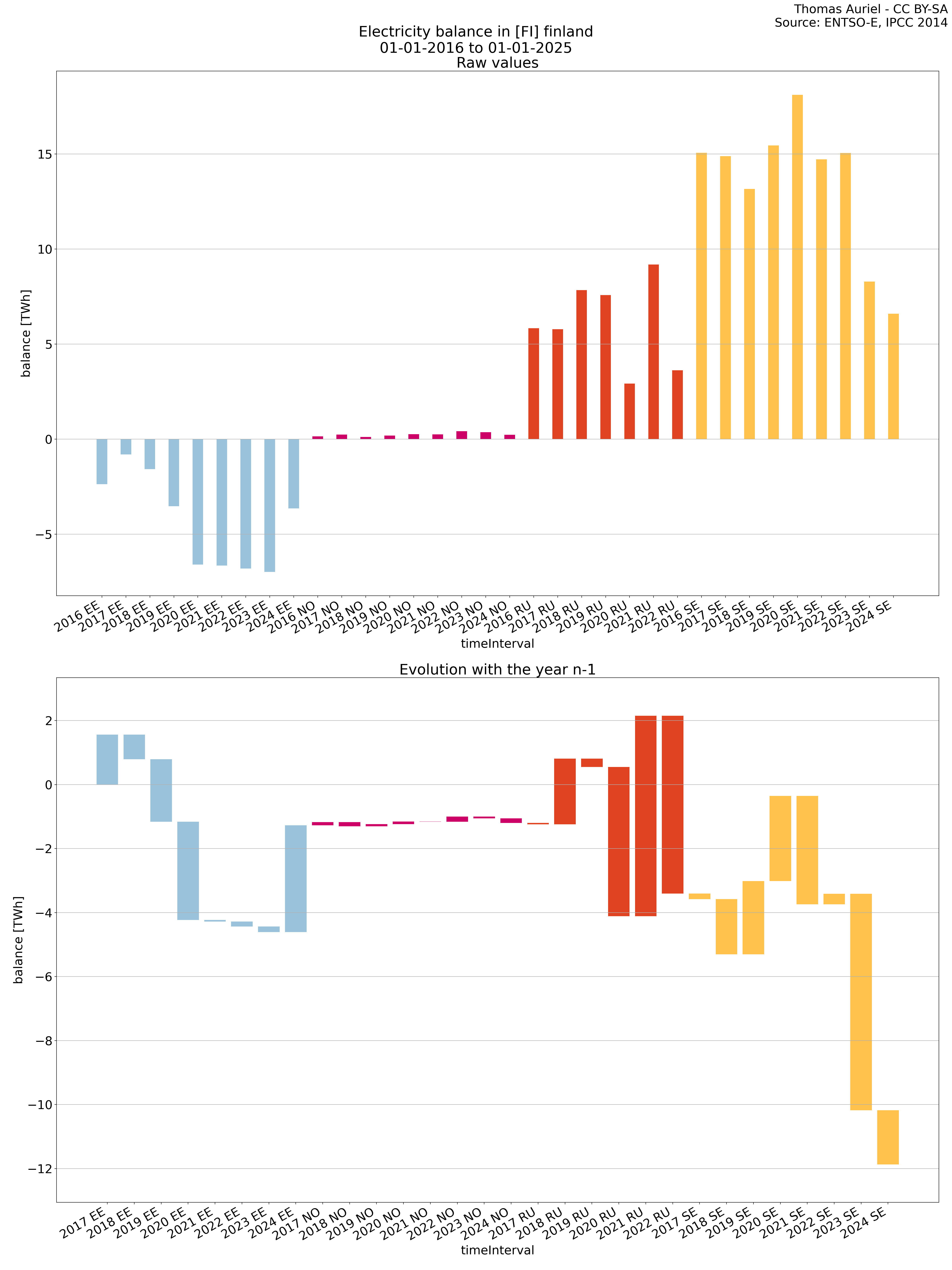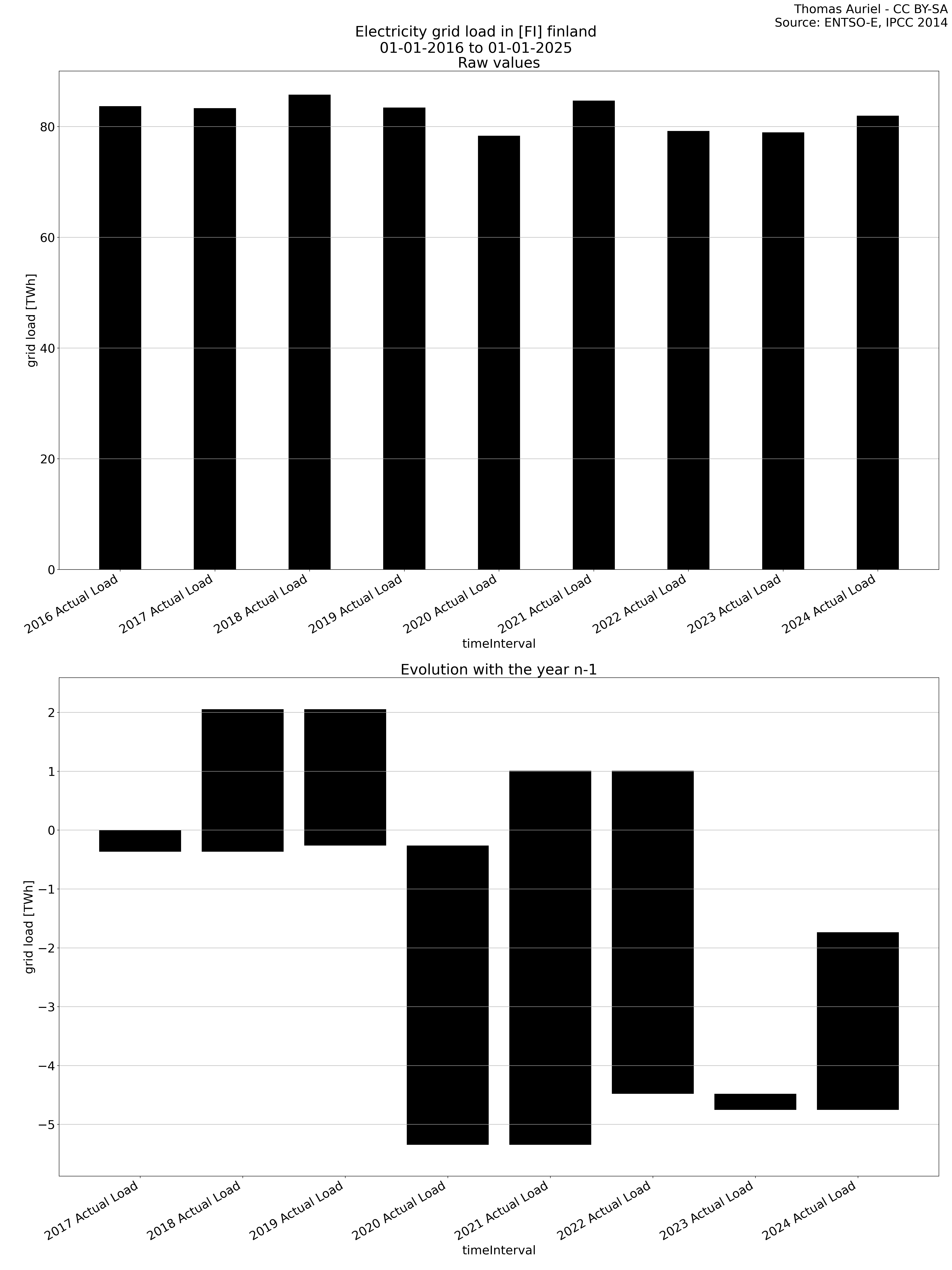 The second section features a waterfall graph, which visually represents the year-over-year changes in electricity metrics. In this graph, the length of each bar corresponds to the difference in the metric (e.g., production, load, etc.) compared to the previous year. Unlike the bar plot, the bars in the waterfall graph do not start at zero; instead, each bar begins where the previous one ended. Hence, this structure emphasizes the incremental changes in the metric over time, facilitating the visualization of fluctuations from one year to the next.