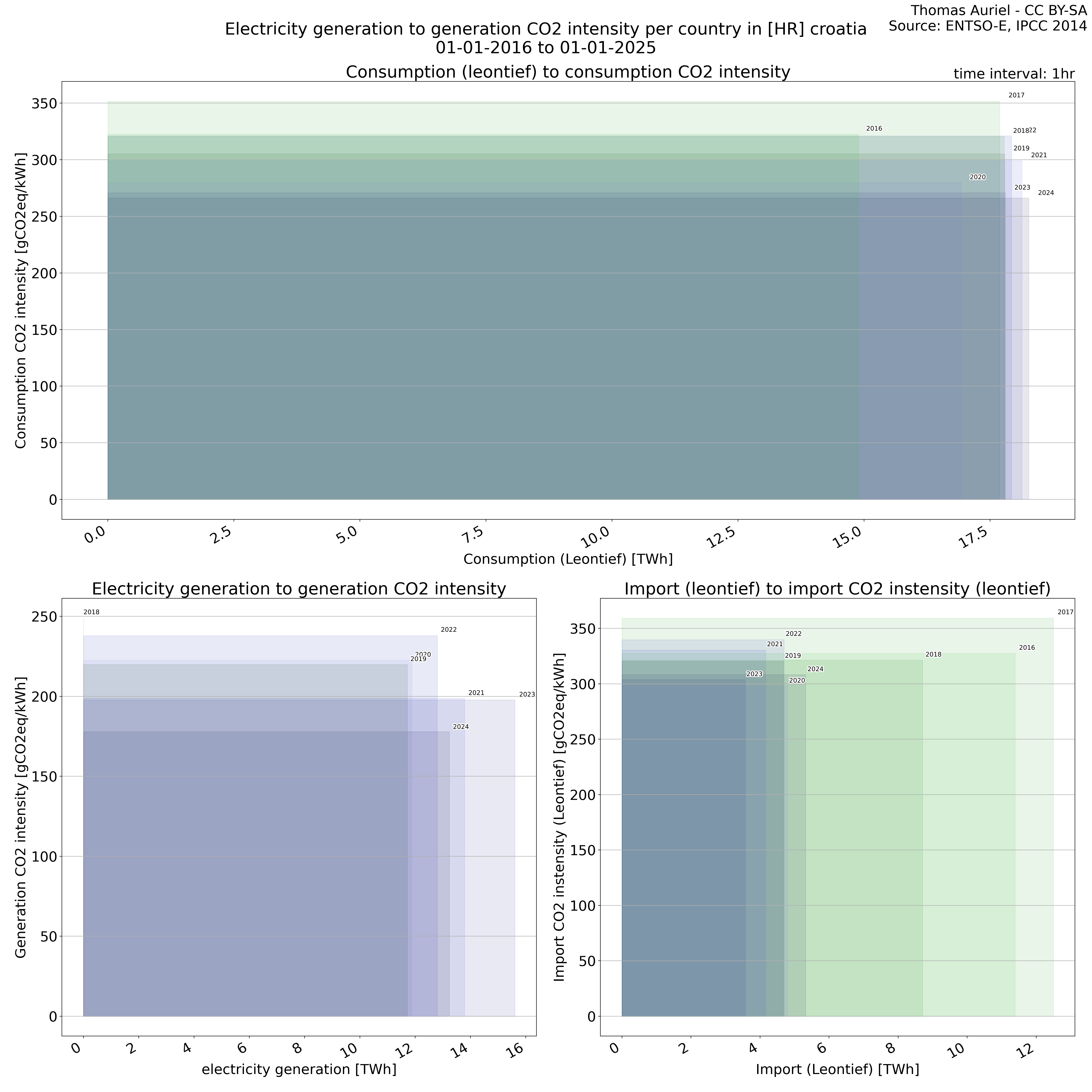 The plot consists of squares, each representing a single year, designed to illustrate electricity-related metrics and their associated environmental impacts. The length of each square corresponds to the total electricity consumption, generation, or imports during the year, with longer squares indicating higher overall values for the respective metric. The height of each square represents the average CO₂ intensity (e.g., grams of CO₂ per kWh) associated with electricity consumption, generation, or imports; hence, taller squares signify greater environmental impact per unit of electricity. Finally, the surface area of each square, determined by the product of its length and height, represents the total CO₂ emissions associated with the respective activity in the given year.