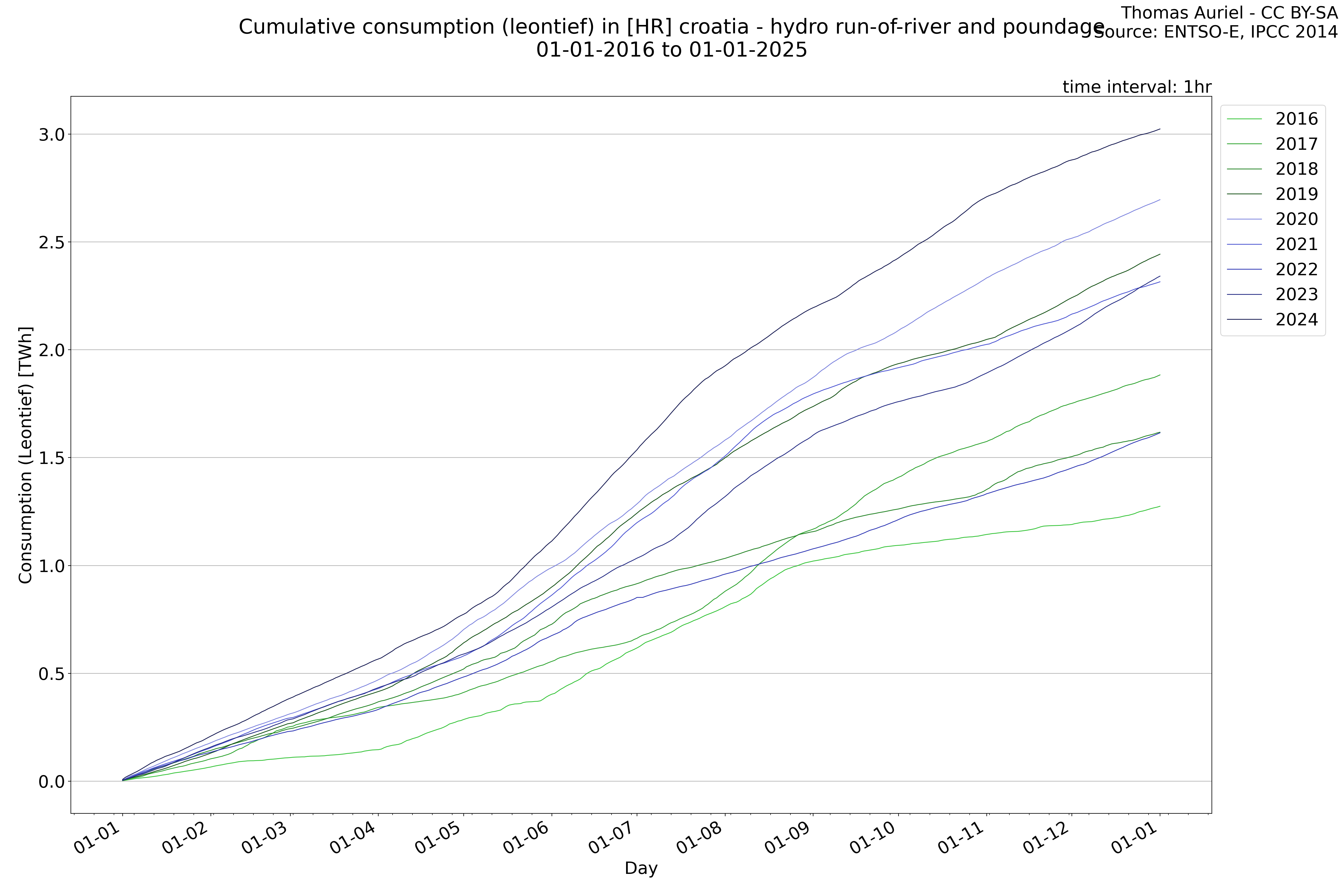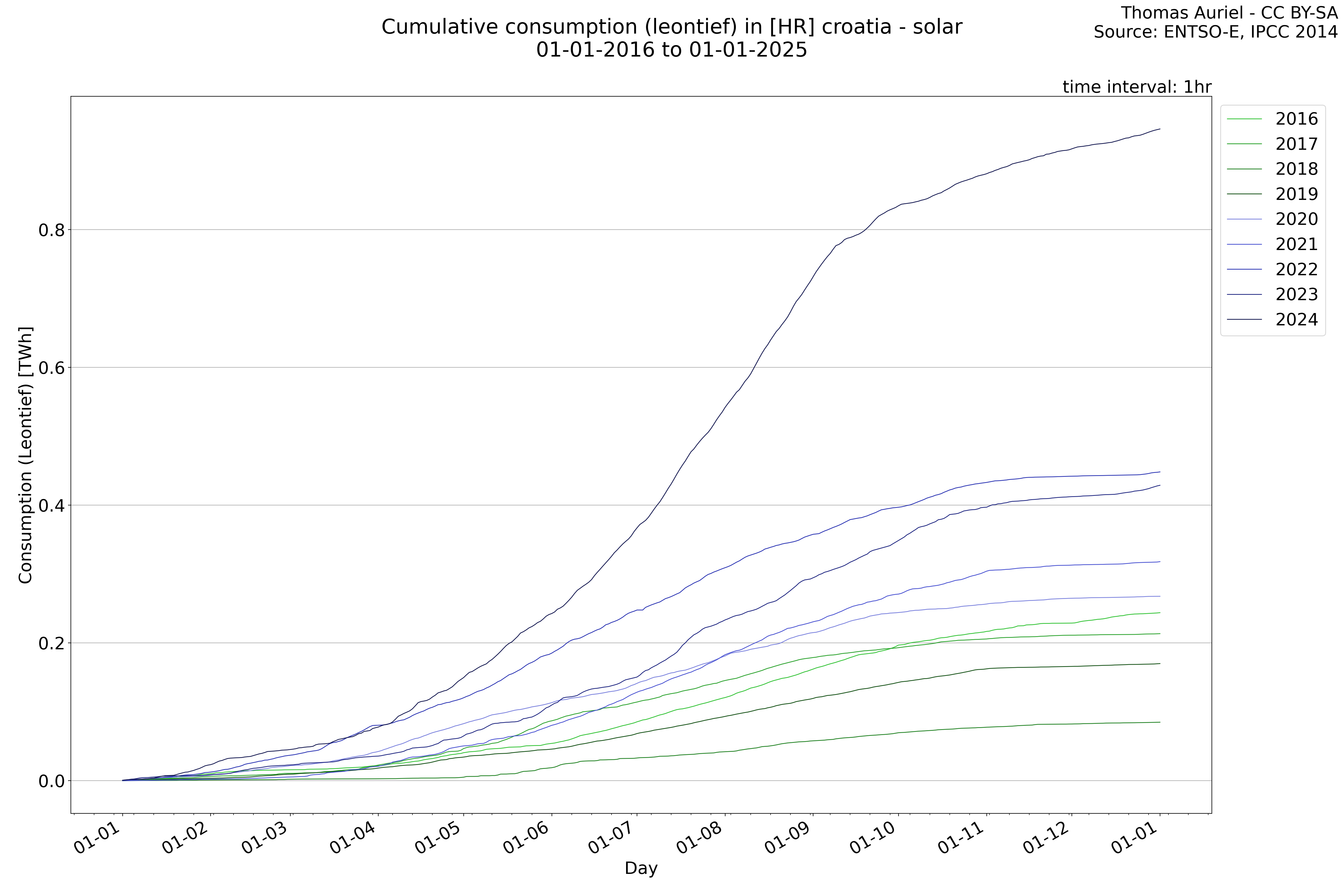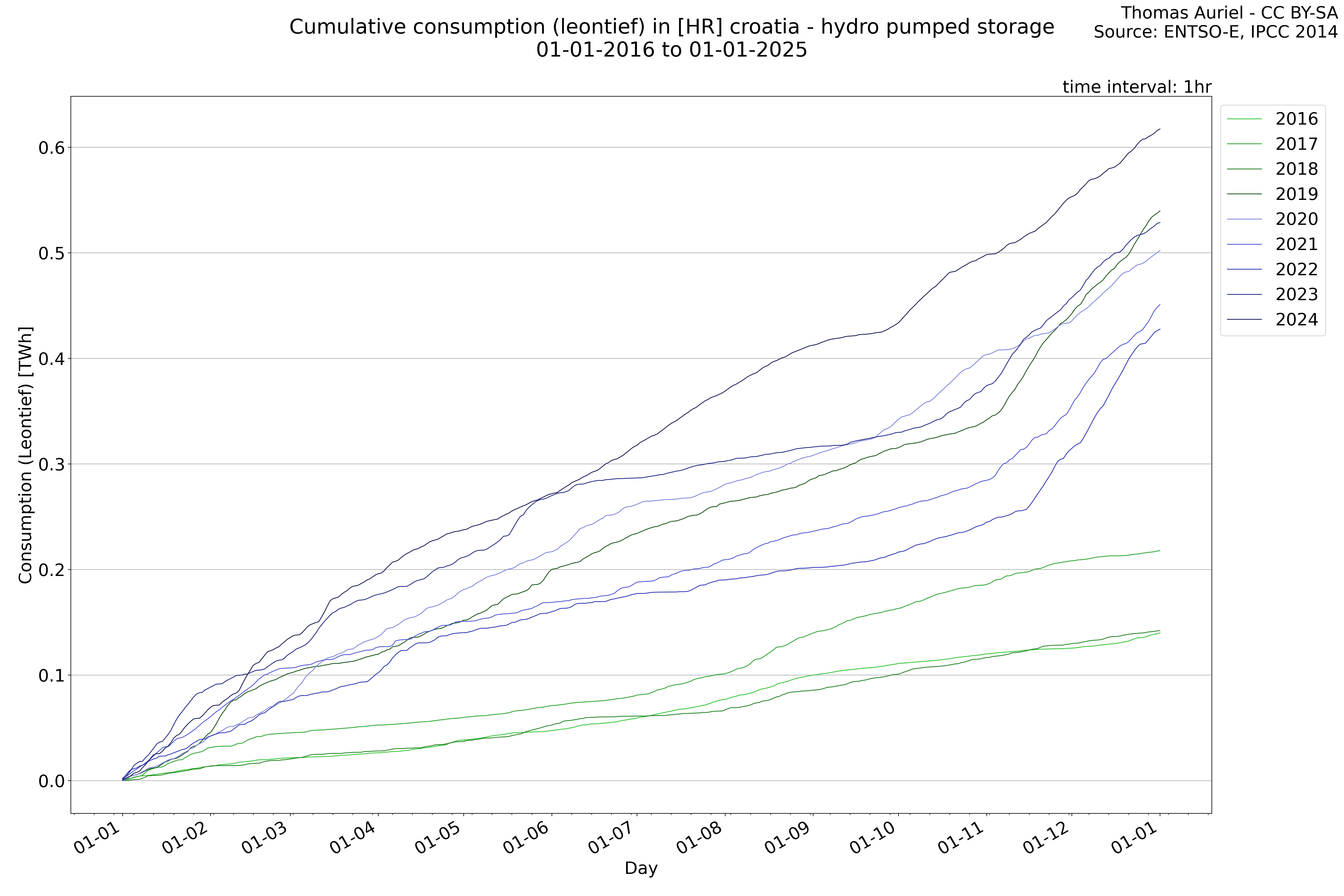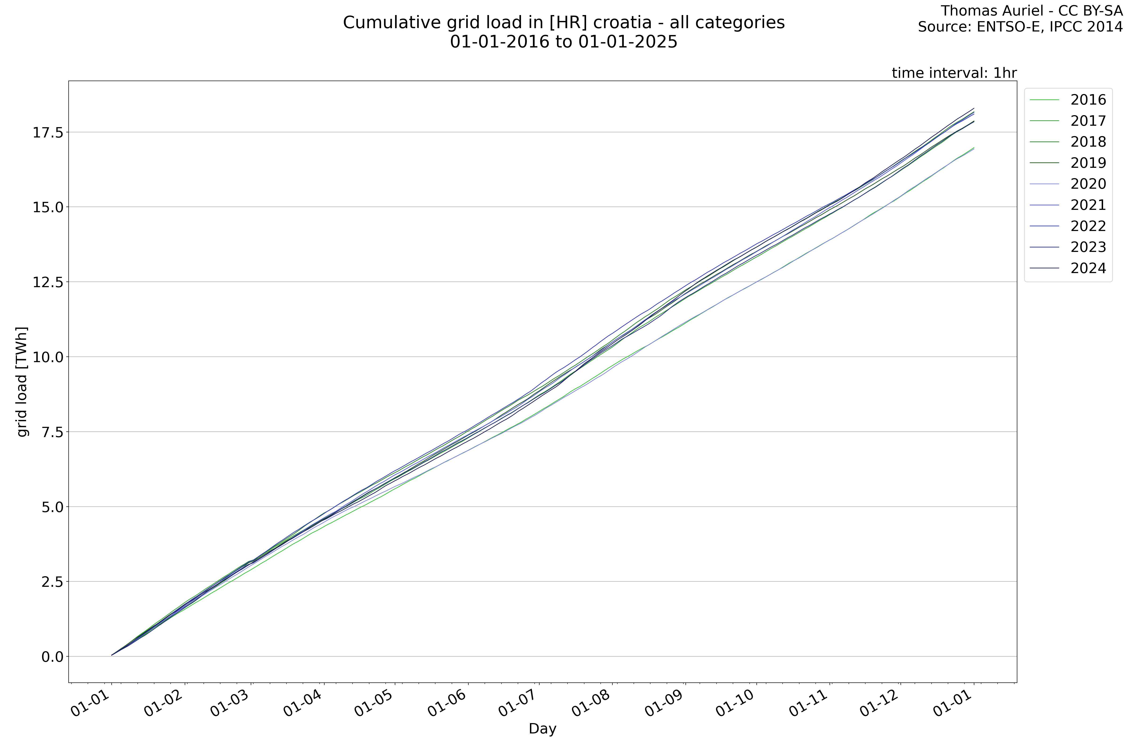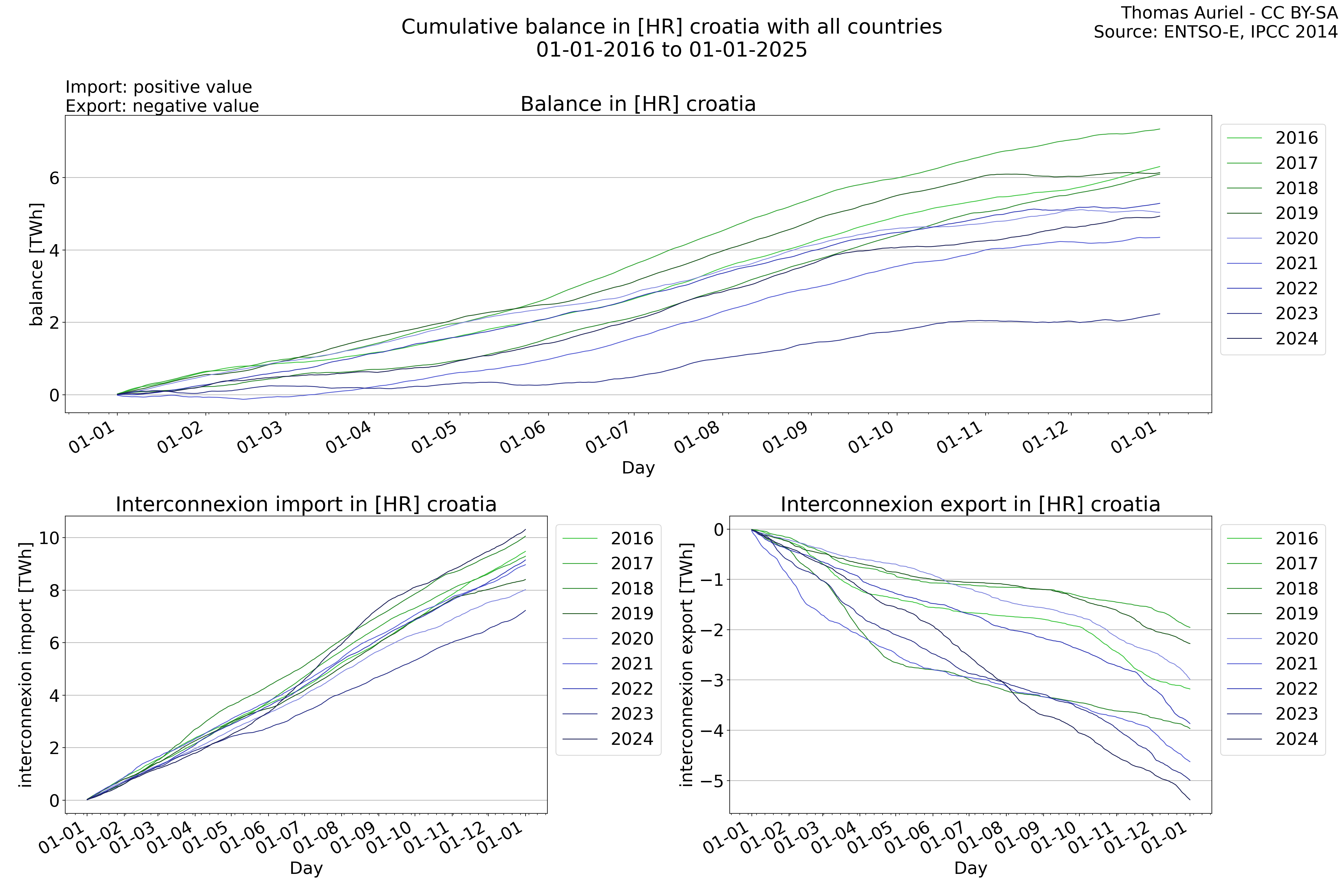 This plot is a cumulative sum plot, where each line represents the cumulative value of a specific metric (e.g., production, load, import, or export) for a given year. The plot begins at zero, and as the year progresses, the cumulative value is updated to reflect the total amount accumulated over time. This visualization illustrates the overall trend of the metric, showing whether the cumulative sum is increasing or decreasing, as well as any changes in the trend within the year. Additionally, the cumulative sum plot helps to reduce the impact of noise and short-term fluctuations commonly present in the raw data of production, load, import, or export. By smoothing out these variations, the plot emphasizes the broader, long-term trends. Consequently, this type of visualization facilitates a clearer understanding of the metric’s evolution across the year, revealing whether the activity follows a steady trajectory, shows signs of volatility, or experiences periods of significant change.
