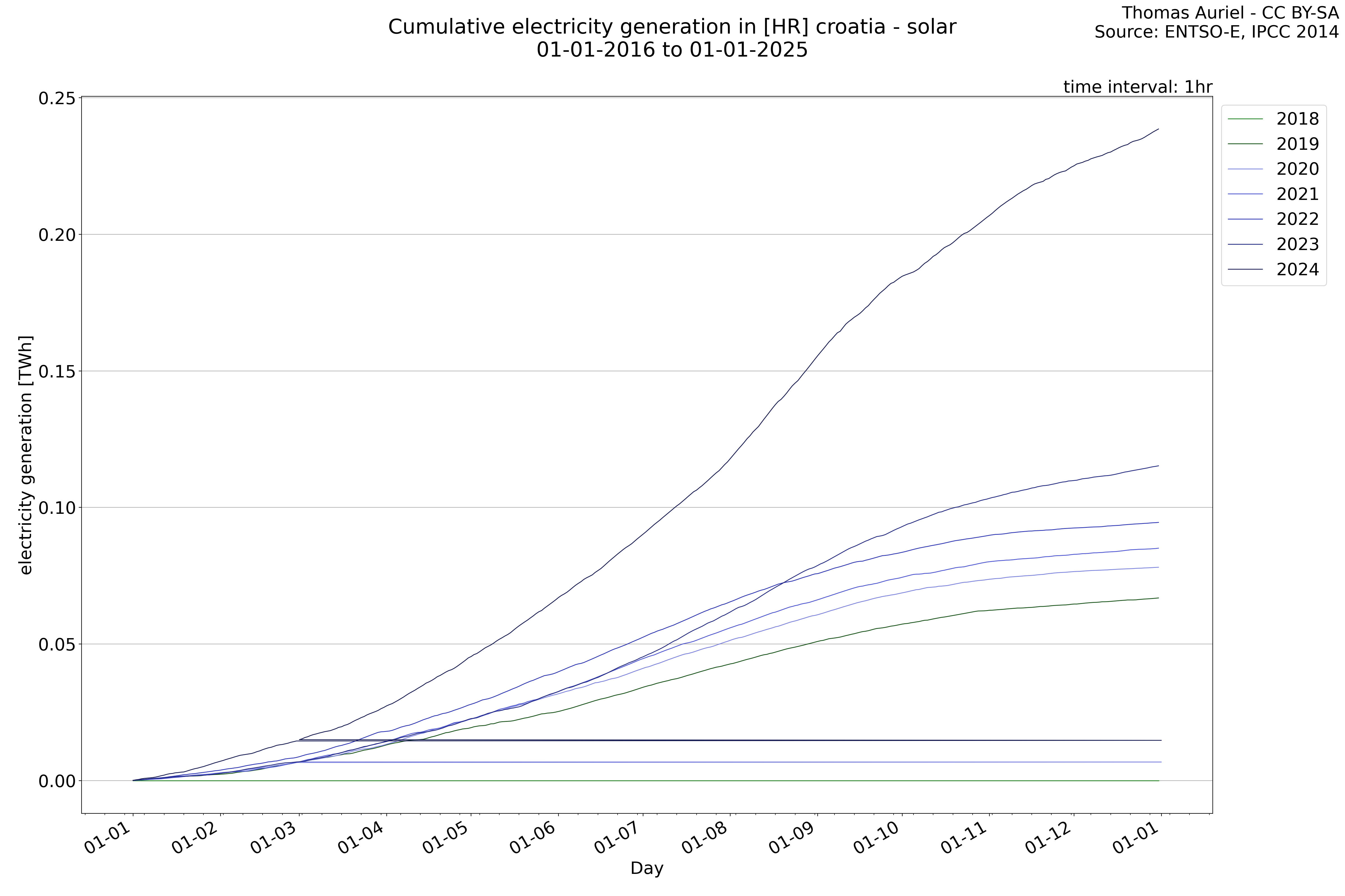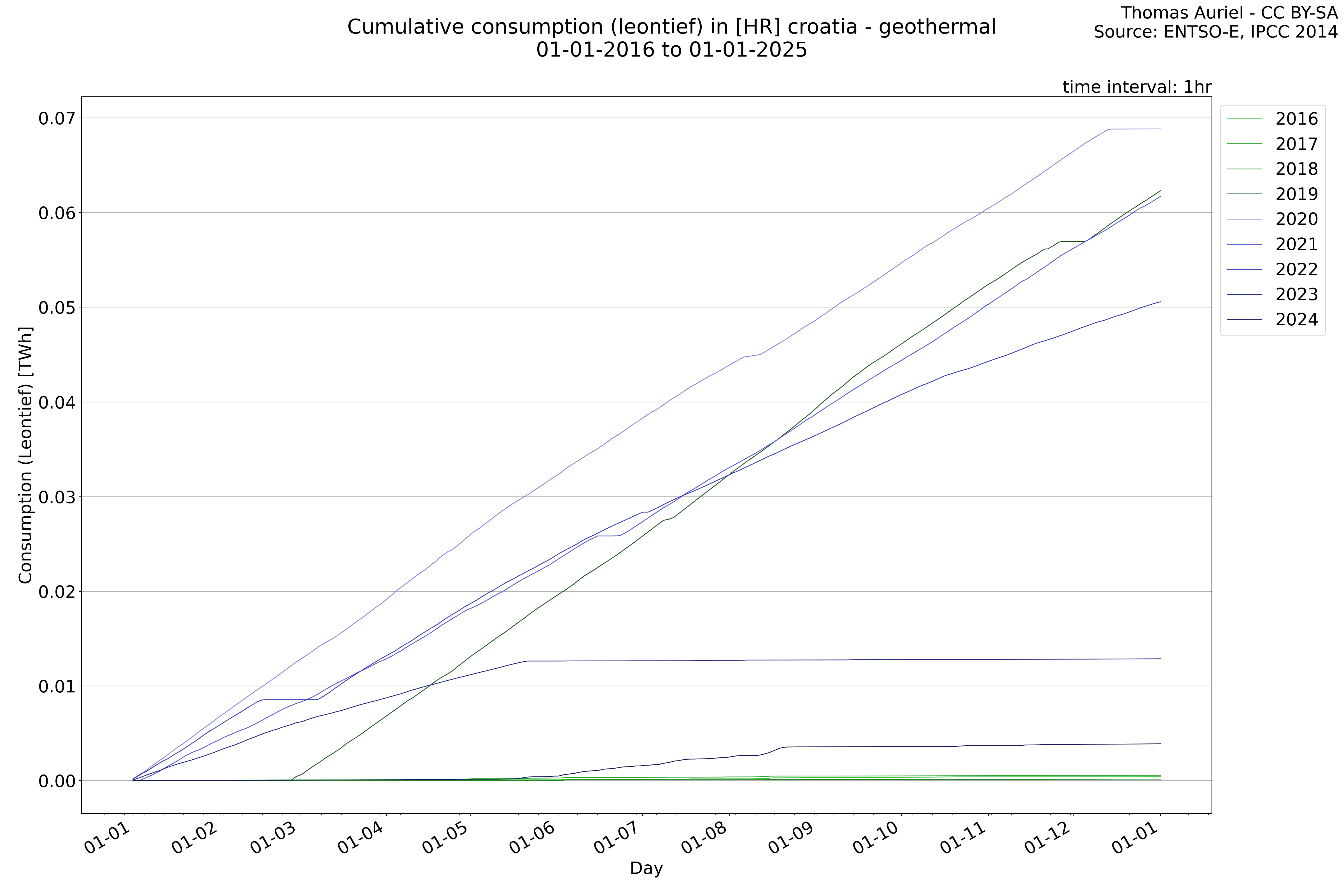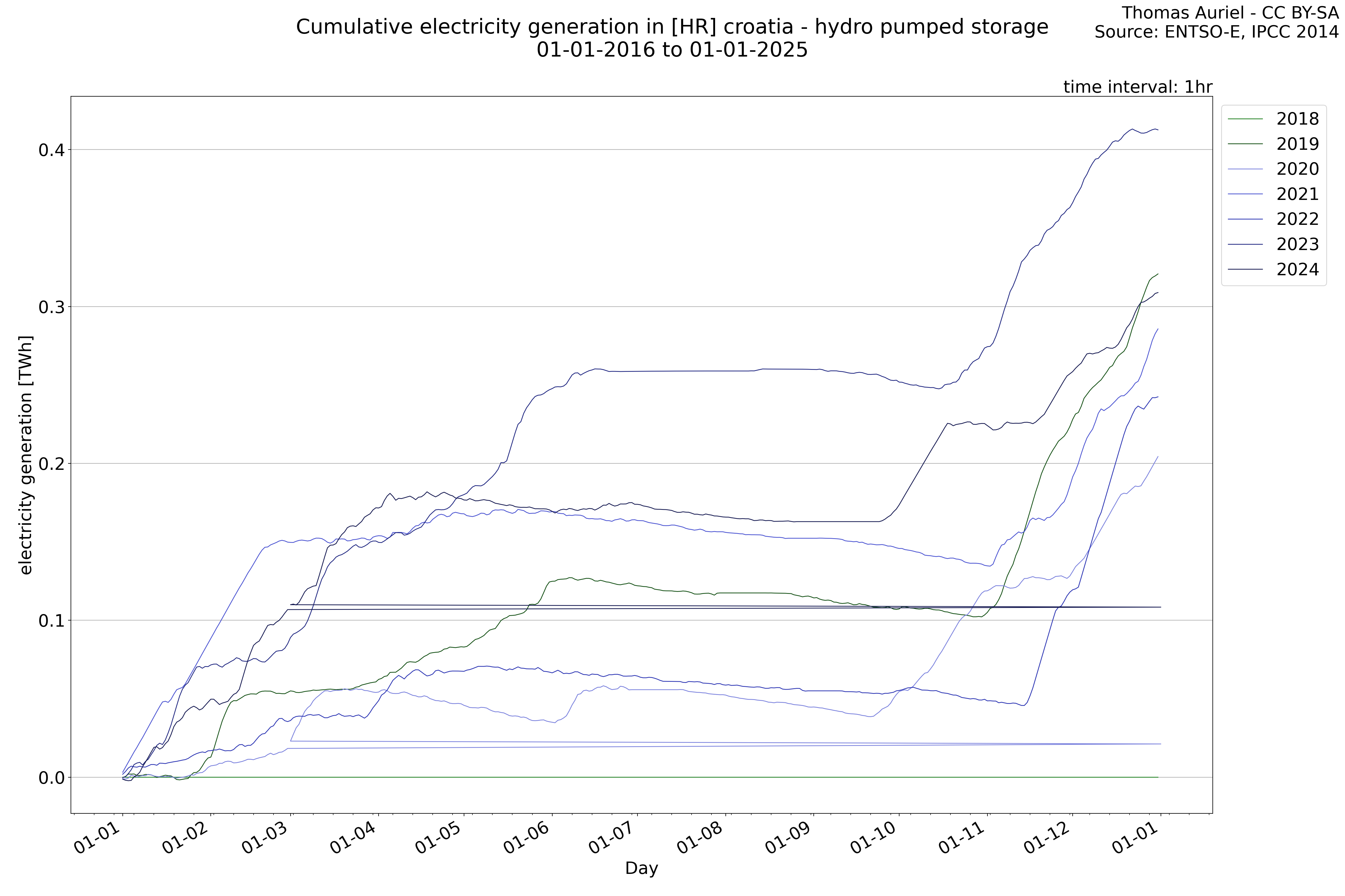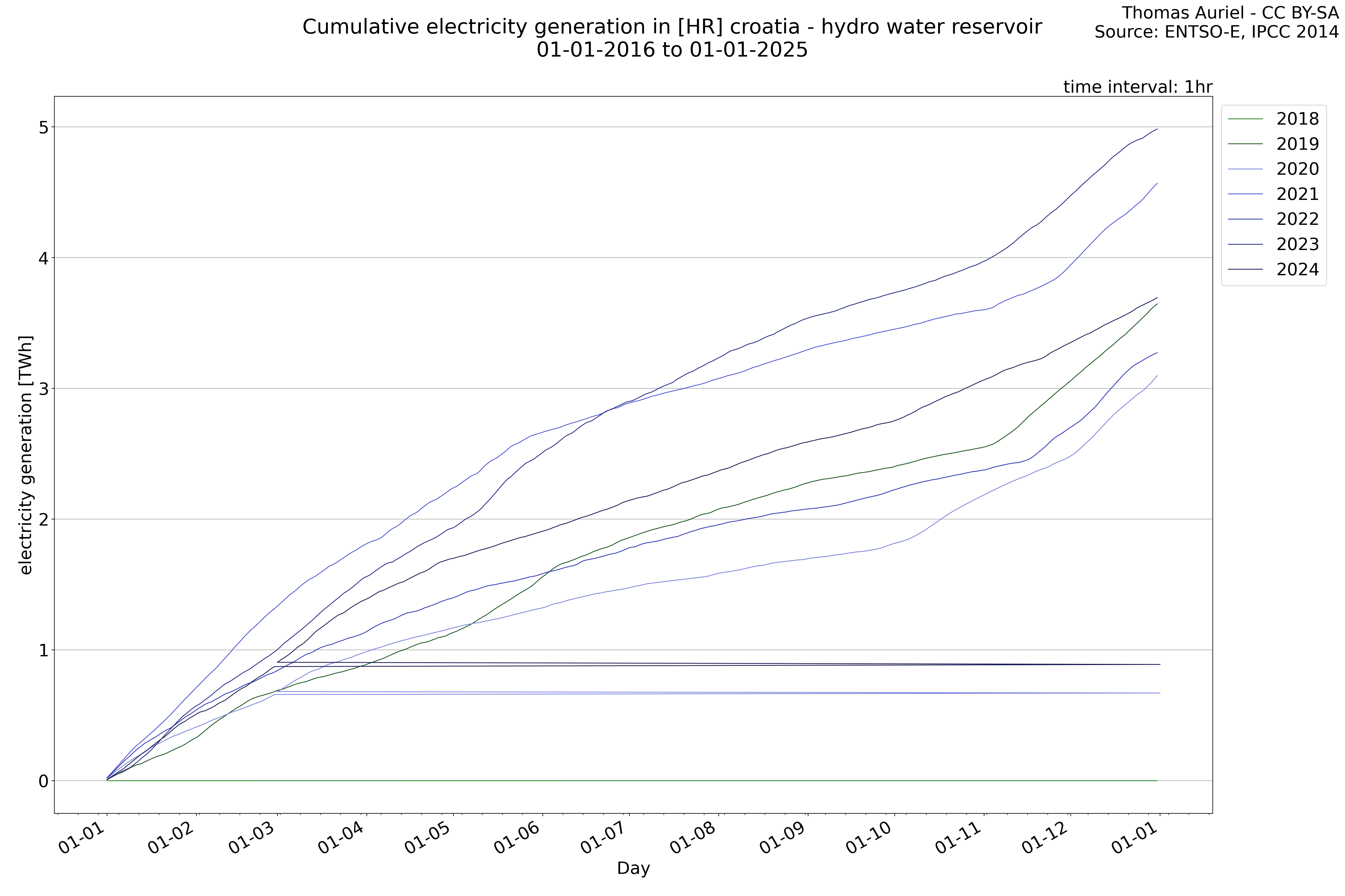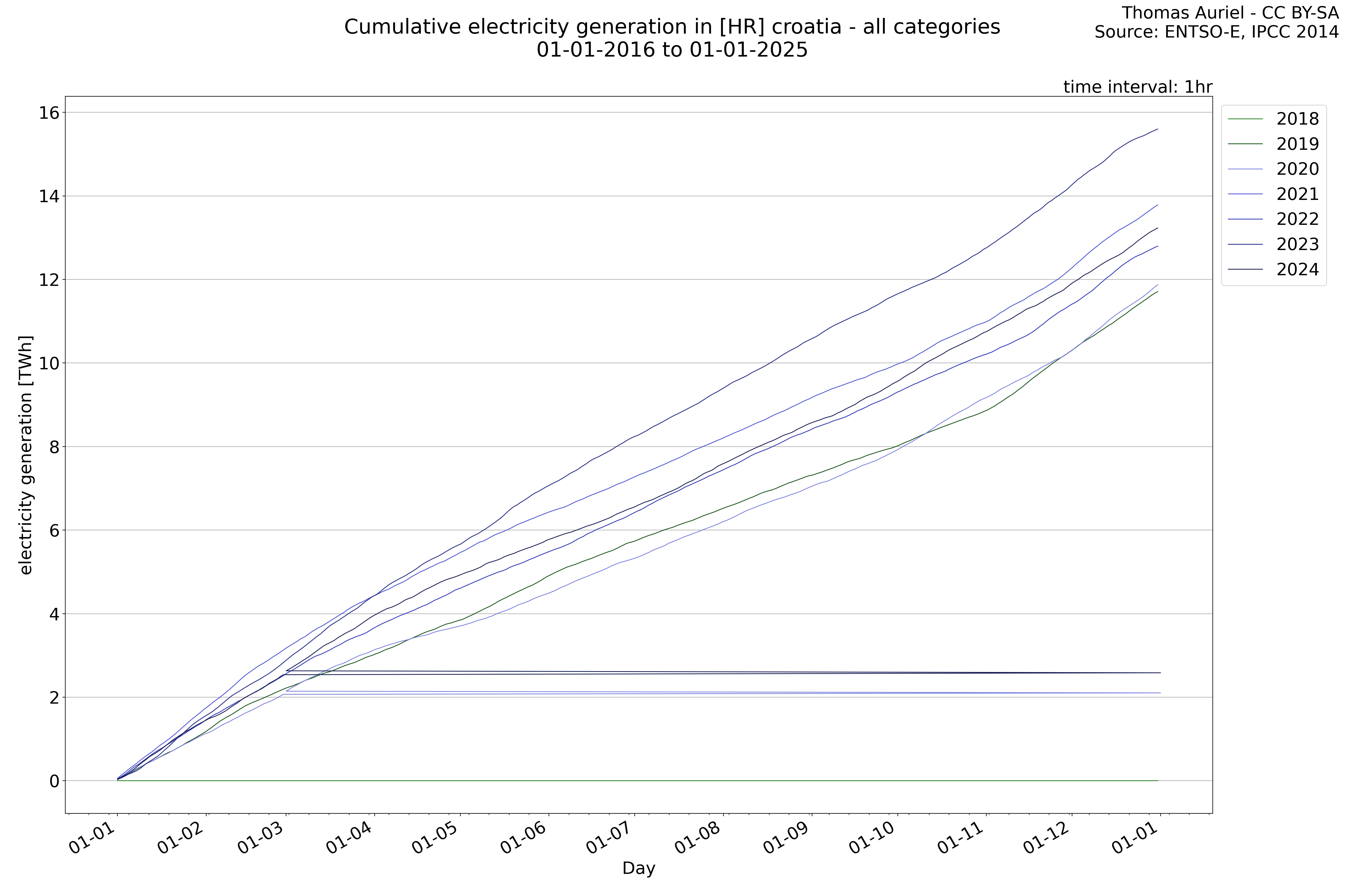 This plot is a cumulative sum plot, where each line represents the cumulative value of a specific metric (e.g., production, load, import, or export) for a given year. The plot begins at zero, and as the year progresses, the cumulative value is updated to reflect the total amount accumulated over time. This visualization illustrates the overall trend of the metric, showing whether the cumulative sum is increasing or decreasing, as well as any changes in the trend within the year. Additionally, the cumulative sum plot helps to reduce the impact of noise and short-term fluctuations commonly present in the raw data of production, load, import, or export. By smoothing out these variations, the plot emphasizes the broader, long-term trends. Consequently, this type of visualization facilitates a clearer understanding of the metric’s evolution across the year, revealing whether the activity follows a steady trajectory, shows signs of volatility, or experiences periods of significant change.