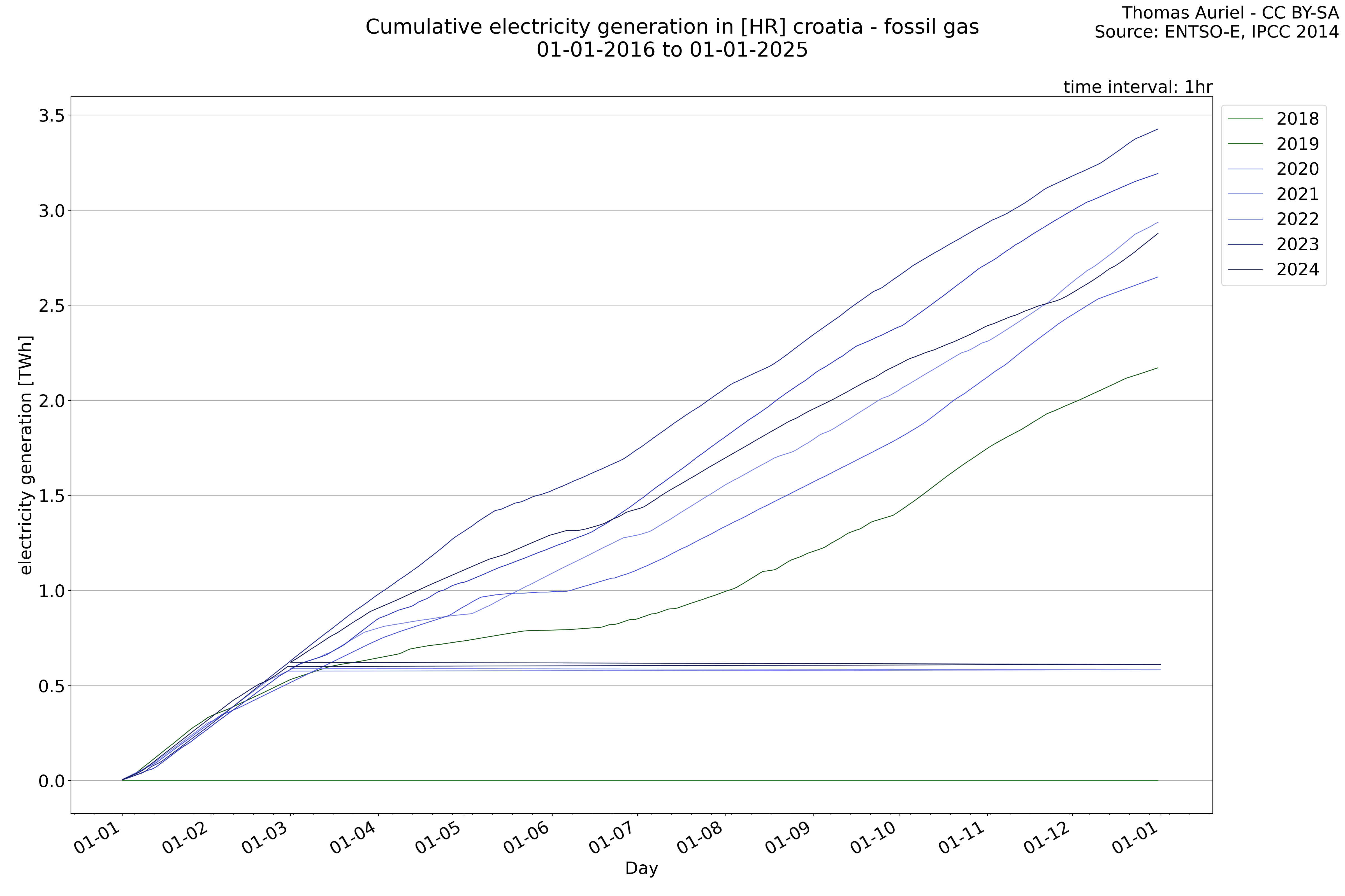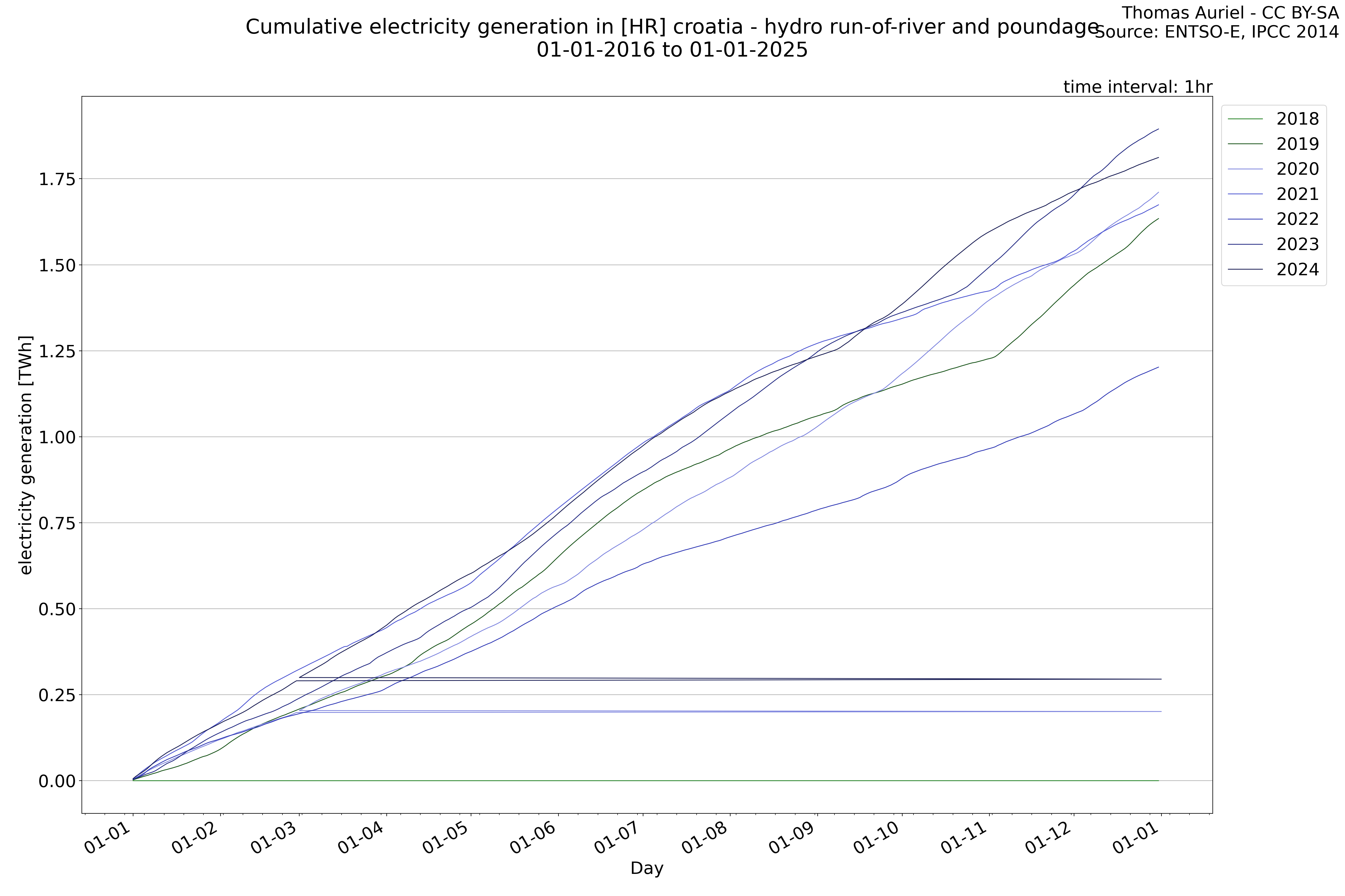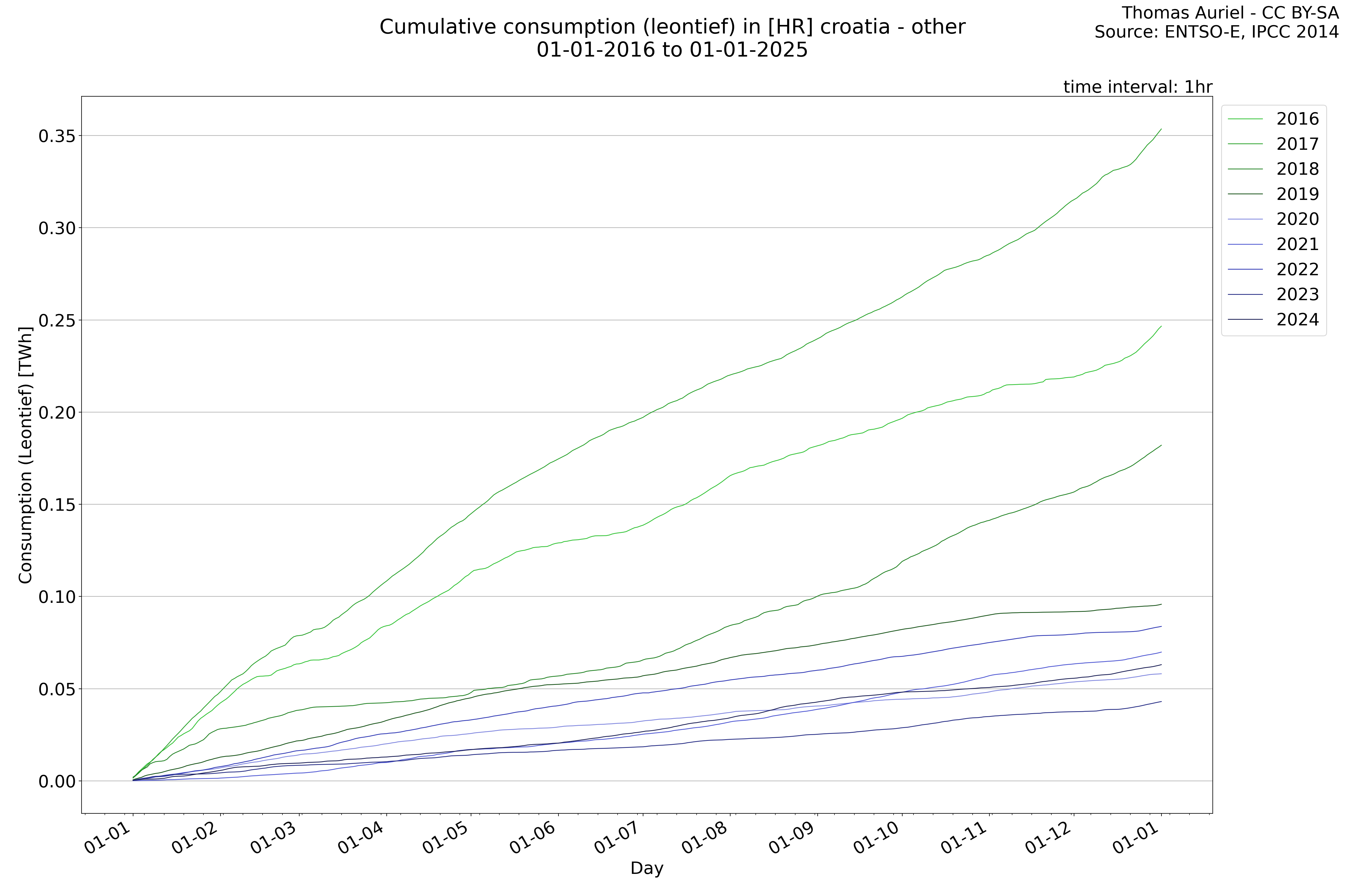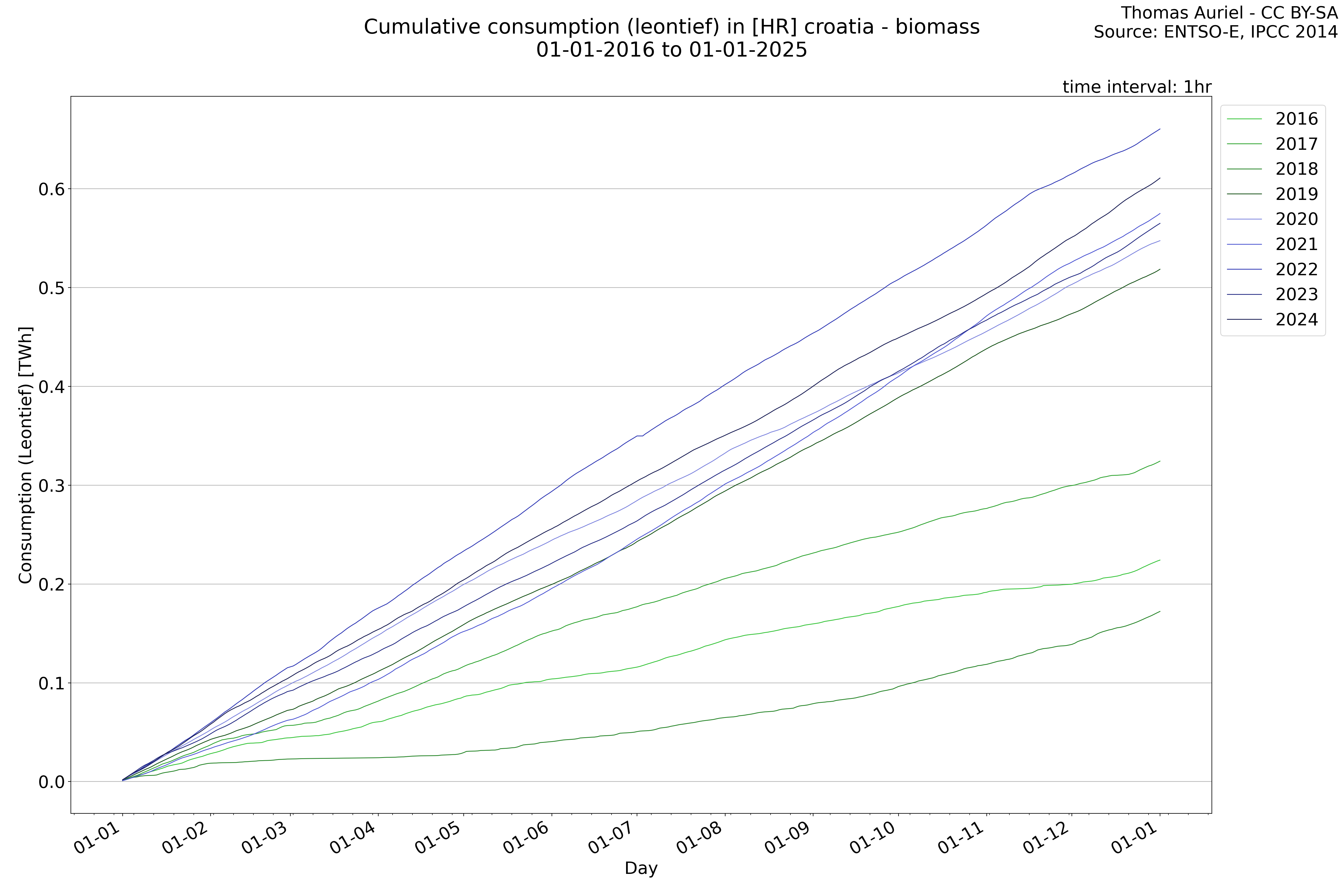 This plot is a cumulative sum plot, where each line represents the cumulative value of a specific metric (e.g., production, load, import, or export) for a given year. The plot begins at zero, and as the year progresses, the cumulative value is updated to reflect the total amount accumulated over time. This visualization illustrates the overall trend of the metric, showing whether the cumulative sum is increasing or decreasing, as well as any changes in the trend within the year. Additionally, the cumulative sum plot helps to reduce the impact of noise and short-term fluctuations commonly present in the raw data of production, load, import, or export. By smoothing out these variations, the plot emphasizes the broader, long-term trends. Consequently, this type of visualization facilitates a clearer understanding of the metric’s evolution across the year, revealing whether the activity follows a steady trajectory, shows signs of volatility, or experiences periods of significant change.