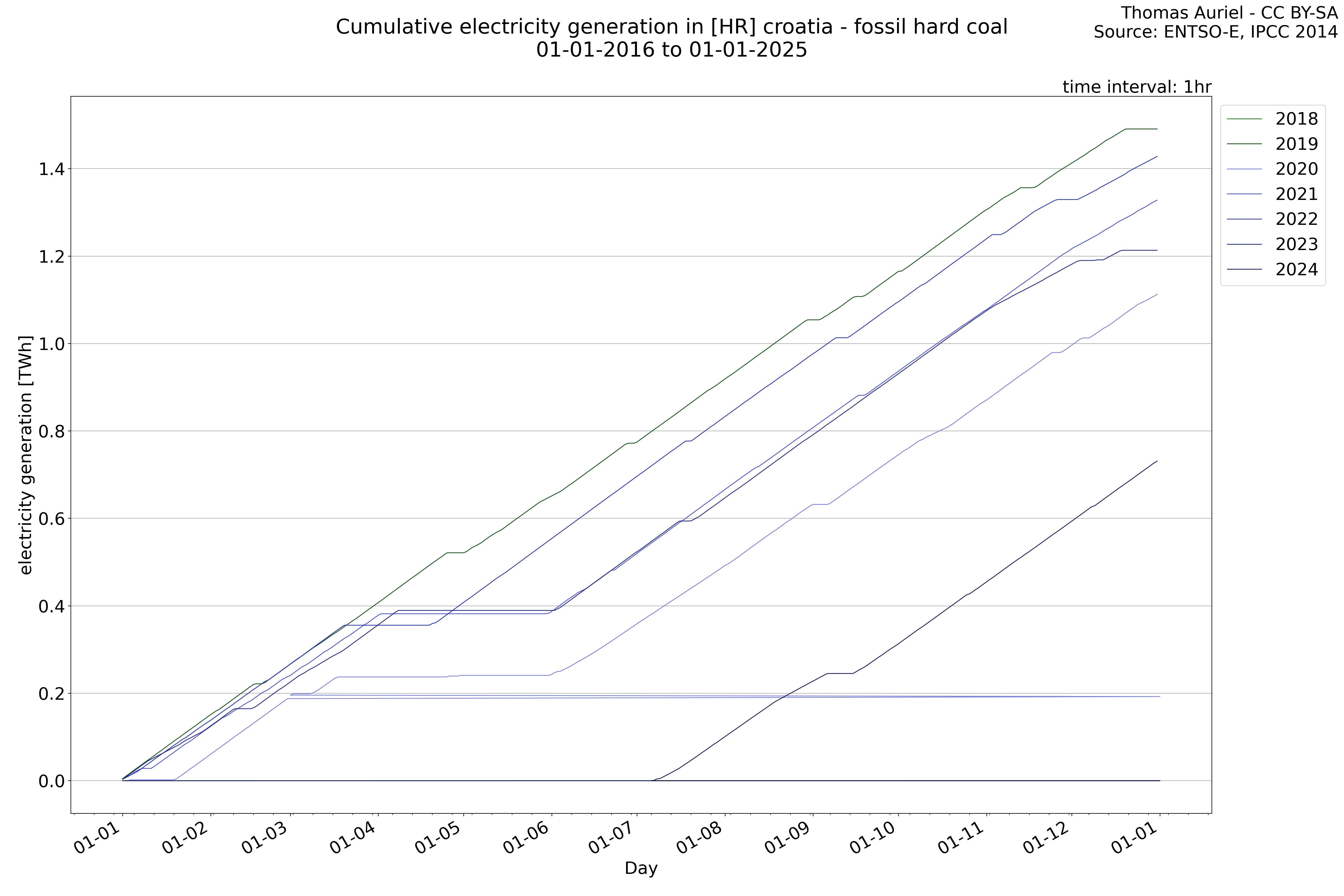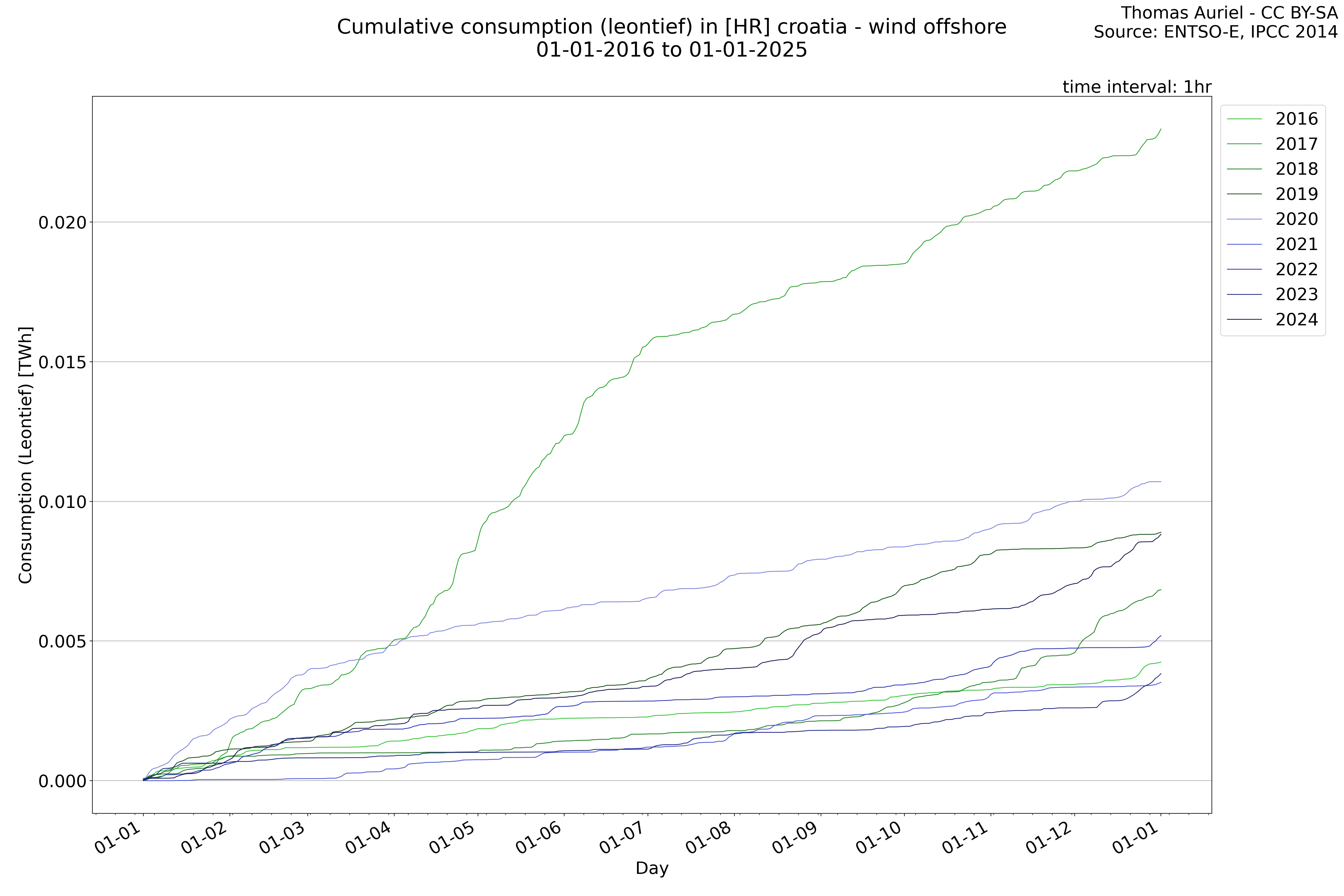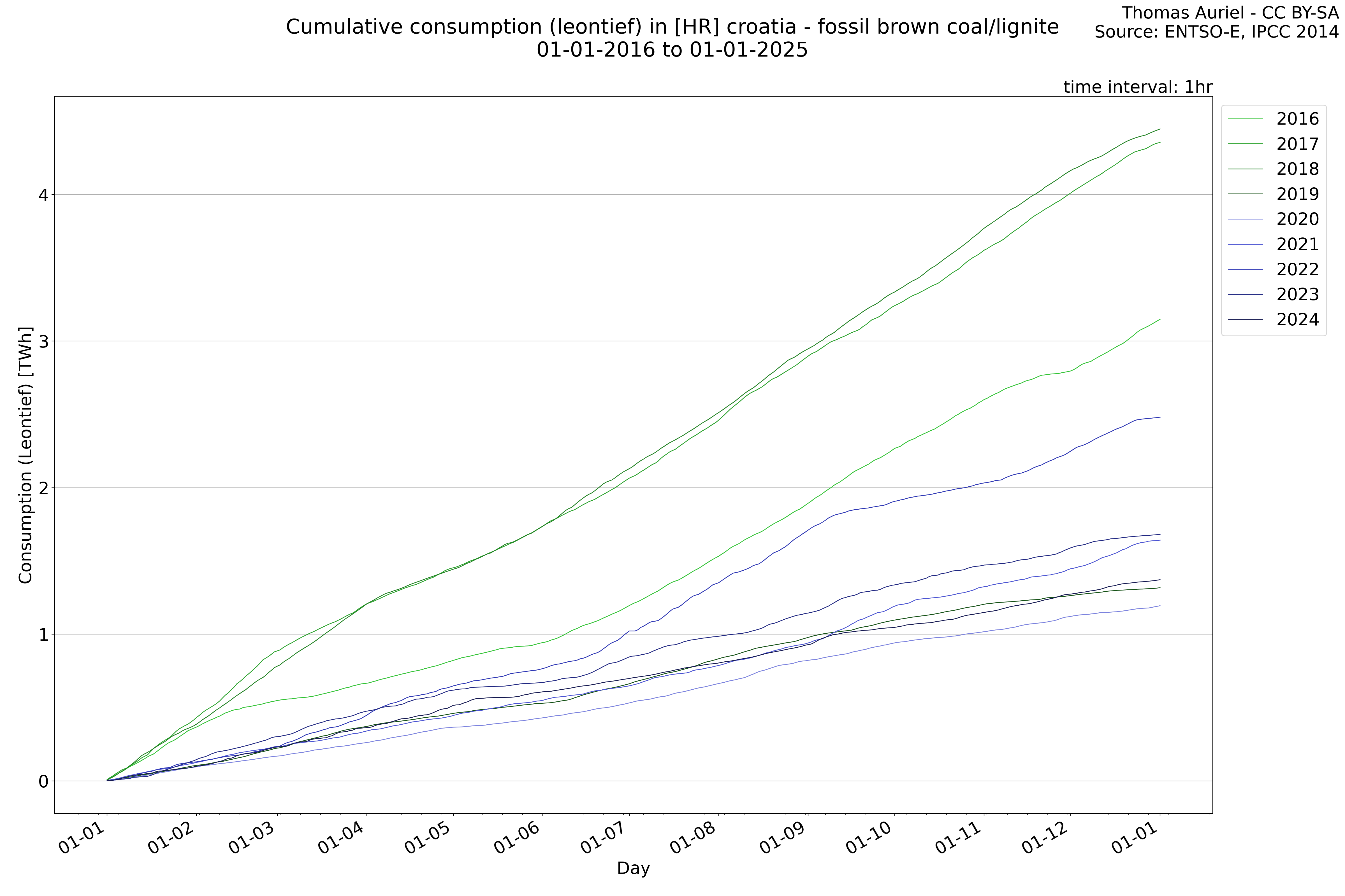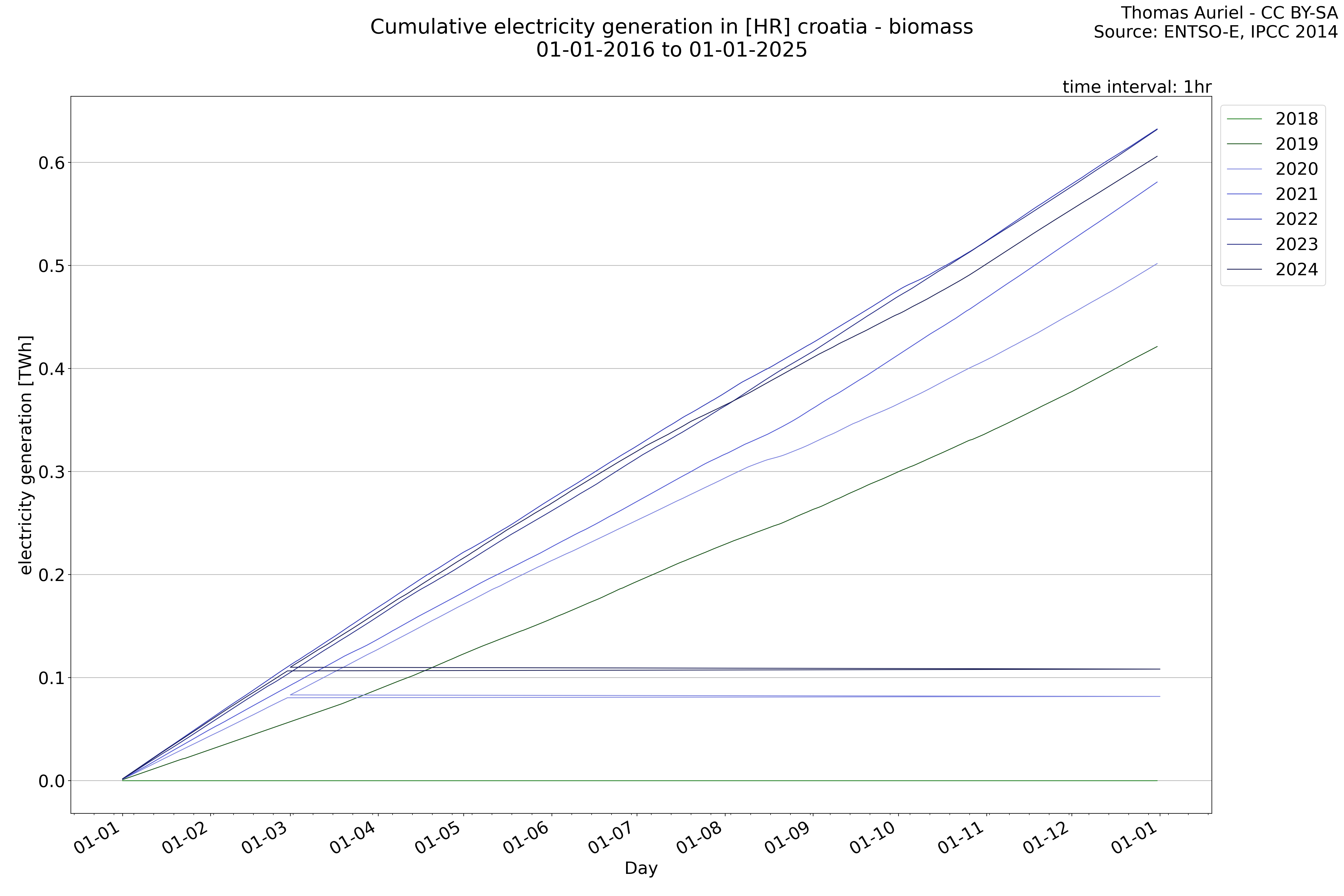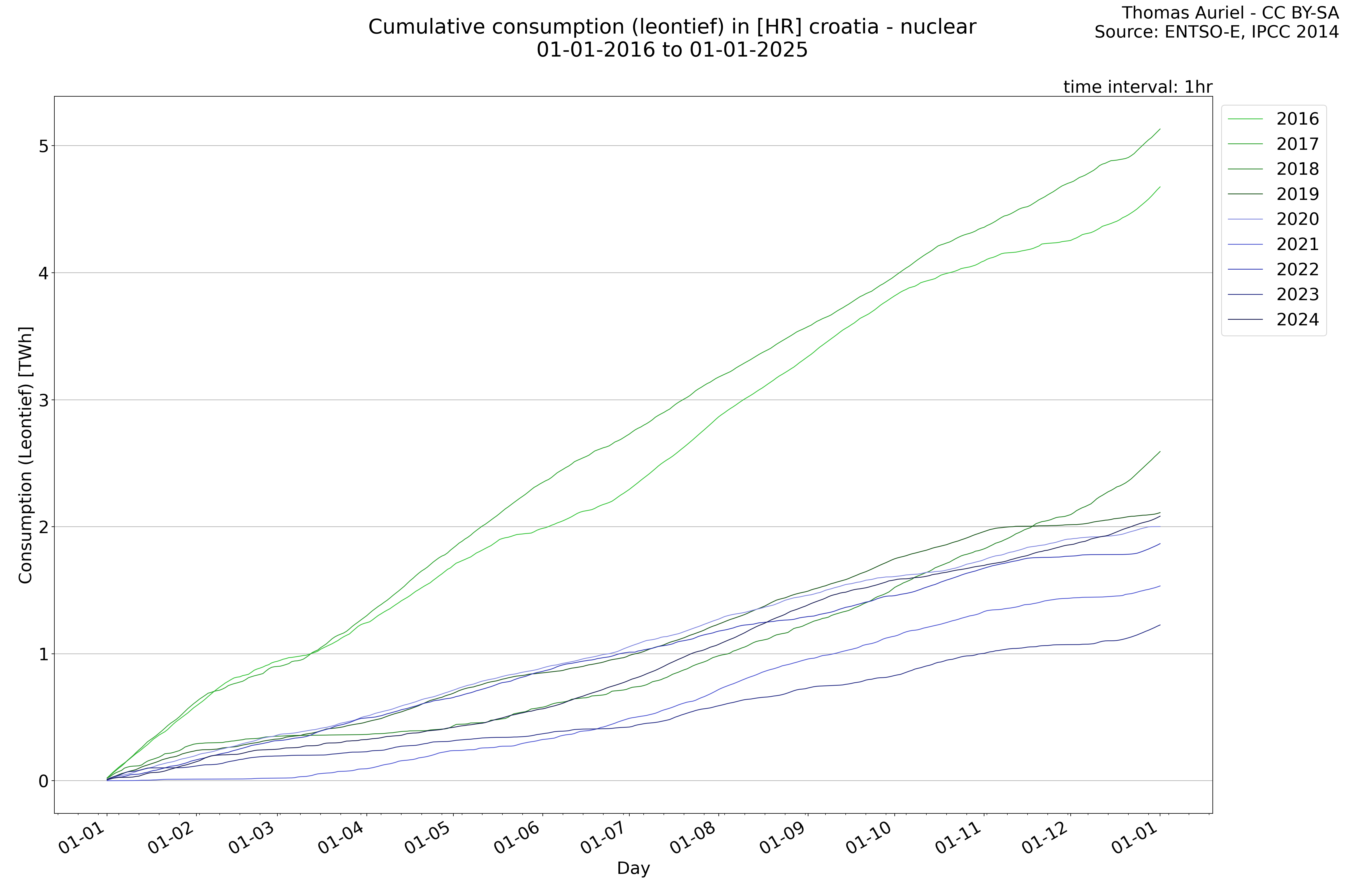 This plot is a cumulative sum plot, where each line represents the cumulative value of a specific metric (e.g., production, load, import, or export) for a given year. The plot begins at zero, and as the year progresses, the cumulative value is updated to reflect the total amount accumulated over time. This visualization illustrates the overall trend of the metric, showing whether the cumulative sum is increasing or decreasing, as well as any changes in the trend within the year. Additionally, the cumulative sum plot helps to reduce the impact of noise and short-term fluctuations commonly present in the raw data of production, load, import, or export. By smoothing out these variations, the plot emphasizes the broader, long-term trends. Consequently, this type of visualization facilitates a clearer understanding of the metric’s evolution across the year, revealing whether the activity follows a steady trajectory, shows signs of volatility, or experiences periods of significant change.