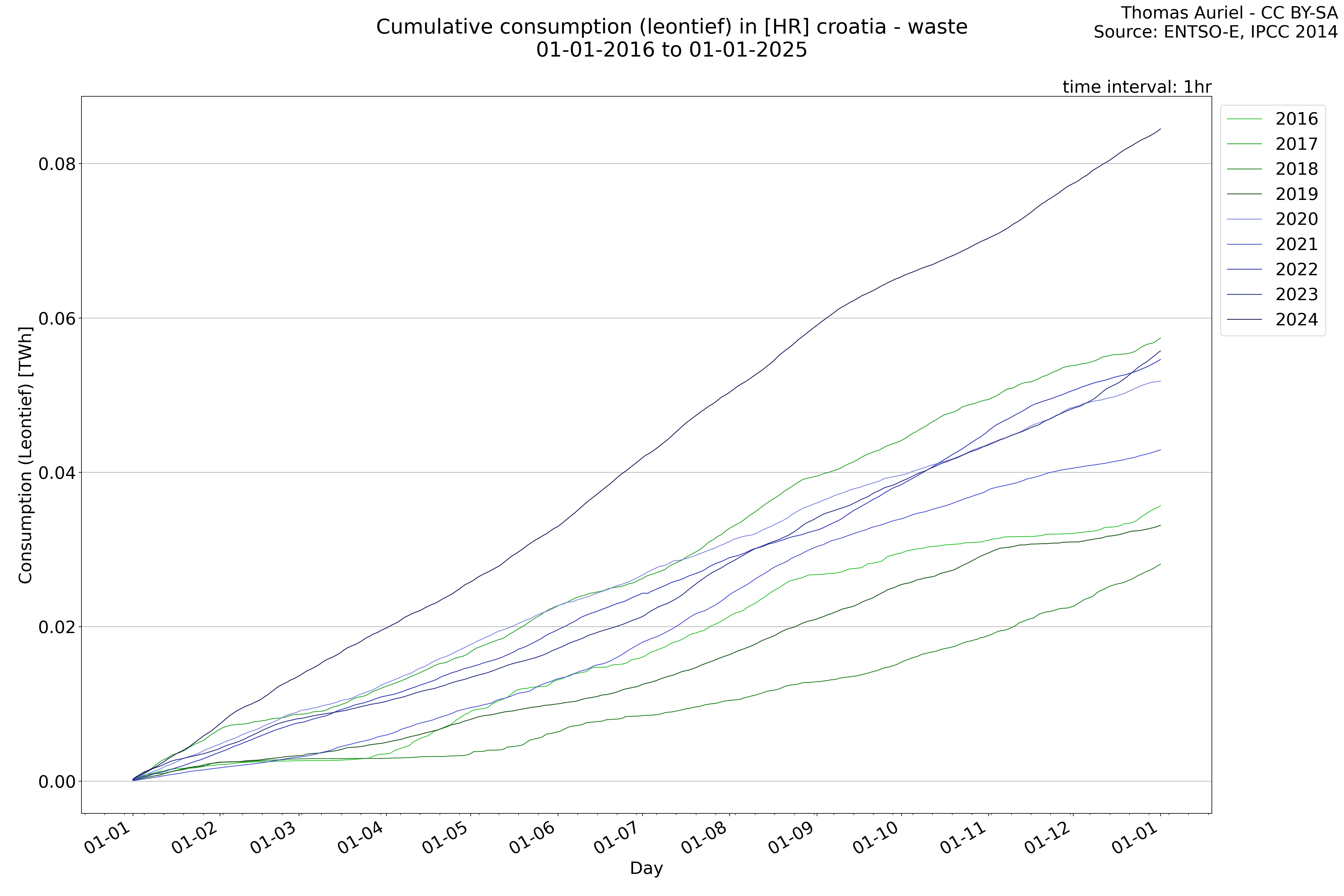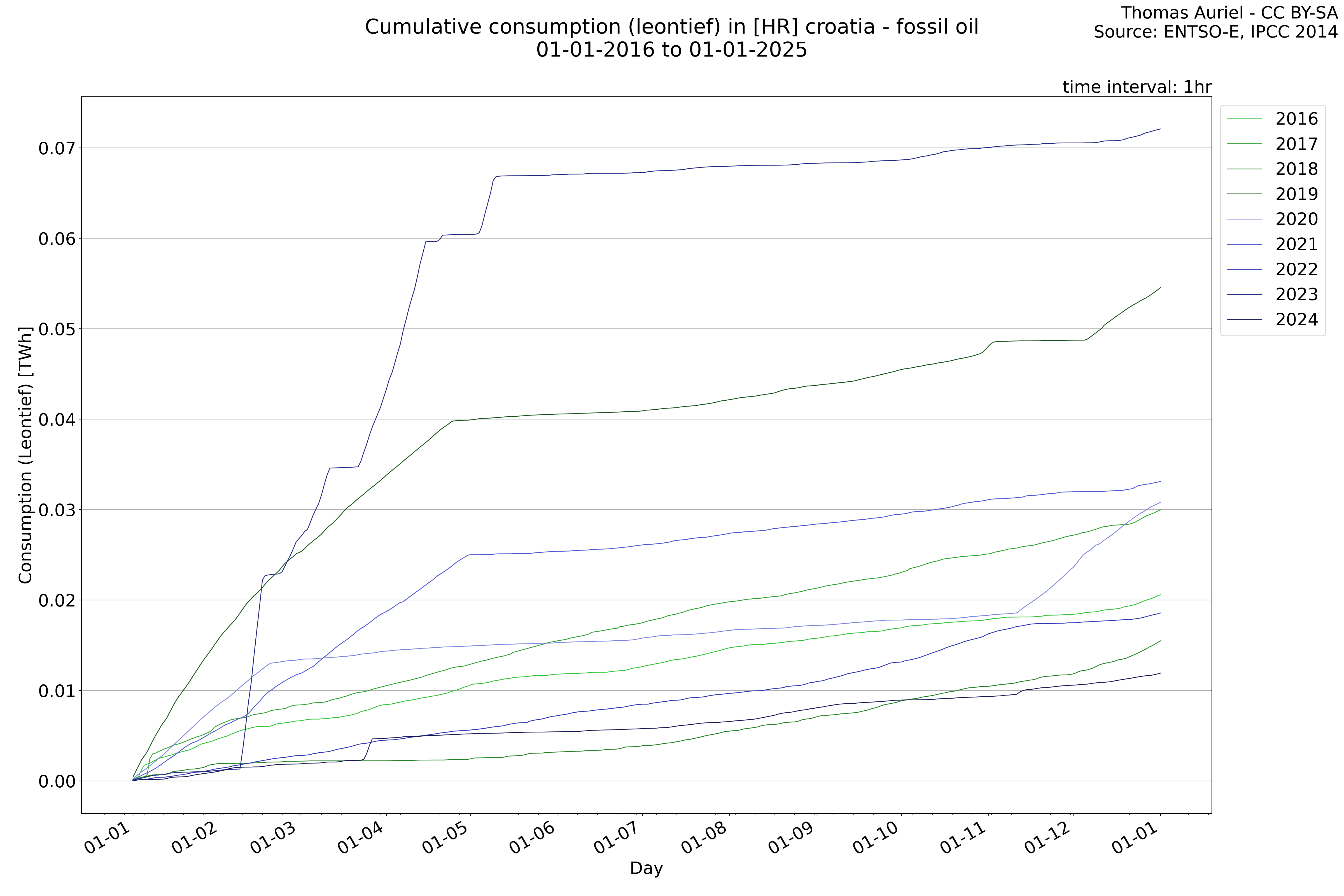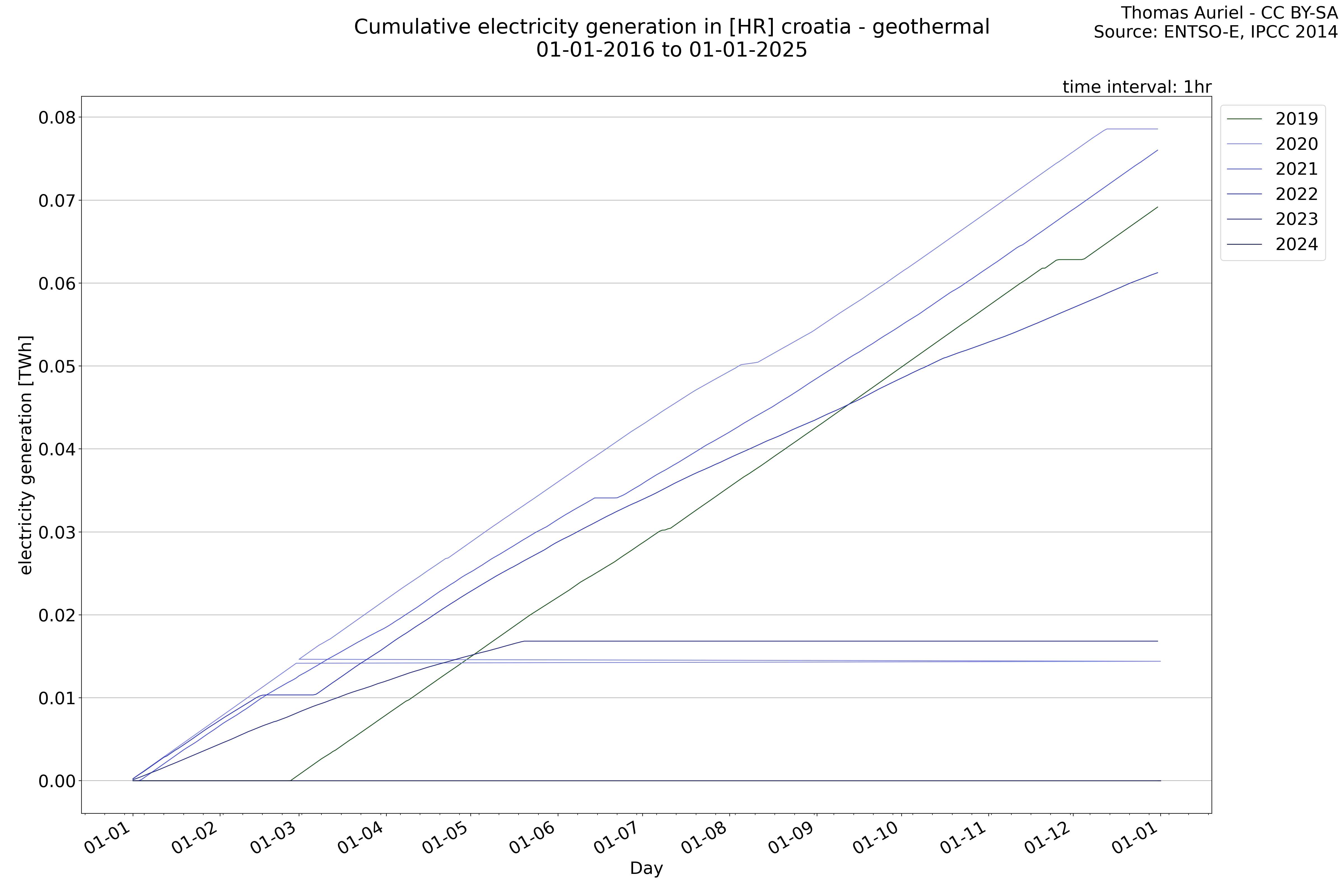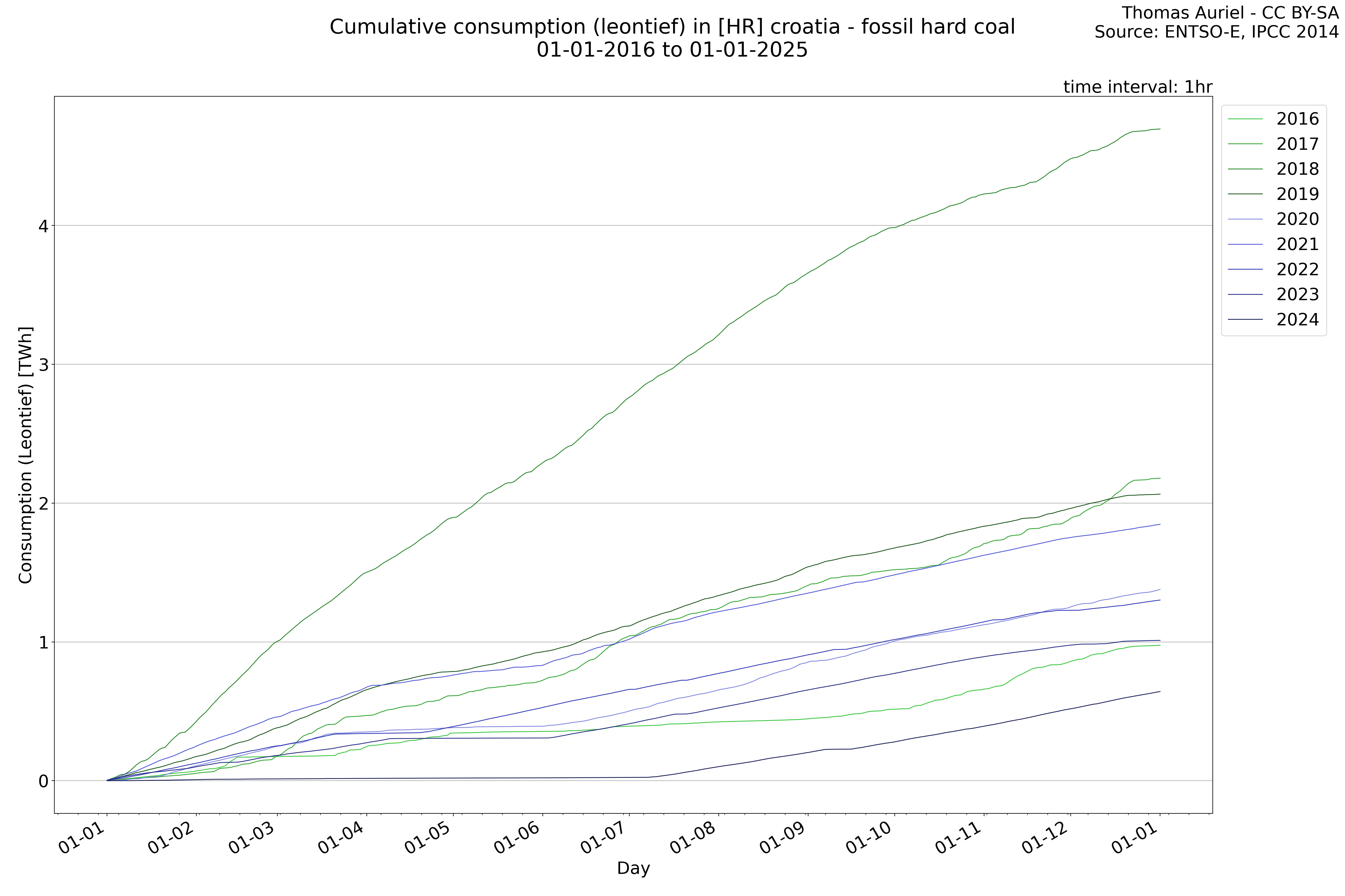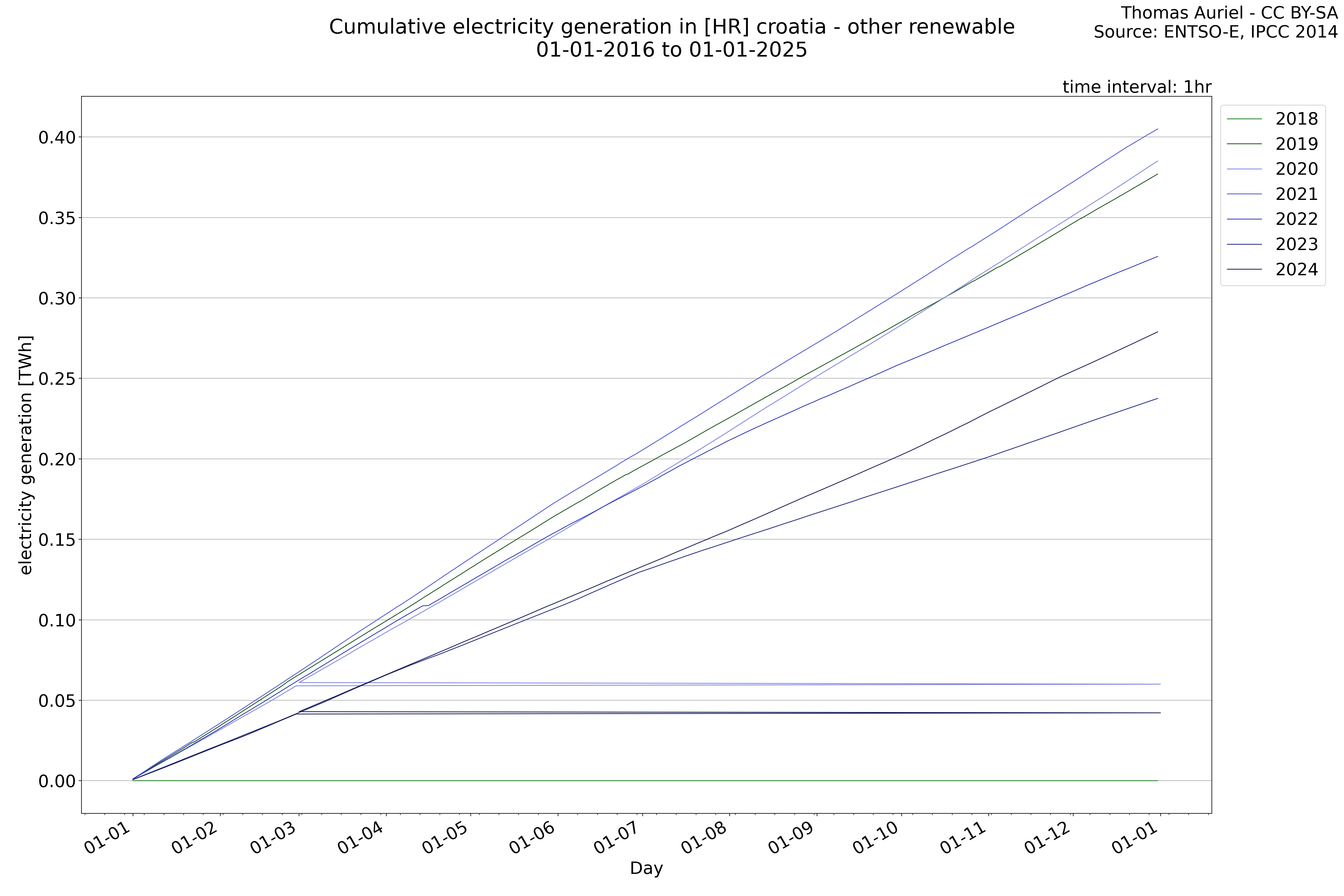 This plot is a cumulative sum plot, where each line represents the cumulative value of a specific metric (e.g., production, load, import, or export) for a given year. The plot begins at zero, and as the year progresses, the cumulative value is updated to reflect the total amount accumulated over time. This visualization illustrates the overall trend of the metric, showing whether the cumulative sum is increasing or decreasing, as well as any changes in the trend within the year. Additionally, the cumulative sum plot helps to reduce the impact of noise and short-term fluctuations commonly present in the raw data of production, load, import, or export. By smoothing out these variations, the plot emphasizes the broader, long-term trends. Consequently, this type of visualization facilitates a clearer understanding of the metric’s evolution across the year, revealing whether the activity follows a steady trajectory, shows signs of volatility, or experiences periods of significant change.