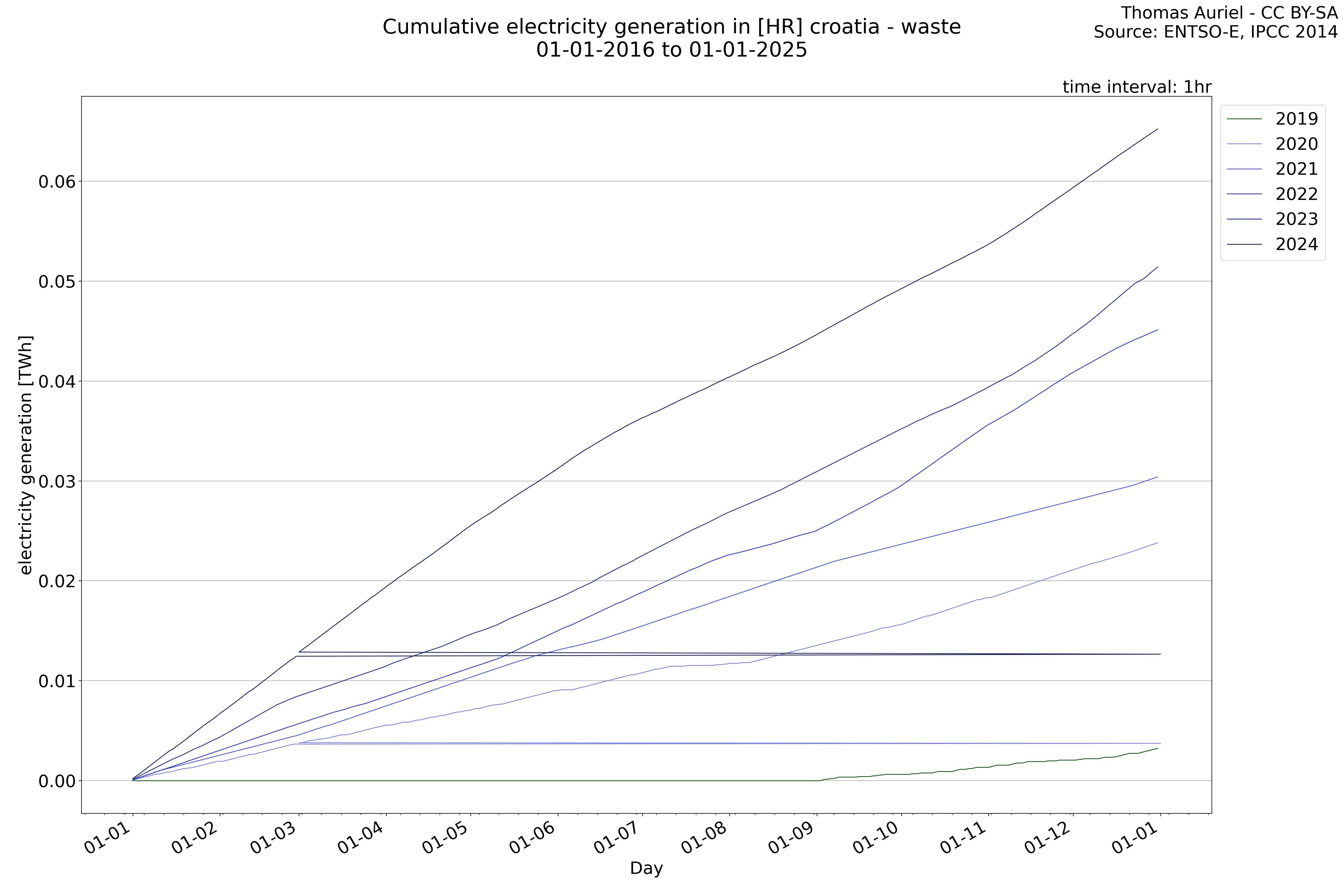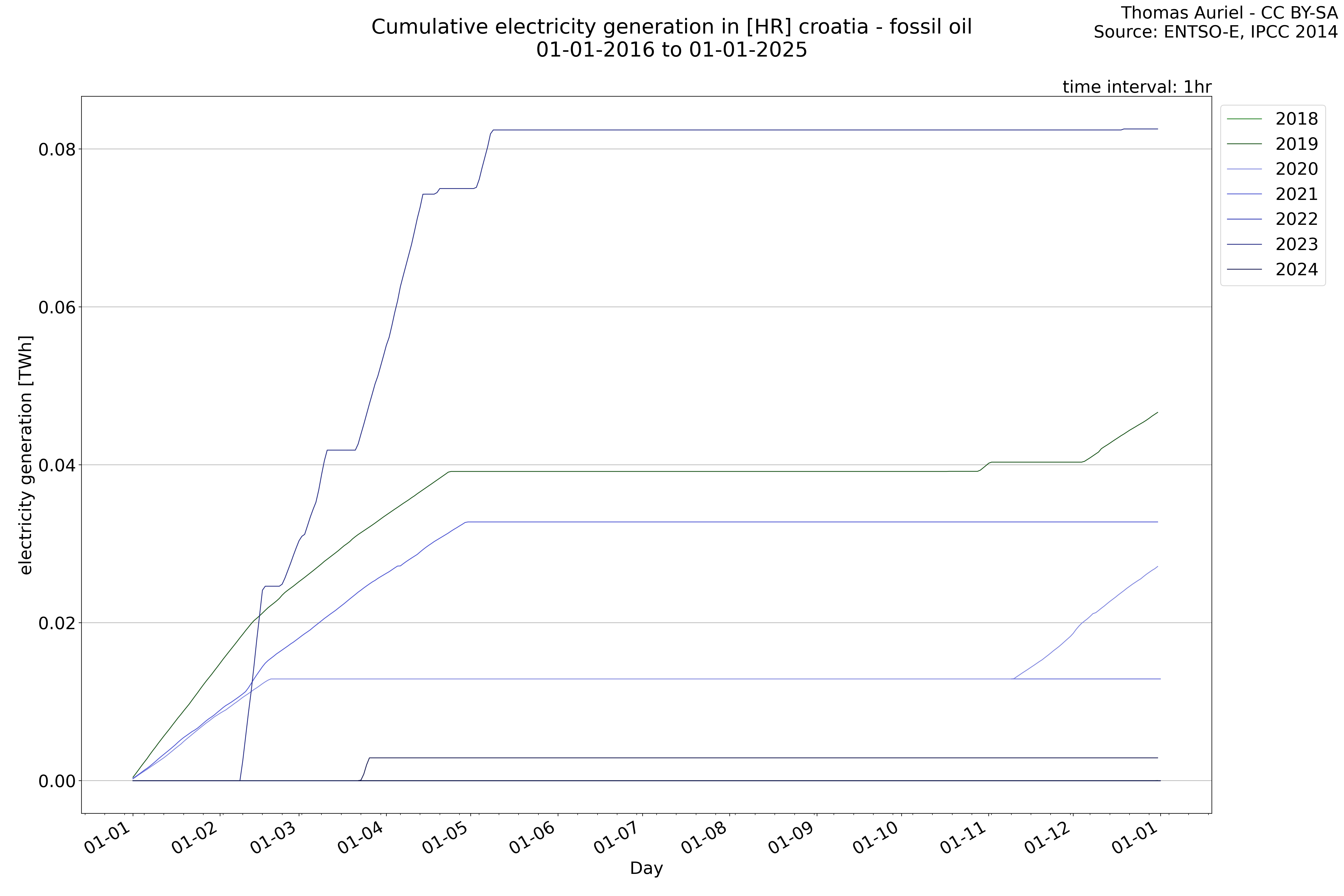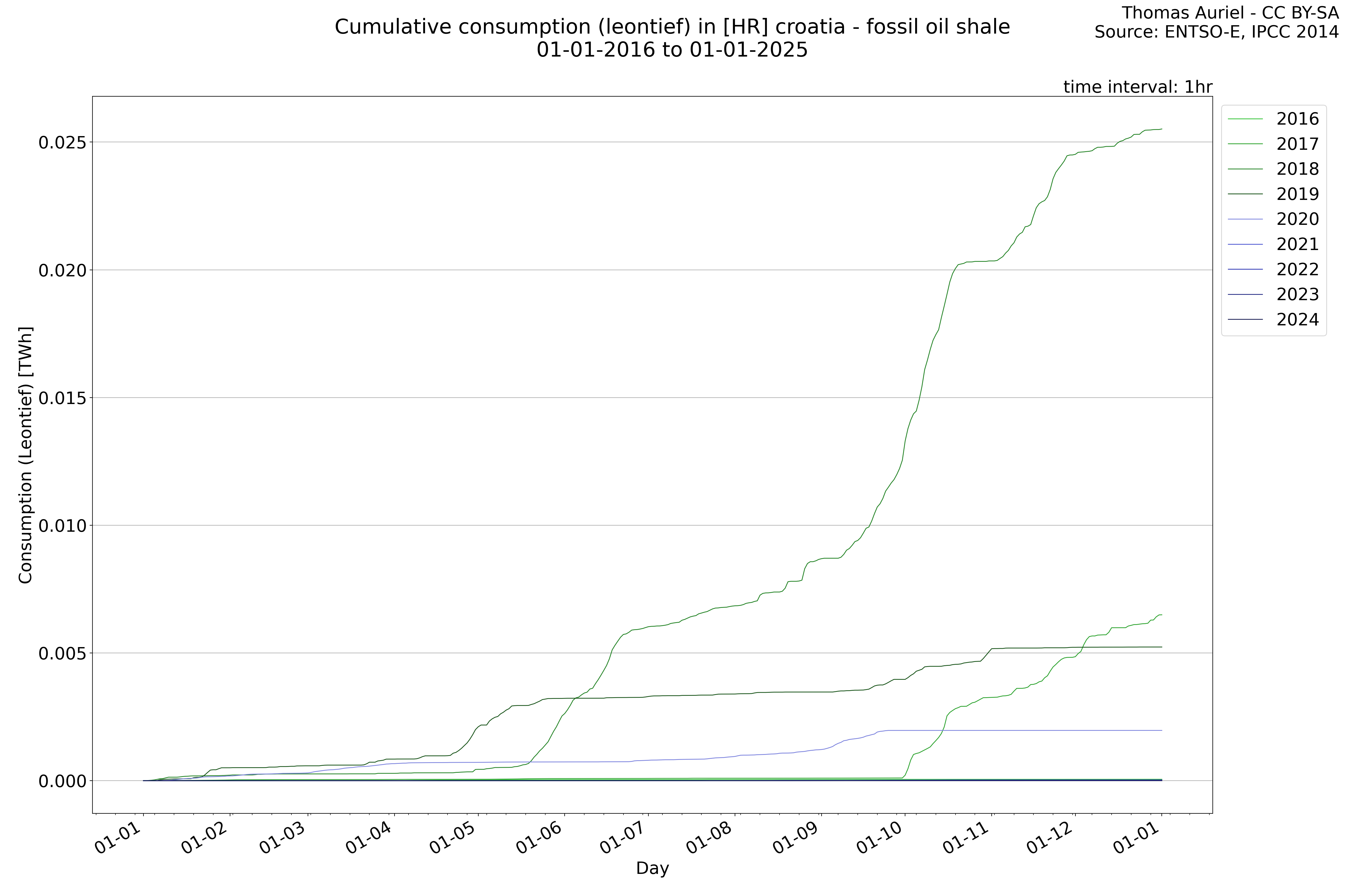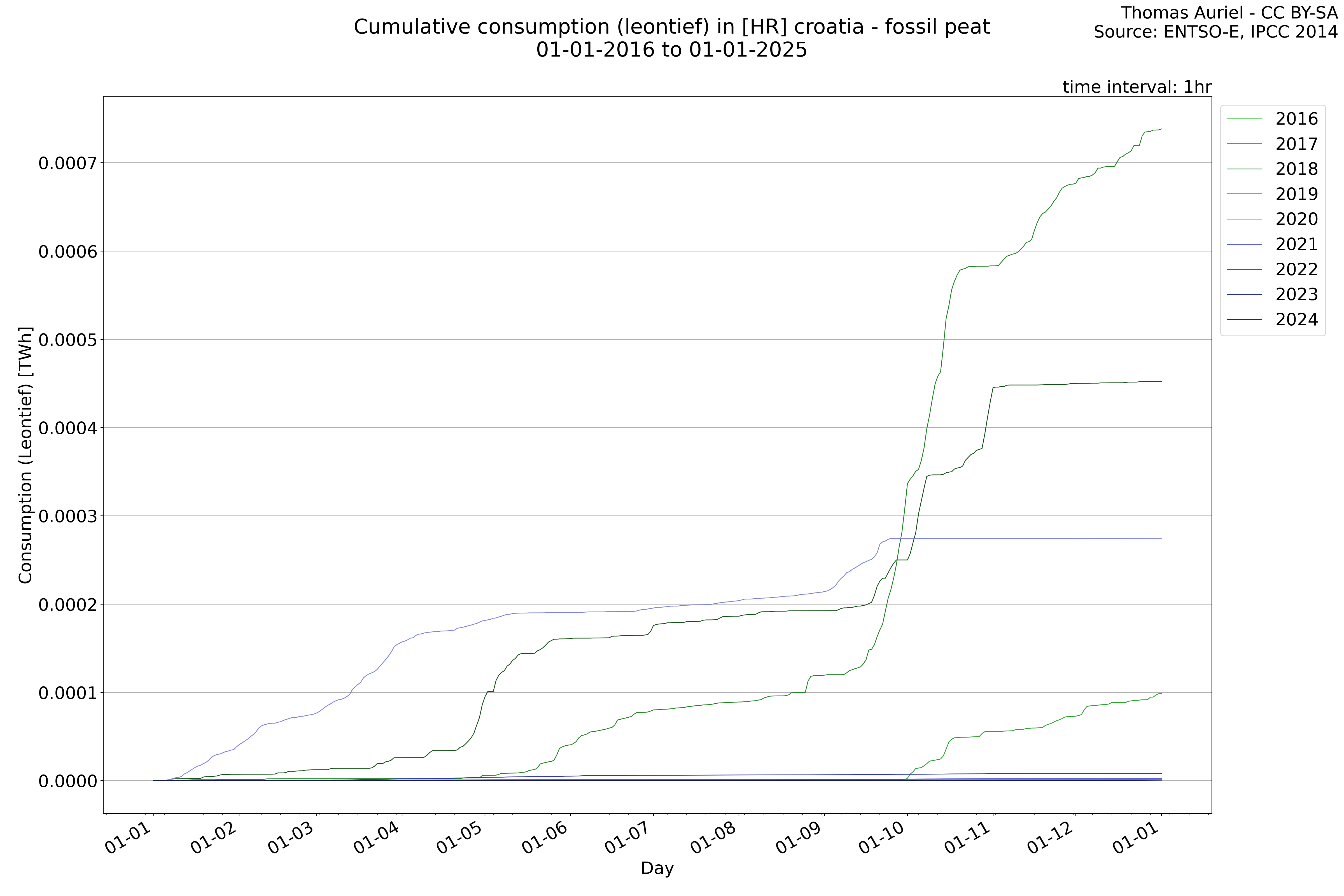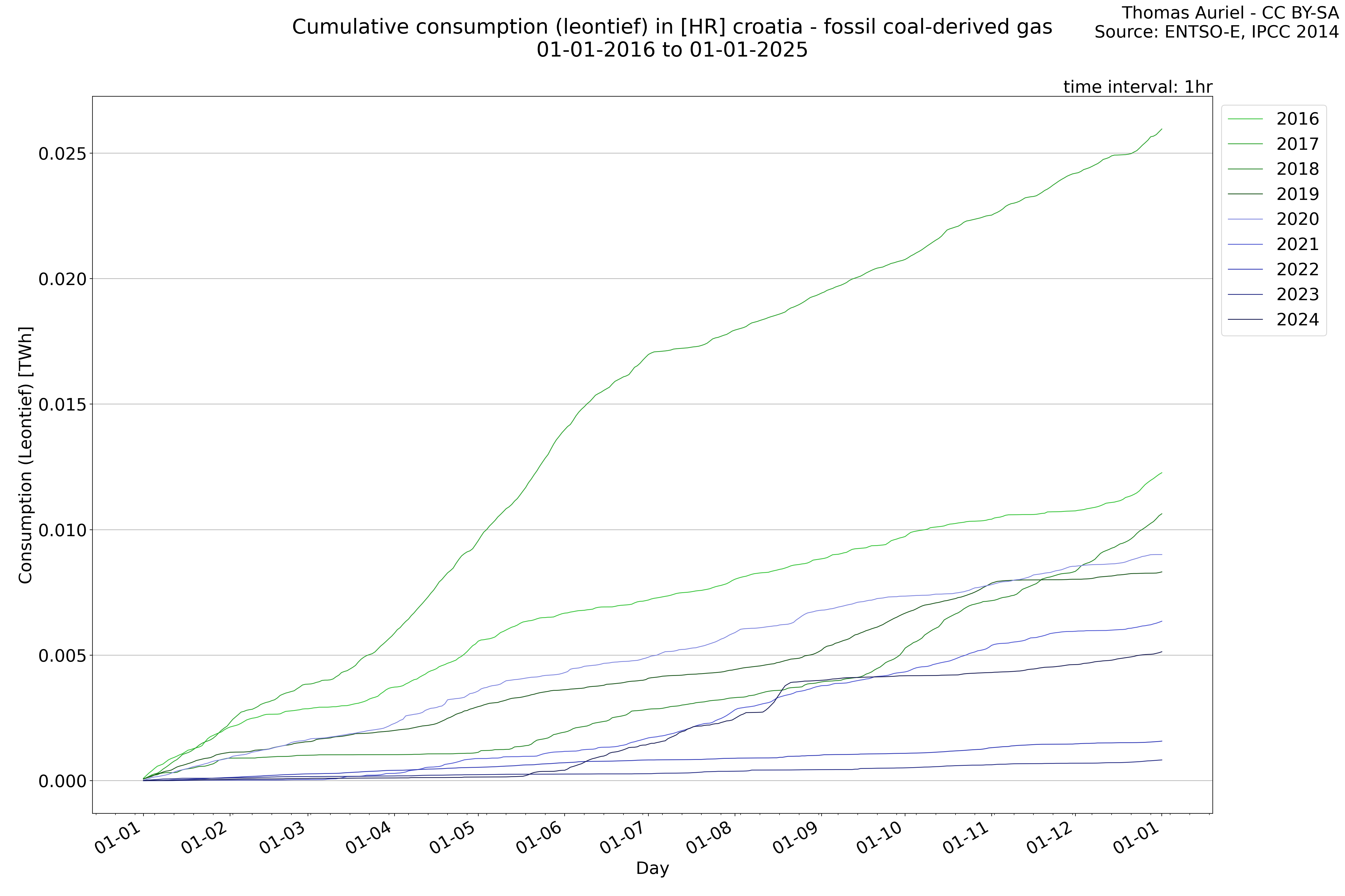 This plot is a cumulative sum plot, where each line represents the cumulative value of a specific metric (e.g., production, load, import, or export) for a given year. The plot begins at zero, and as the year progresses, the cumulative value is updated to reflect the total amount accumulated over time. This visualization illustrates the overall trend of the metric, showing whether the cumulative sum is increasing or decreasing, as well as any changes in the trend within the year. Additionally, the cumulative sum plot helps to reduce the impact of noise and short-term fluctuations commonly present in the raw data of production, load, import, or export. By smoothing out these variations, the plot emphasizes the broader, long-term trends. Consequently, this type of visualization facilitates a clearer understanding of the metric’s evolution across the year, revealing whether the activity follows a steady trajectory, shows signs of volatility, or experiences periods of significant change.