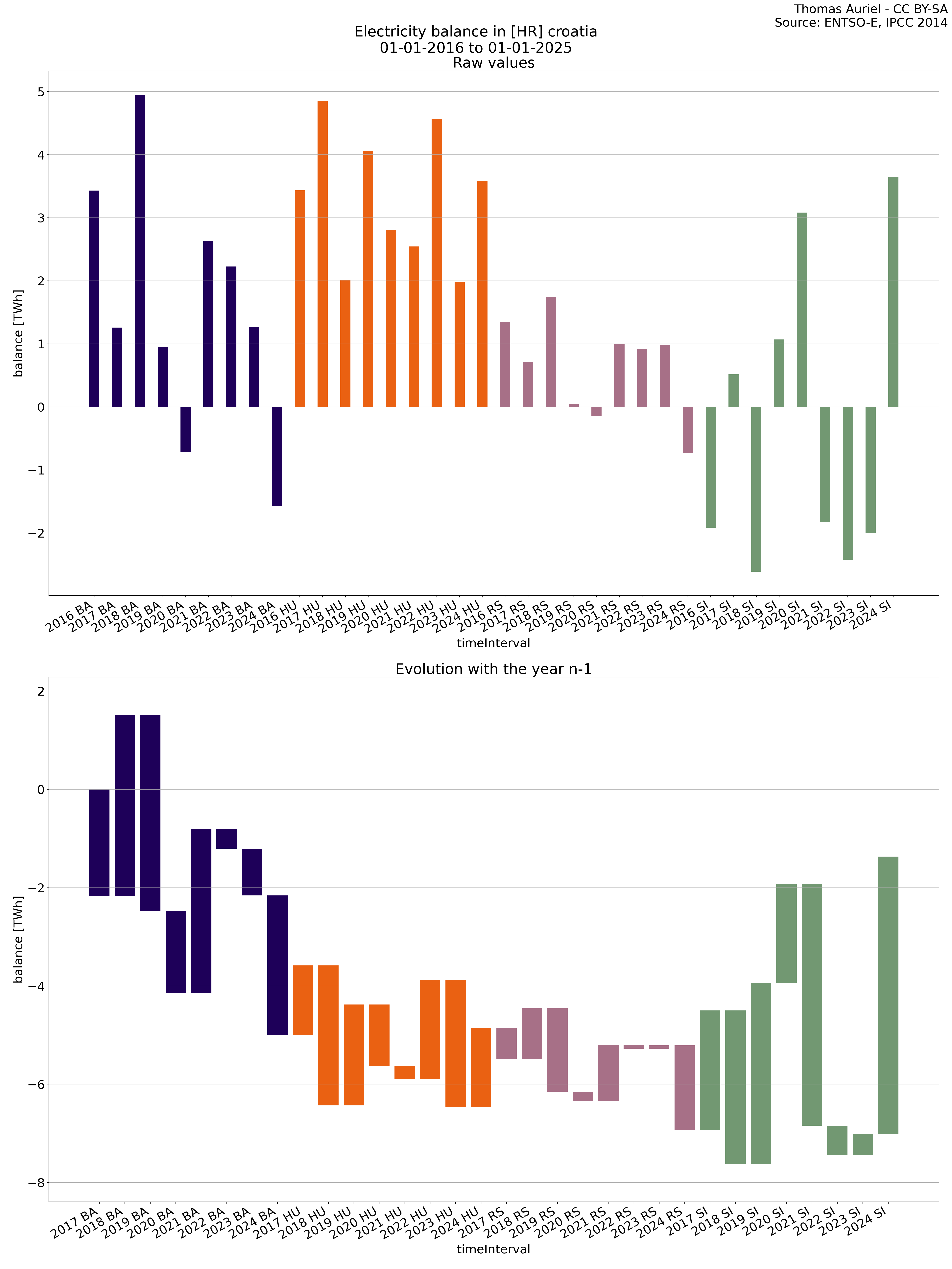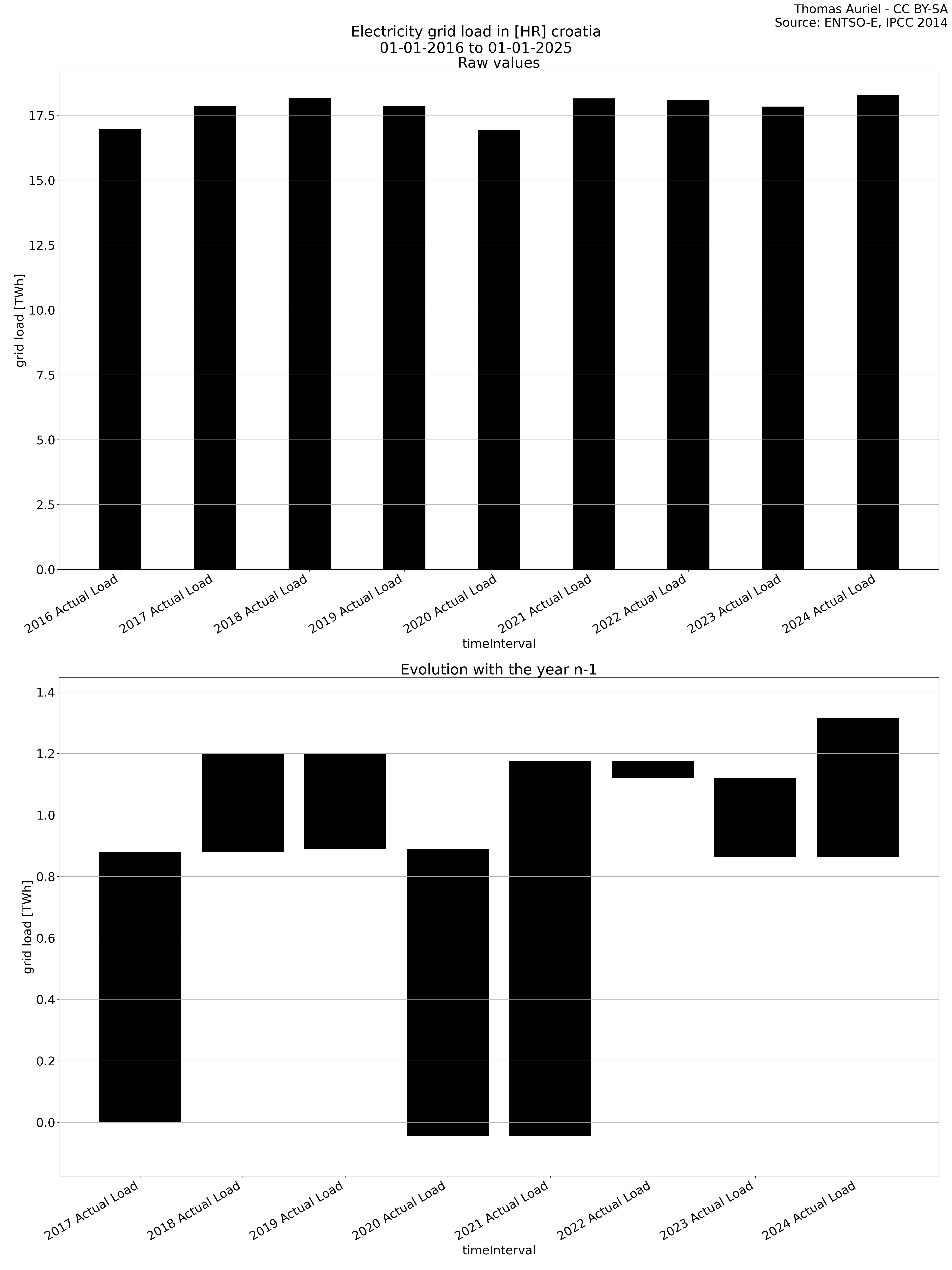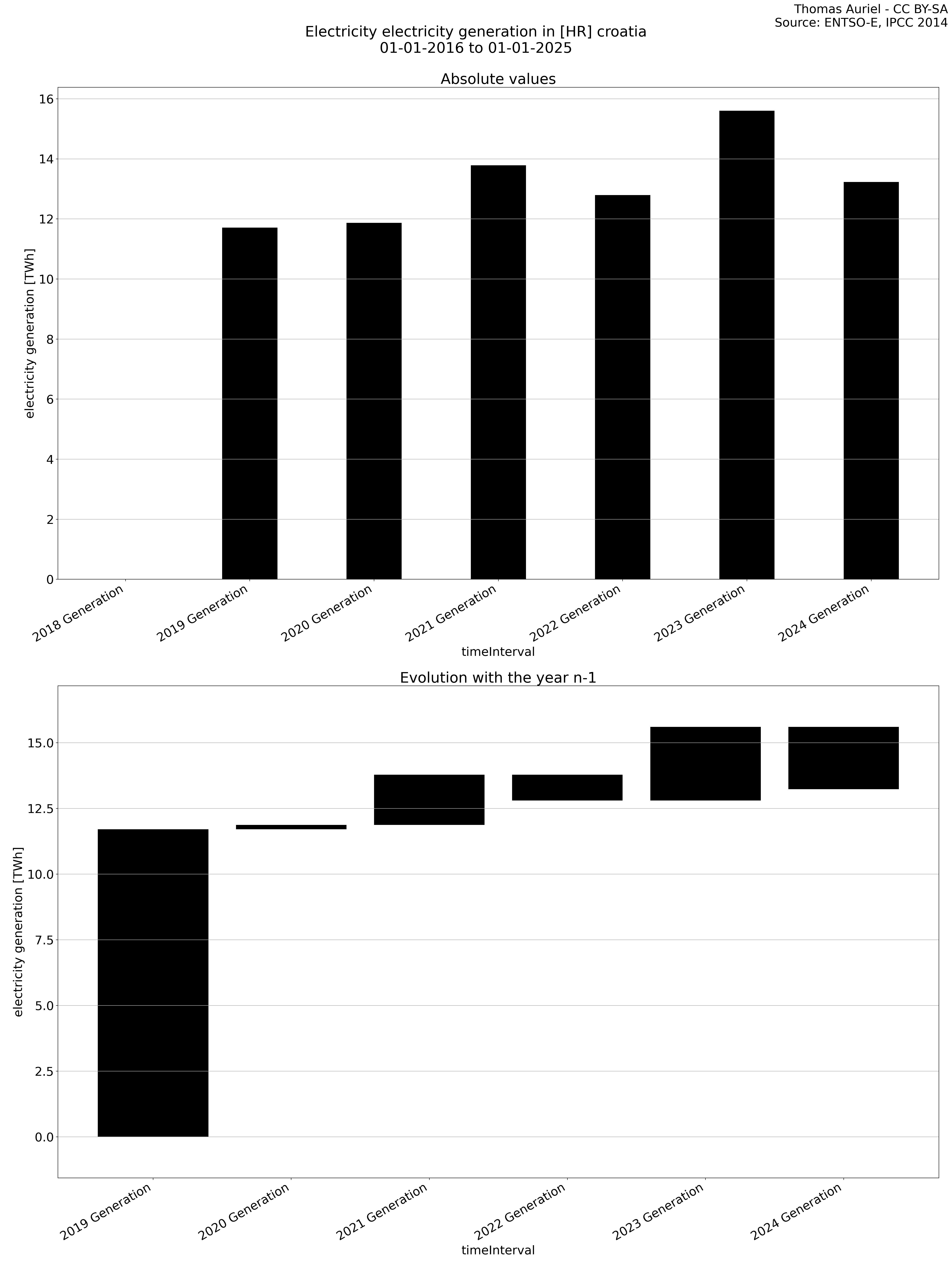 The second section features a waterfall graph, which visually represents the year-over-year changes in electricity metrics. In this graph, the length of each bar corresponds to the difference in the metric (e.g., production, load, etc.) compared to the previous year. Unlike the bar plot, the bars in the waterfall graph do not start at zero; instead, each bar begins where the previous one ended. Hence, this structure emphasizes the incremental changes in the metric over time, facilitating the visualization of fluctuations from one year to the next.