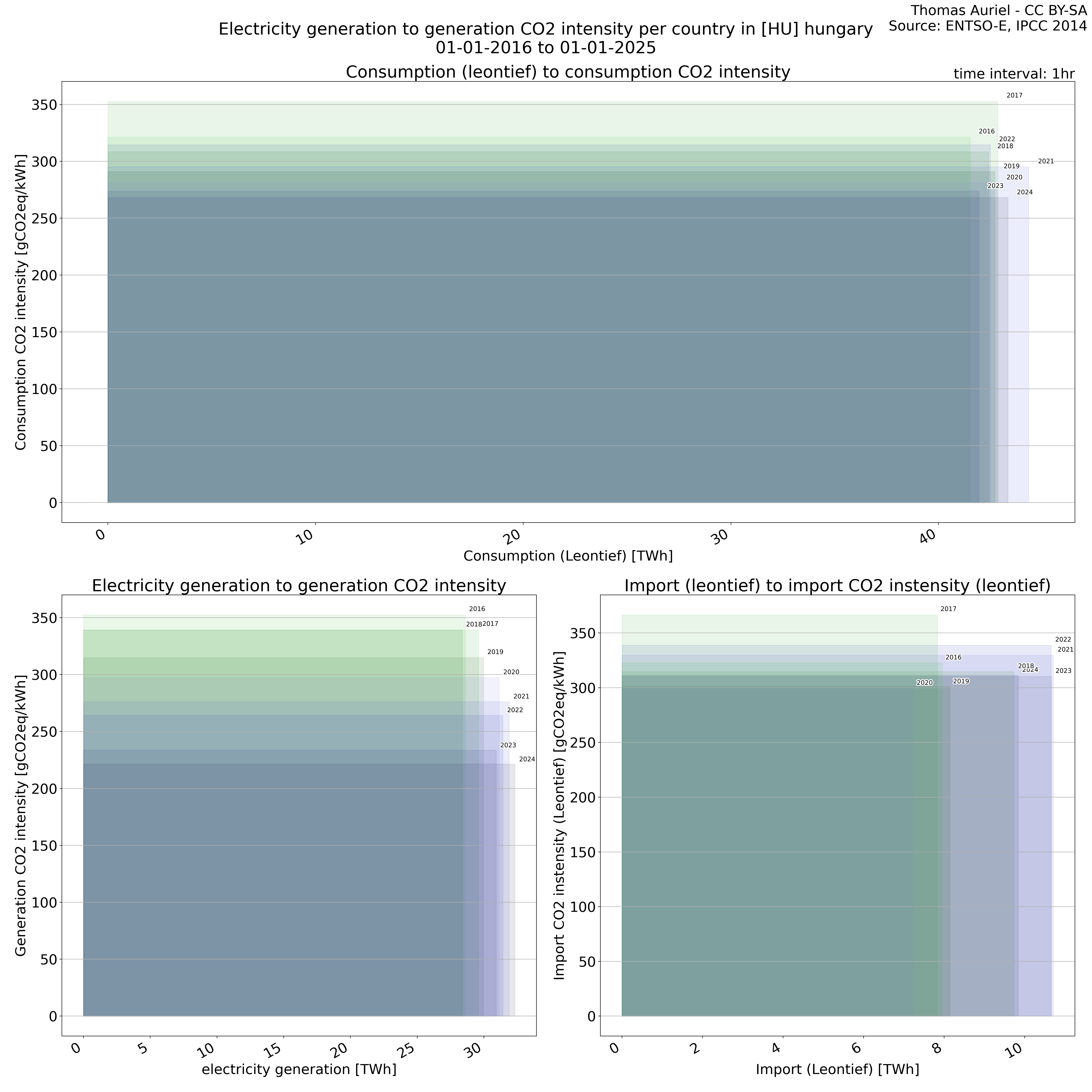 The plot consists of squares, each representing a single year, designed to illustrate electricity-related metrics and their associated environmental impacts. The length of each square corresponds to the total electricity consumption, generation, or imports during the year, with longer squares indicating higher overall values for the respective metric. The height of each square represents the average CO₂ intensity (e.g., grams of CO₂ per kWh) associated with electricity consumption, generation, or imports; hence, taller squares signify greater environmental impact per unit of electricity. Finally, the surface area of each square, determined by the product of its length and height, represents the total CO₂ emissions associated with the respective activity in the given year.