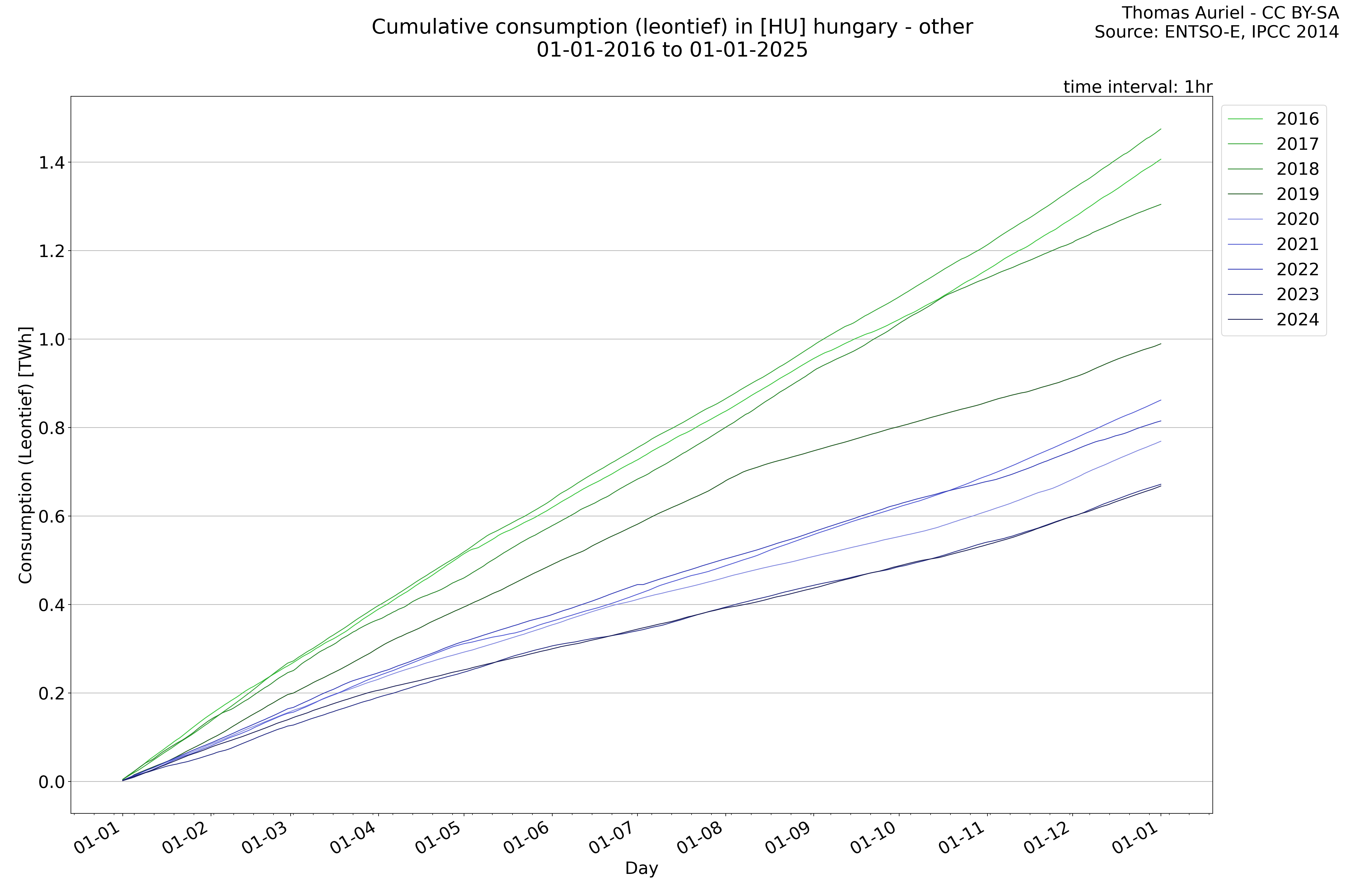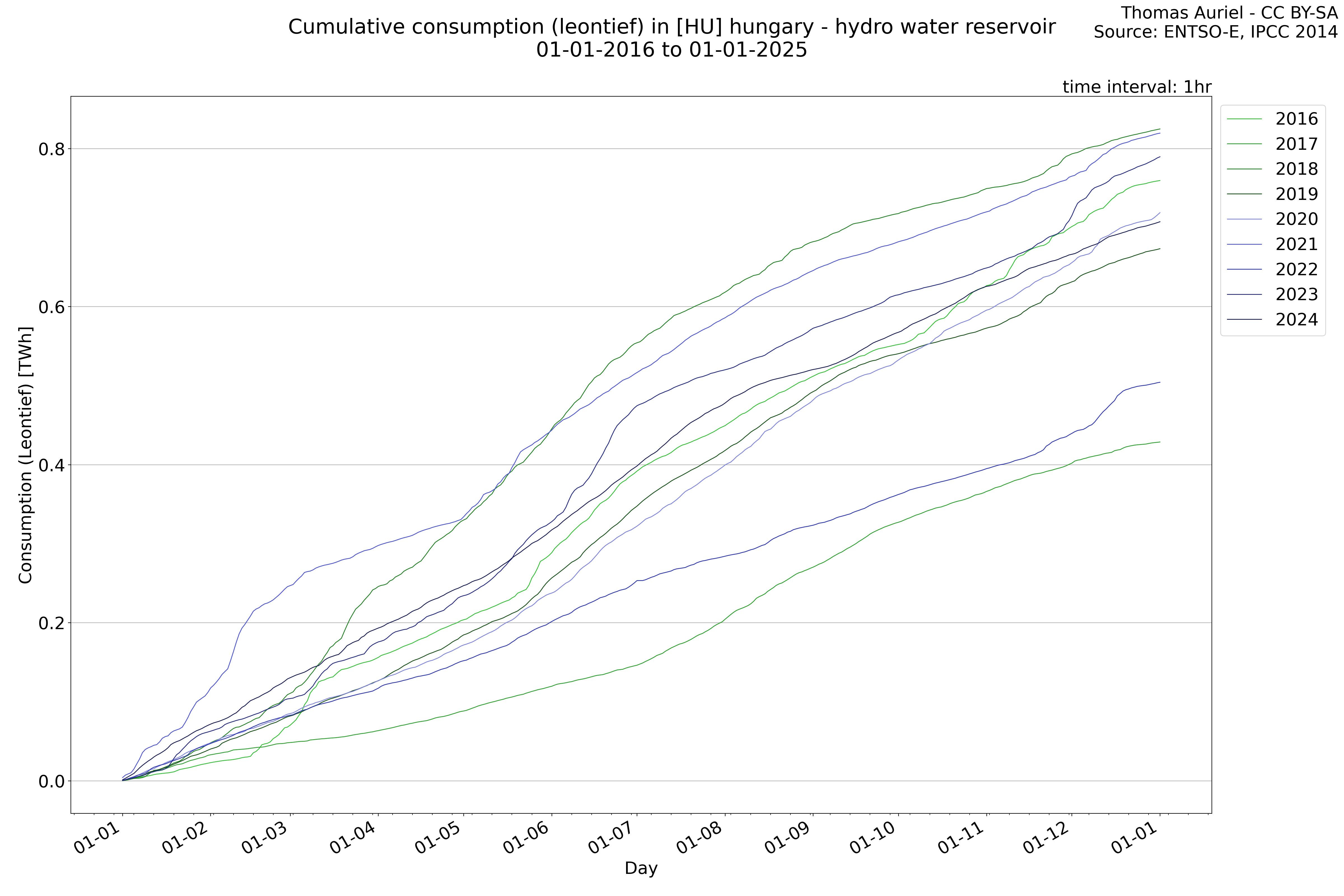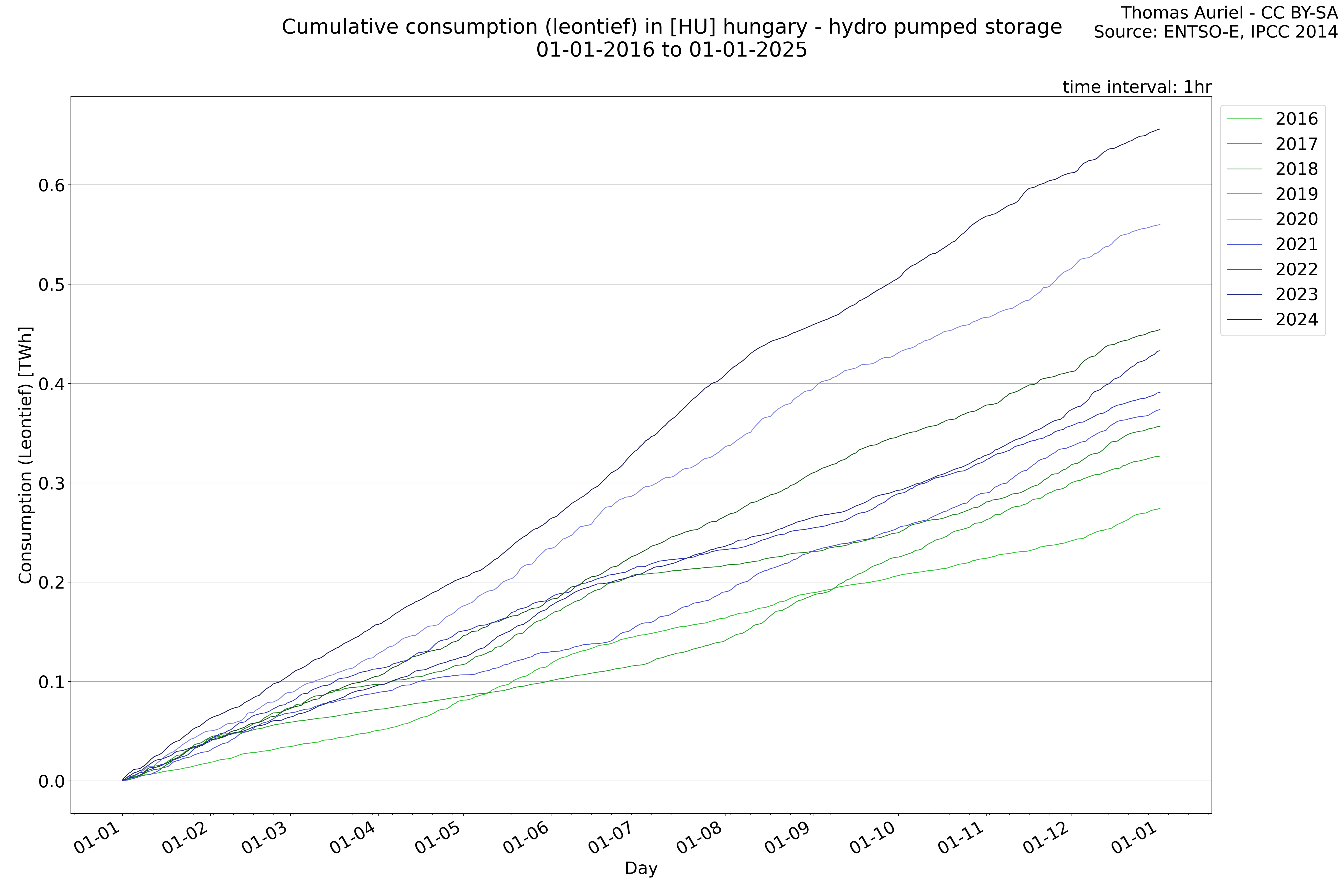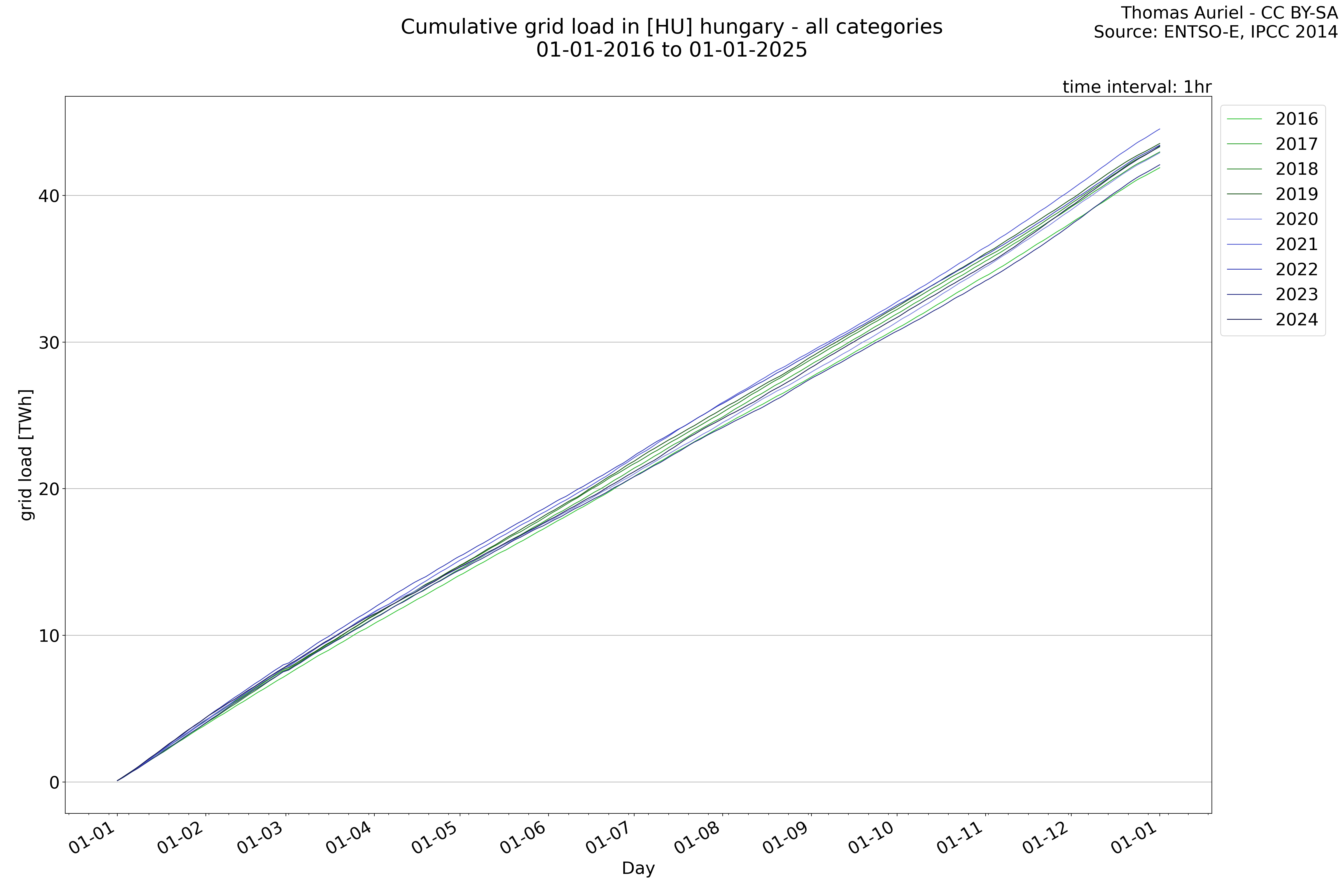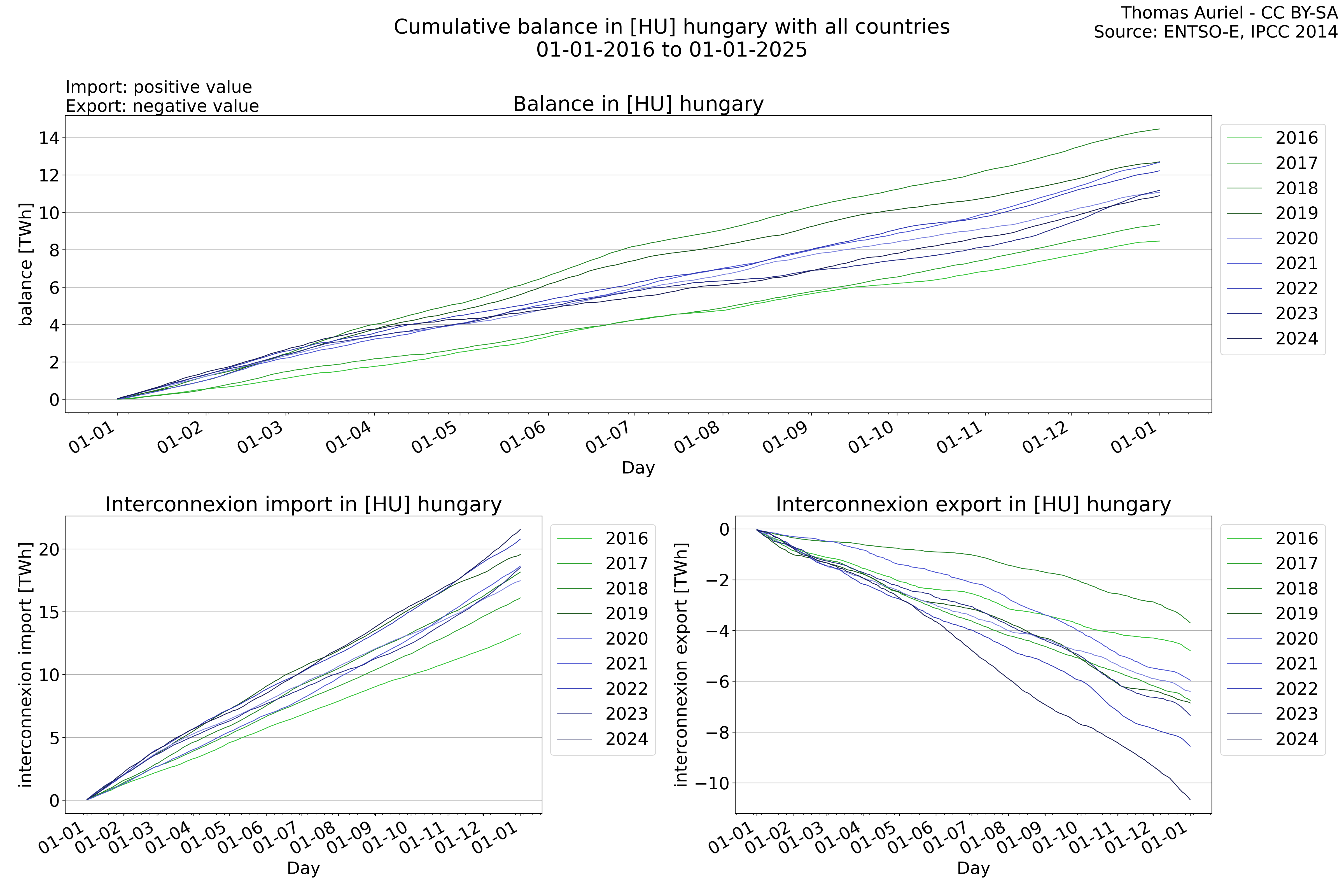 This plot is a cumulative sum plot, where each line represents the cumulative value of a specific metric (e.g., production, load, import, or export) for a given year. The plot begins at zero, and as the year progresses, the cumulative value is updated to reflect the total amount accumulated over time. This visualization illustrates the overall trend of the metric, showing whether the cumulative sum is increasing or decreasing, as well as any changes in the trend within the year. Additionally, the cumulative sum plot helps to reduce the impact of noise and short-term fluctuations commonly present in the raw data of production, load, import, or export. By smoothing out these variations, the plot emphasizes the broader, long-term trends. Consequently, this type of visualization facilitates a clearer understanding of the metric’s evolution across the year, revealing whether the activity follows a steady trajectory, shows signs of volatility, or experiences periods of significant change.