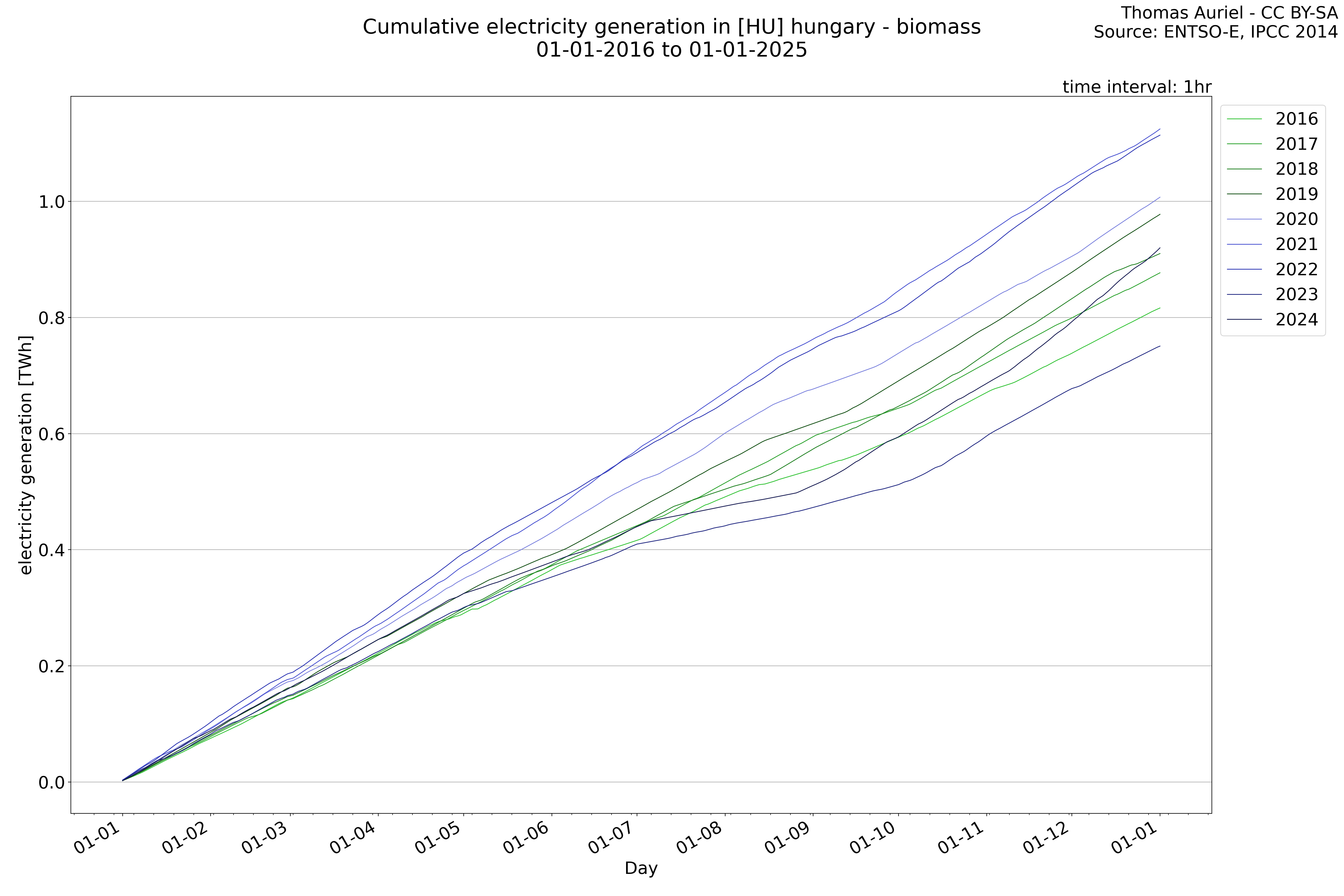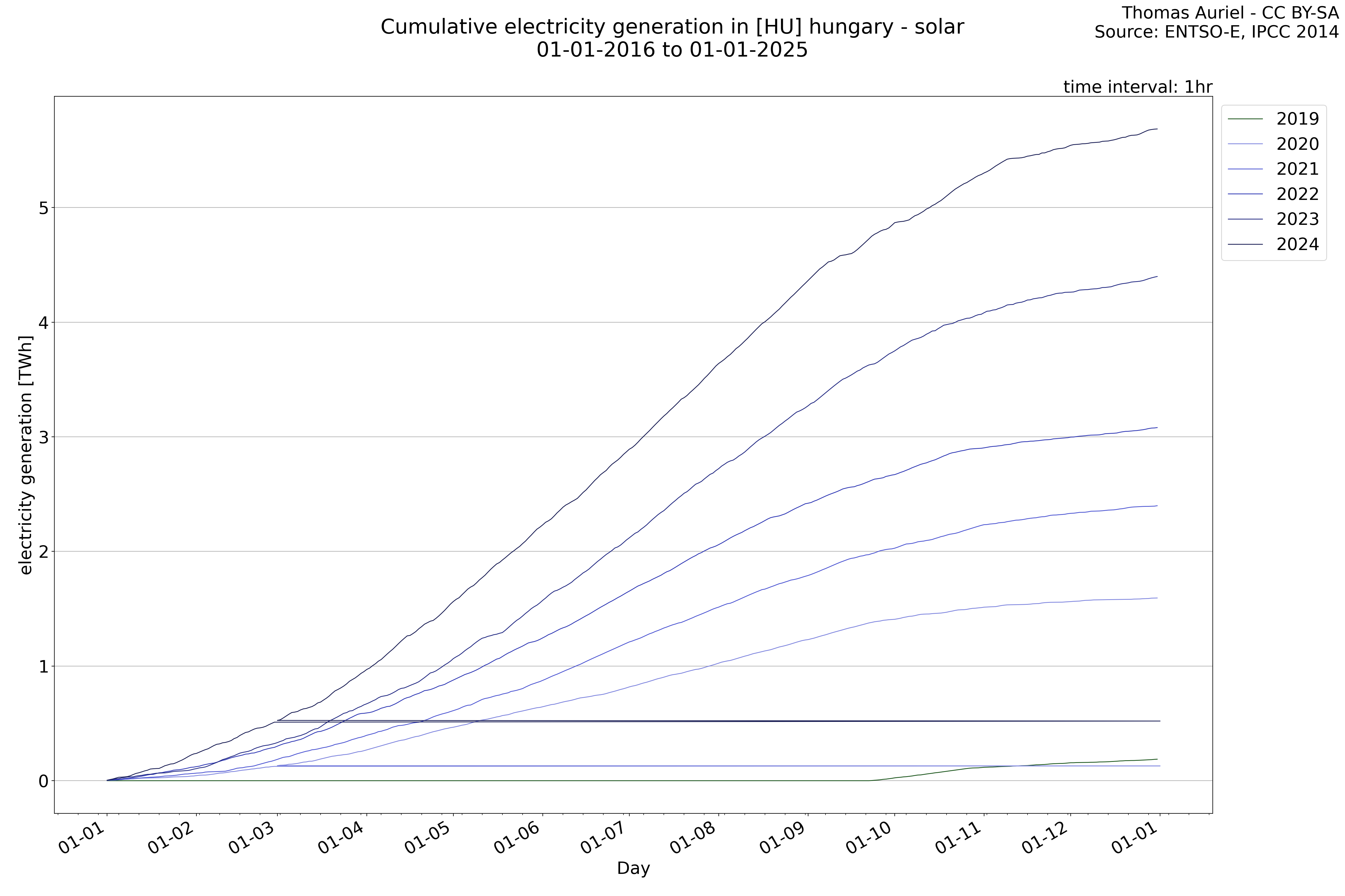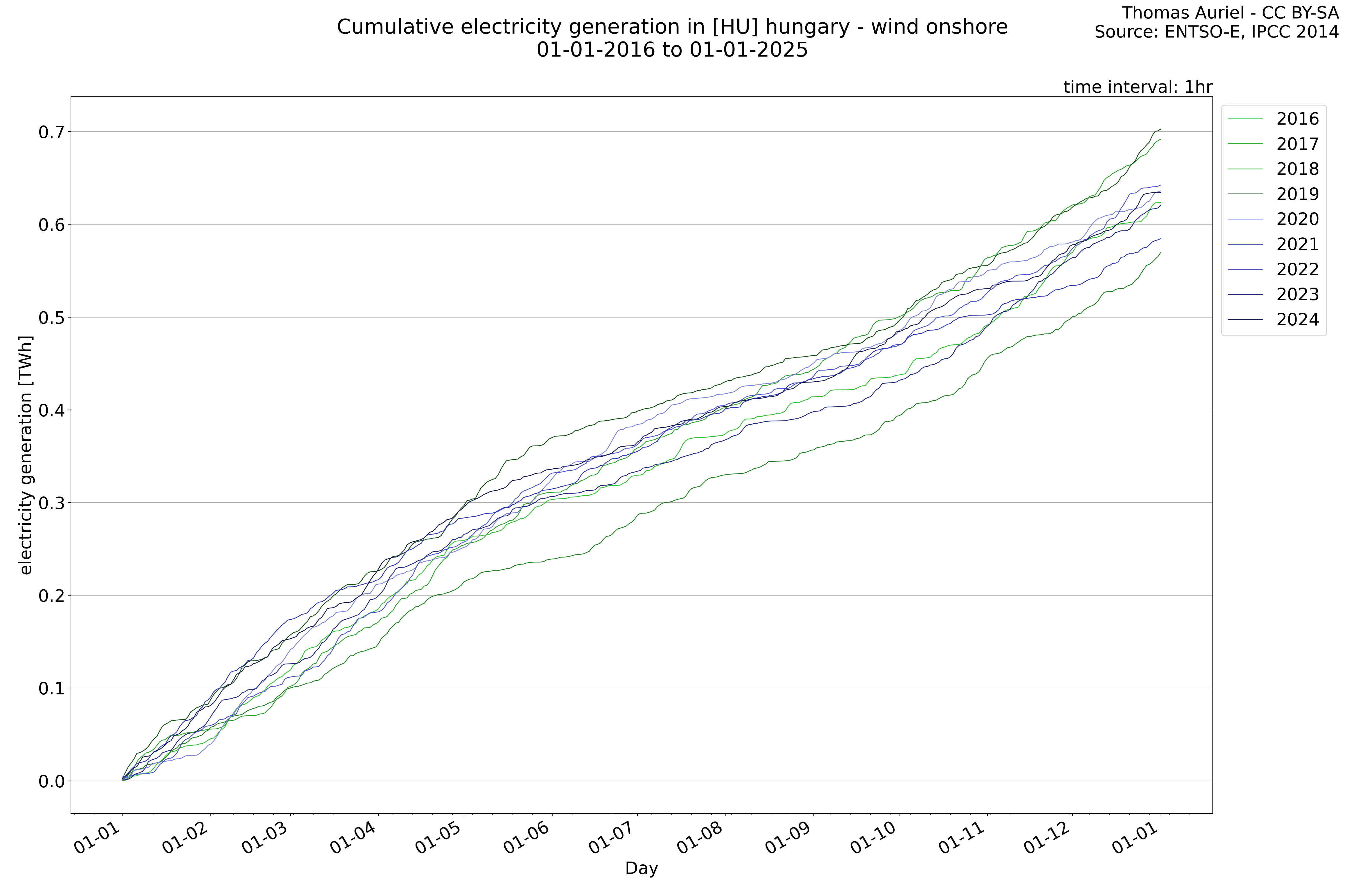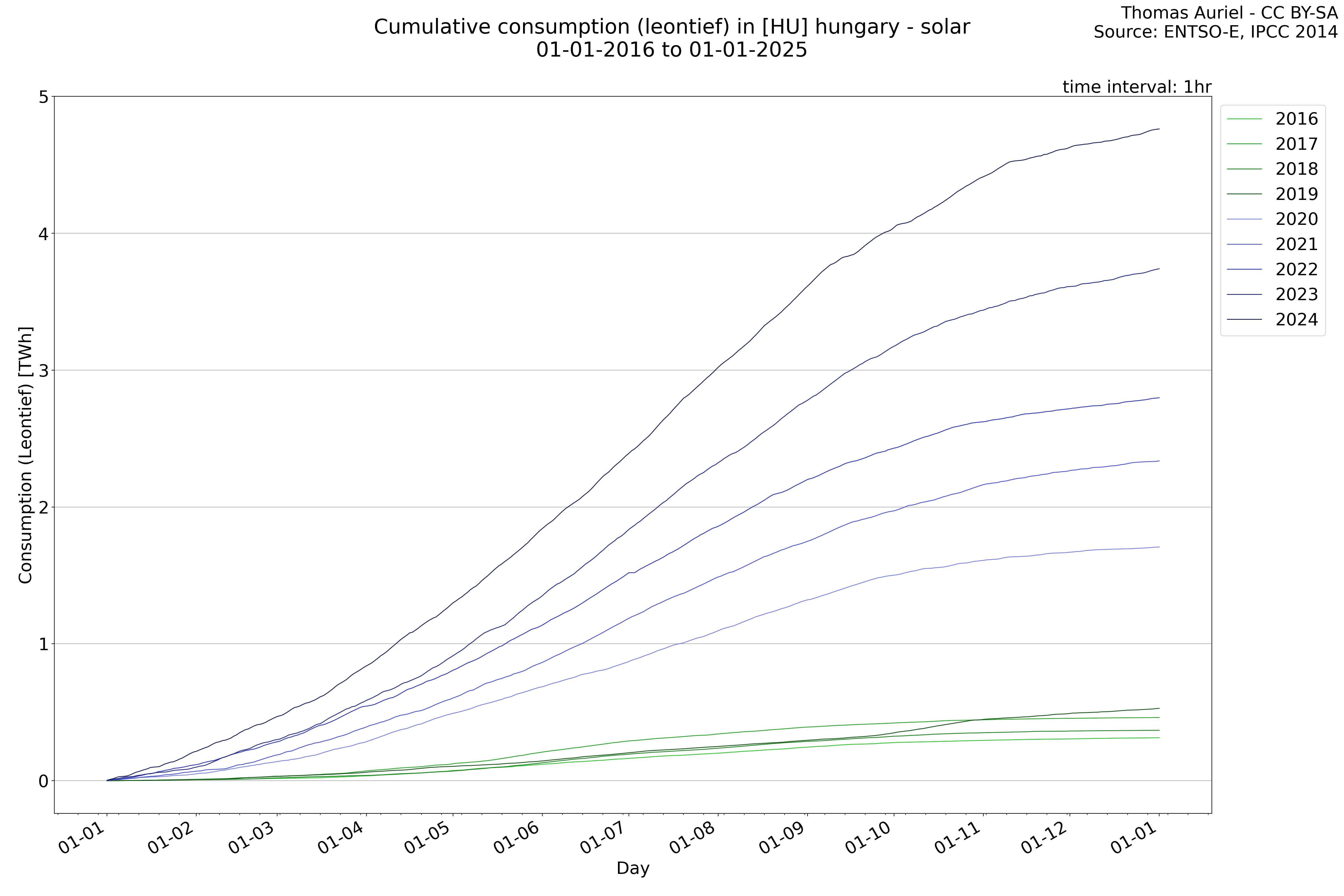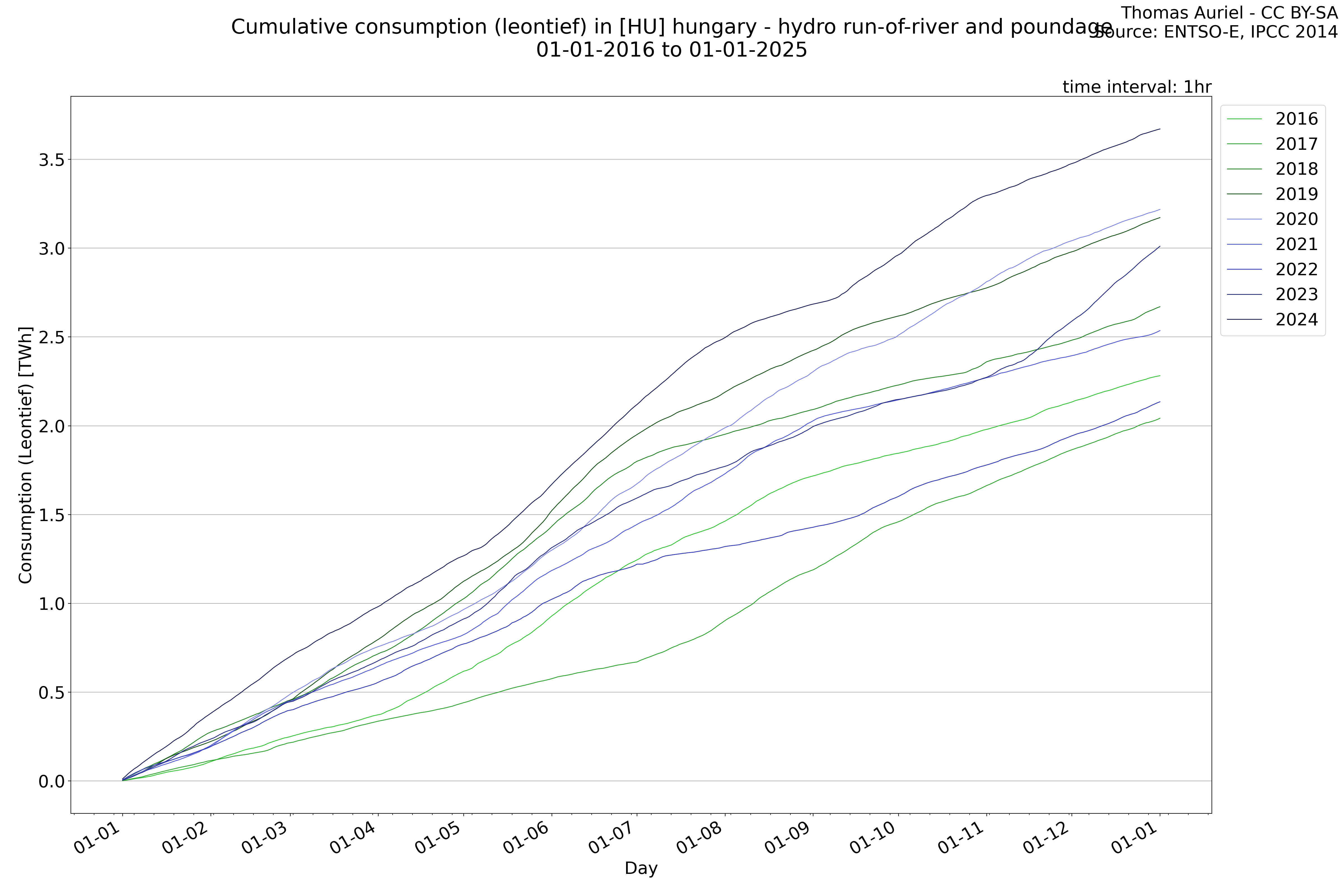 This plot is a cumulative sum plot, where each line represents the cumulative value of a specific metric (e.g., production, load, import, or export) for a given year. The plot begins at zero, and as the year progresses, the cumulative value is updated to reflect the total amount accumulated over time. This visualization illustrates the overall trend of the metric, showing whether the cumulative sum is increasing or decreasing, as well as any changes in the trend within the year. Additionally, the cumulative sum plot helps to reduce the impact of noise and short-term fluctuations commonly present in the raw data of production, load, import, or export. By smoothing out these variations, the plot emphasizes the broader, long-term trends. Consequently, this type of visualization facilitates a clearer understanding of the metric’s evolution across the year, revealing whether the activity follows a steady trajectory, shows signs of volatility, or experiences periods of significant change.