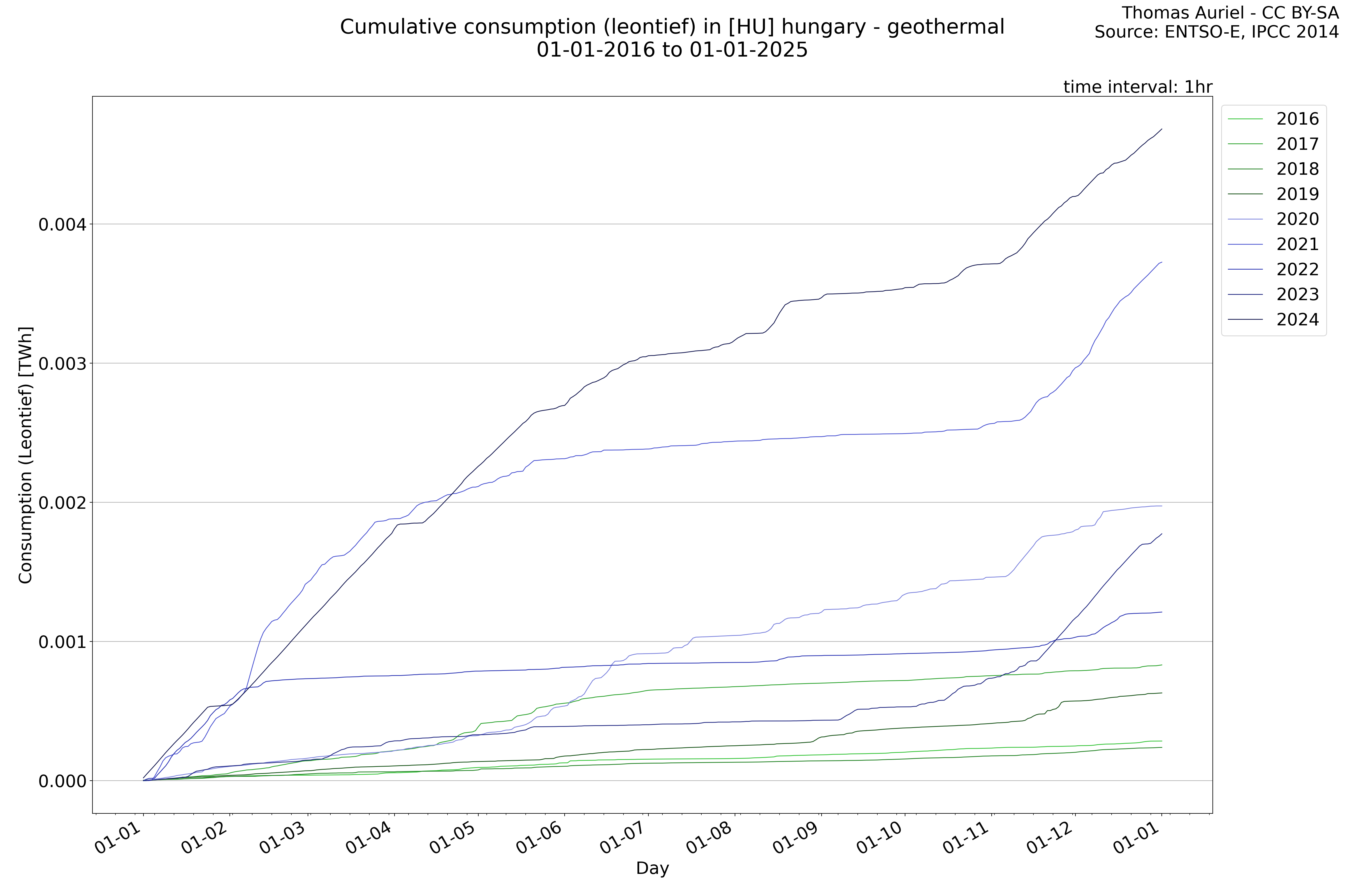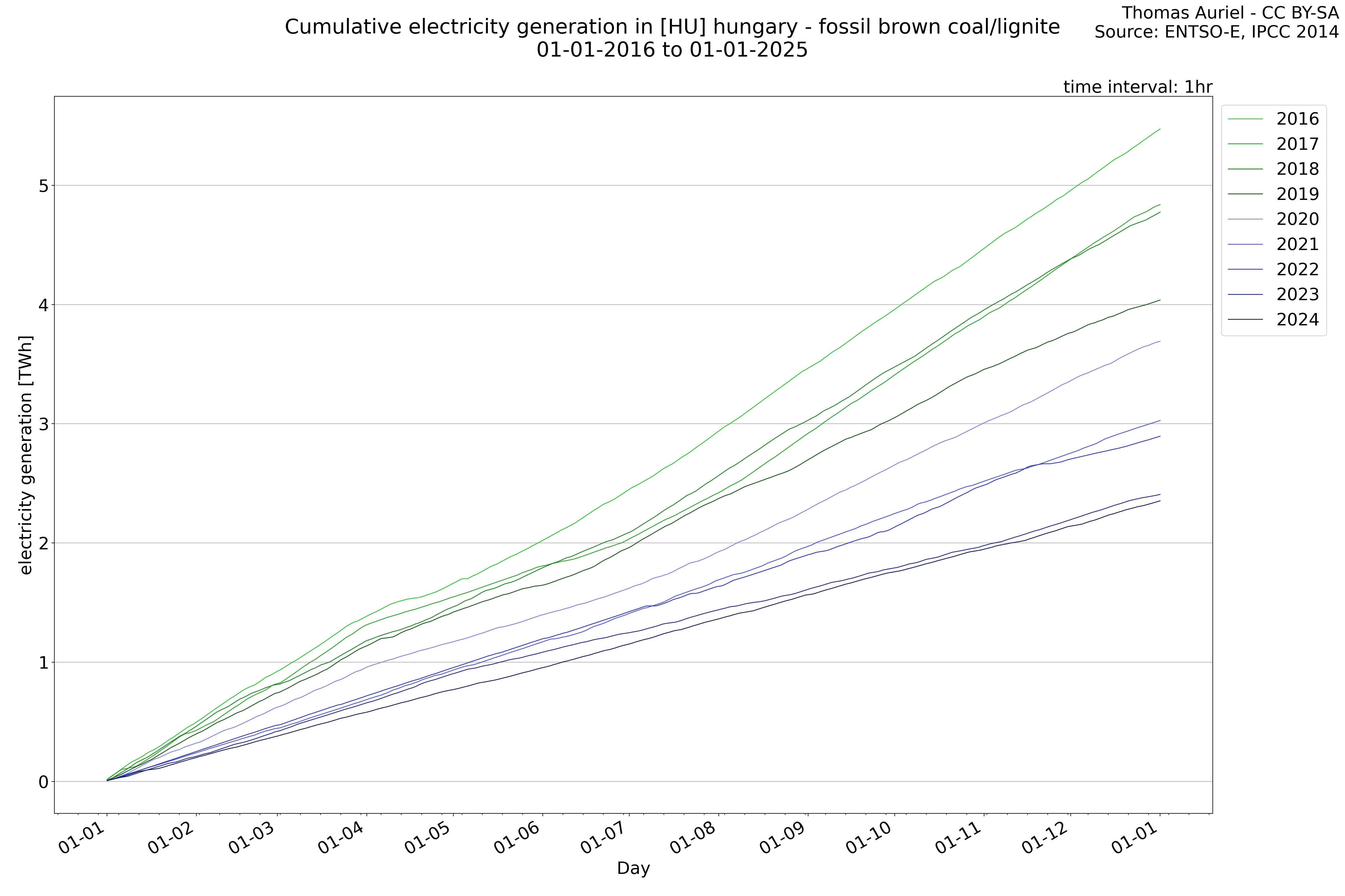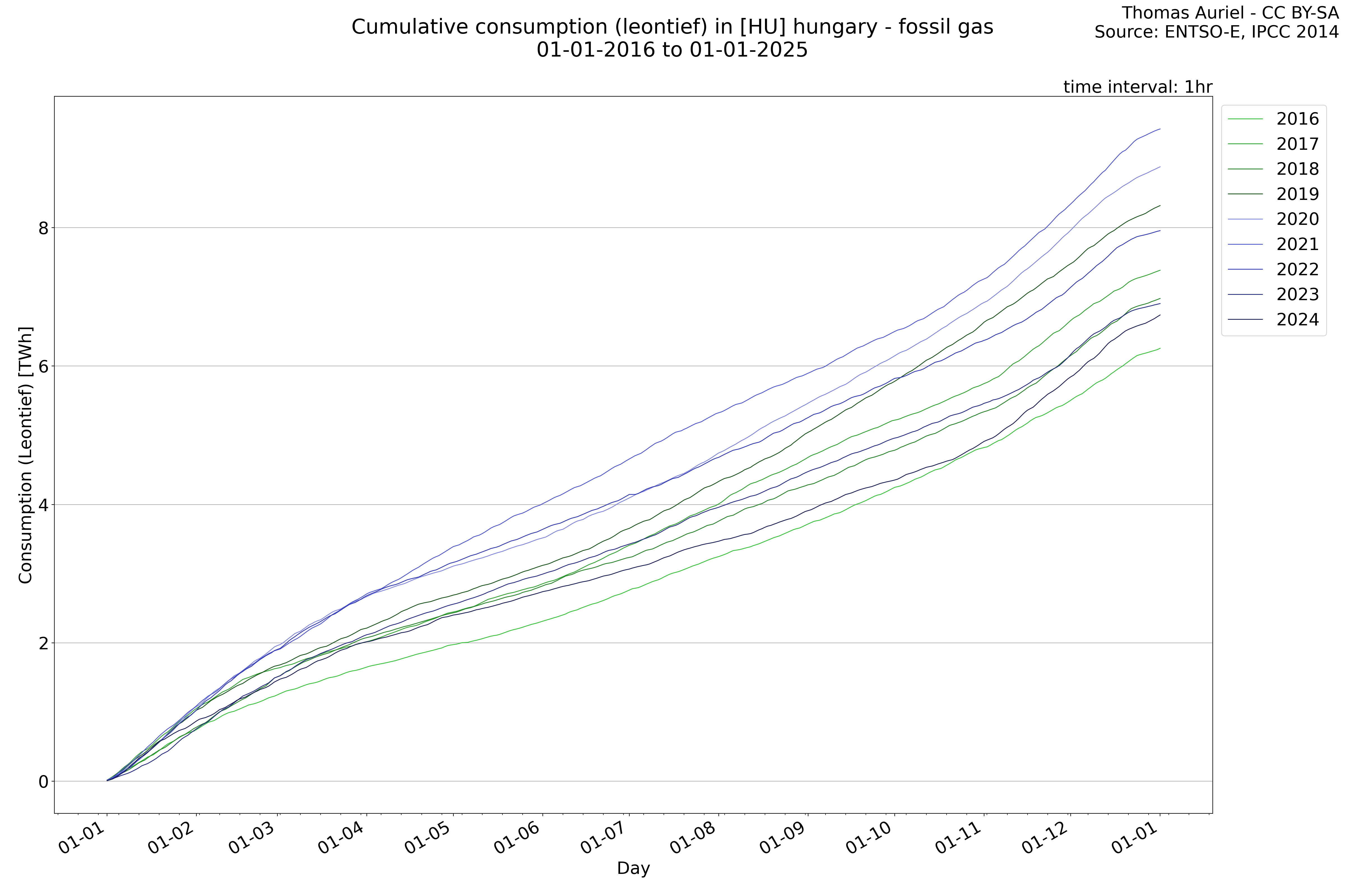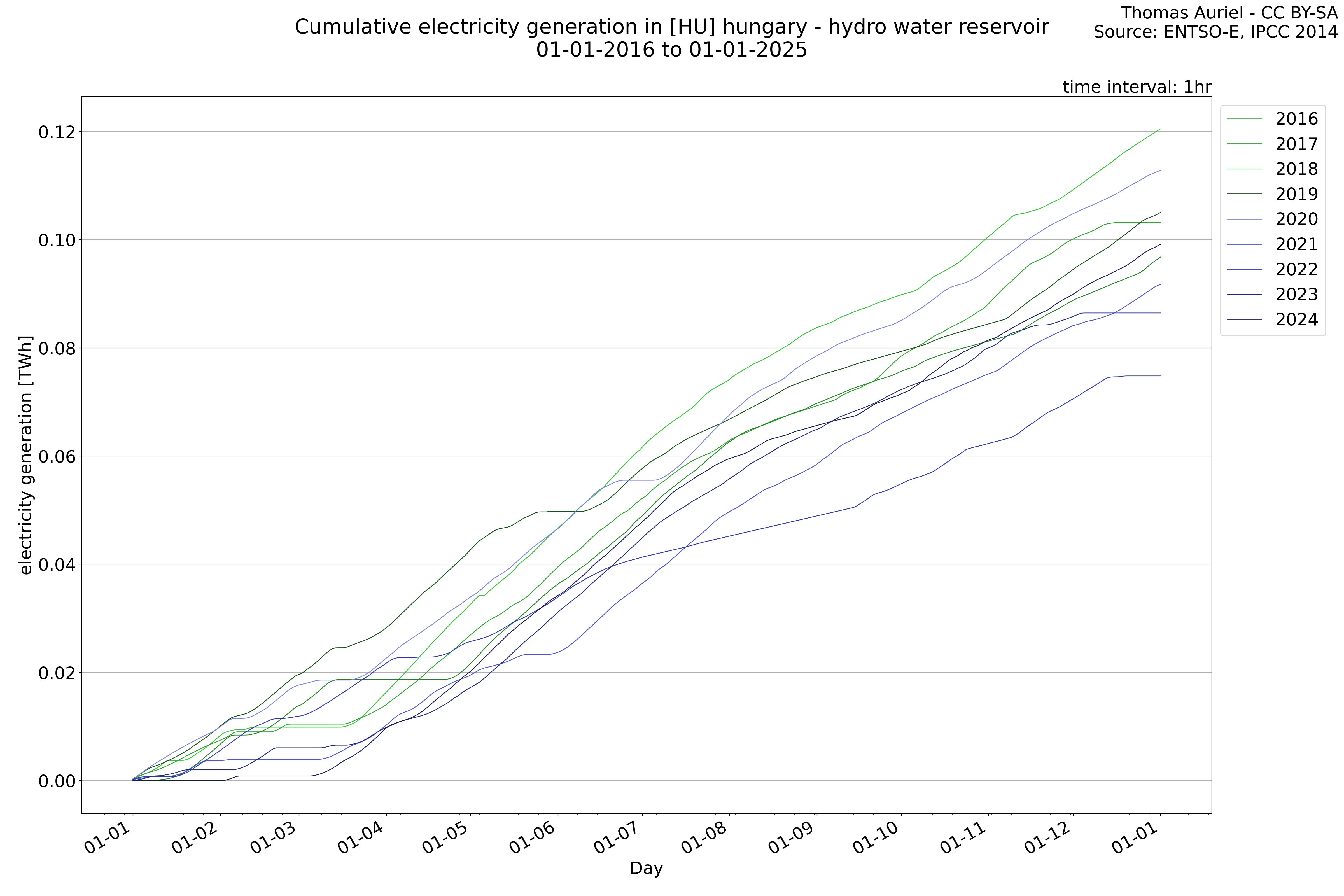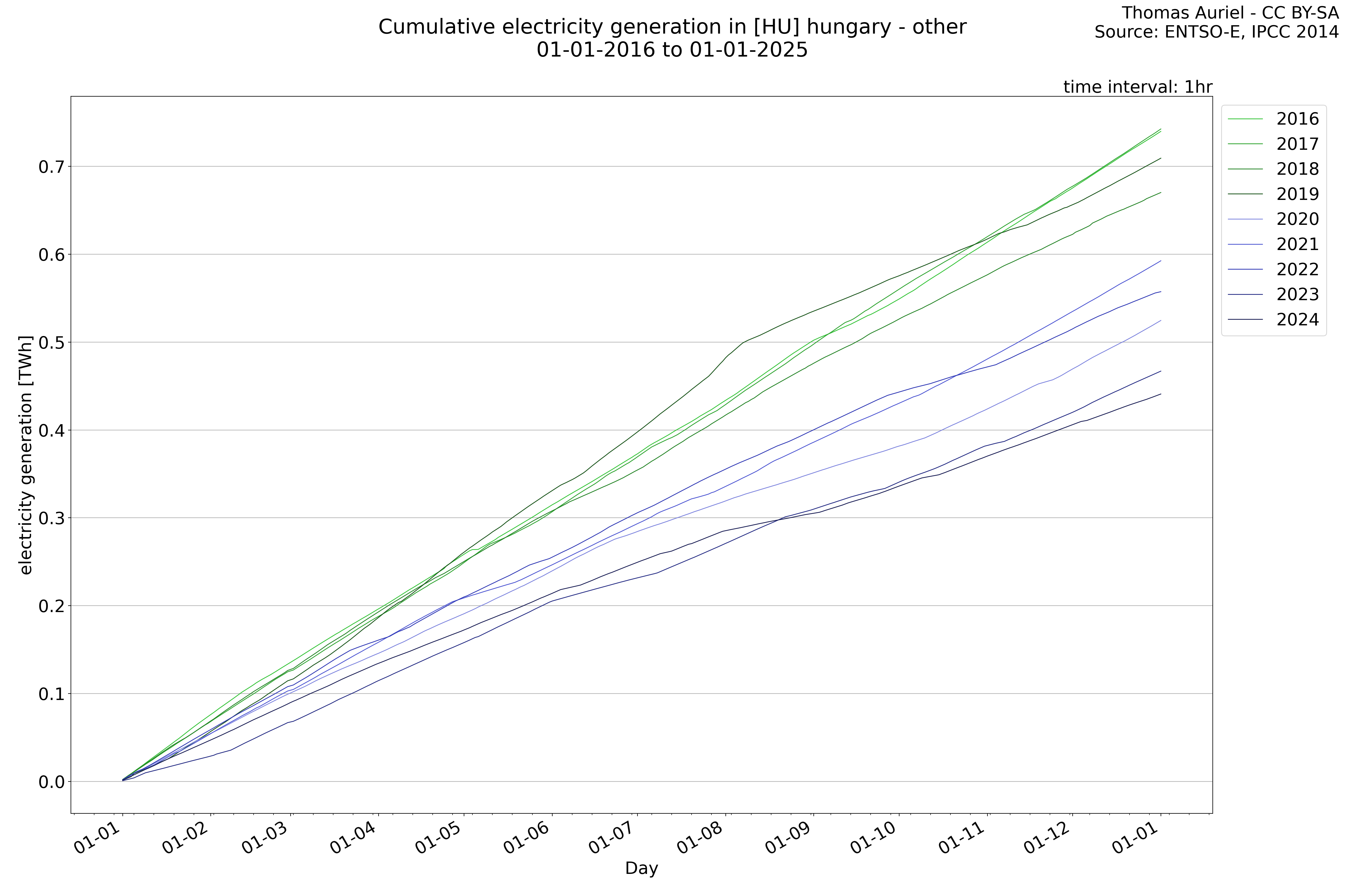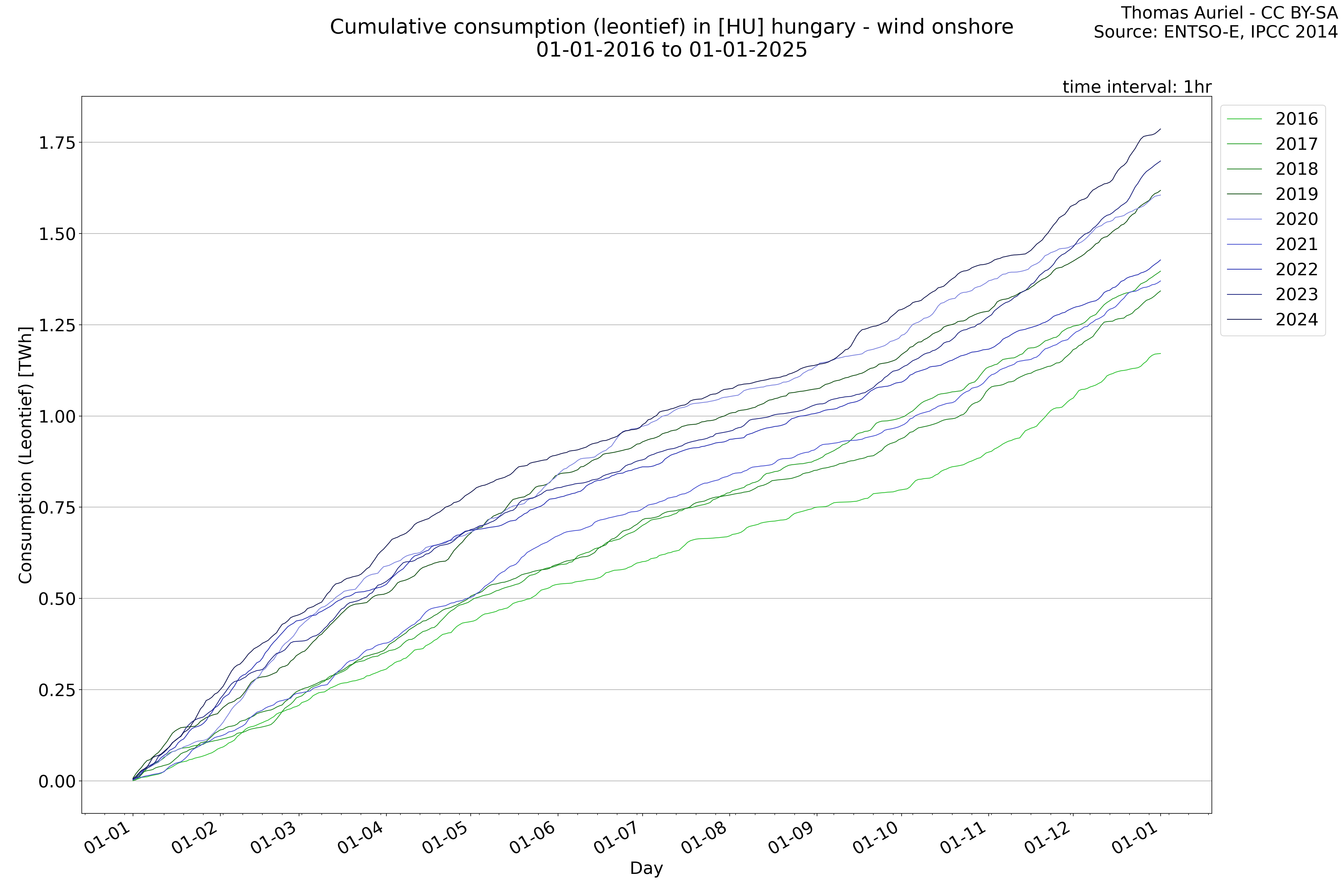 This plot is a cumulative sum plot, where each line represents the cumulative value of a specific metric (e.g., production, load, import, or export) for a given year. The plot begins at zero, and as the year progresses, the cumulative value is updated to reflect the total amount accumulated over time. This visualization illustrates the overall trend of the metric, showing whether the cumulative sum is increasing or decreasing, as well as any changes in the trend within the year. Additionally, the cumulative sum plot helps to reduce the impact of noise and short-term fluctuations commonly present in the raw data of production, load, import, or export. By smoothing out these variations, the plot emphasizes the broader, long-term trends. Consequently, this type of visualization facilitates a clearer understanding of the metric’s evolution across the year, revealing whether the activity follows a steady trajectory, shows signs of volatility, or experiences periods of significant change.