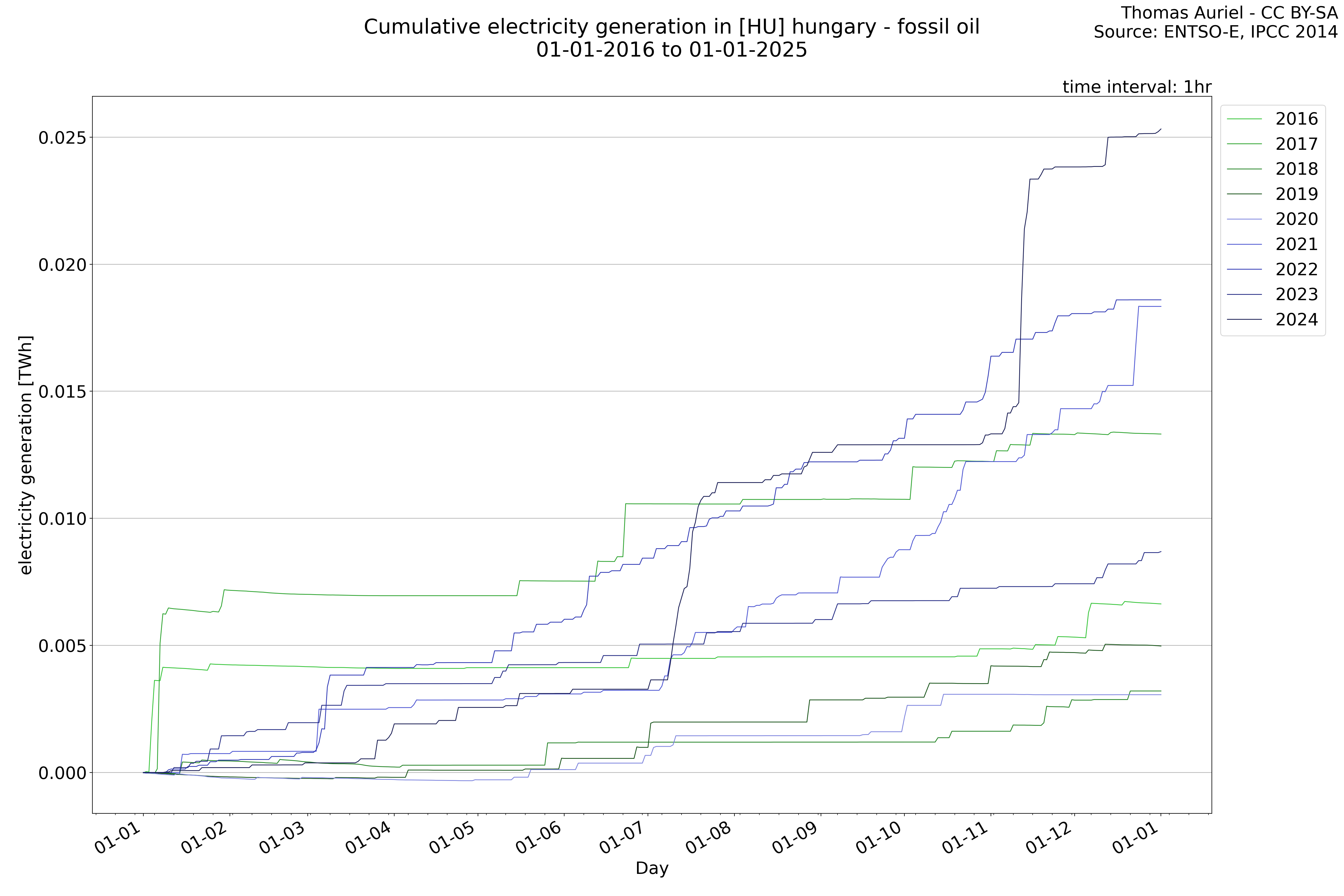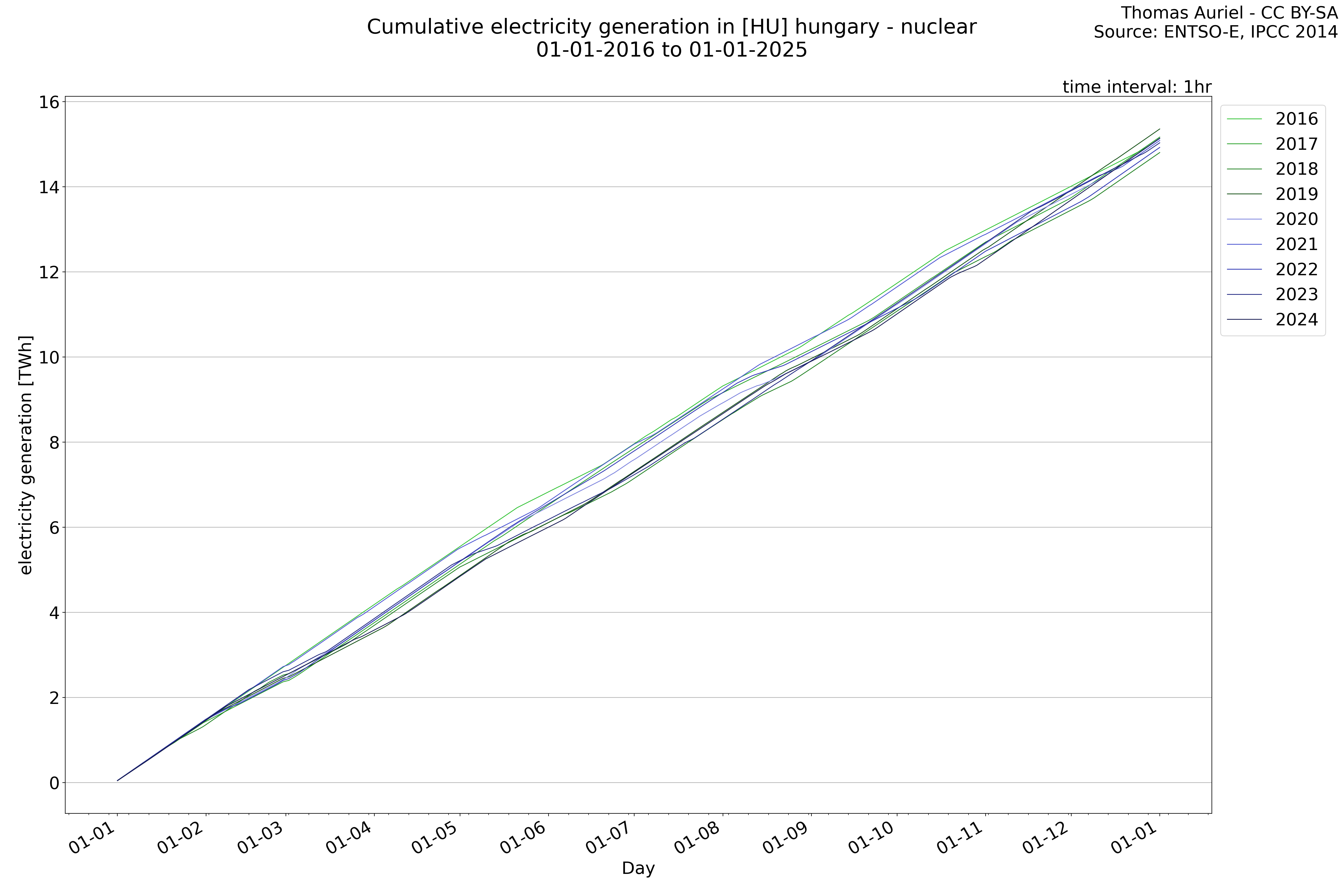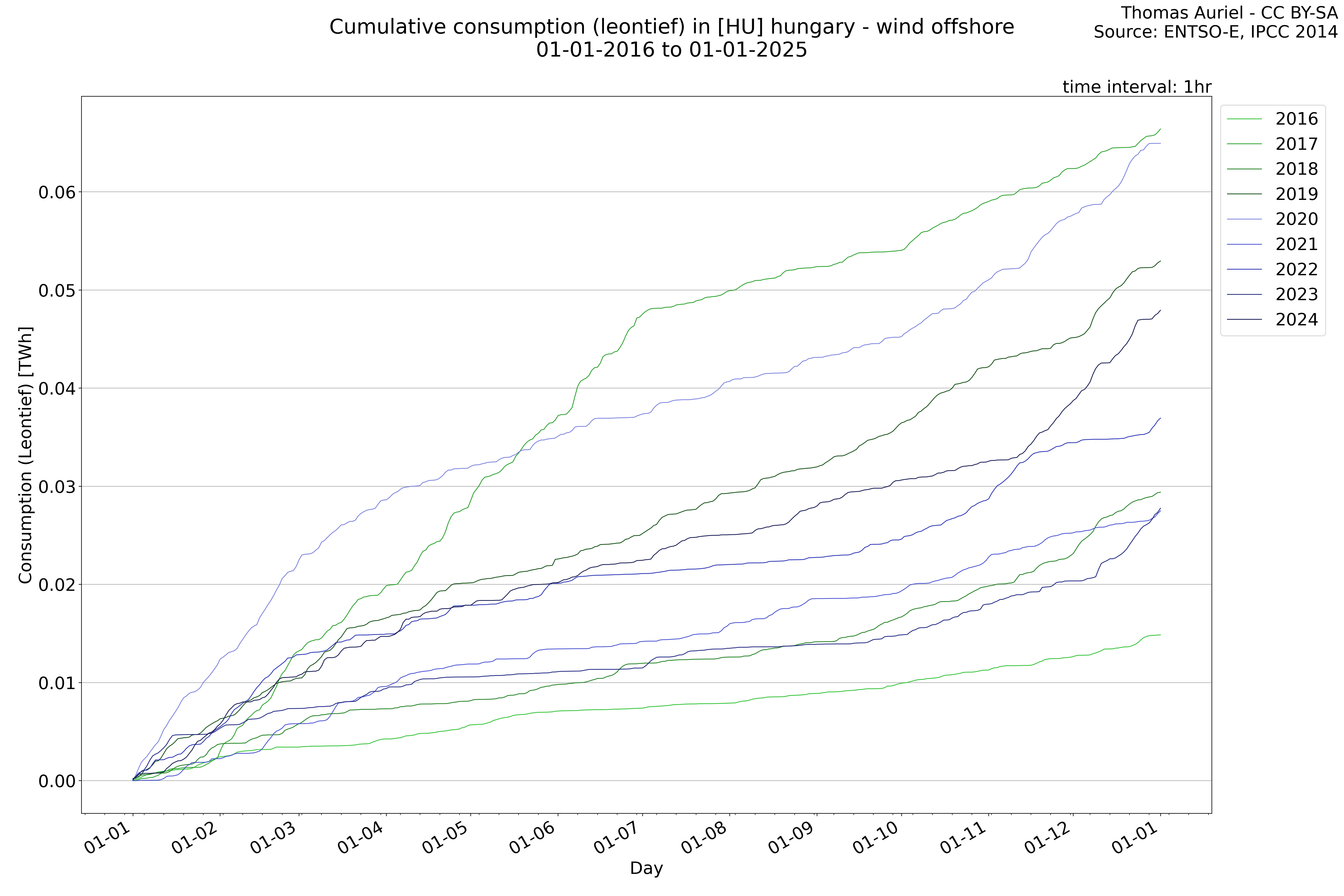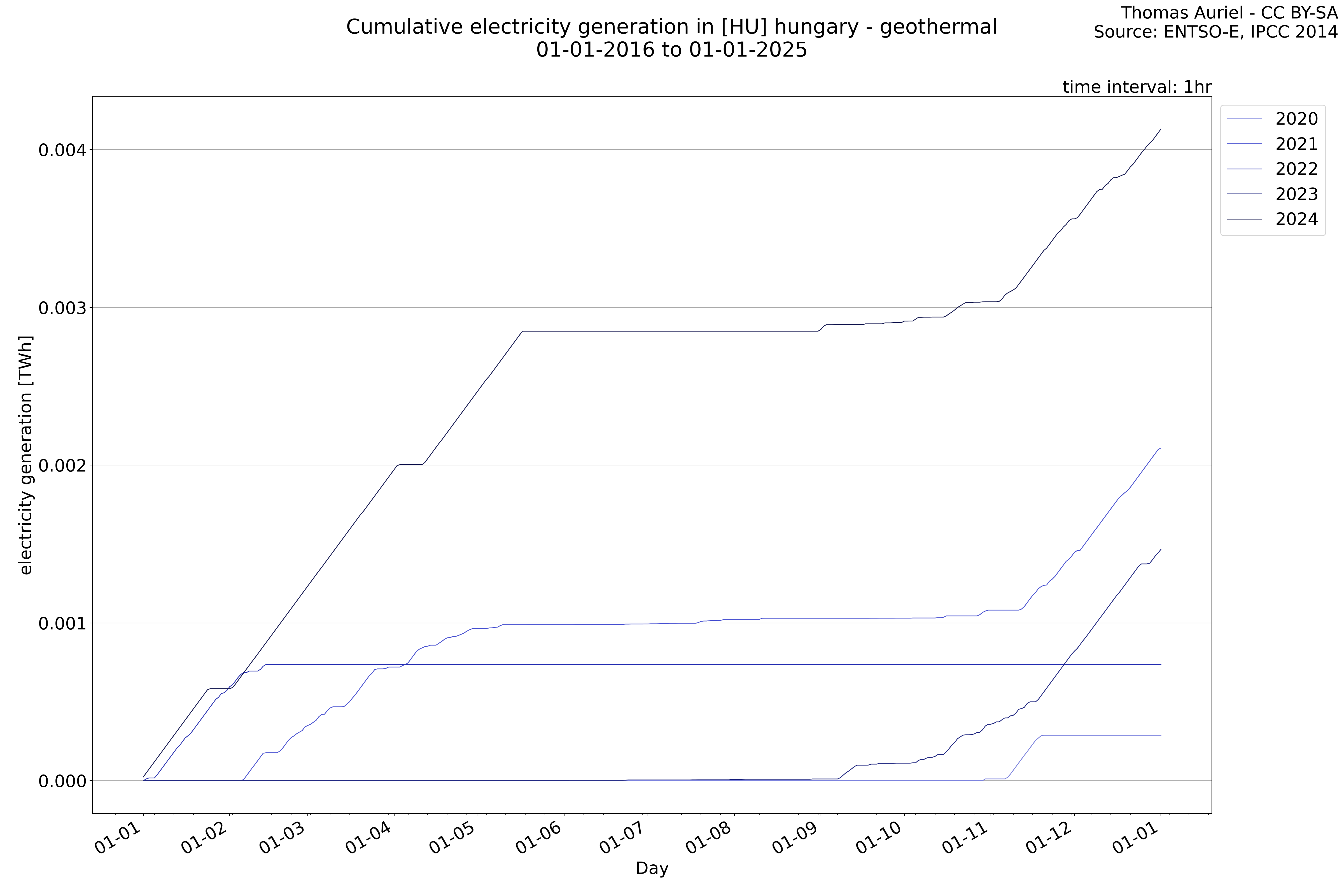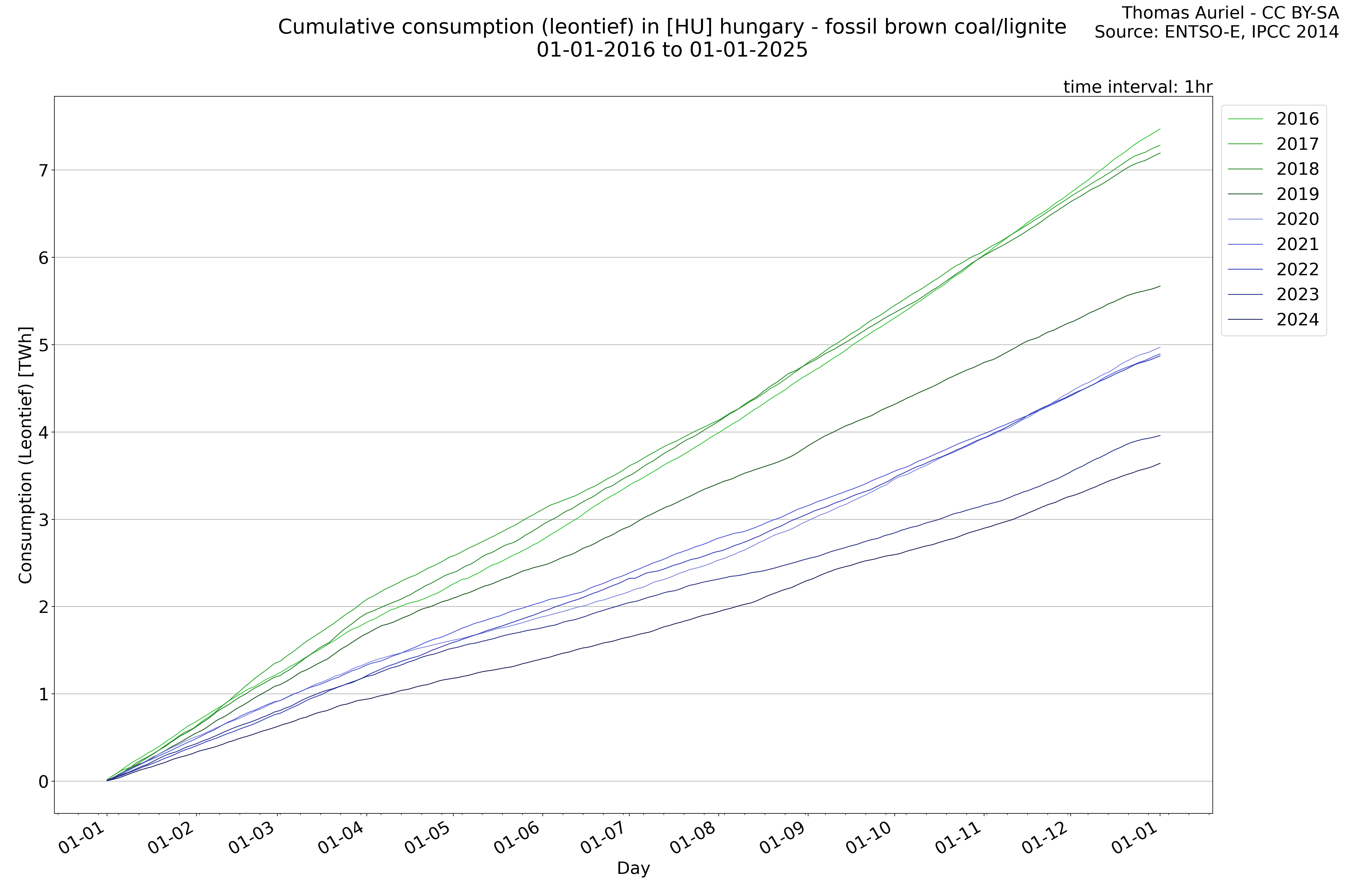 This plot is a cumulative sum plot, where each line represents the cumulative value of a specific metric (e.g., production, load, import, or export) for a given year. The plot begins at zero, and as the year progresses, the cumulative value is updated to reflect the total amount accumulated over time. This visualization illustrates the overall trend of the metric, showing whether the cumulative sum is increasing or decreasing, as well as any changes in the trend within the year. Additionally, the cumulative sum plot helps to reduce the impact of noise and short-term fluctuations commonly present in the raw data of production, load, import, or export. By smoothing out these variations, the plot emphasizes the broader, long-term trends. Consequently, this type of visualization facilitates a clearer understanding of the metric’s evolution across the year, revealing whether the activity follows a steady trajectory, shows signs of volatility, or experiences periods of significant change.