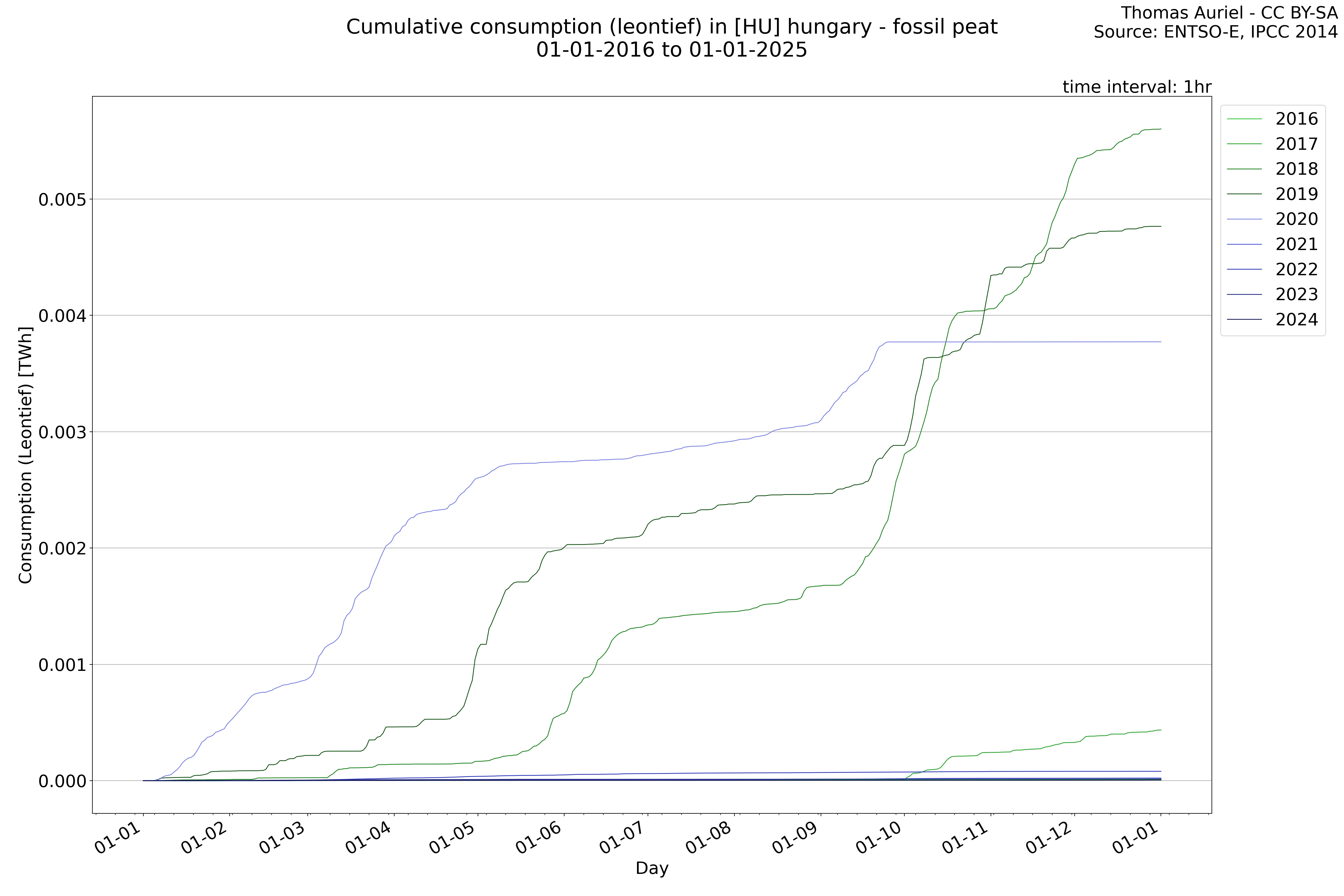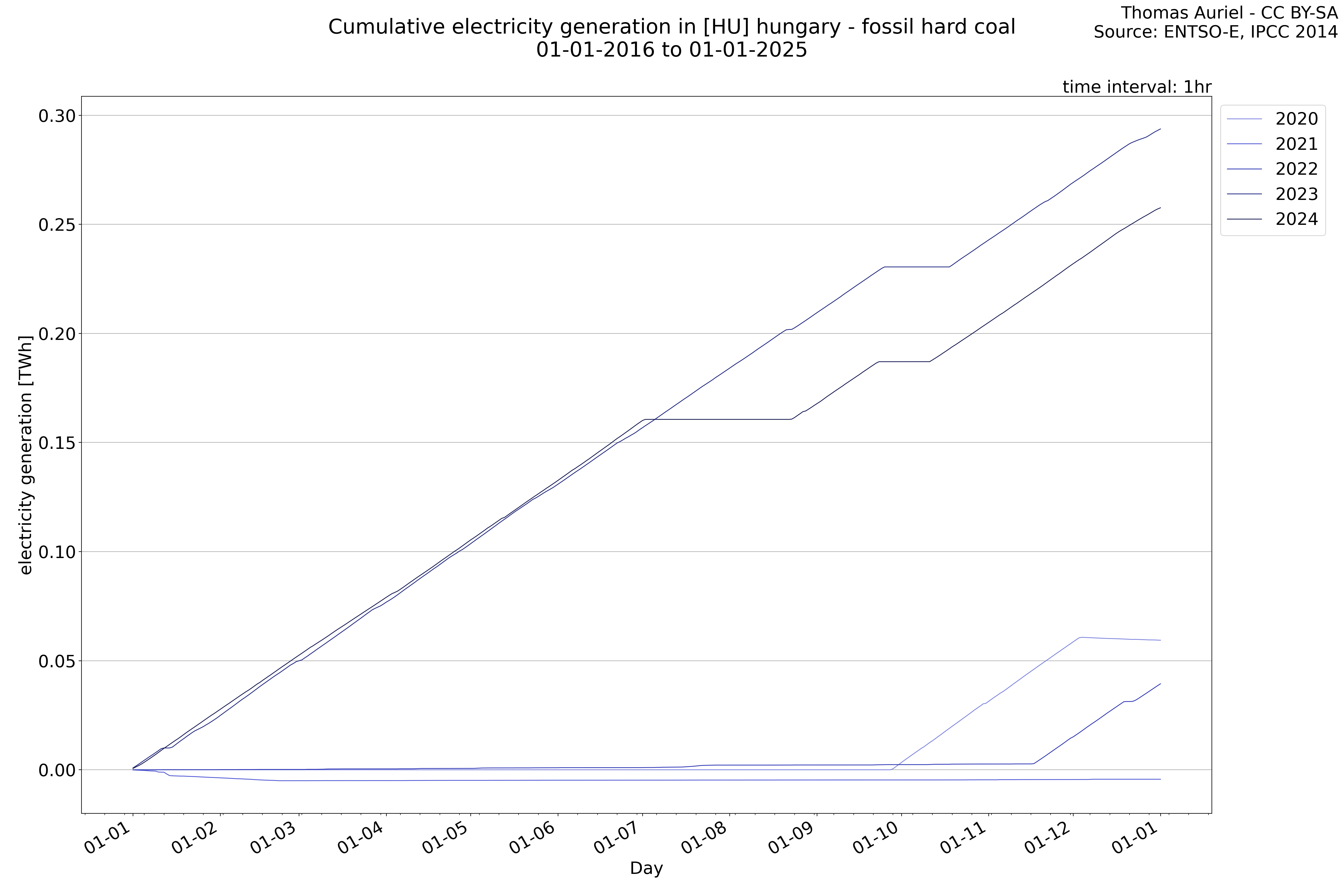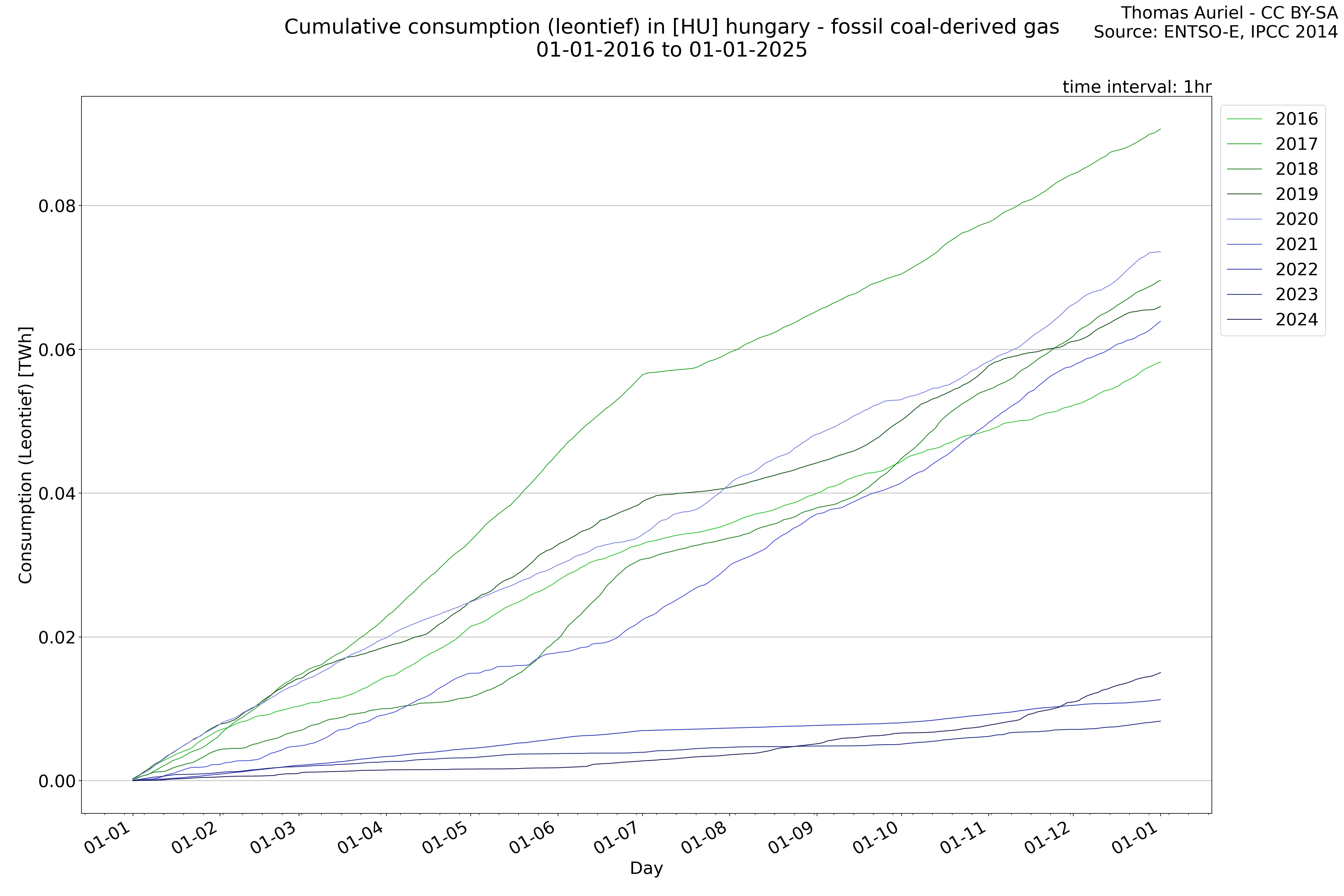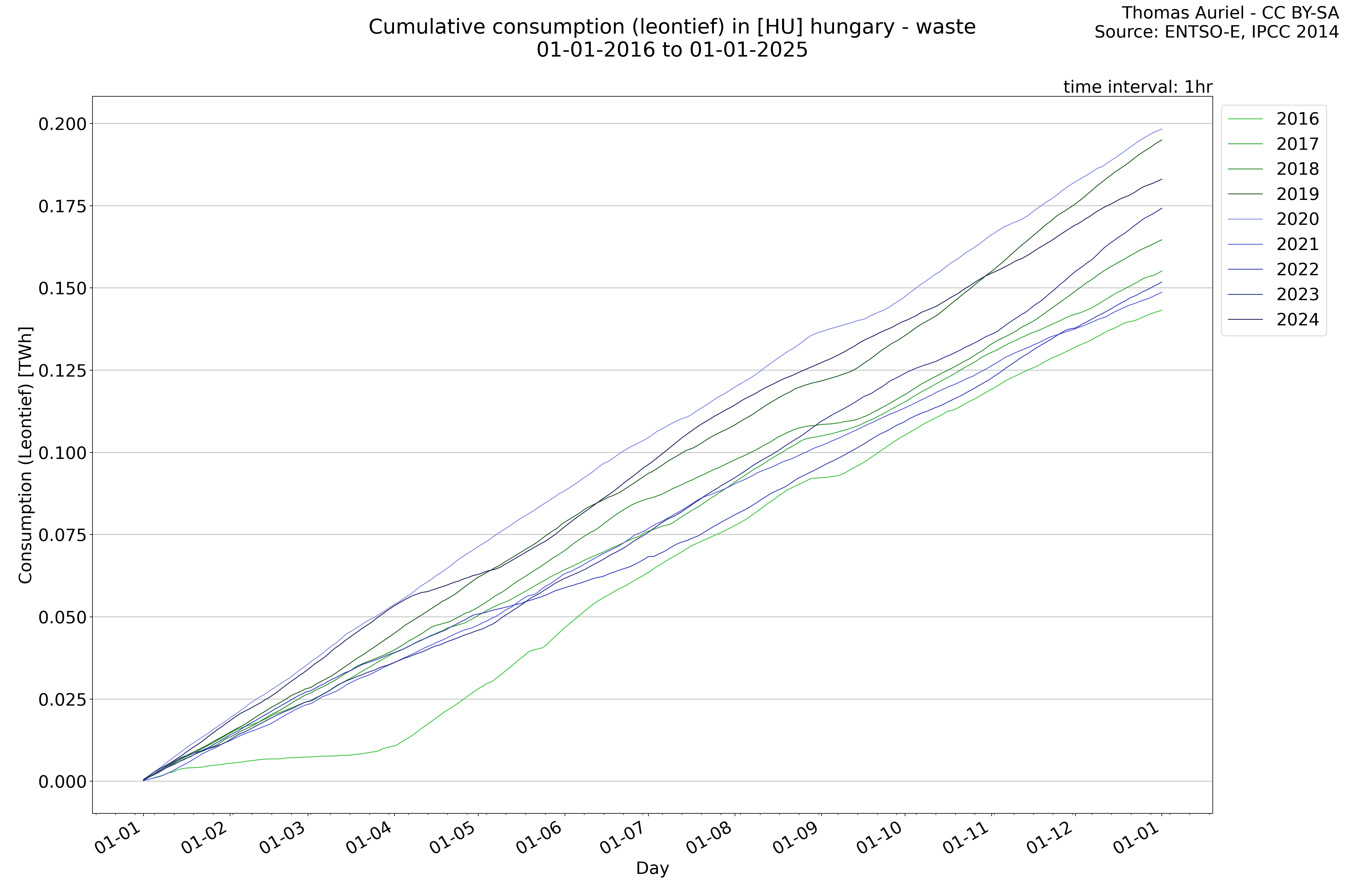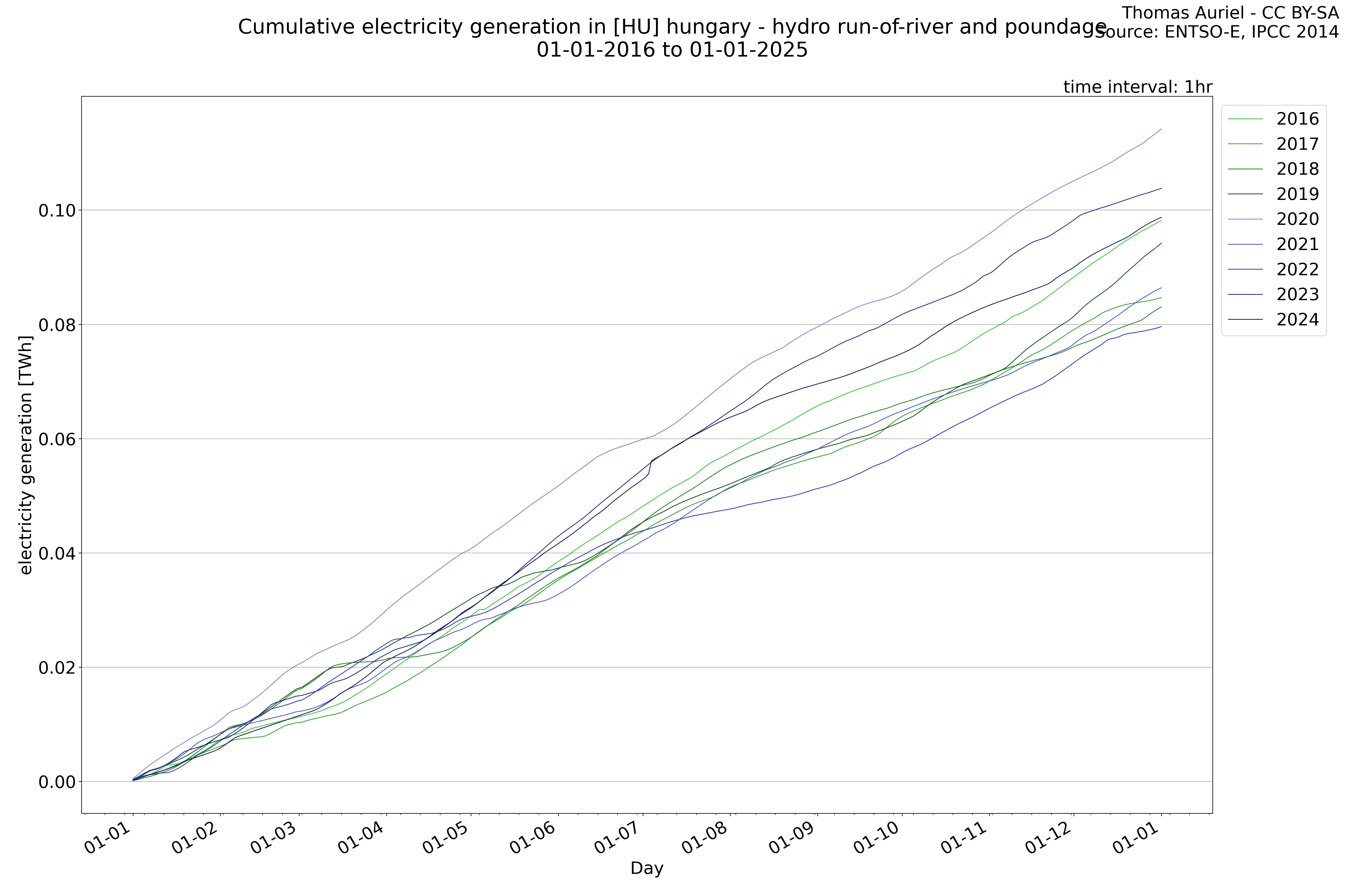This plot is a cumulative sum plot, where each line represents the cumulative value of a specific metric (e.g., production, load, import, or export) for a given year. The plot begins at zero, and as the year progresses, the cumulative value is updated to reflect the total amount accumulated over time. This visualization illustrates the overall trend of the metric, showing whether the cumulative sum is increasing or decreasing, as well as any changes in the trend within the year. Additionally, the cumulative sum plot helps to reduce the impact of noise and short-term fluctuations commonly present in the raw data of production, load, import, or export. By smoothing out these variations, the plot emphasizes the broader, long-term trends. Consequently, this type of visualization facilitates a clearer understanding of the metric’s evolution across the year, revealing whether the activity follows a steady trajectory, shows signs of volatility, or experiences periods of significant change.