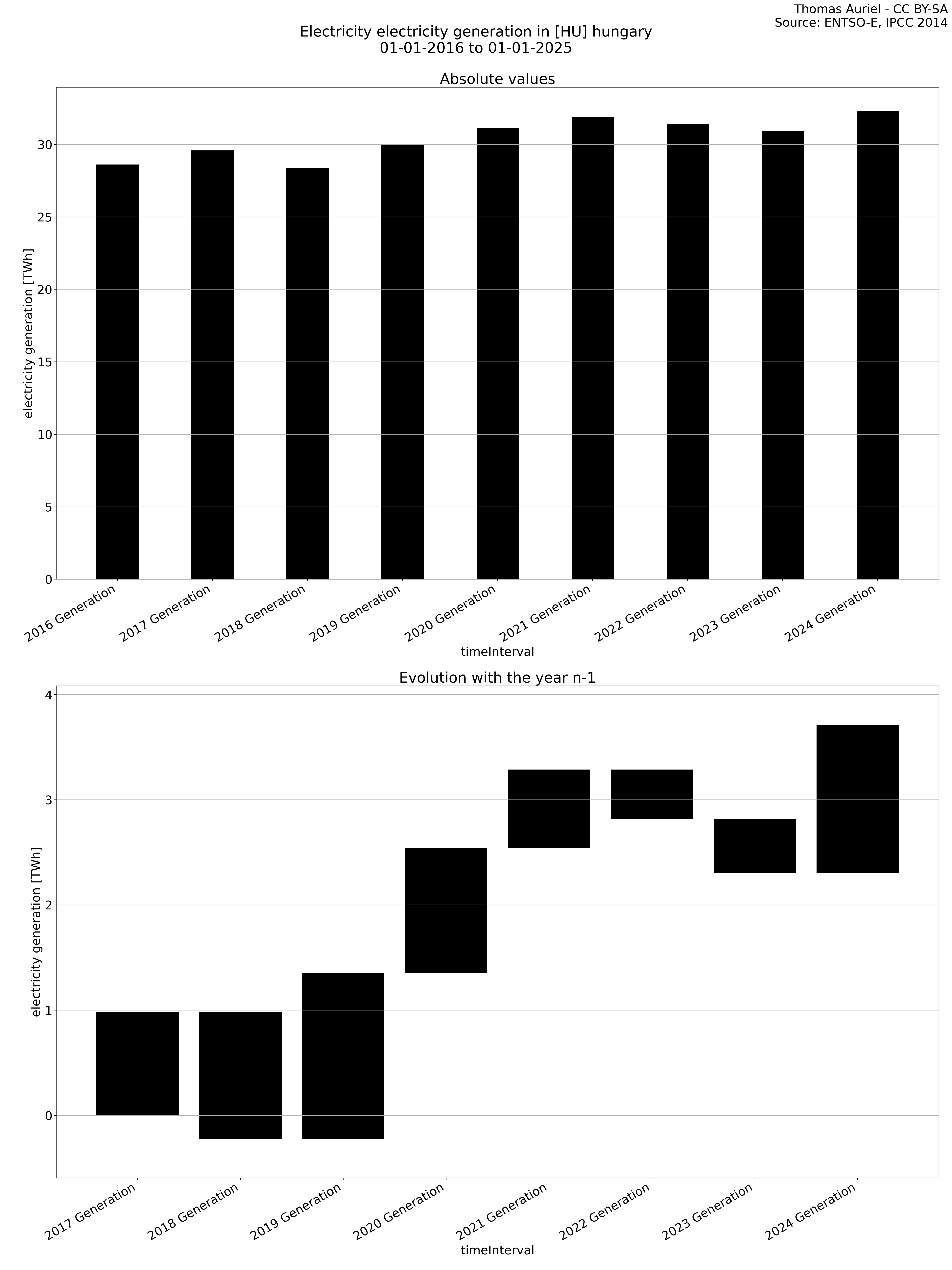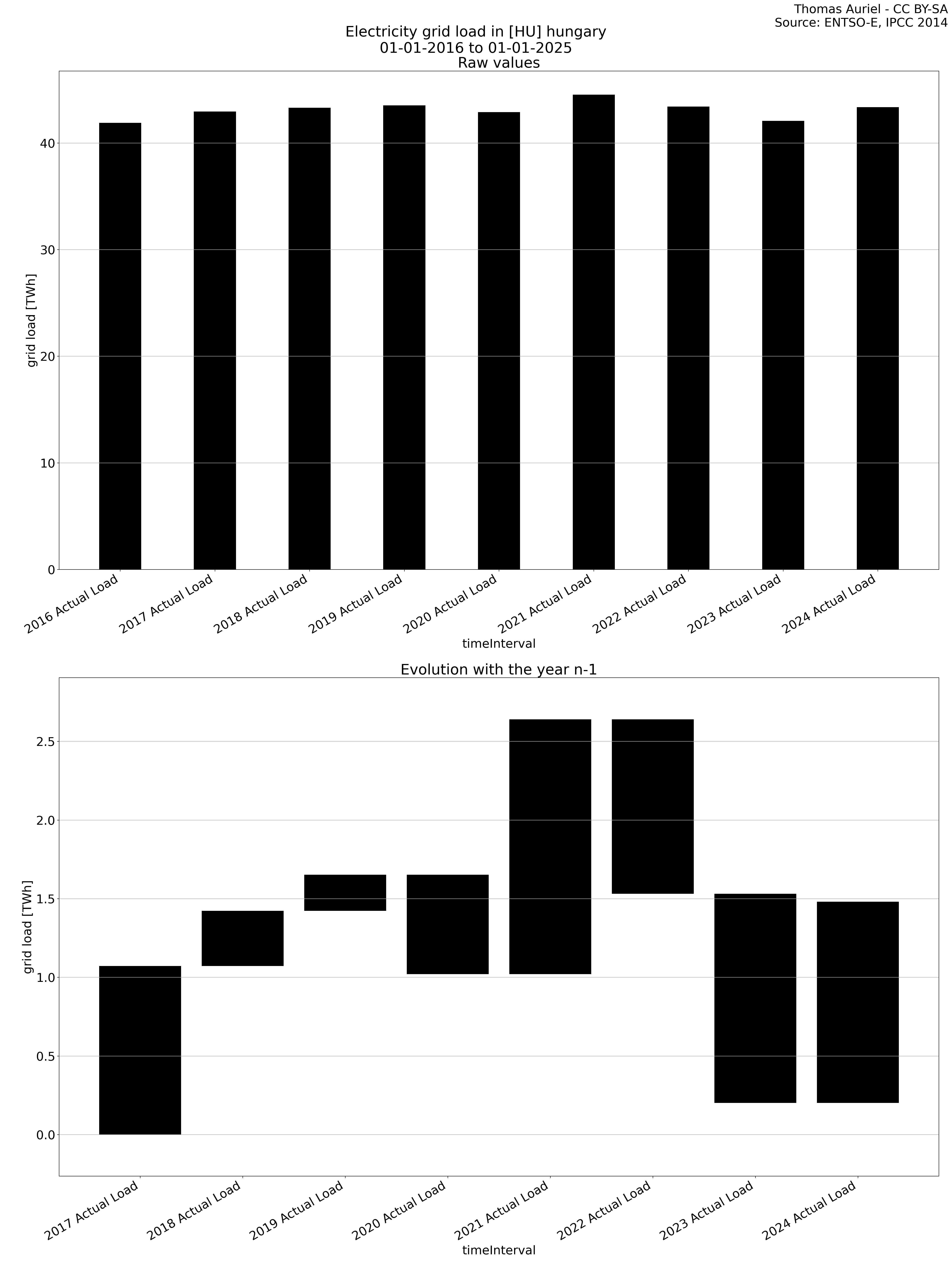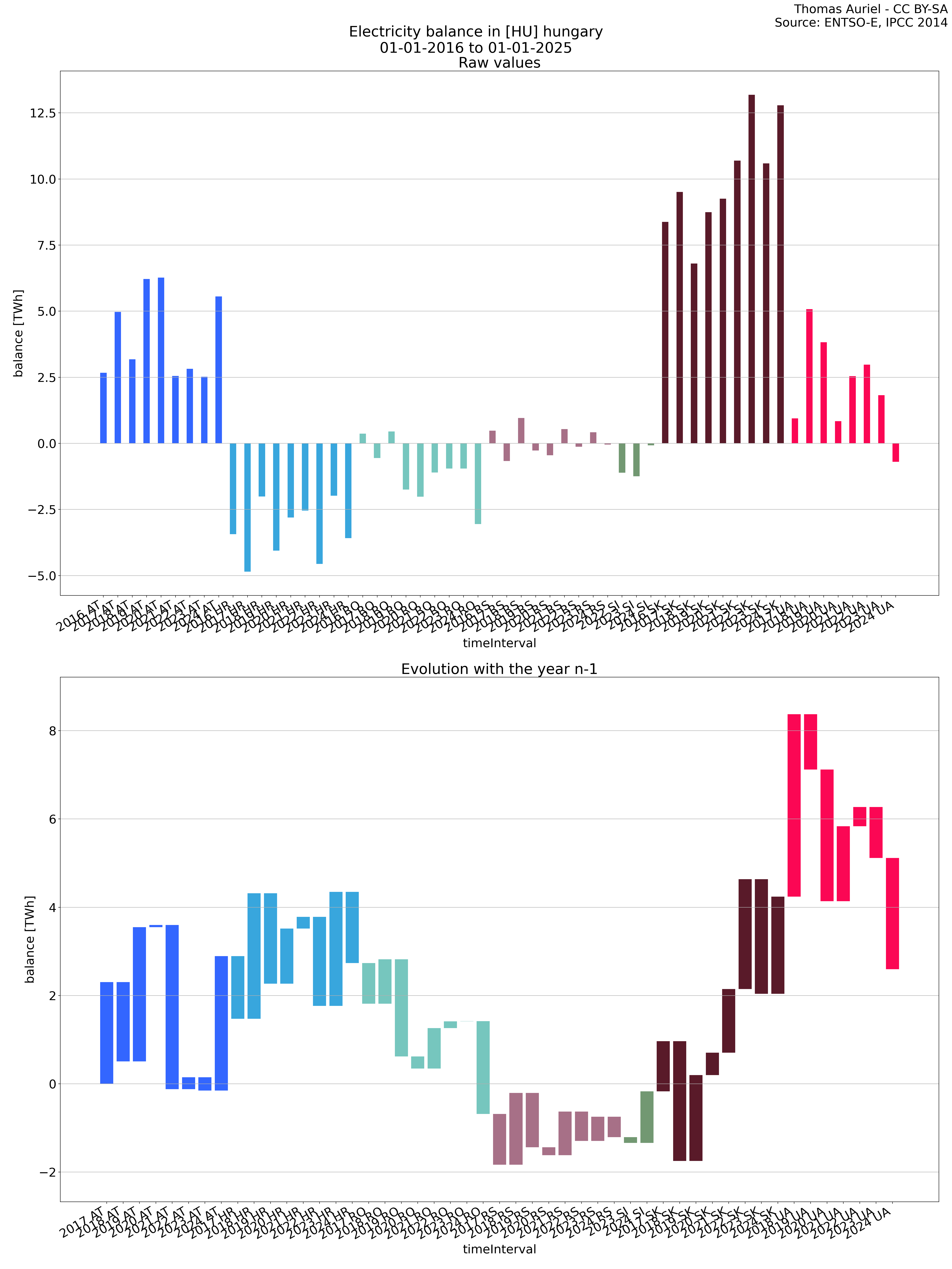 The second section features a waterfall graph, which visually represents the year-over-year changes in electricity metrics. In this graph, the length of each bar corresponds to the difference in the metric (e.g., production, load, etc.) compared to the previous year. Unlike the bar plot, the bars in the waterfall graph do not start at zero; instead, each bar begins where the previous one ended. Hence, this structure emphasizes the incremental changes in the metric over time, facilitating the visualization of fluctuations from one year to the next.