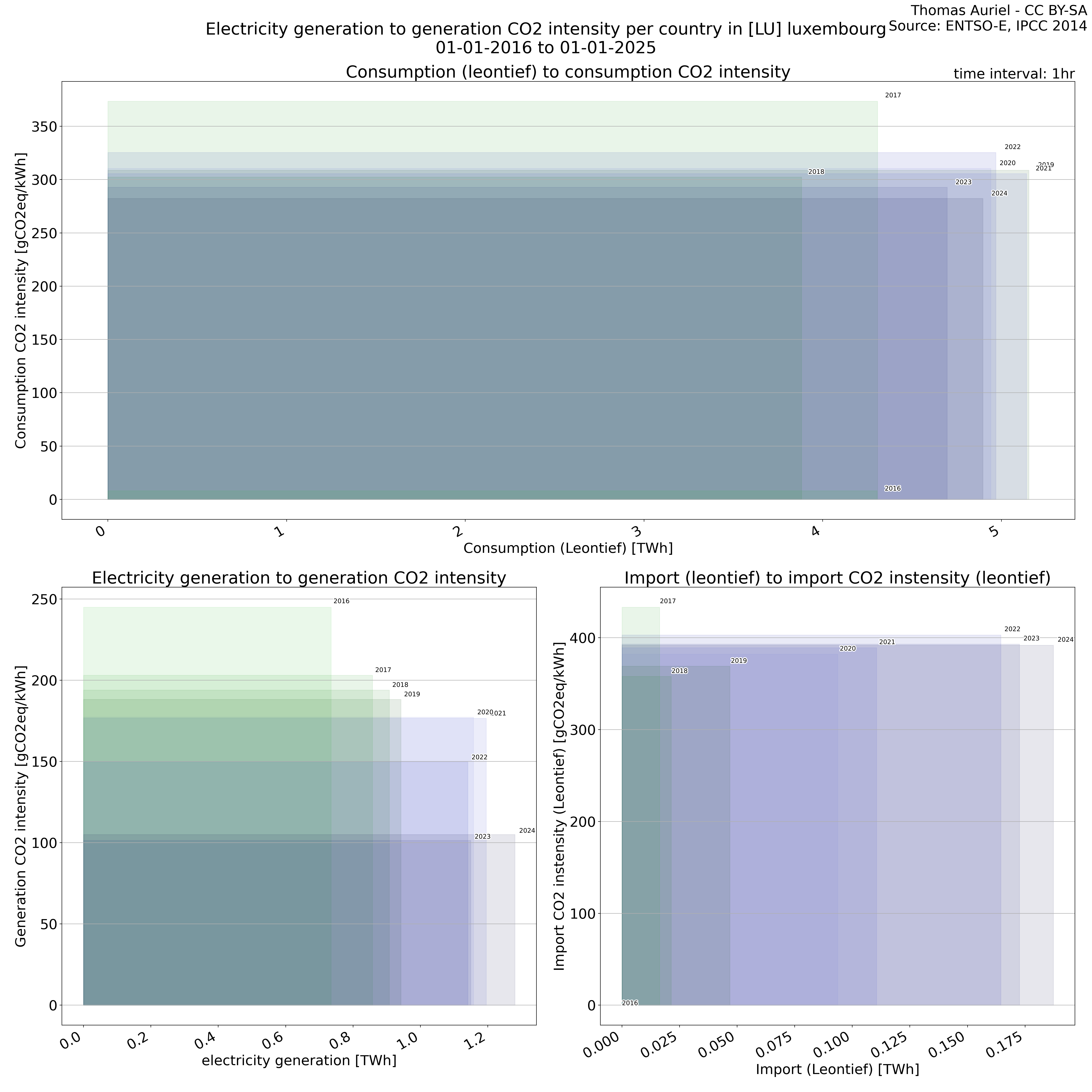 The plot consists of squares, each representing a single year, designed to illustrate electricity-related metrics and their associated environmental impacts. The length of each square corresponds to the total electricity consumption, generation, or imports during the year, with longer squares indicating higher overall values for the respective metric. The height of each square represents the average CO₂ intensity (e.g., grams of CO₂ per kWh) associated with electricity consumption, generation, or imports; hence, taller squares signify greater environmental impact per unit of electricity. Finally, the surface area of each square, determined by the product of its length and height, represents the total CO₂ emissions associated with the respective activity in the given year.