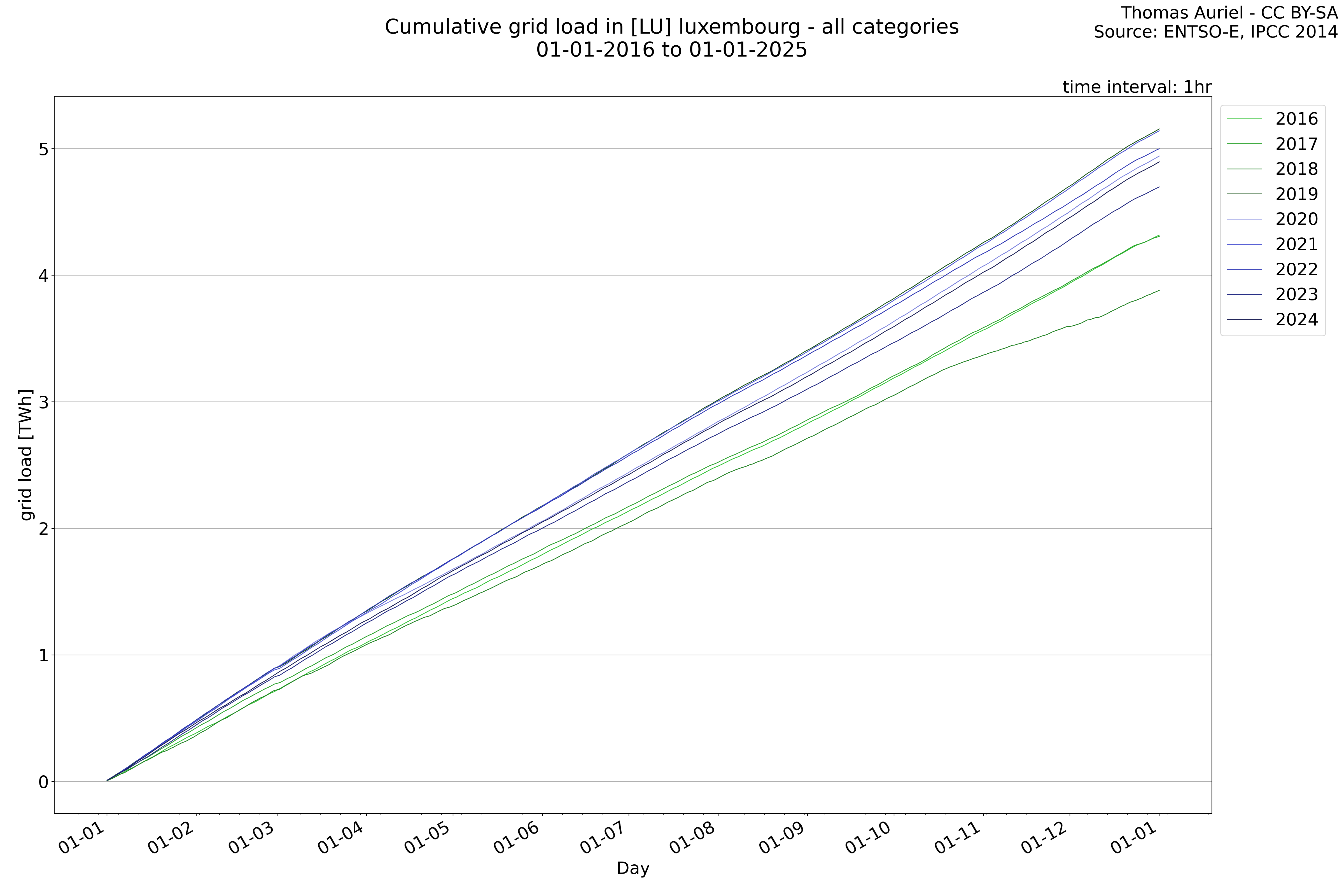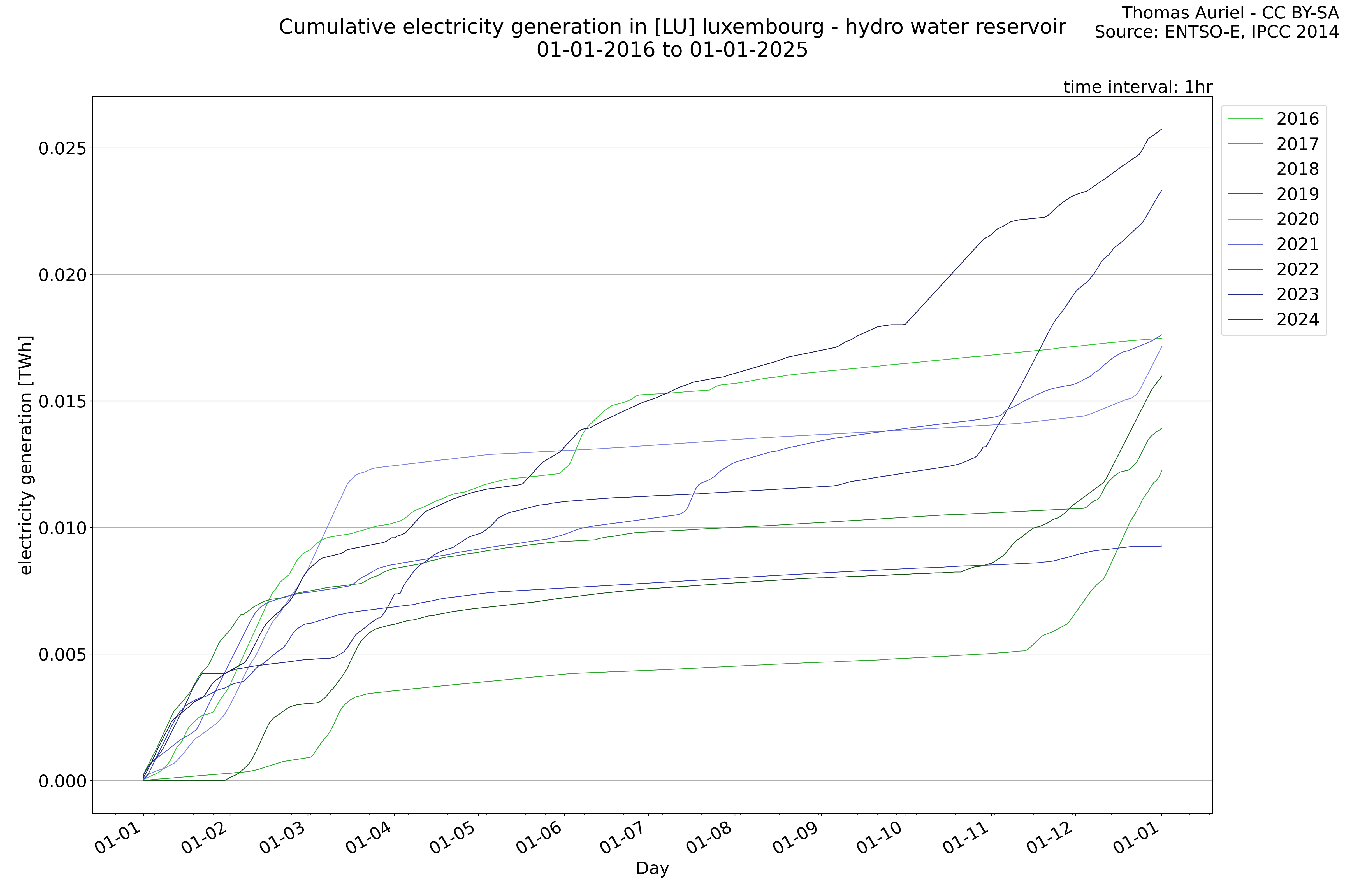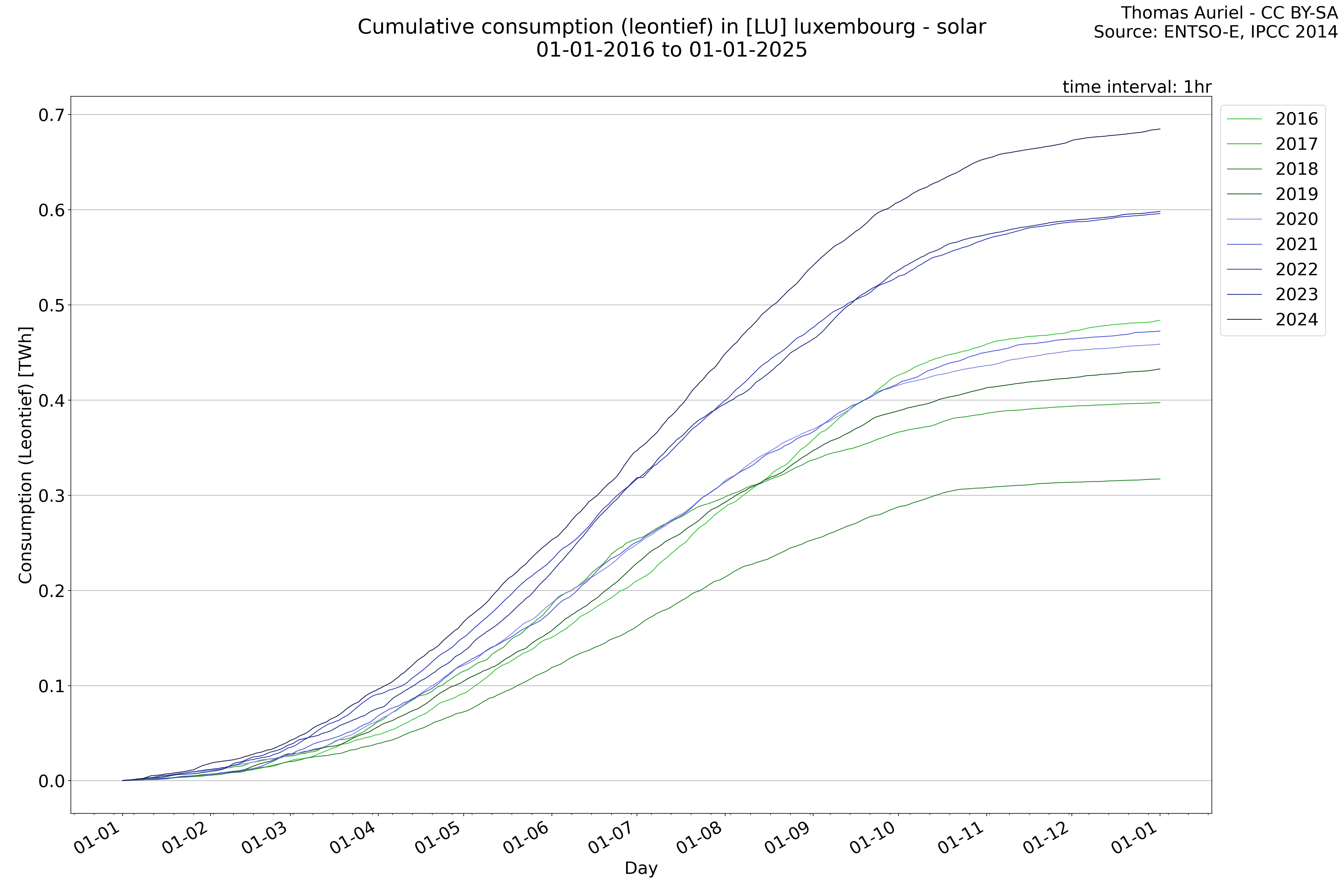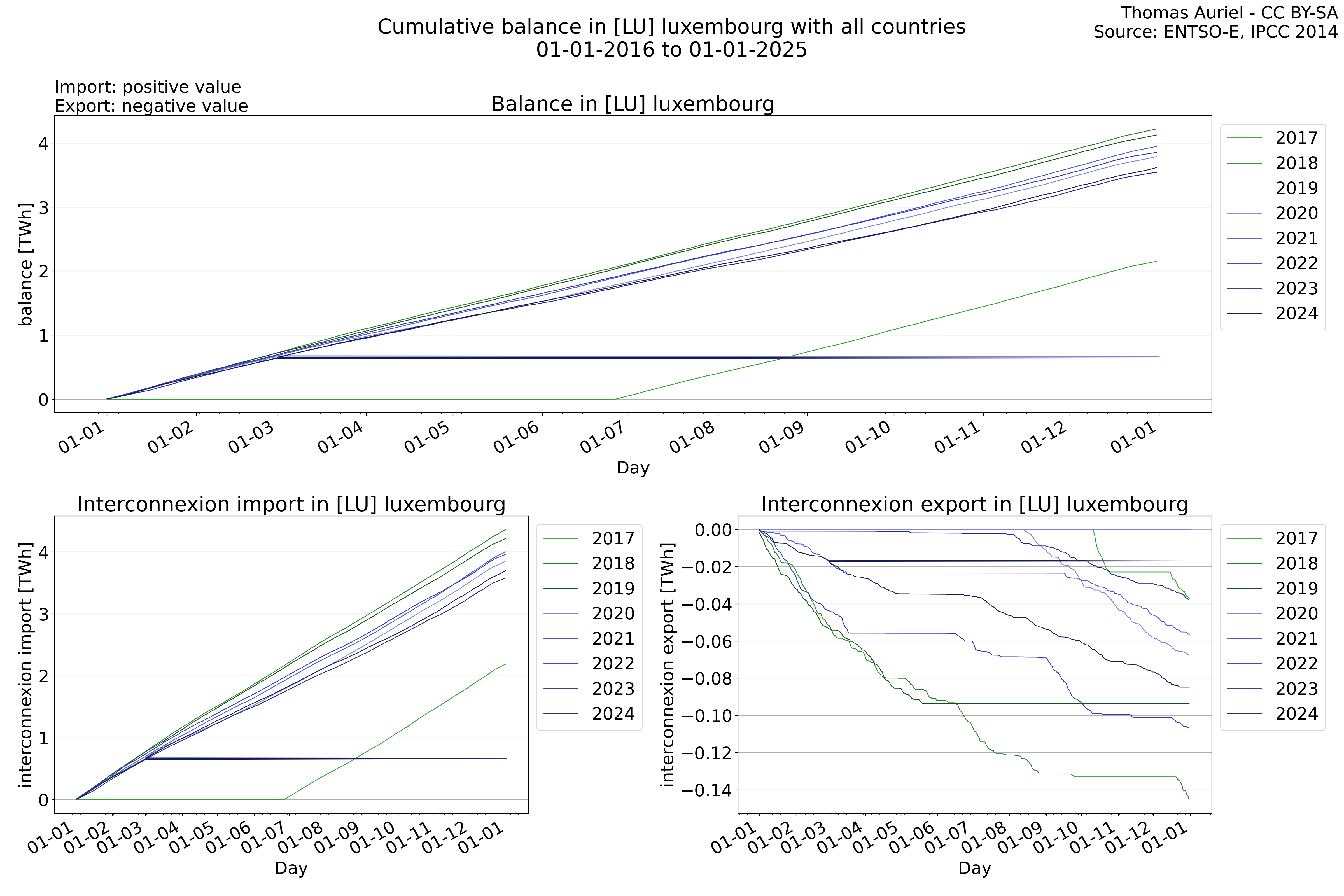 This plot is a cumulative sum plot, where each line represents the cumulative value of a specific metric (e.g., production, load, import, or export) for a given year. The plot begins at zero, and as the year progresses, the cumulative value is updated to reflect the total amount accumulated over time. This visualization illustrates the overall trend of the metric, showing whether the cumulative sum is increasing or decreasing, as well as any changes in the trend within the year. Additionally, the cumulative sum plot helps to reduce the impact of noise and short-term fluctuations commonly present in the raw data of production, load, import, or export. By smoothing out these variations, the plot emphasizes the broader, long-term trends. Consequently, this type of visualization facilitates a clearer understanding of the metric’s evolution across the year, revealing whether the activity follows a steady trajectory, shows signs of volatility, or experiences periods of significant change.