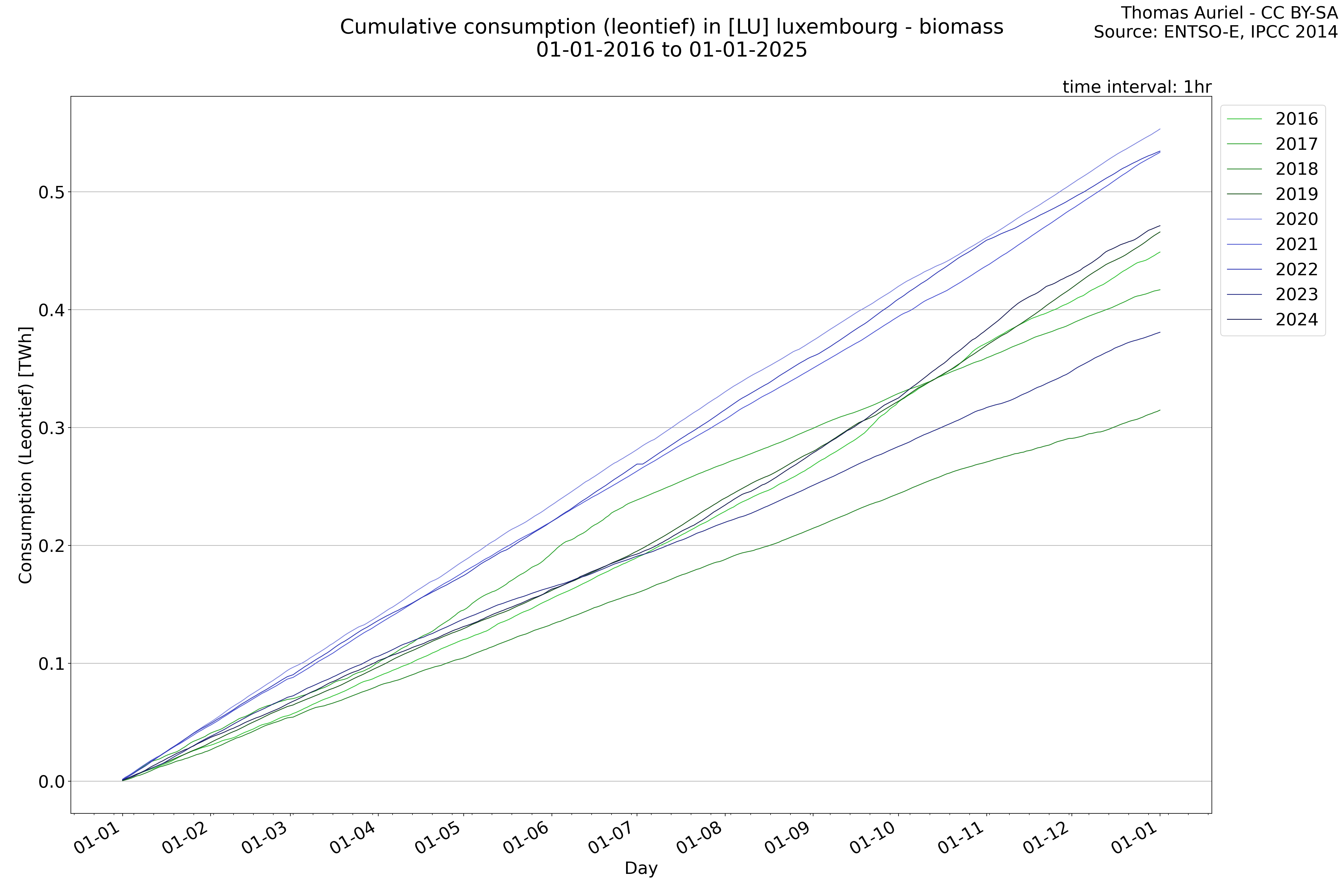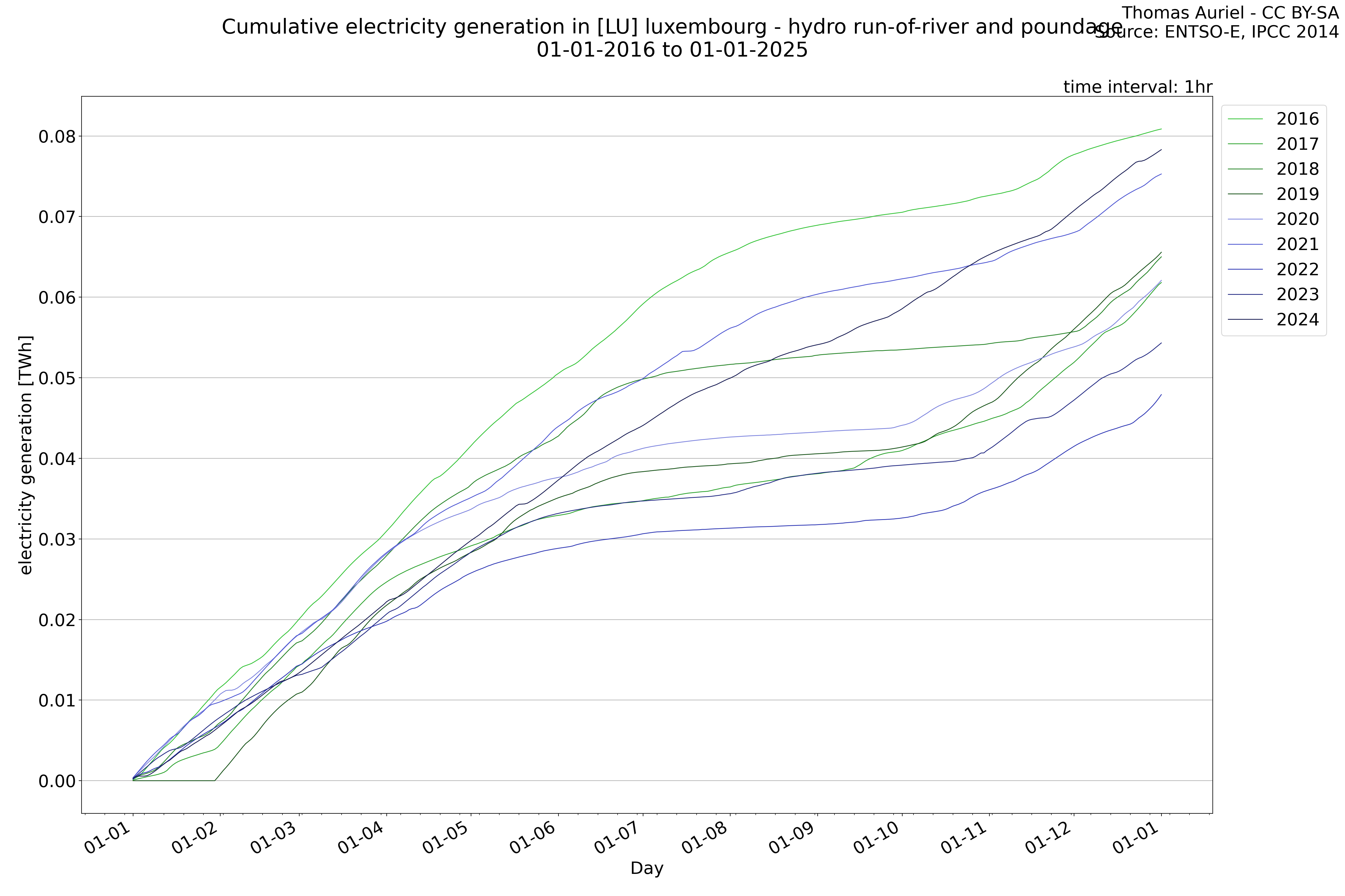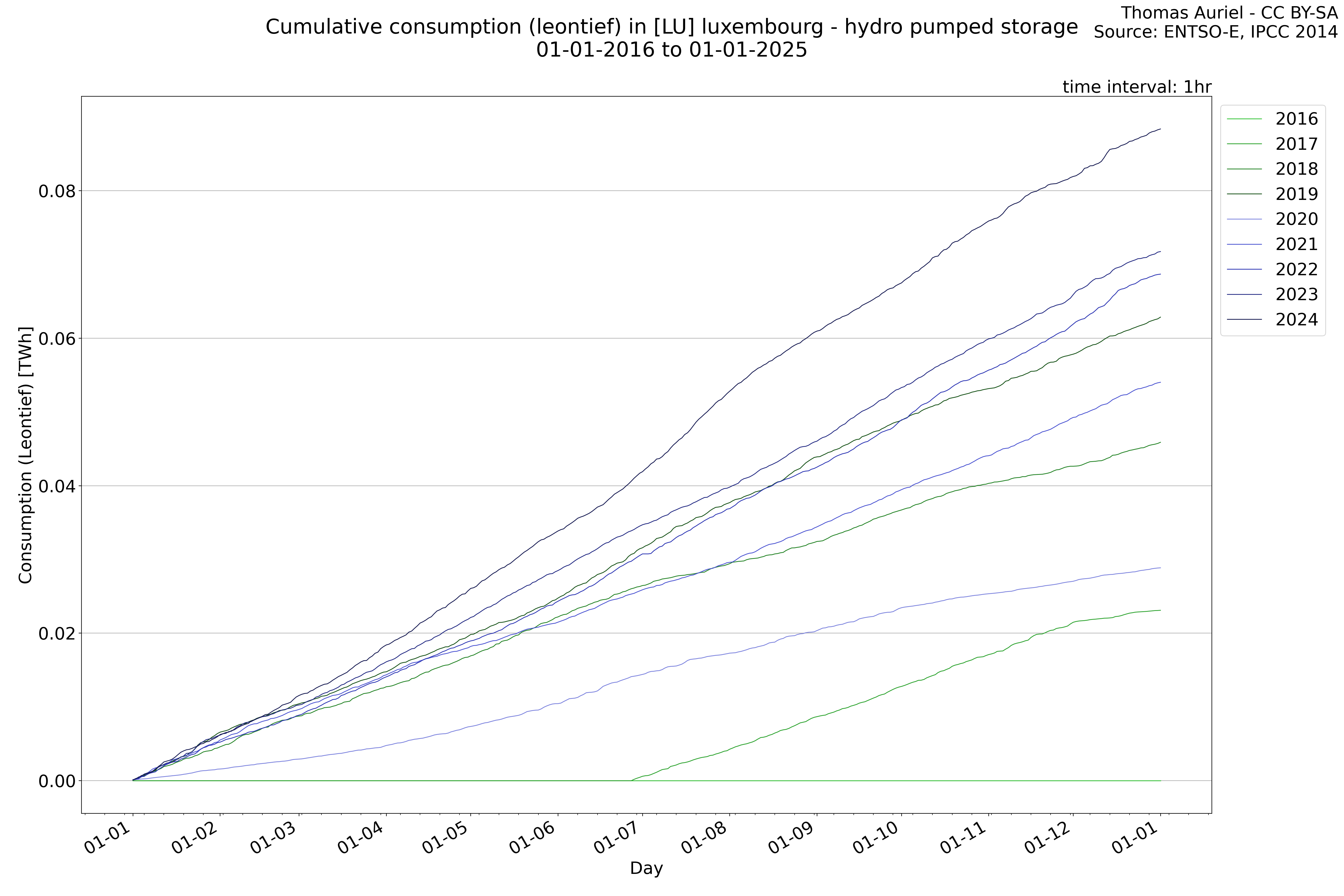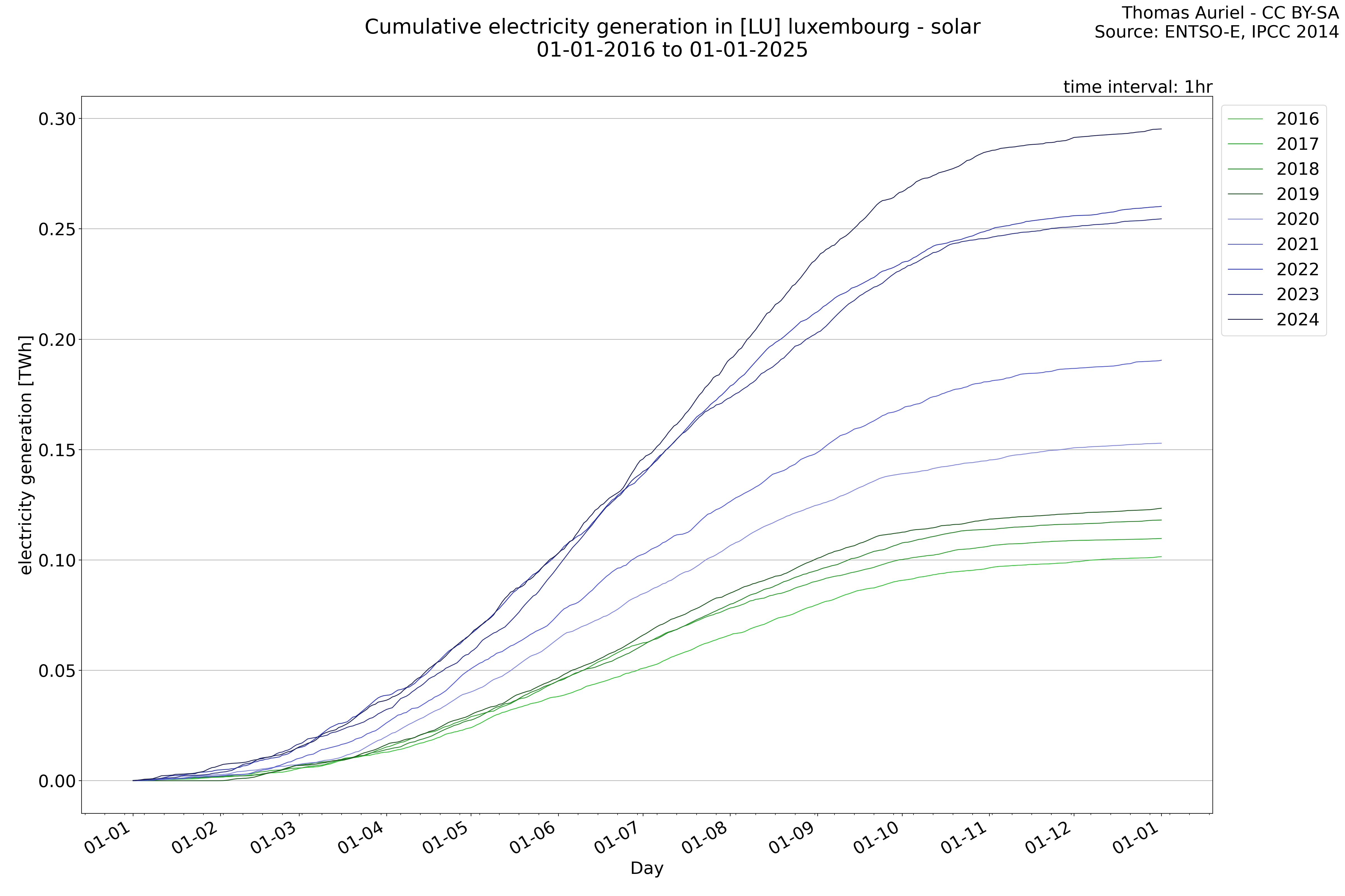 This plot is a cumulative sum plot, where each line represents the cumulative value of a specific metric (e.g., production, load, import, or export) for a given year. The plot begins at zero, and as the year progresses, the cumulative value is updated to reflect the total amount accumulated over time. This visualization illustrates the overall trend of the metric, showing whether the cumulative sum is increasing or decreasing, as well as any changes in the trend within the year. Additionally, the cumulative sum plot helps to reduce the impact of noise and short-term fluctuations commonly present in the raw data of production, load, import, or export. By smoothing out these variations, the plot emphasizes the broader, long-term trends. Consequently, this type of visualization facilitates a clearer understanding of the metric’s evolution across the year, revealing whether the activity follows a steady trajectory, shows signs of volatility, or experiences periods of significant change.