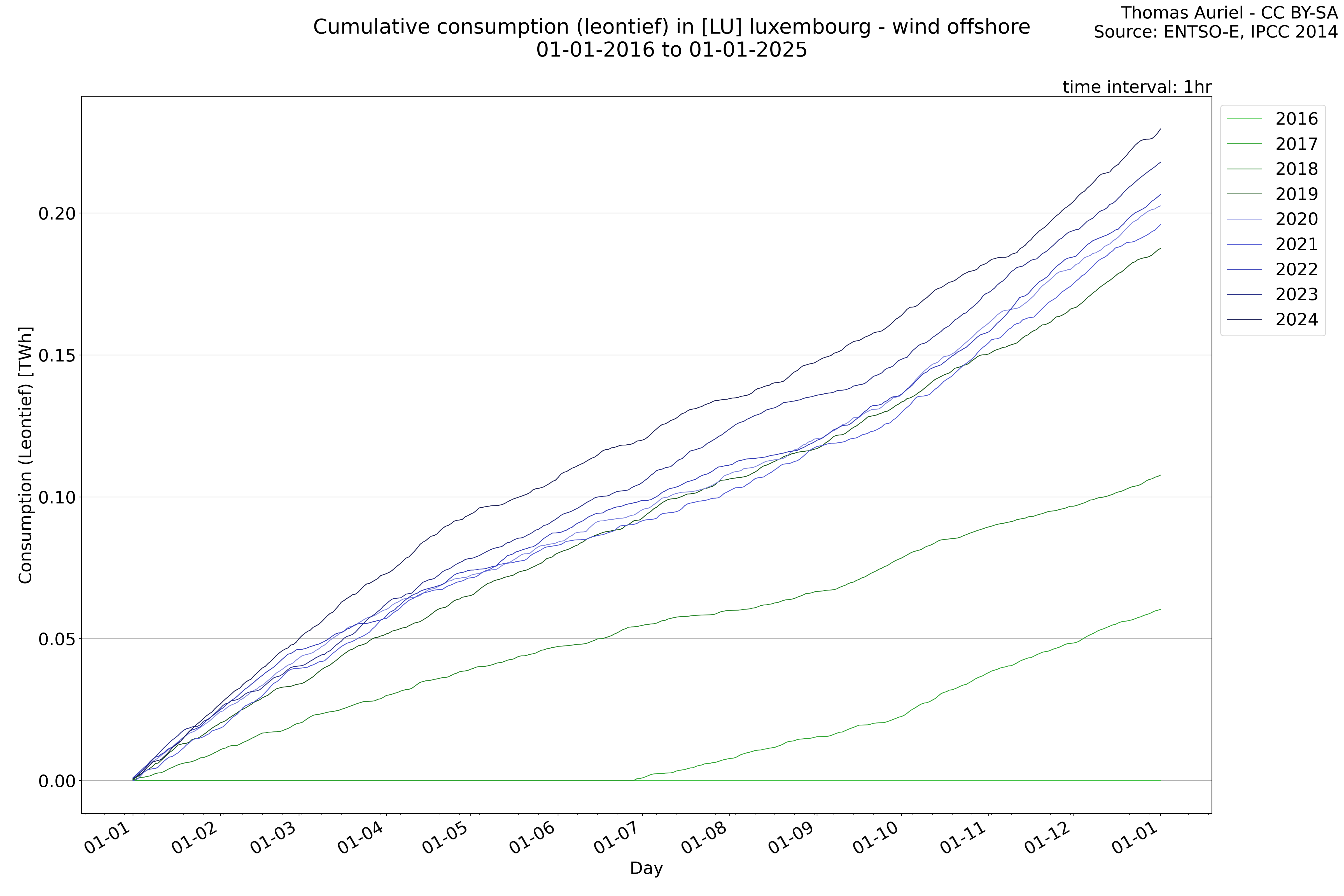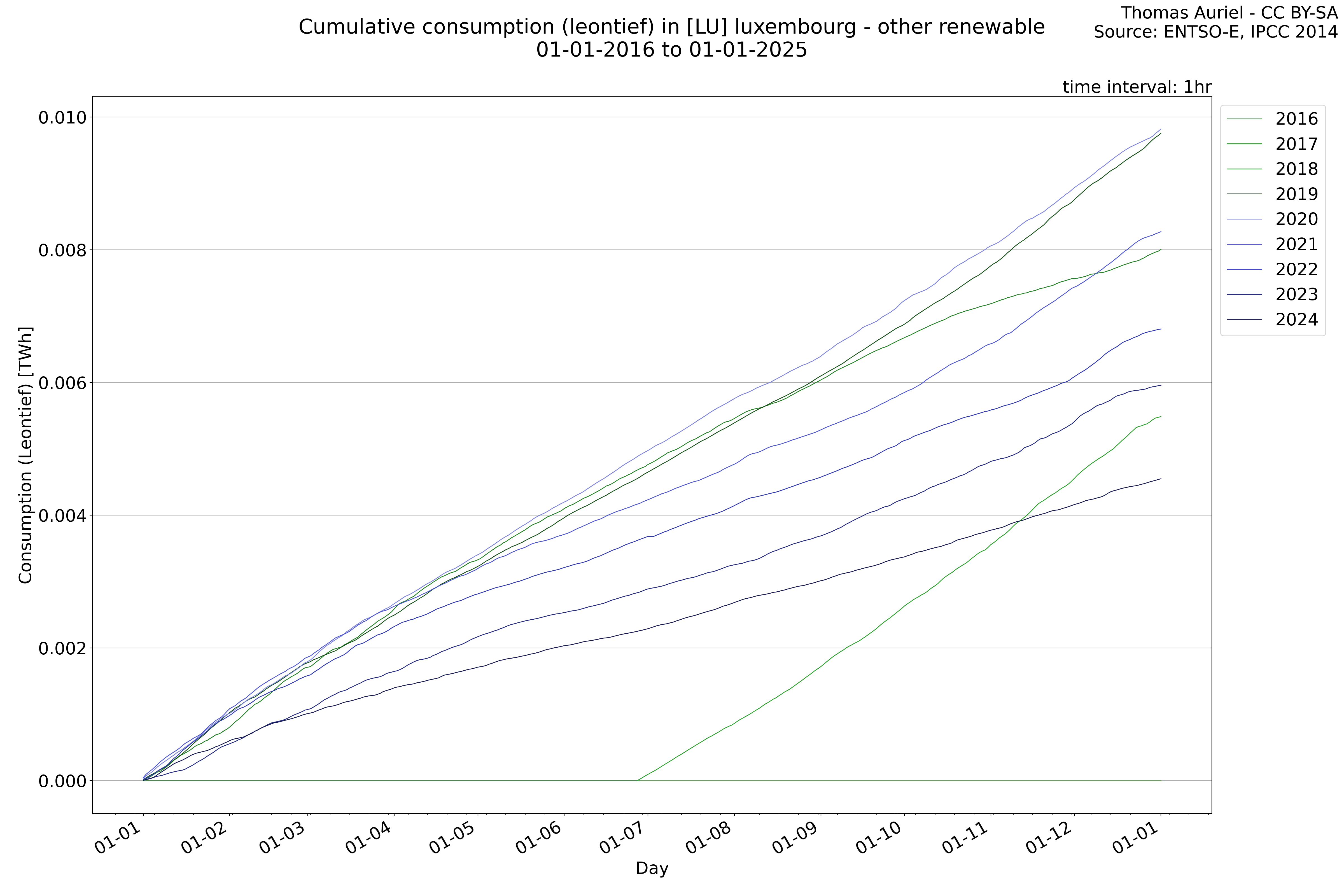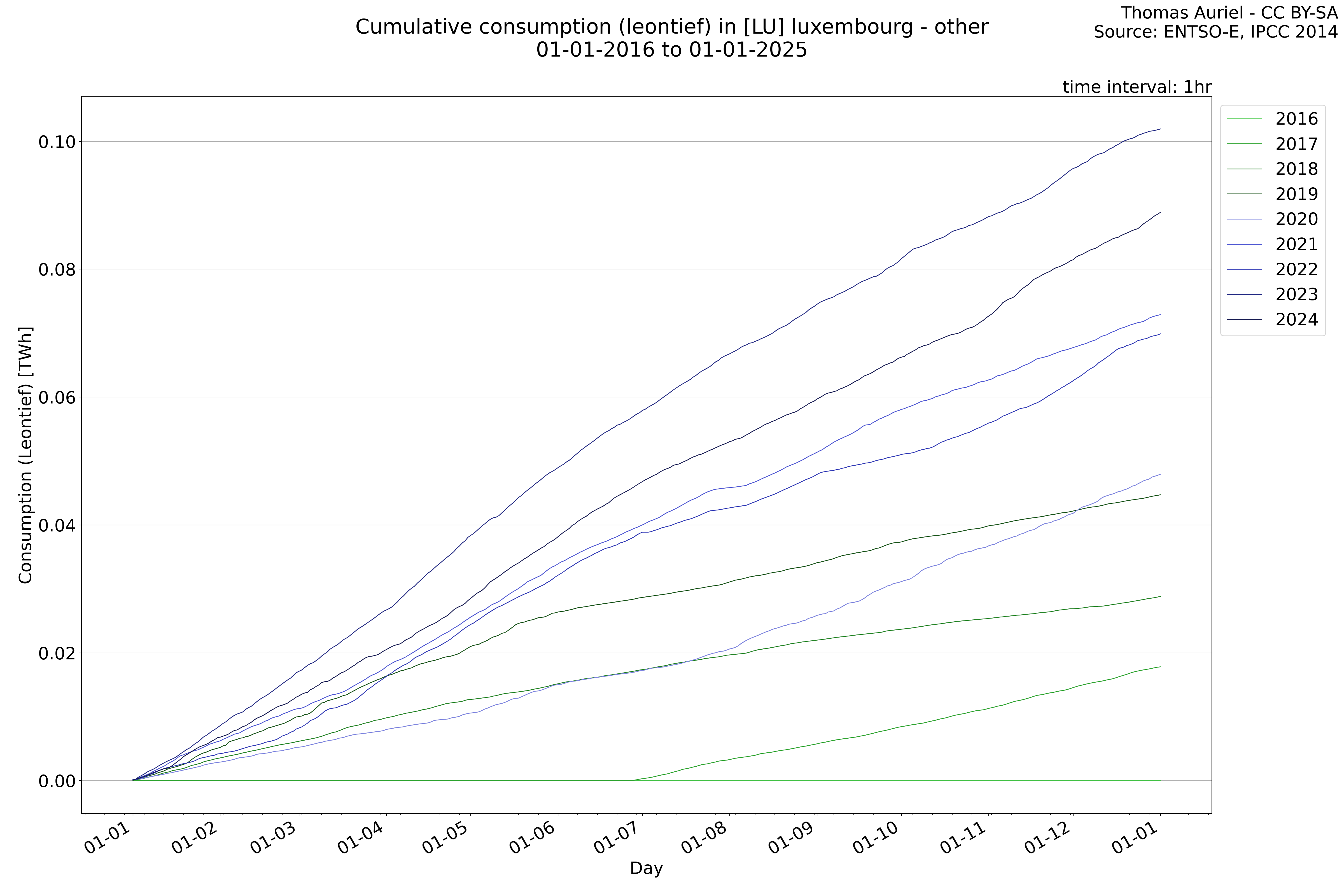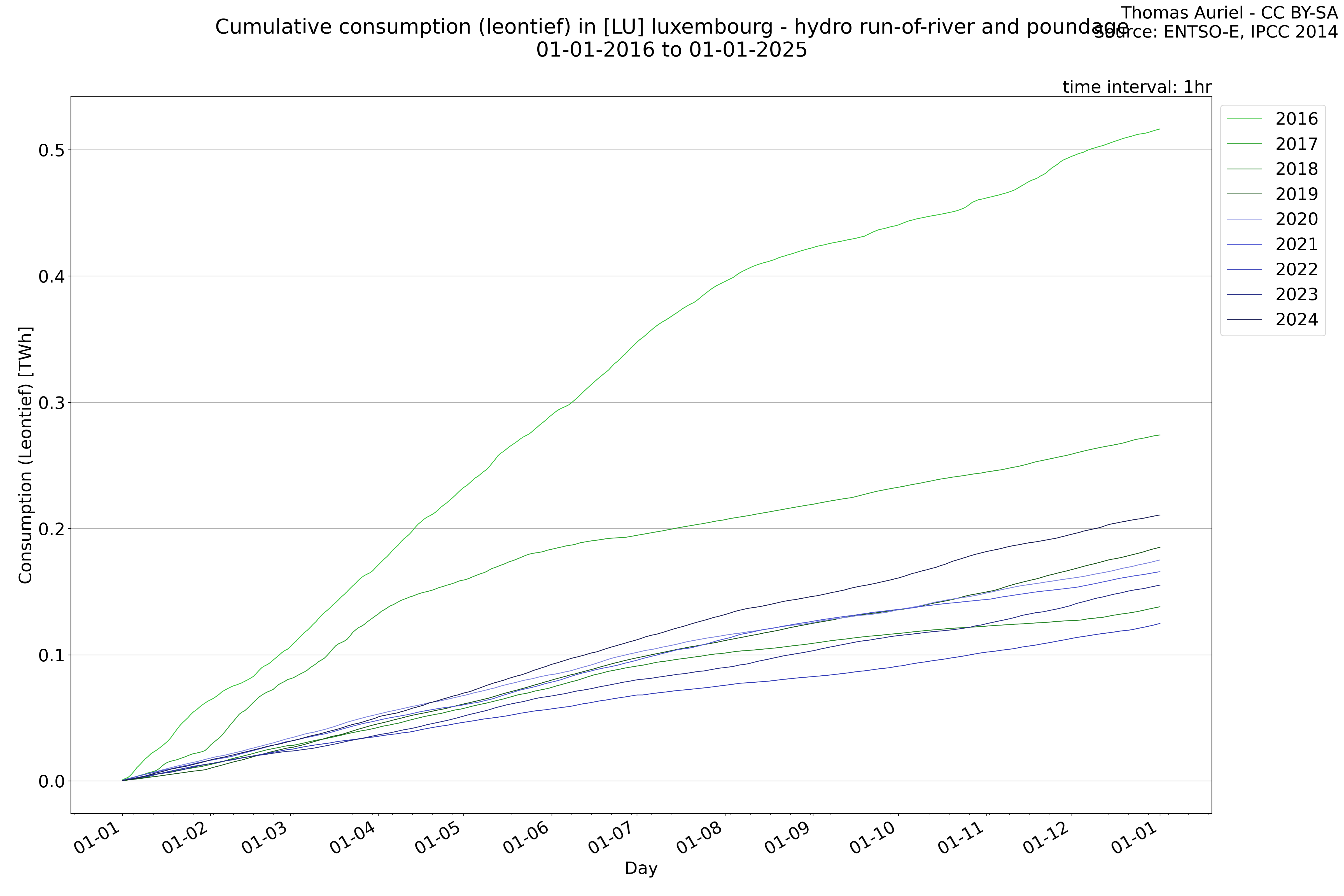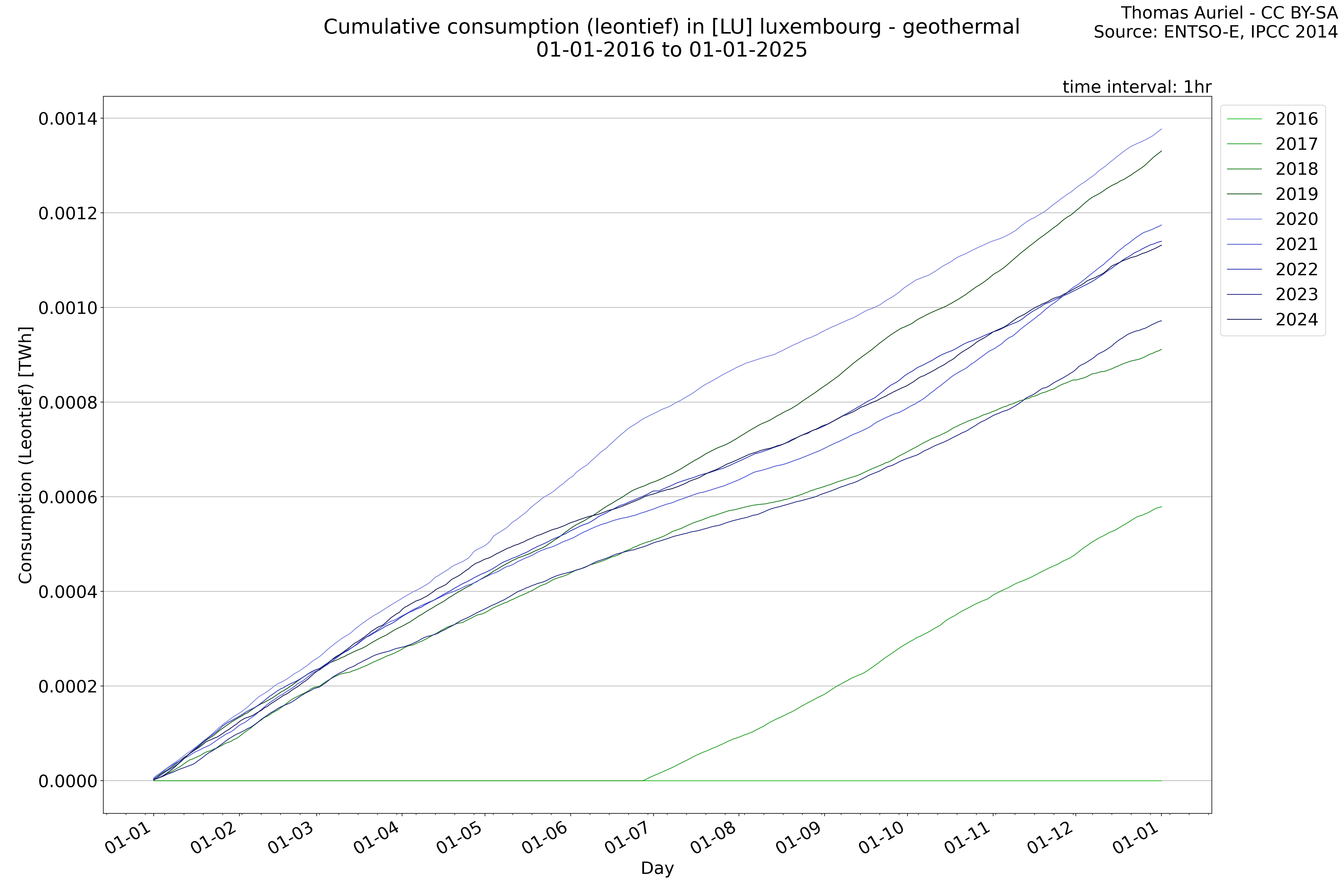 This plot is a cumulative sum plot, where each line represents the cumulative value of a specific metric (e.g., production, load, import, or export) for a given year. The plot begins at zero, and as the year progresses, the cumulative value is updated to reflect the total amount accumulated over time. This visualization illustrates the overall trend of the metric, showing whether the cumulative sum is increasing or decreasing, as well as any changes in the trend within the year. Additionally, the cumulative sum plot helps to reduce the impact of noise and short-term fluctuations commonly present in the raw data of production, load, import, or export. By smoothing out these variations, the plot emphasizes the broader, long-term trends. Consequently, this type of visualization facilitates a clearer understanding of the metric’s evolution across the year, revealing whether the activity follows a steady trajectory, shows signs of volatility, or experiences periods of significant change.