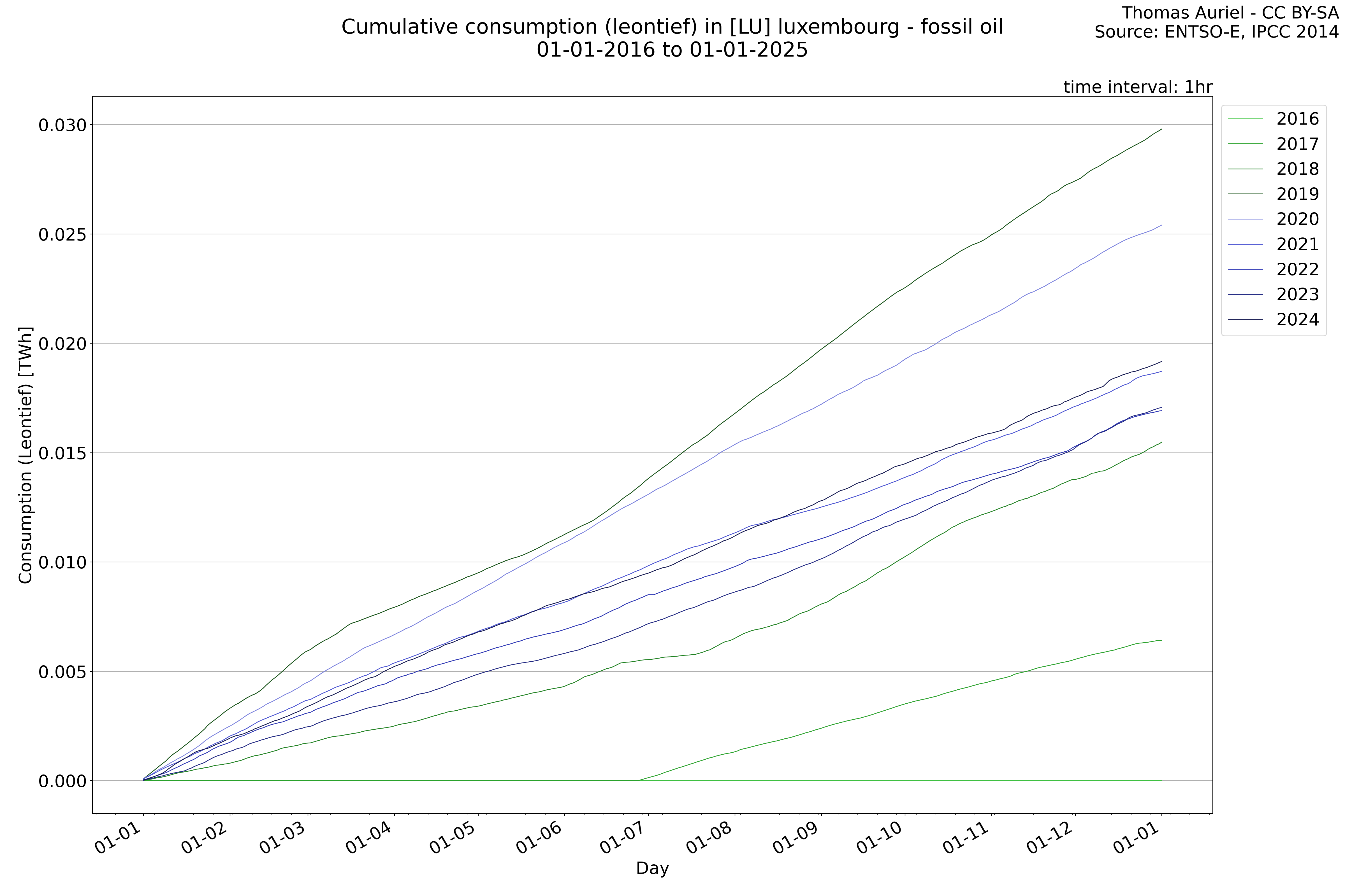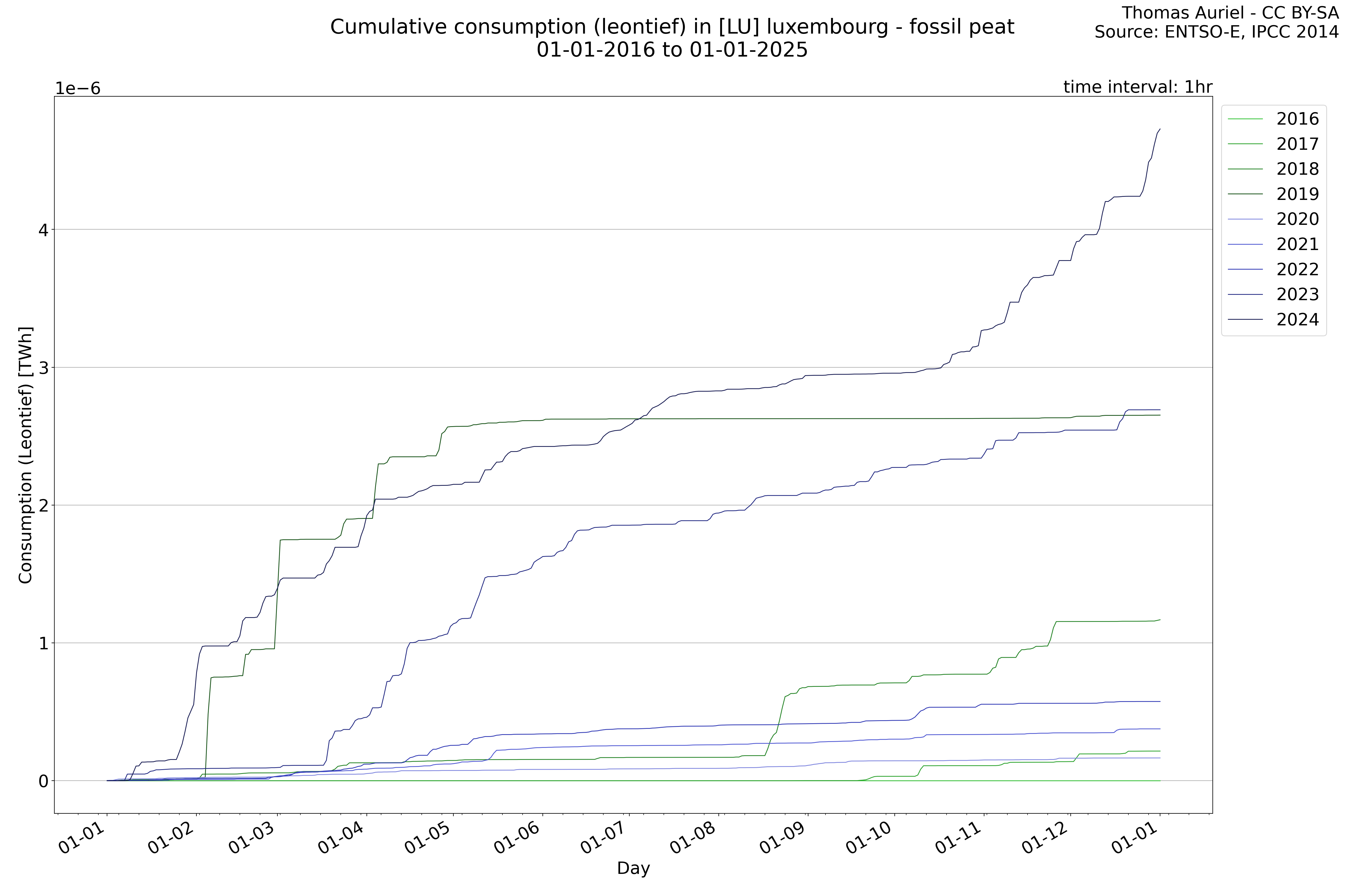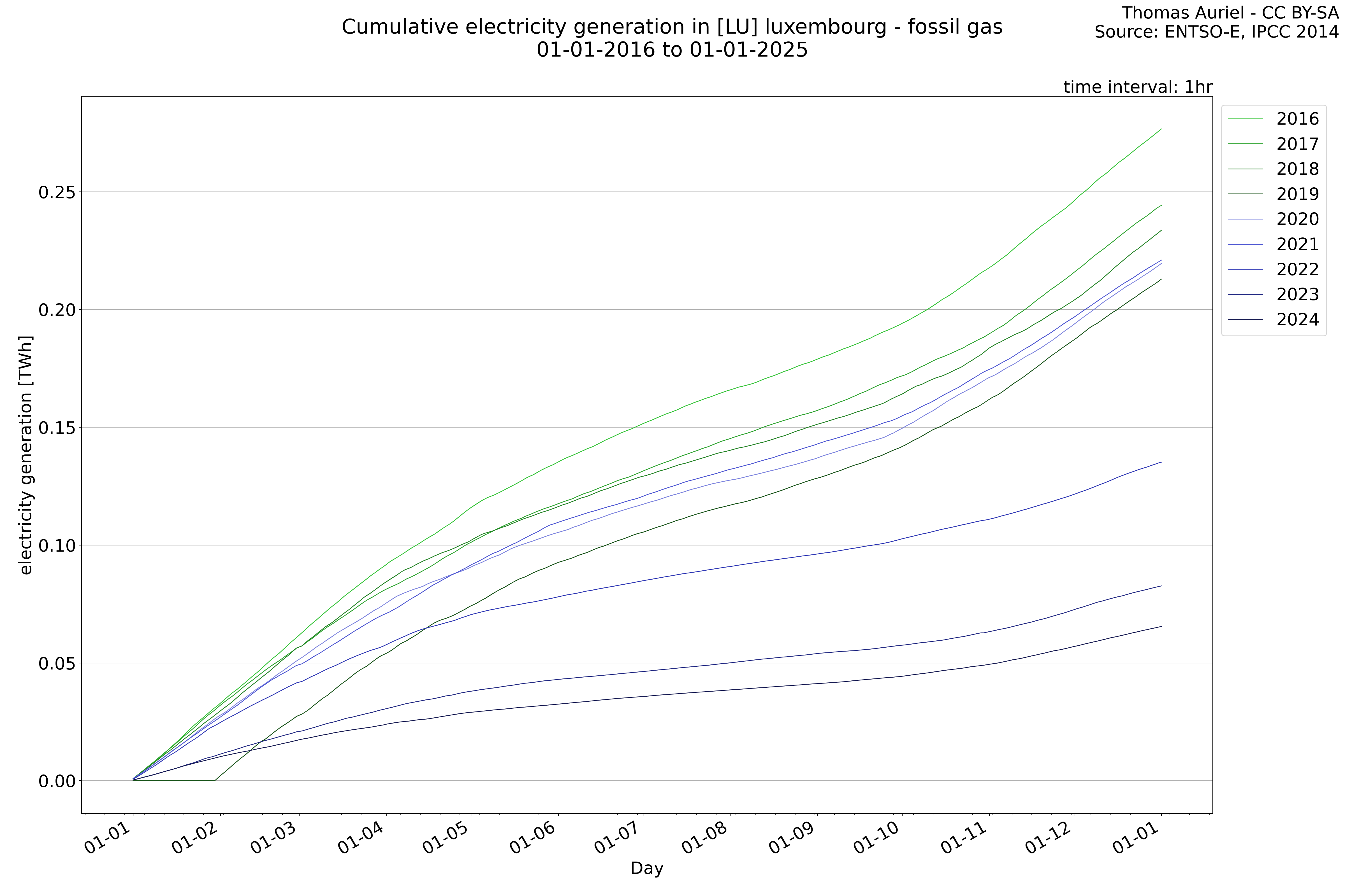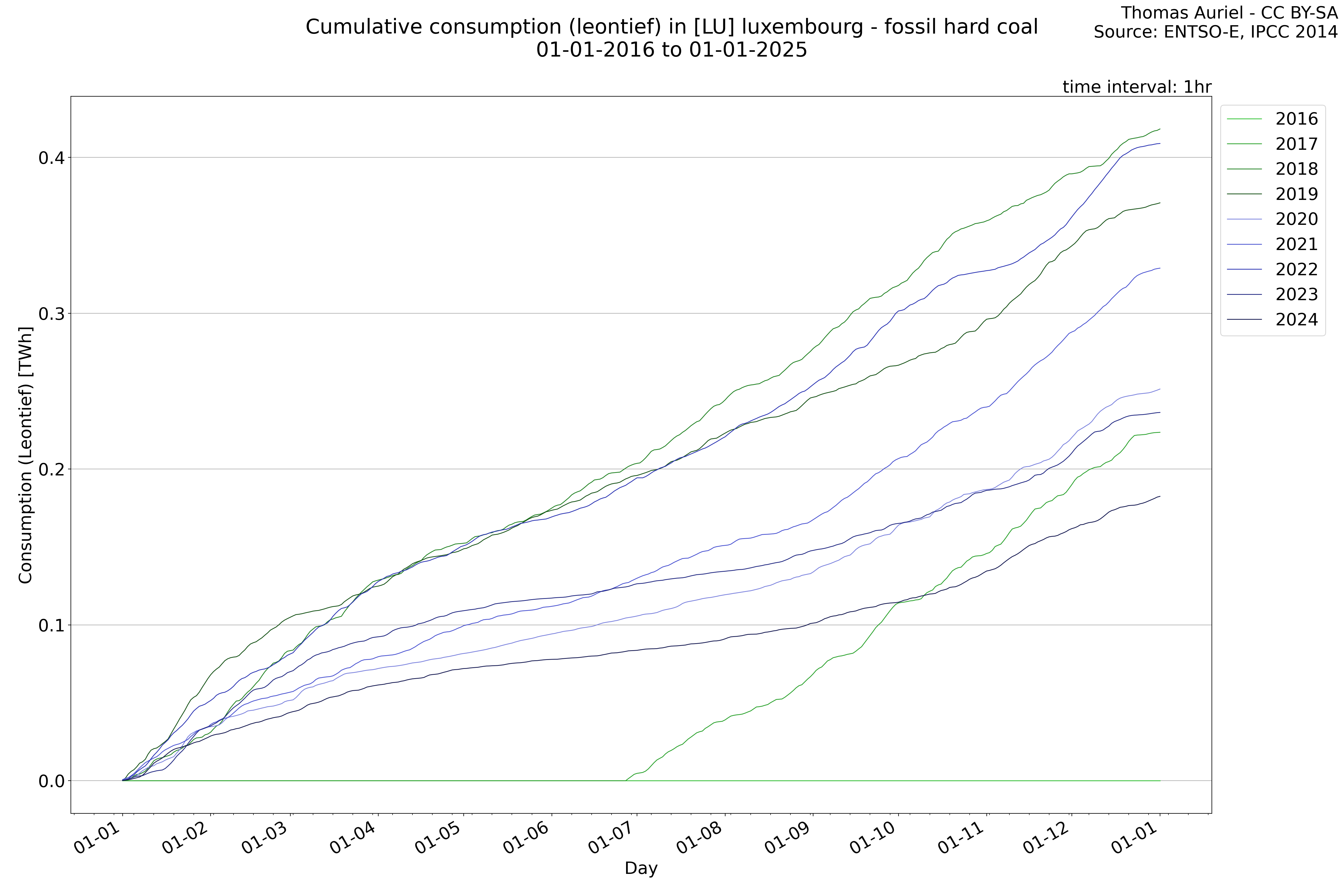 This plot is a cumulative sum plot, where each line represents the cumulative value of a specific metric (e.g., production, load, import, or export) for a given year. The plot begins at zero, and as the year progresses, the cumulative value is updated to reflect the total amount accumulated over time. This visualization illustrates the overall trend of the metric, showing whether the cumulative sum is increasing or decreasing, as well as any changes in the trend within the year. Additionally, the cumulative sum plot helps to reduce the impact of noise and short-term fluctuations commonly present in the raw data of production, load, import, or export. By smoothing out these variations, the plot emphasizes the broader, long-term trends. Consequently, this type of visualization facilitates a clearer understanding of the metric’s evolution across the year, revealing whether the activity follows a steady trajectory, shows signs of volatility, or experiences periods of significant change.