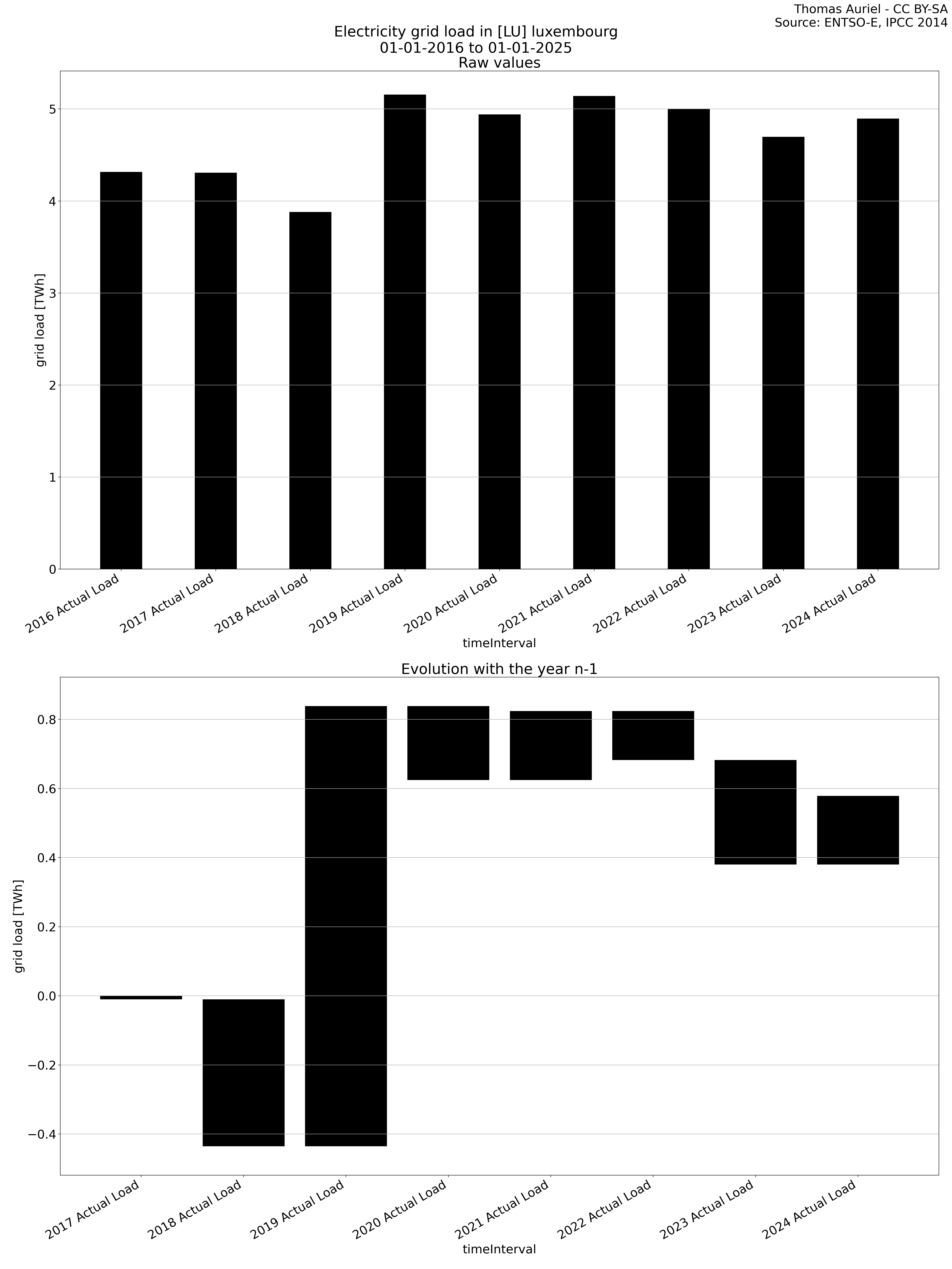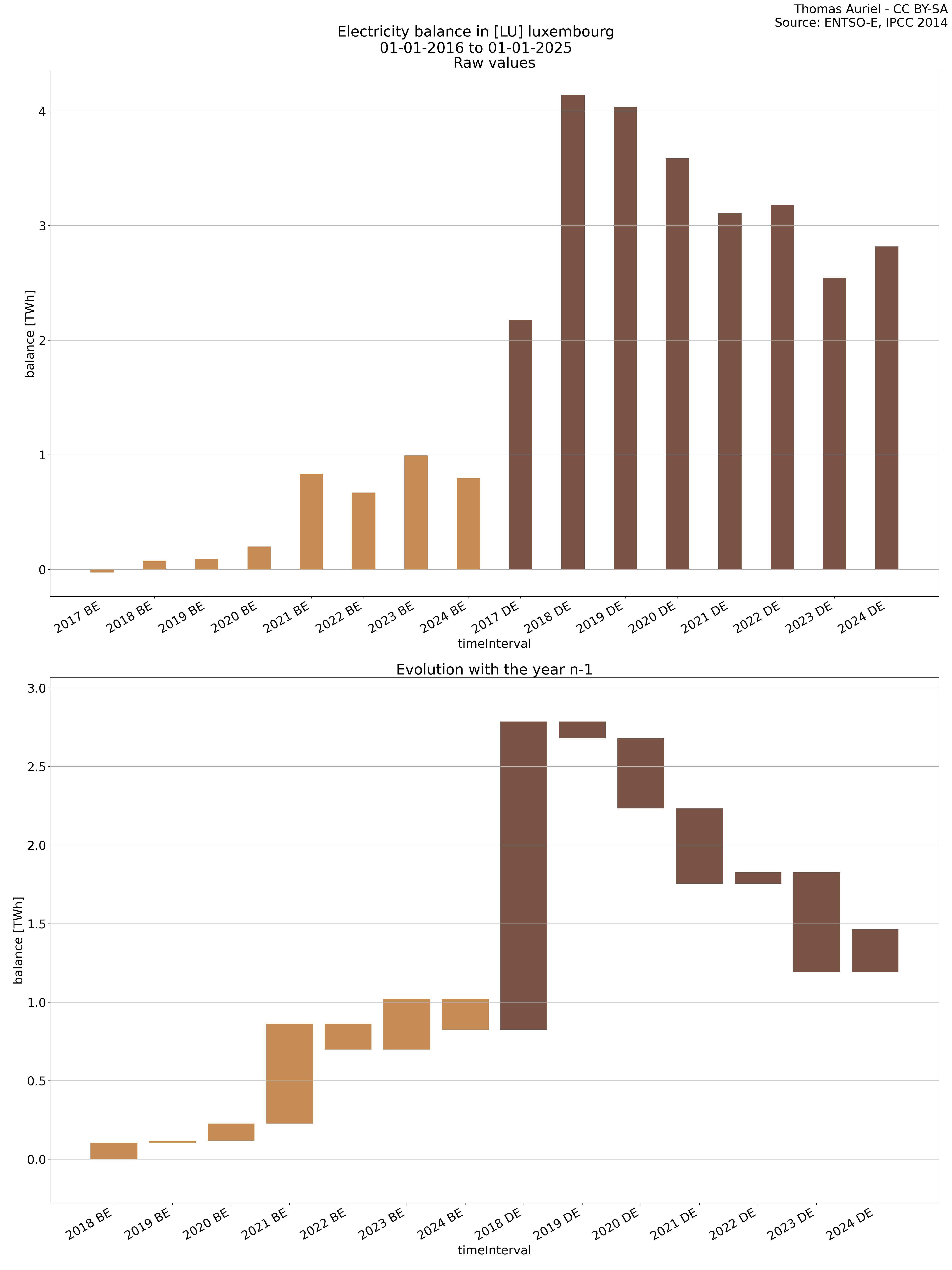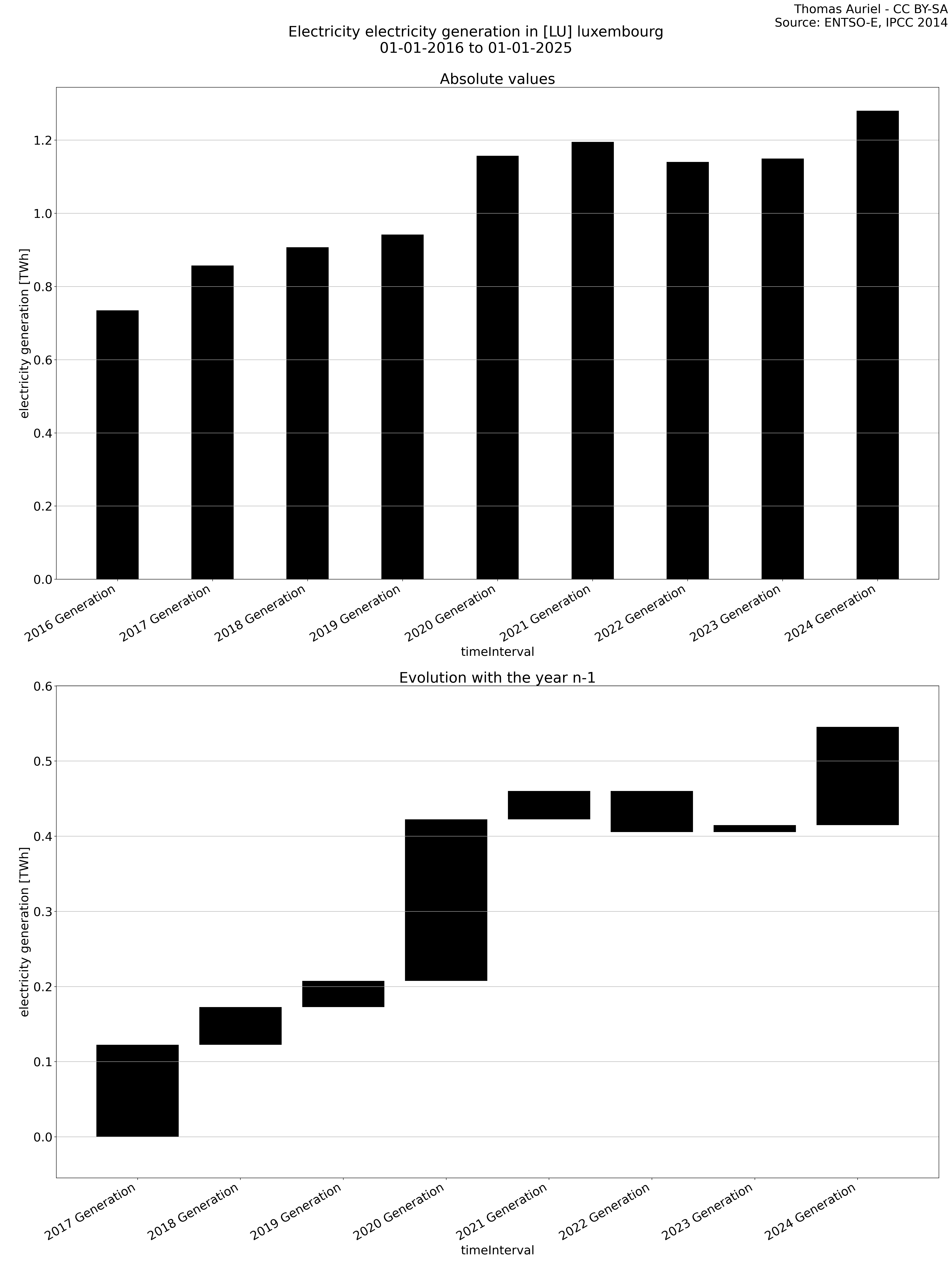 The second section features a waterfall graph, which visually represents the year-over-year changes in electricity metrics. In this graph, the length of each bar corresponds to the difference in the metric (e.g., production, load, etc.) compared to the previous year. Unlike the bar plot, the bars in the waterfall graph do not start at zero; instead, each bar begins where the previous one ended. Hence, this structure emphasizes the incremental changes in the metric over time, facilitating the visualization of fluctuations from one year to the next.