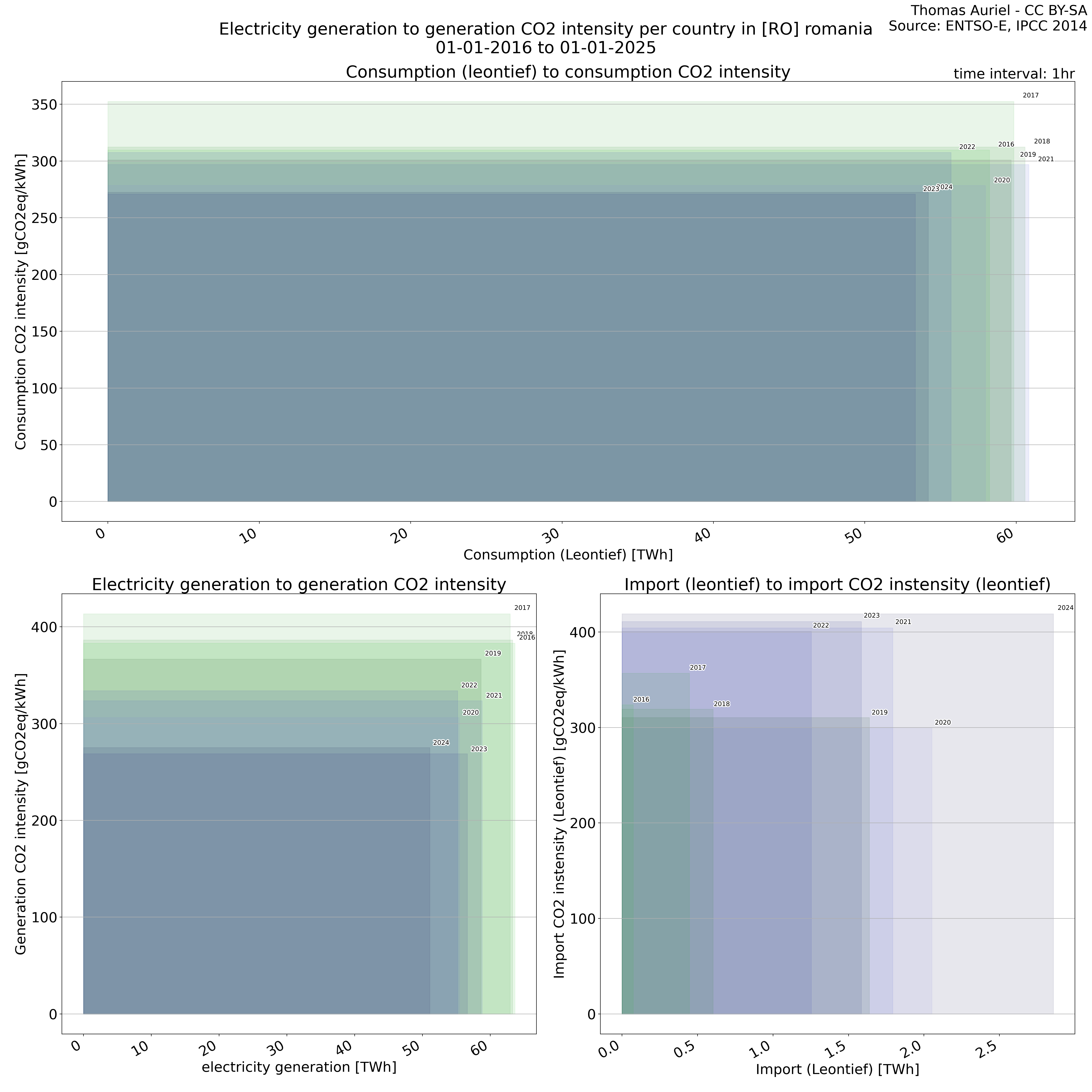 The plot consists of squares, each representing a single year, designed to illustrate electricity-related metrics and their associated environmental impacts. The length of each square corresponds to the total electricity consumption, generation, or imports during the year, with longer squares indicating higher overall values for the respective metric. The height of each square represents the average CO₂ intensity (e.g., grams of CO₂ per kWh) associated with electricity consumption, generation, or imports; hence, taller squares signify greater environmental impact per unit of electricity. Finally, the surface area of each square, determined by the product of its length and height, represents the total CO₂ emissions associated with the respective activity in the given year.