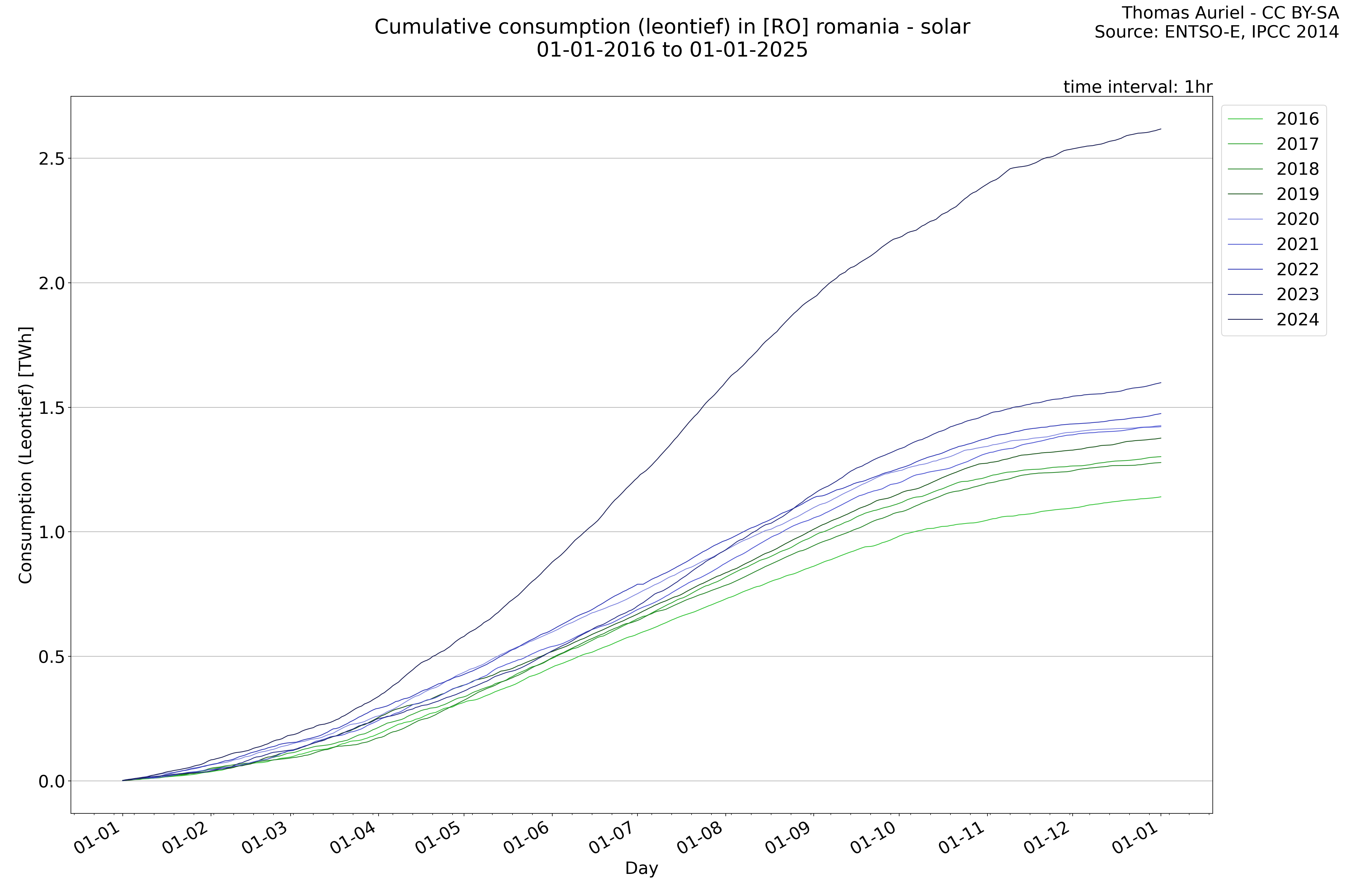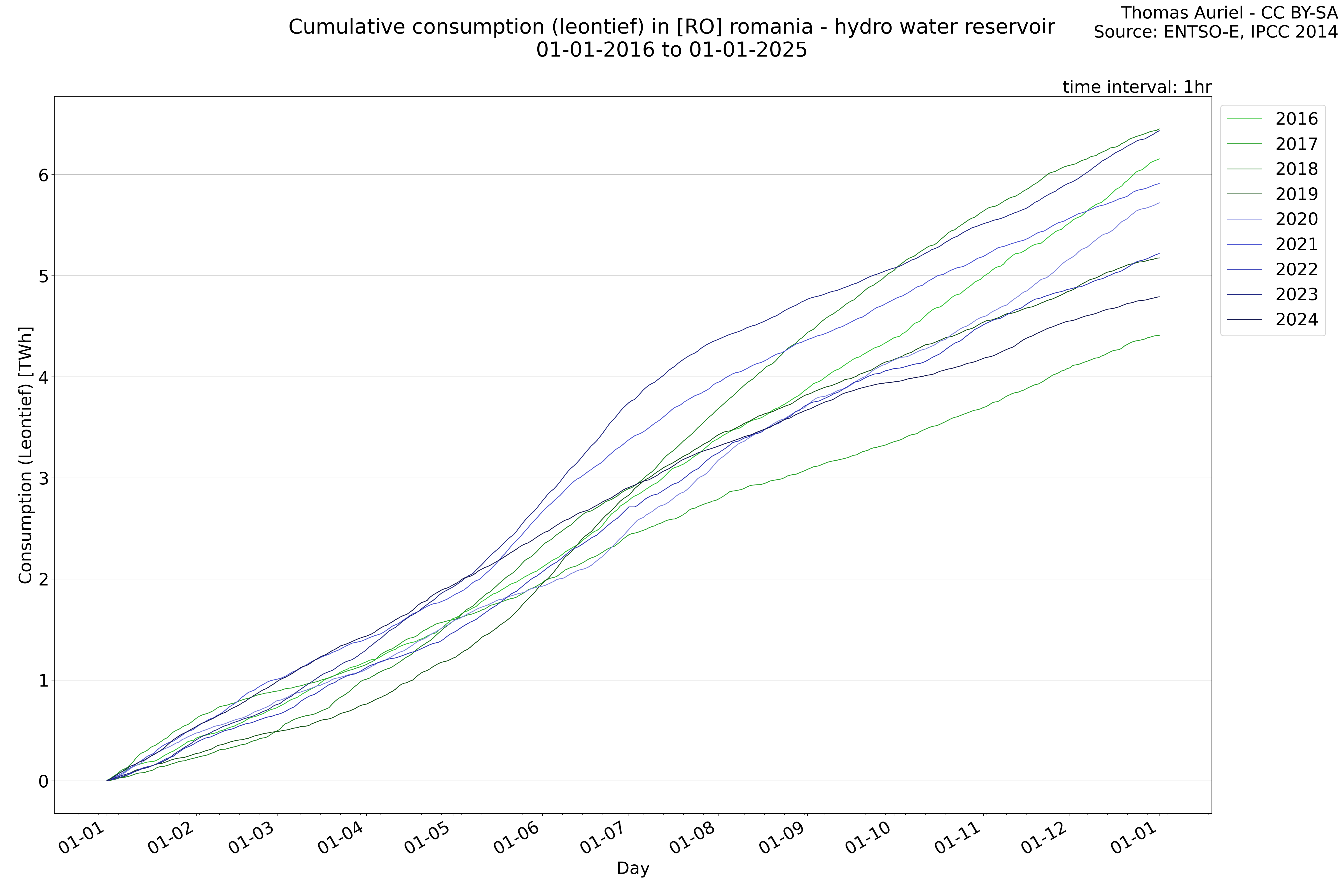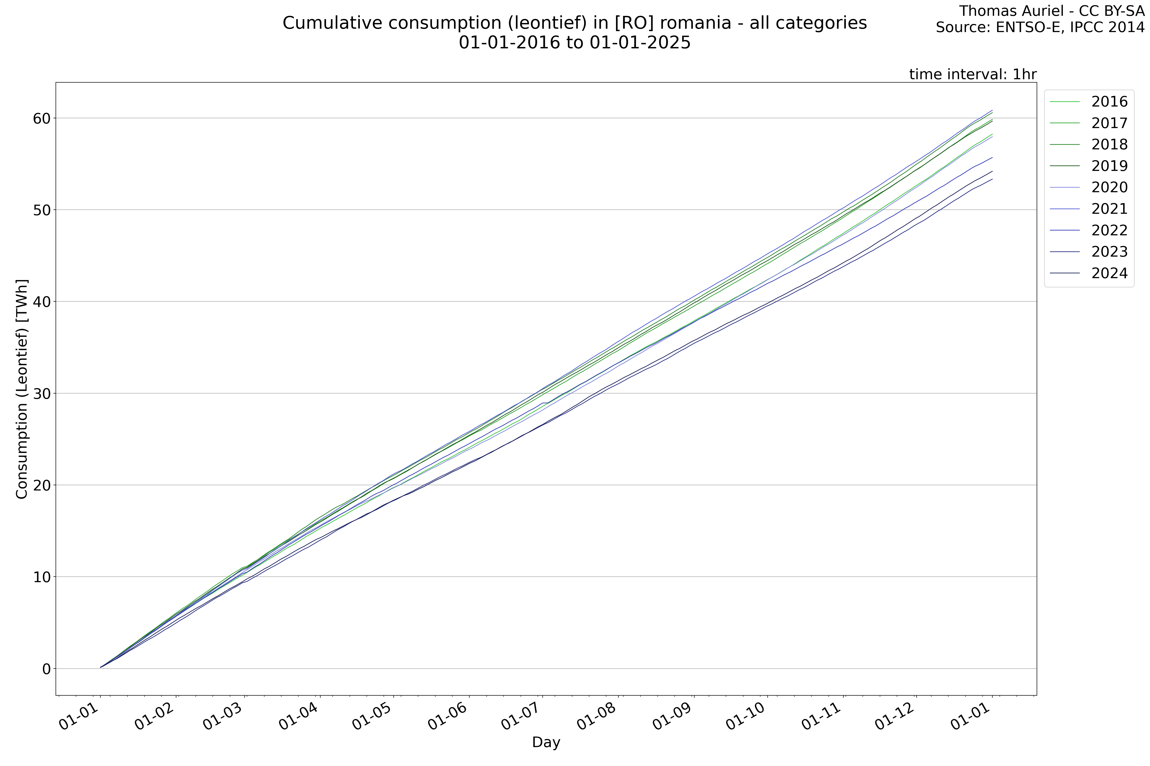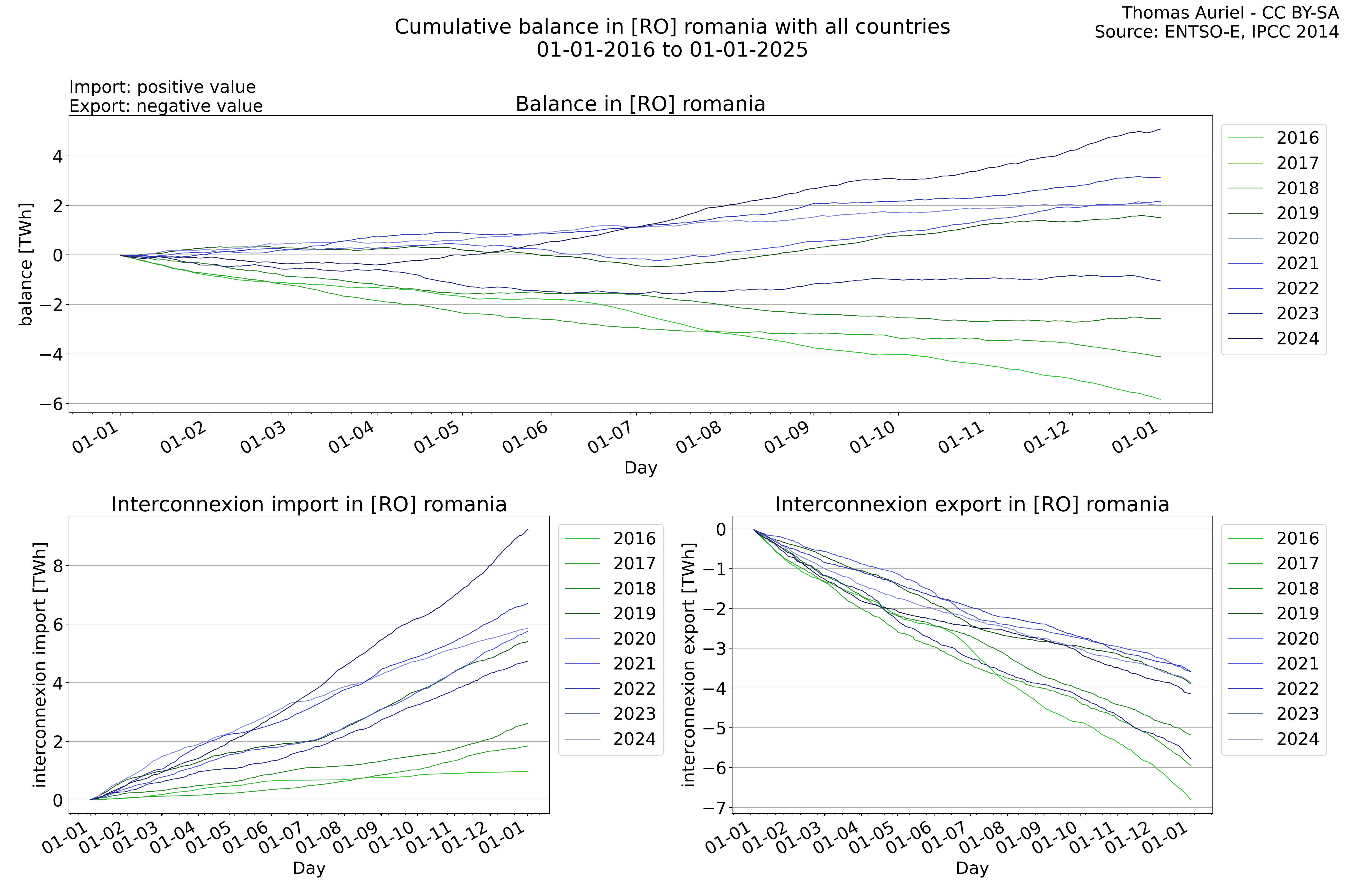 This plot is a cumulative sum plot, where each line represents the cumulative value of a specific metric (e.g., production, load, import, or export) for a given year. The plot begins at zero, and as the year progresses, the cumulative value is updated to reflect the total amount accumulated over time. This visualization illustrates the overall trend of the metric, showing whether the cumulative sum is increasing or decreasing, as well as any changes in the trend within the year. Additionally, the cumulative sum plot helps to reduce the impact of noise and short-term fluctuations commonly present in the raw data of production, load, import, or export. By smoothing out these variations, the plot emphasizes the broader, long-term trends. Consequently, this type of visualization facilitates a clearer understanding of the metric’s evolution across the year, revealing whether the activity follows a steady trajectory, shows signs of volatility, or experiences periods of significant change.