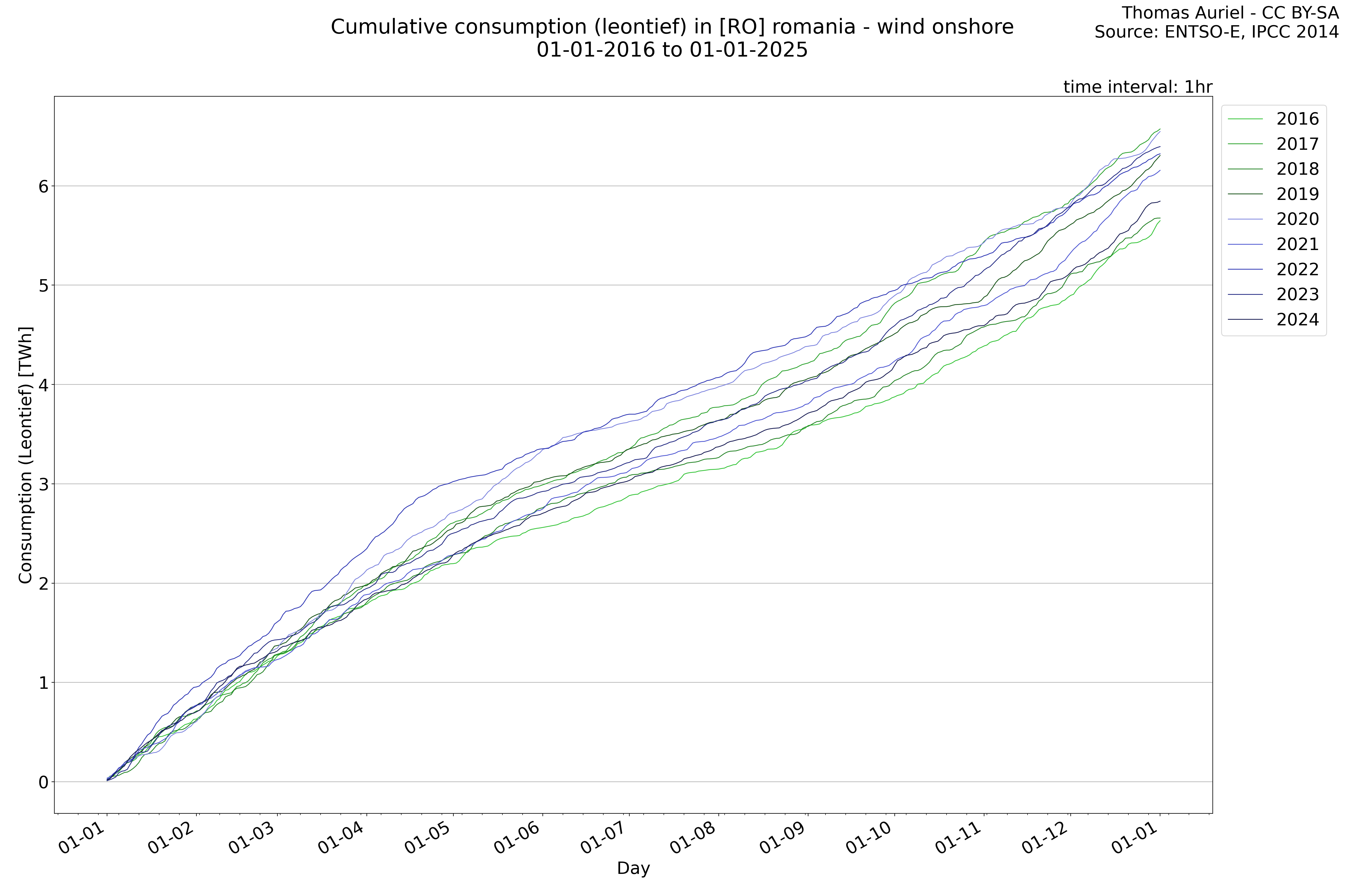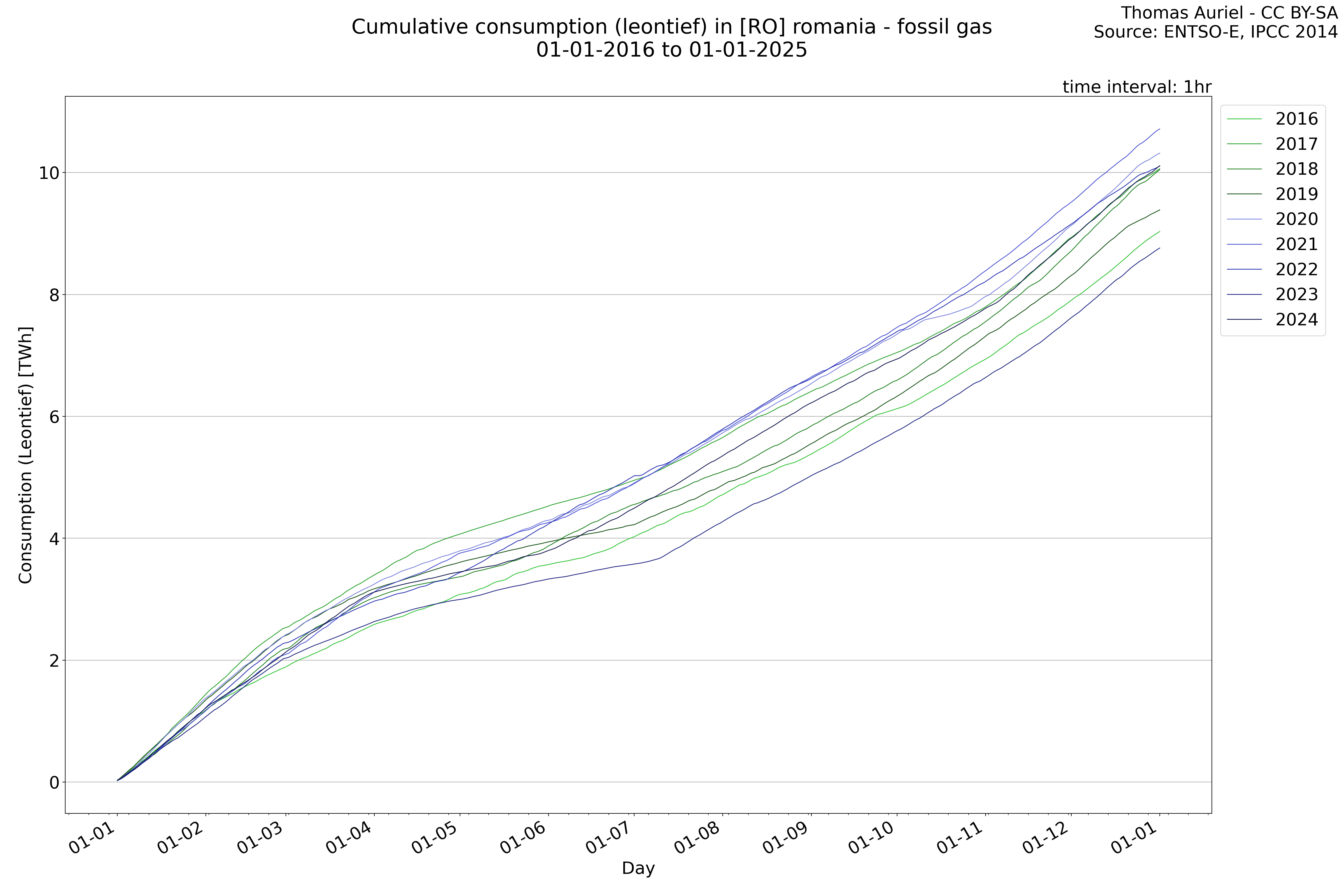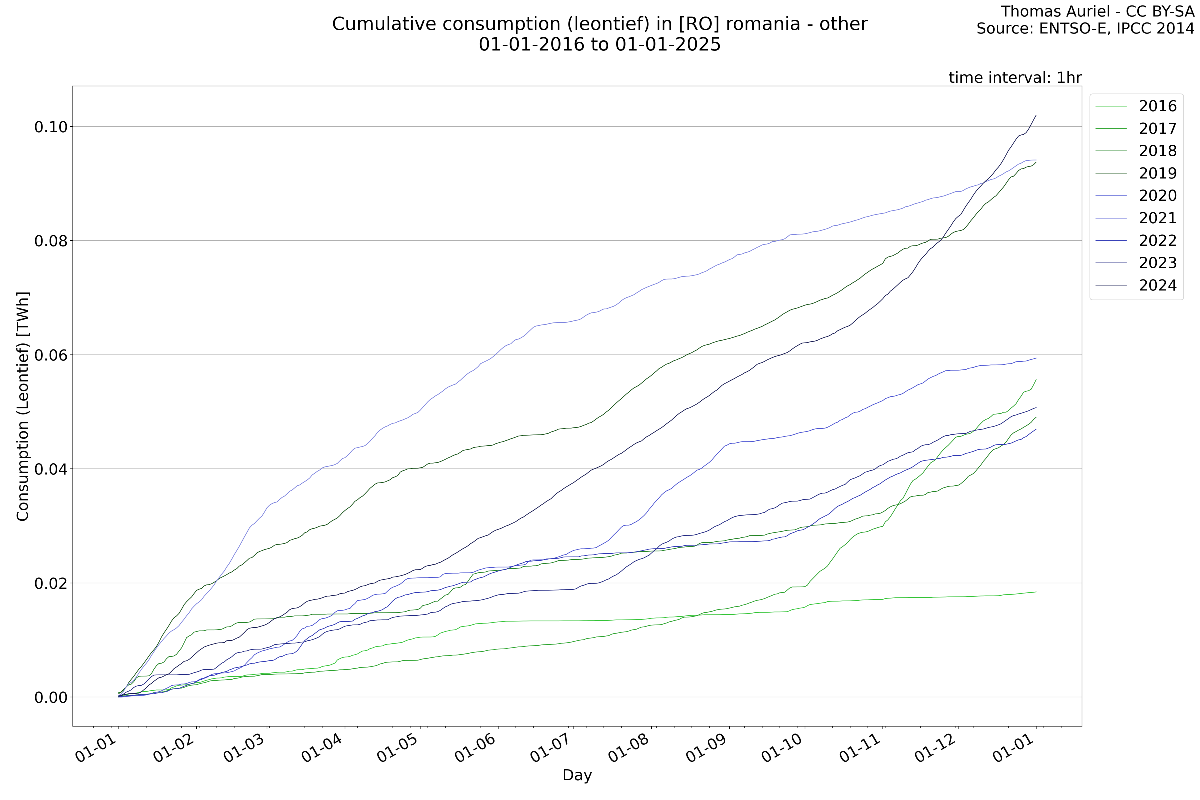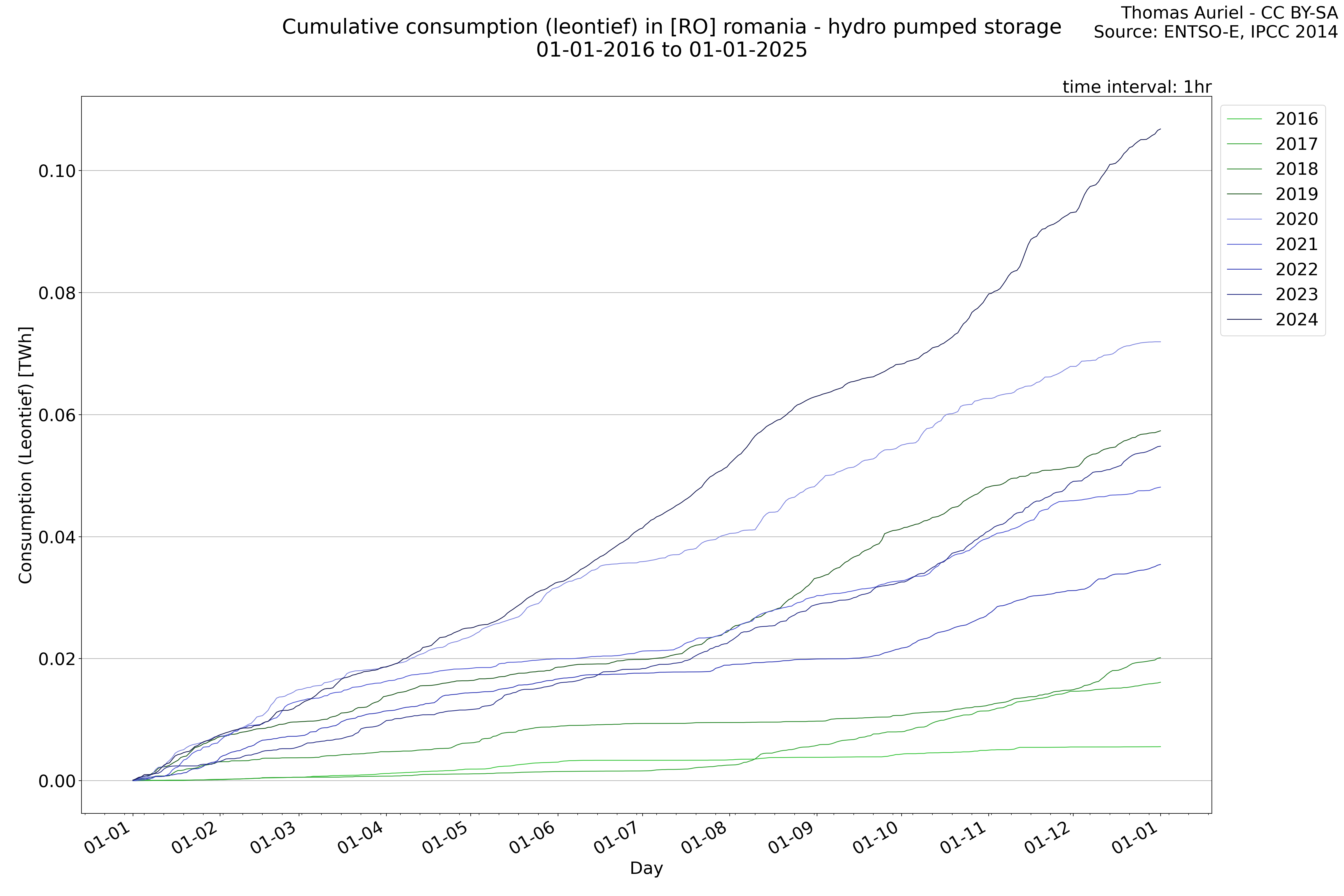 This plot is a cumulative sum plot, where each line represents the cumulative value of a specific metric (e.g., production, load, import, or export) for a given year. The plot begins at zero, and as the year progresses, the cumulative value is updated to reflect the total amount accumulated over time. This visualization illustrates the overall trend of the metric, showing whether the cumulative sum is increasing or decreasing, as well as any changes in the trend within the year. Additionally, the cumulative sum plot helps to reduce the impact of noise and short-term fluctuations commonly present in the raw data of production, load, import, or export. By smoothing out these variations, the plot emphasizes the broader, long-term trends. Consequently, this type of visualization facilitates a clearer understanding of the metric’s evolution across the year, revealing whether the activity follows a steady trajectory, shows signs of volatility, or experiences periods of significant change.