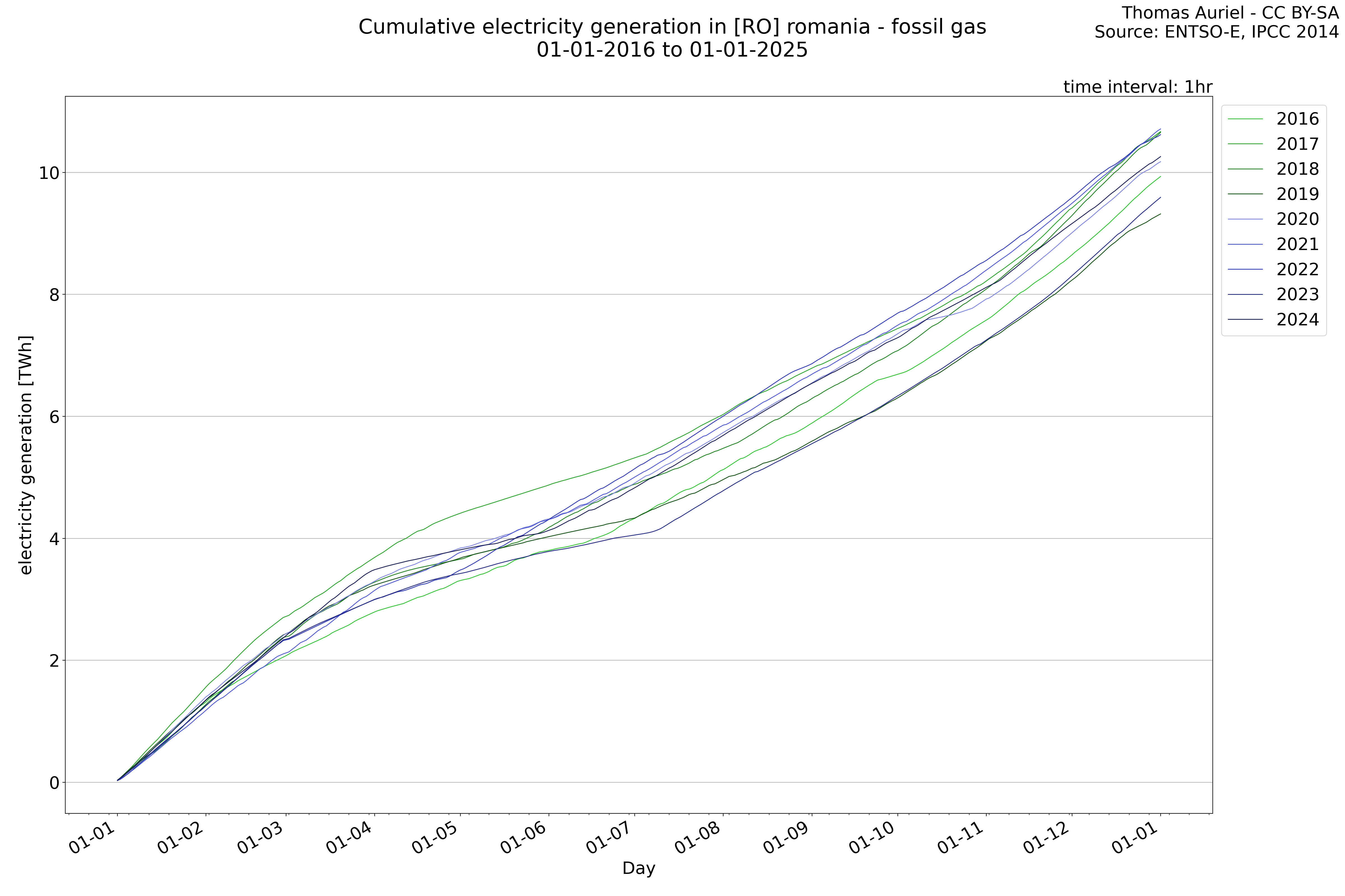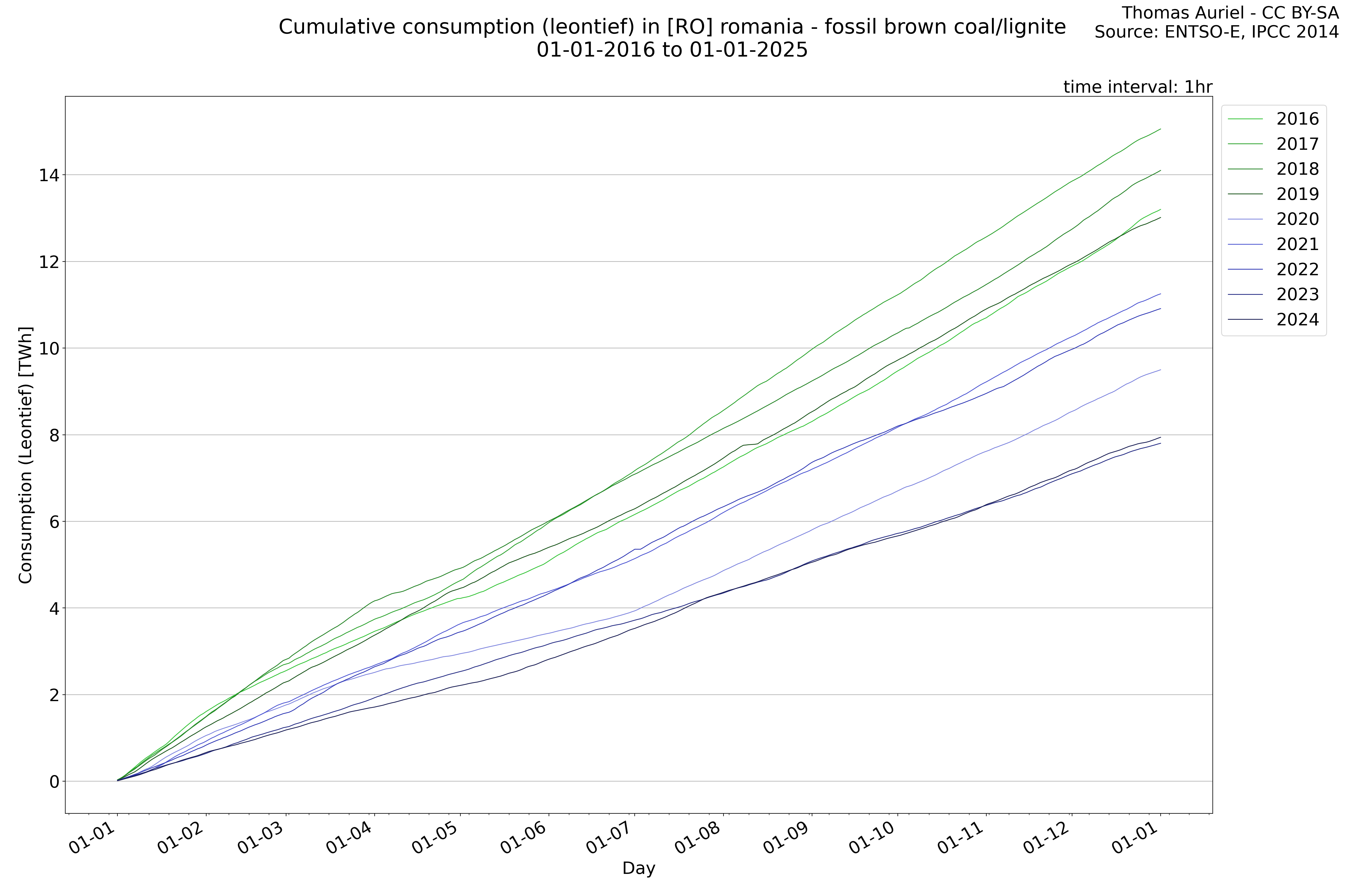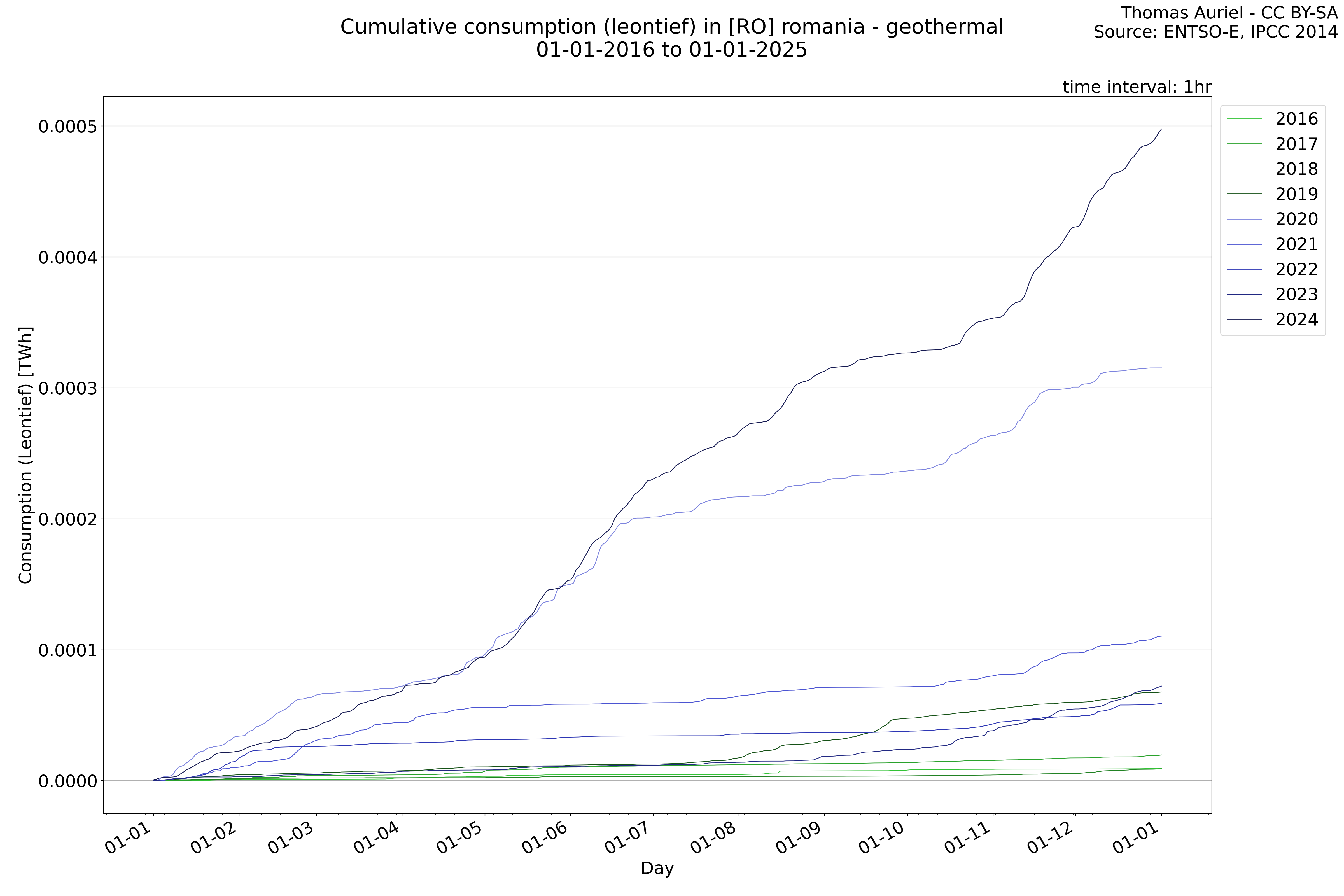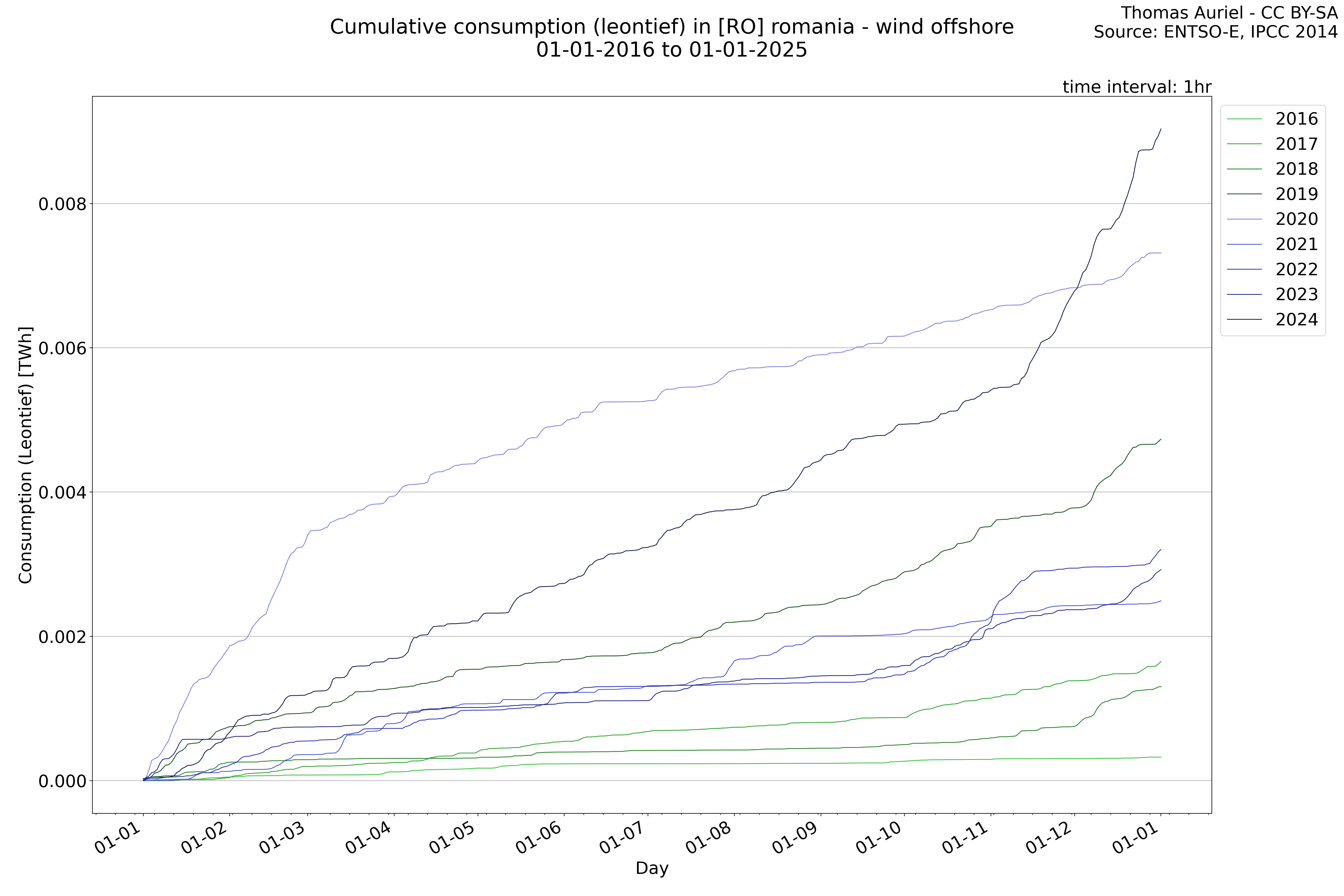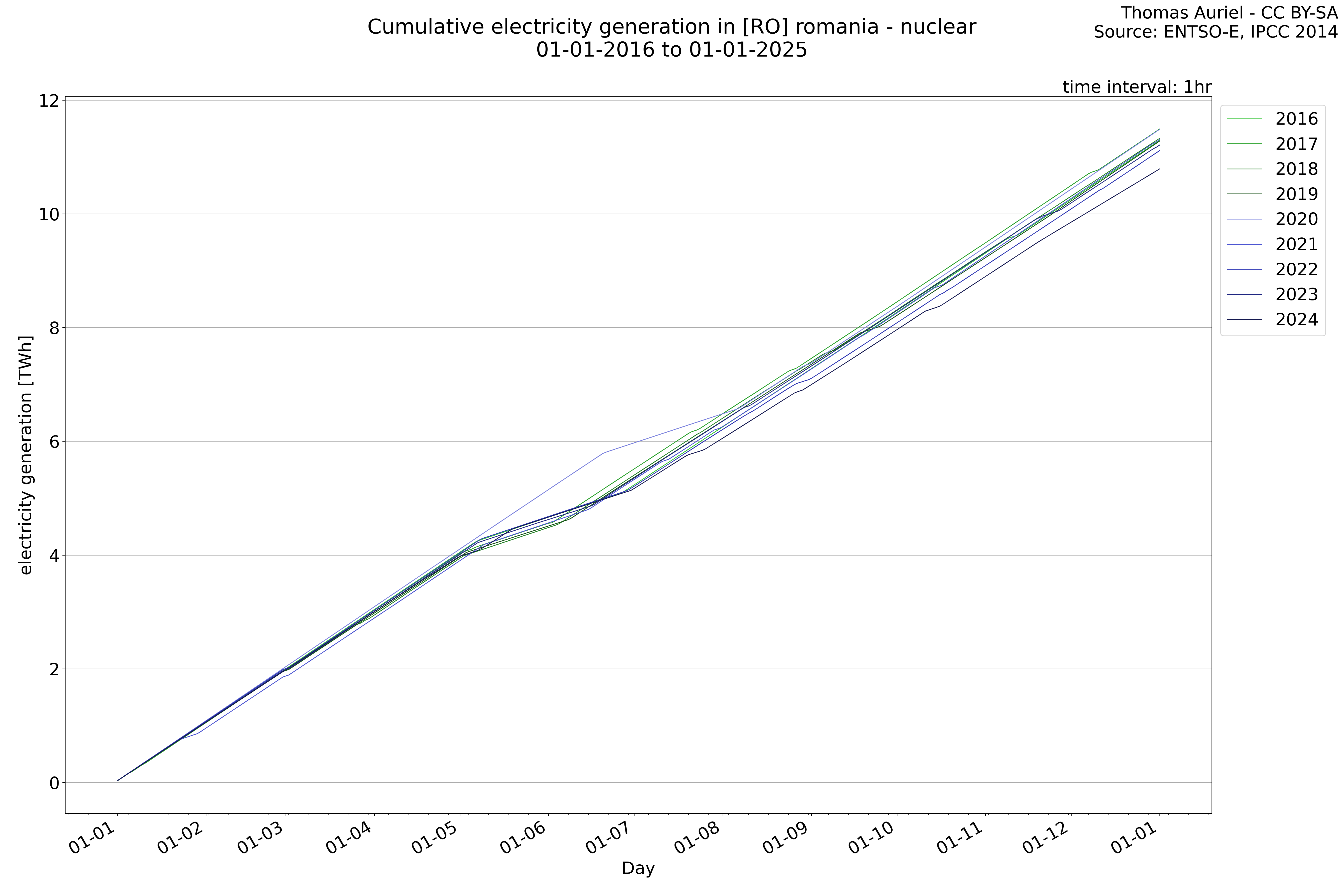 This plot is a cumulative sum plot, where each line represents the cumulative value of a specific metric (e.g., production, load, import, or export) for a given year. The plot begins at zero, and as the year progresses, the cumulative value is updated to reflect the total amount accumulated over time. This visualization illustrates the overall trend of the metric, showing whether the cumulative sum is increasing or decreasing, as well as any changes in the trend within the year. Additionally, the cumulative sum plot helps to reduce the impact of noise and short-term fluctuations commonly present in the raw data of production, load, import, or export. By smoothing out these variations, the plot emphasizes the broader, long-term trends. Consequently, this type of visualization facilitates a clearer understanding of the metric’s evolution across the year, revealing whether the activity follows a steady trajectory, shows signs of volatility, or experiences periods of significant change.