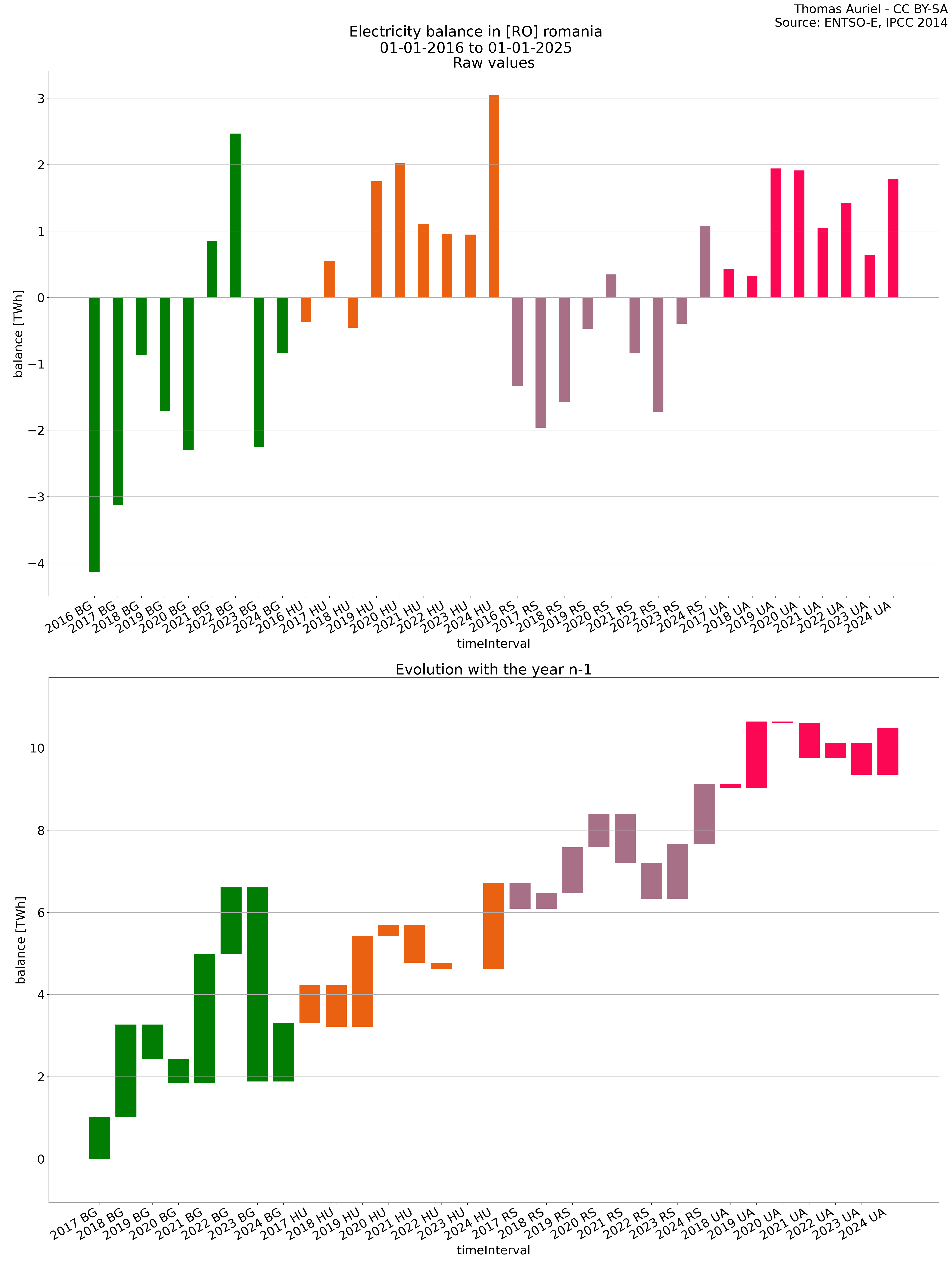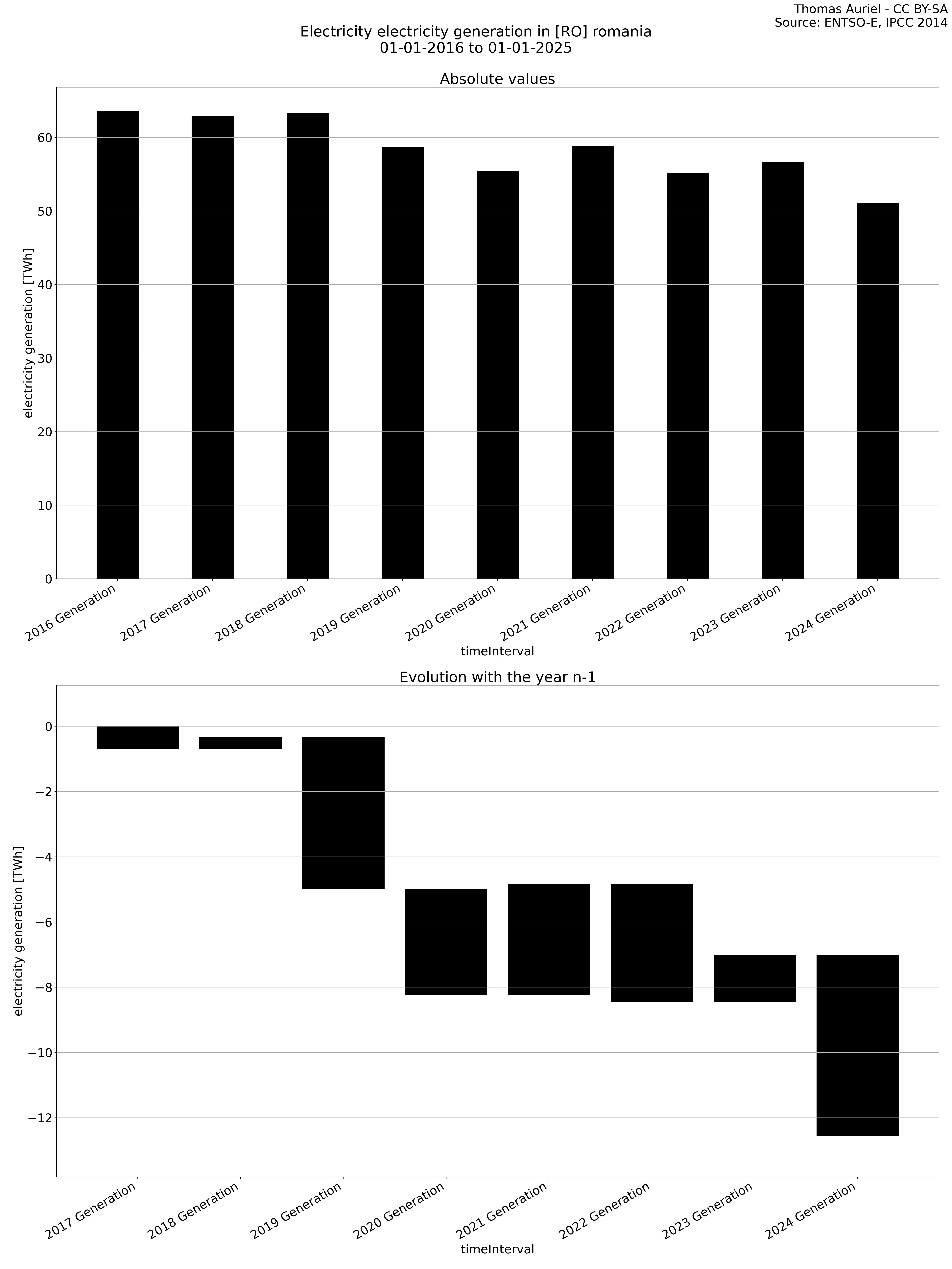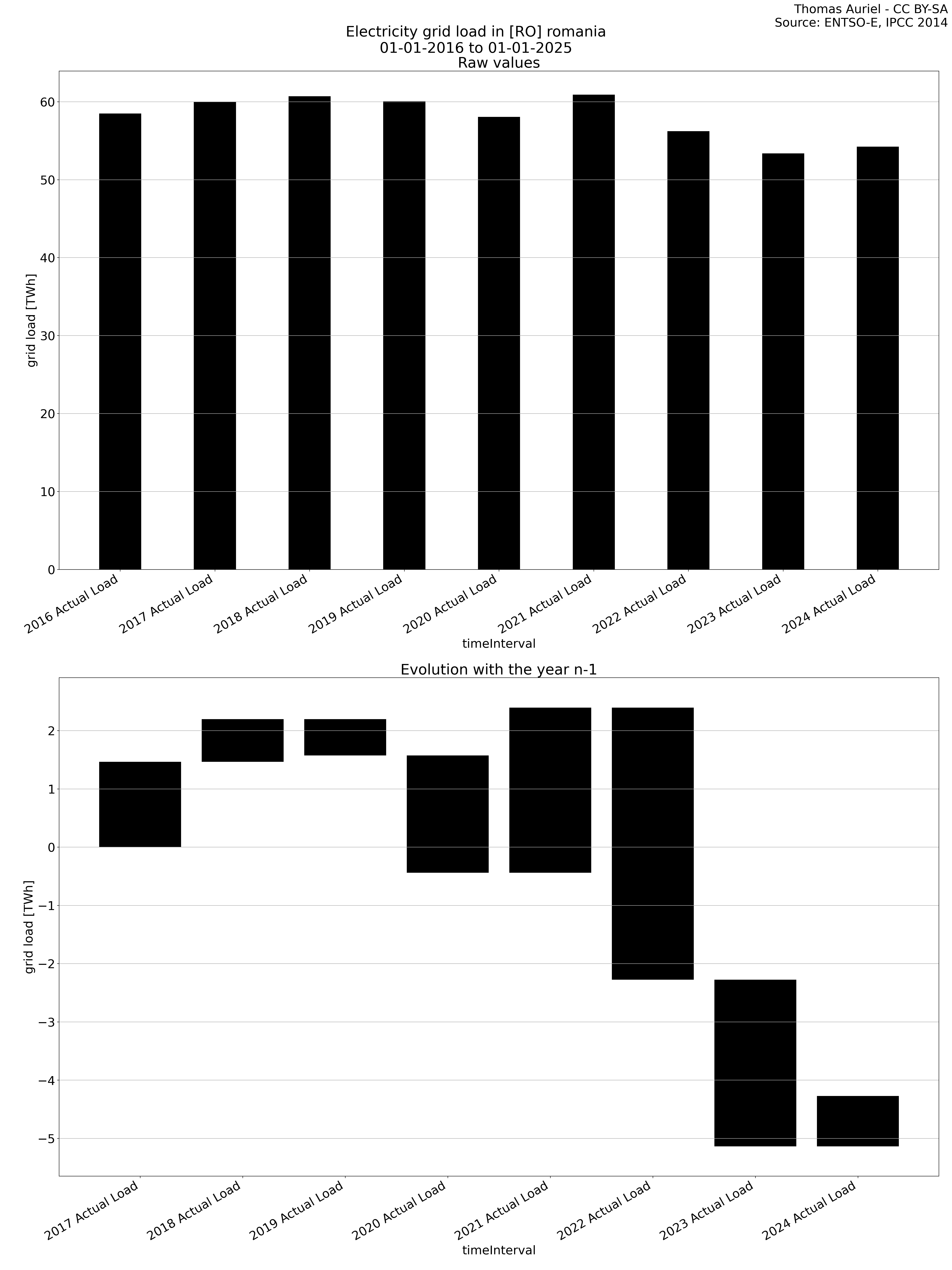 The second section features a waterfall graph, which visually represents the year-over-year changes in electricity metrics. In this graph, the length of each bar corresponds to the difference in the metric (e.g., production, load, etc.) compared to the previous year. Unlike the bar plot, the bars in the waterfall graph do not start at zero; instead, each bar begins where the previous one ended. Hence, this structure emphasizes the incremental changes in the metric over time, facilitating the visualization of fluctuations from one year to the next.